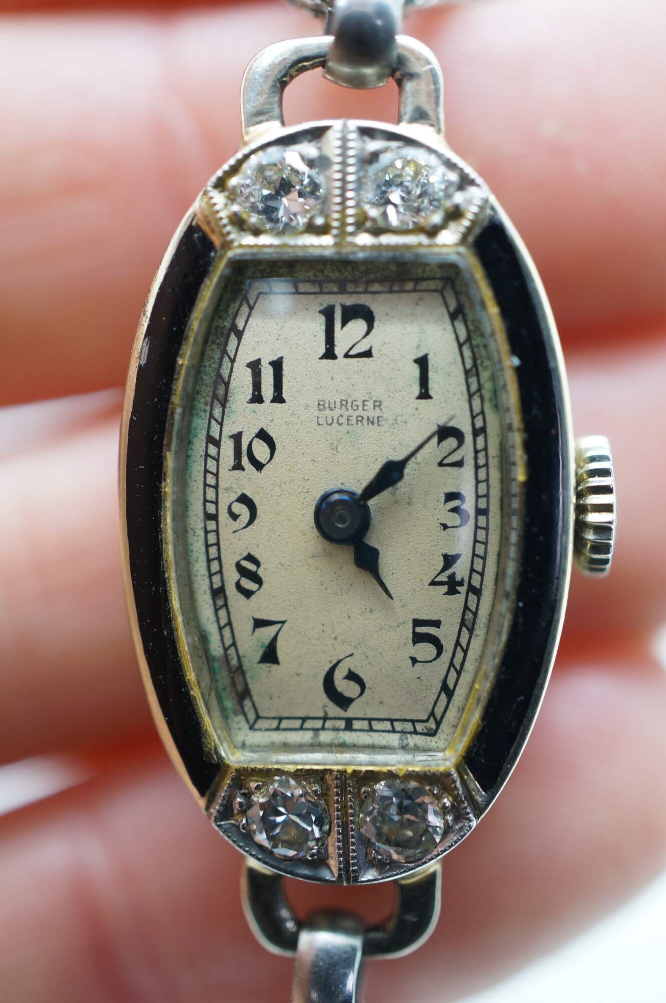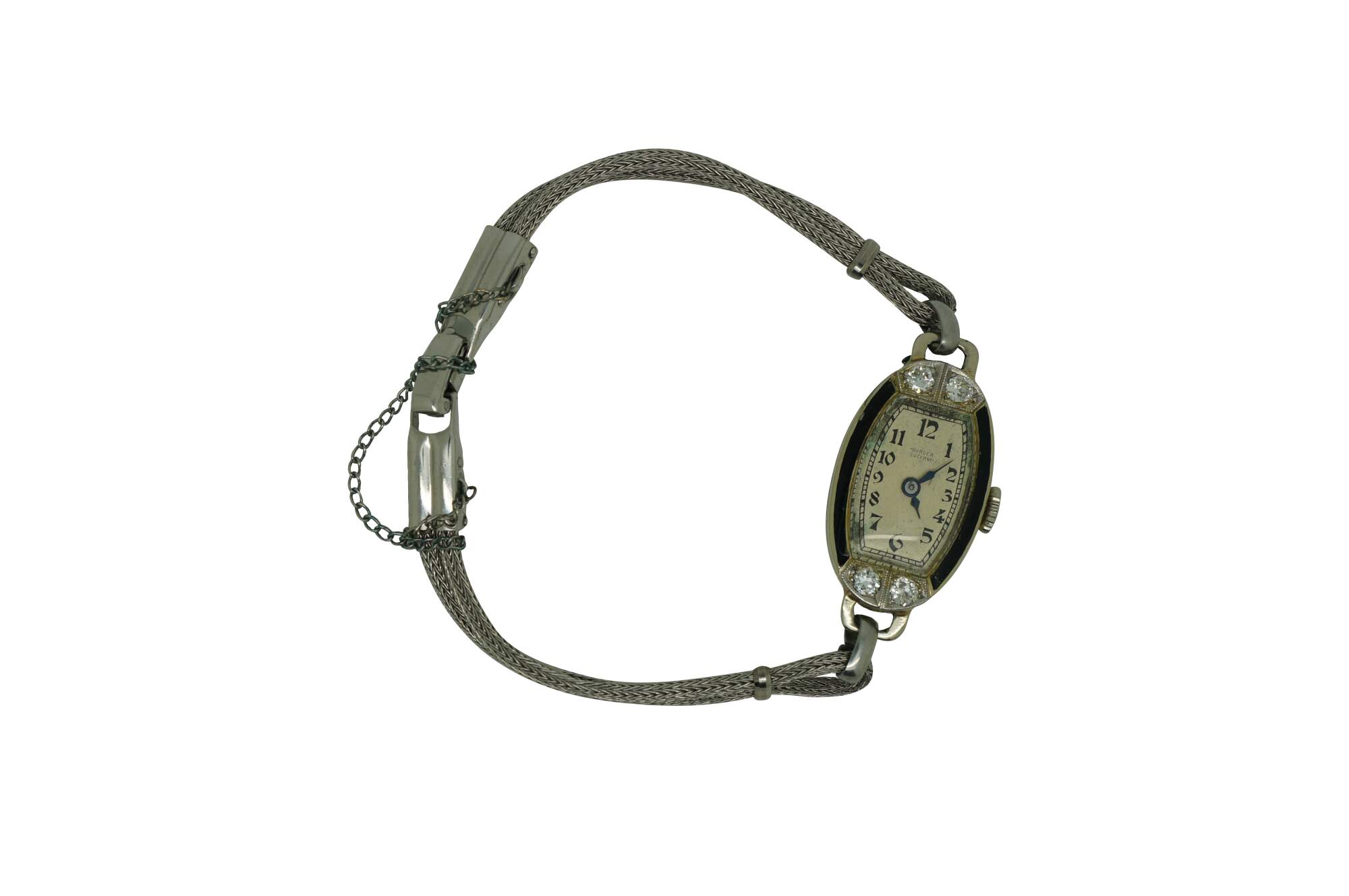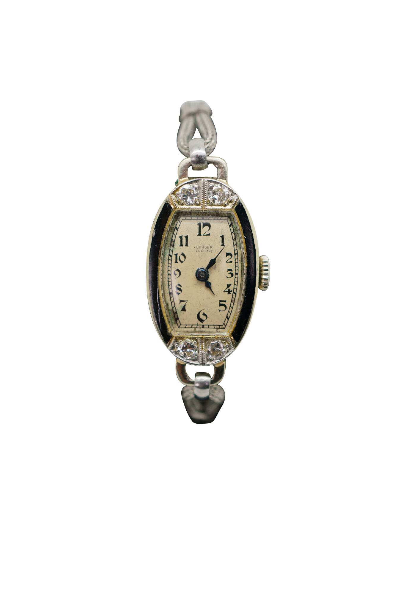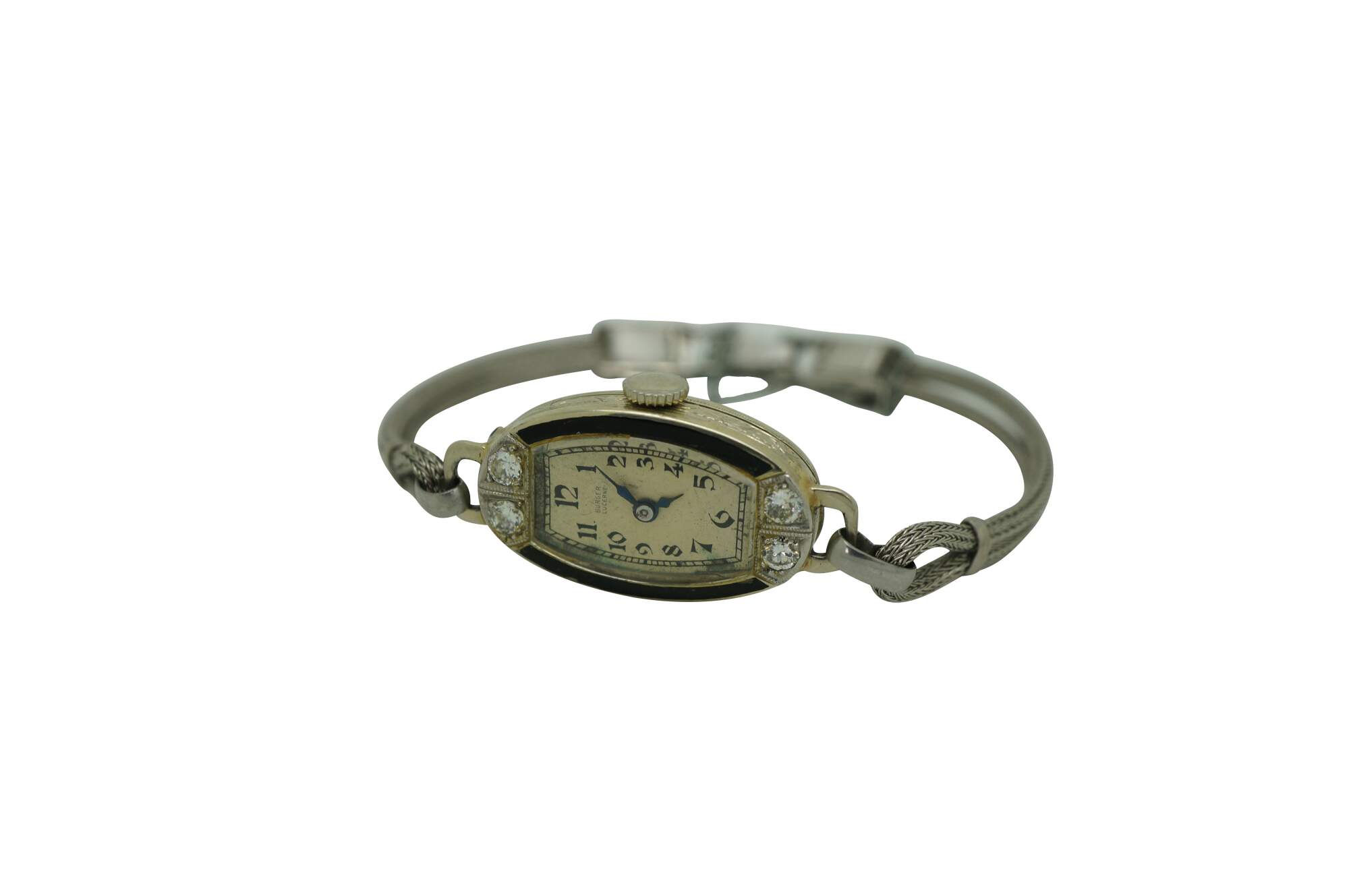 Antique Victorian Art Deco A. Burger Lucerne Platinum ladies wristwatch with four diamonds and twisted rope band.