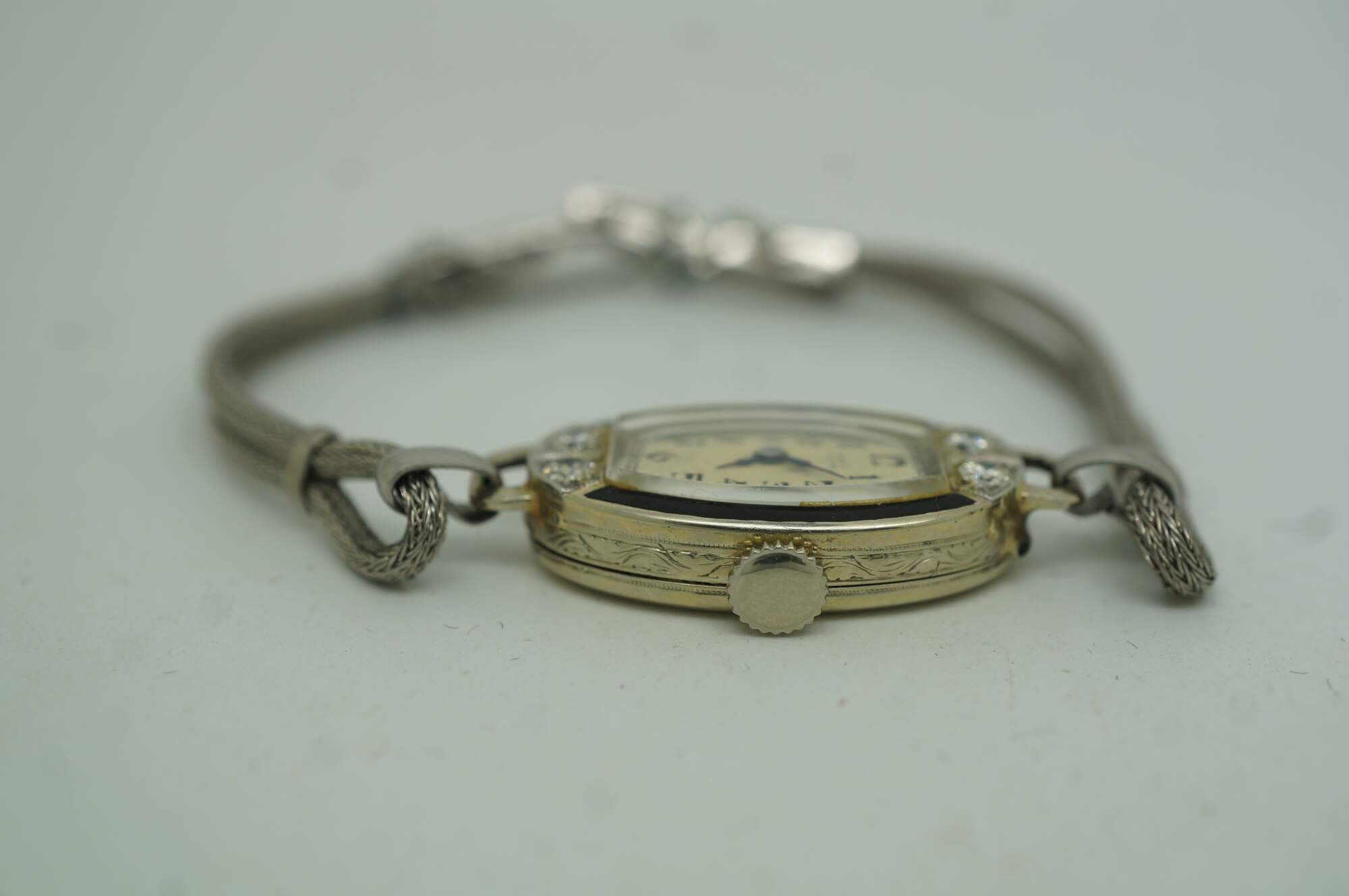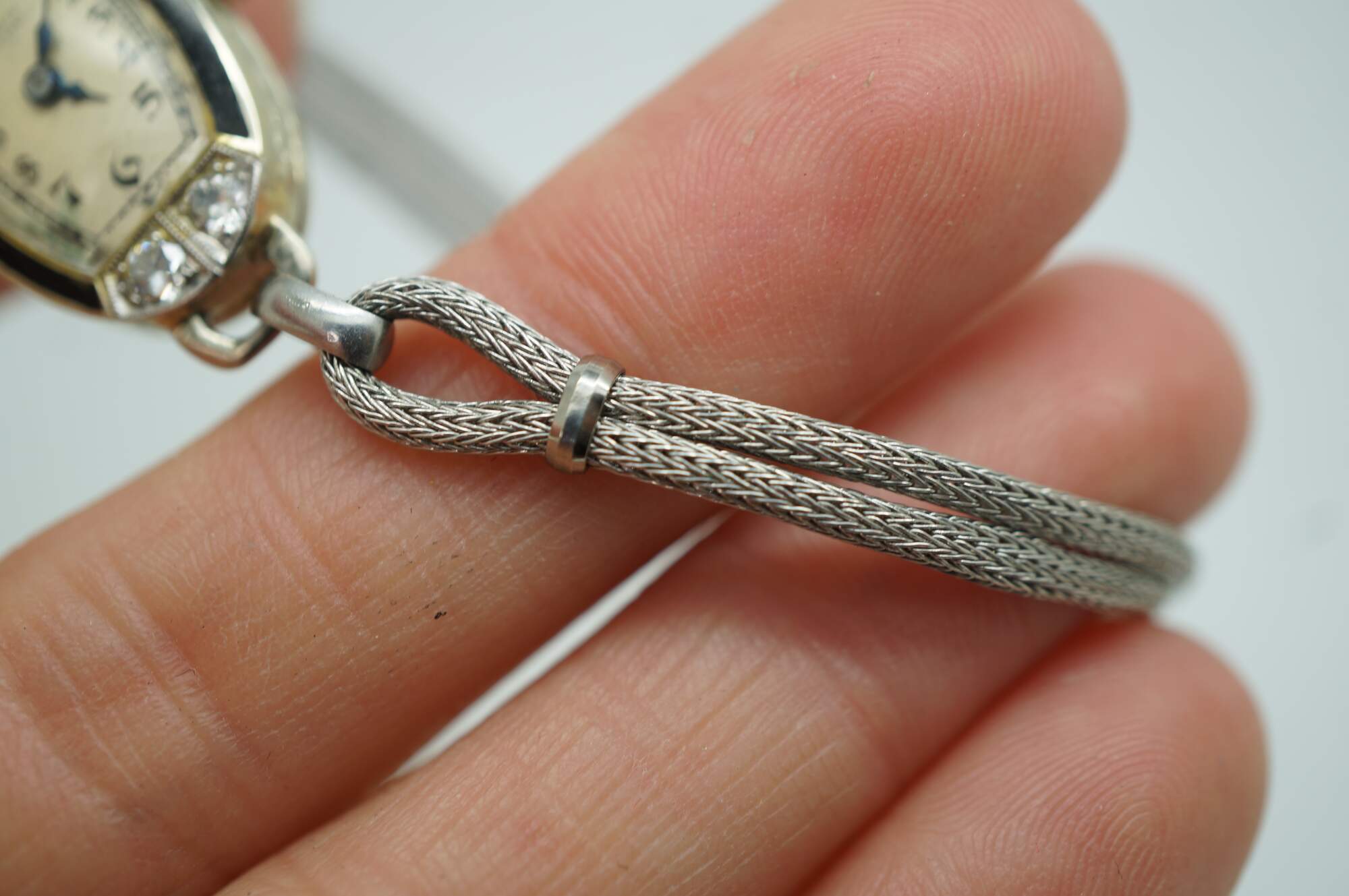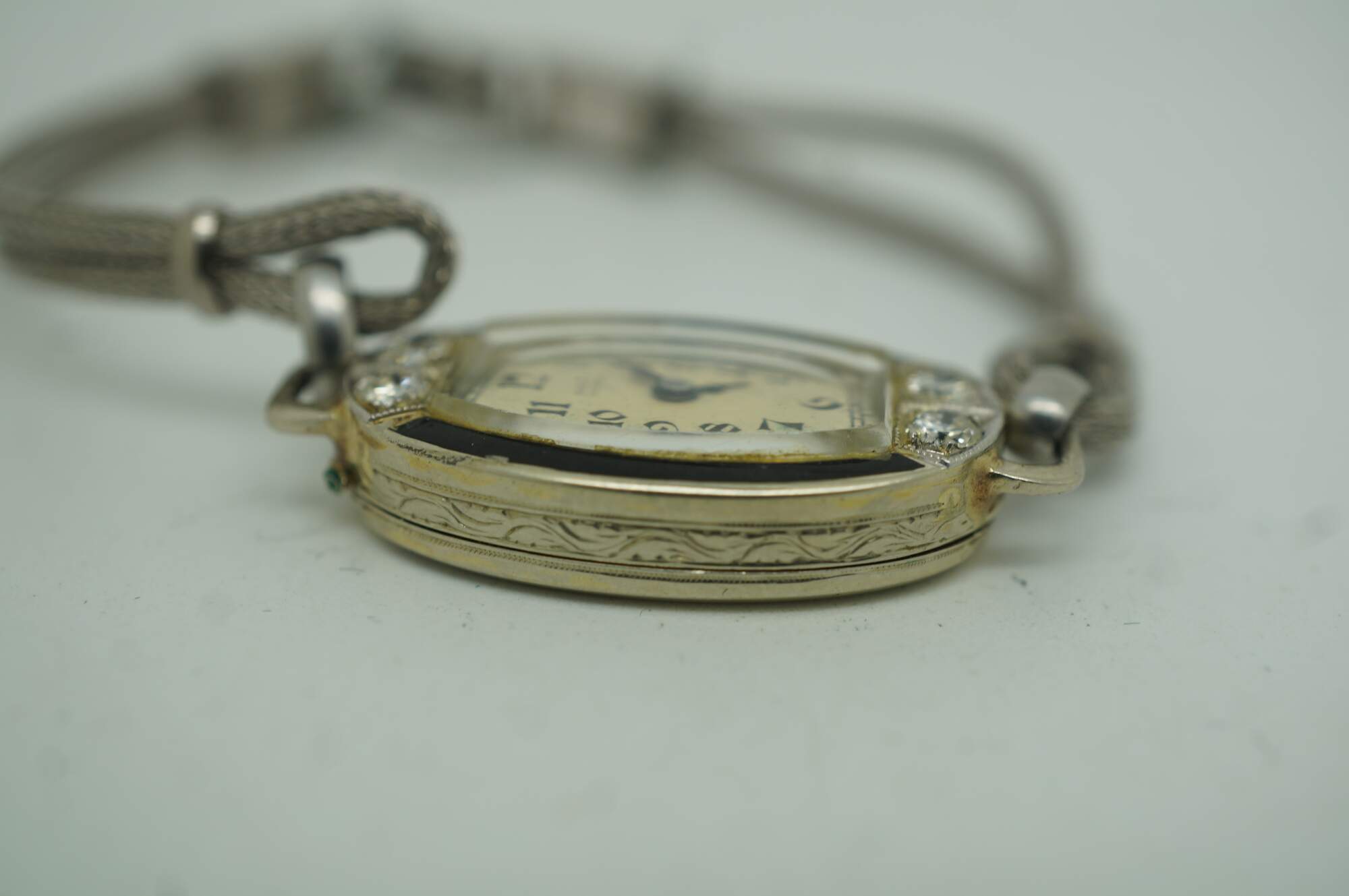 Antique Victorian Art Deco A. Burger Lucerne Platinum ladies wristwatch with four diamonds and twisted rope band.