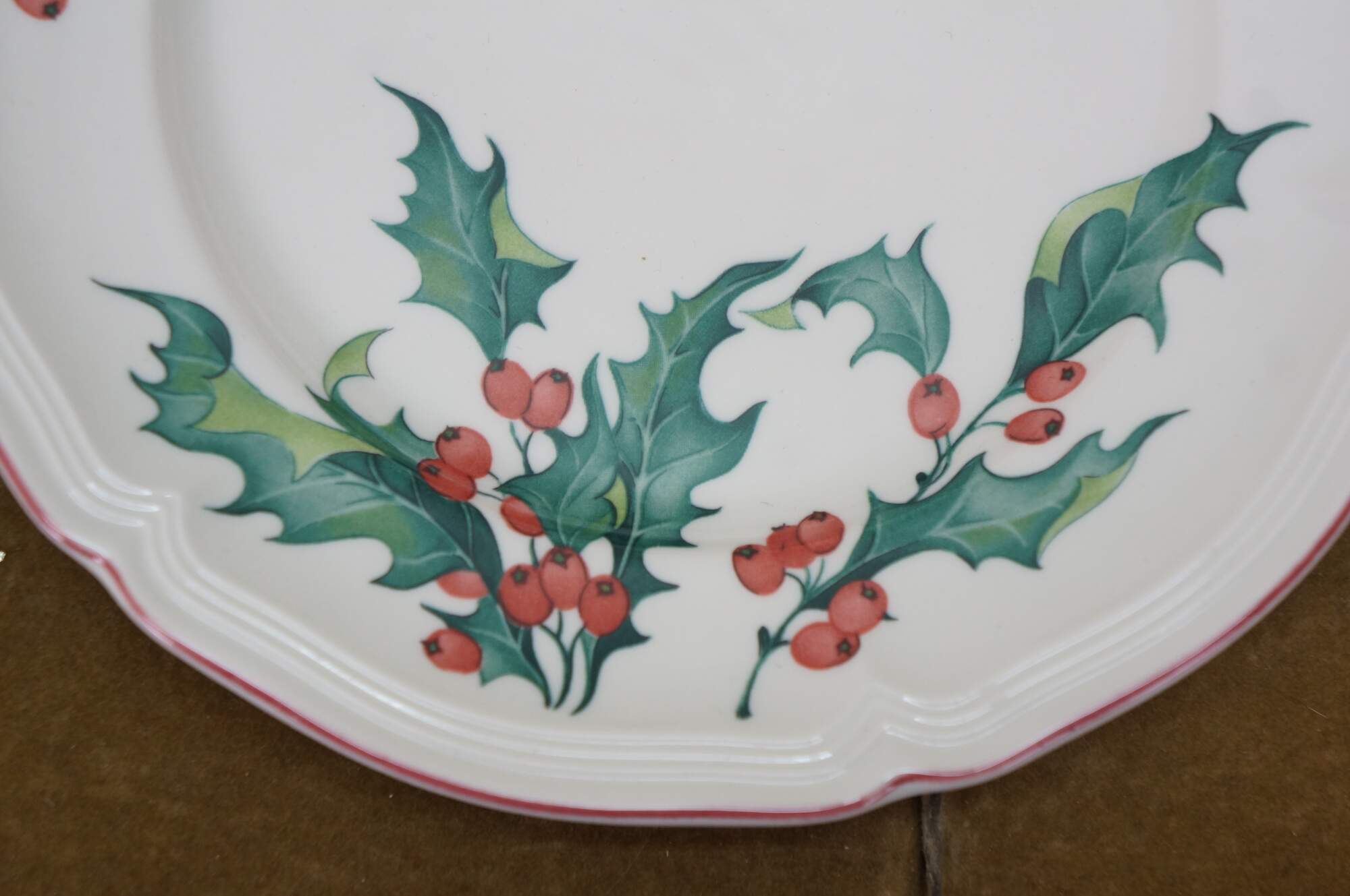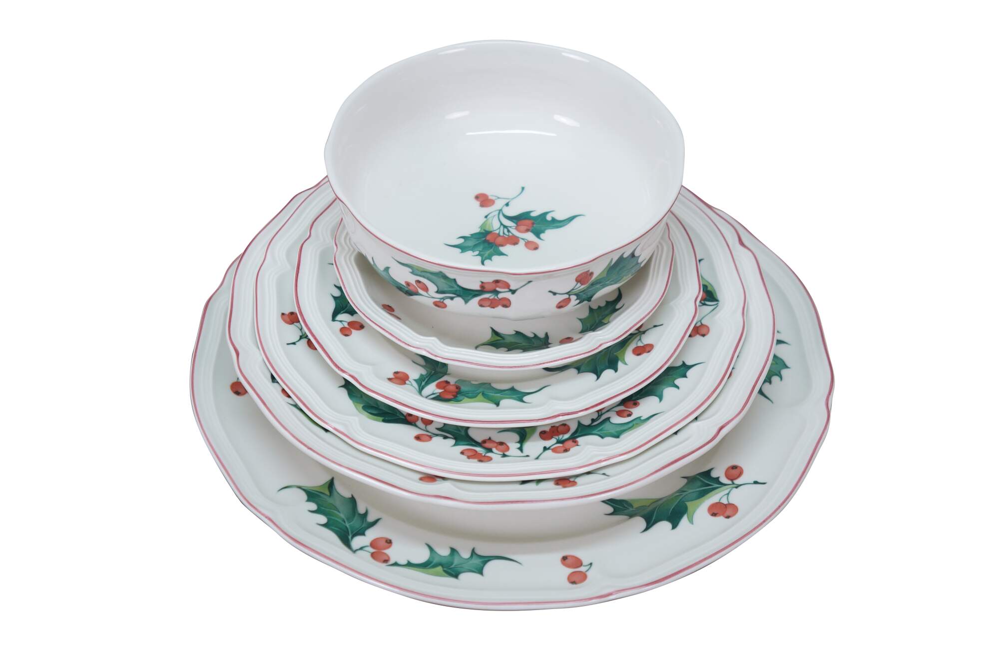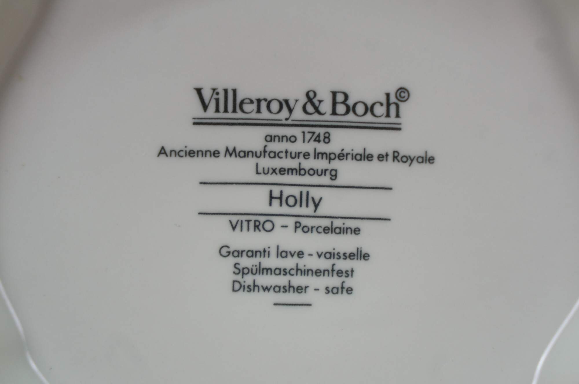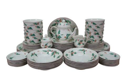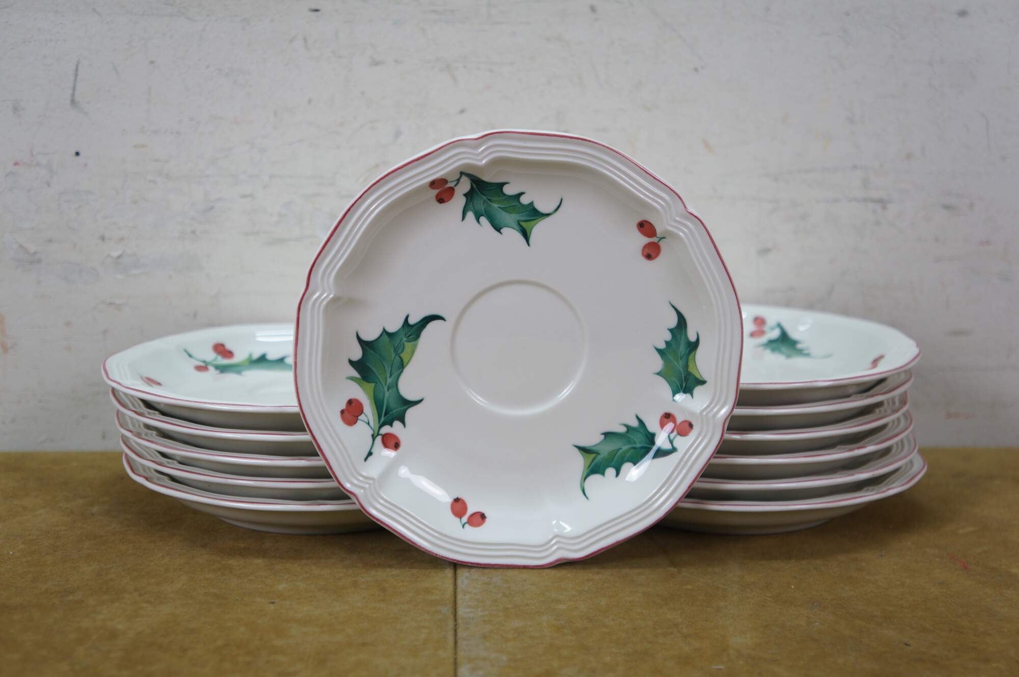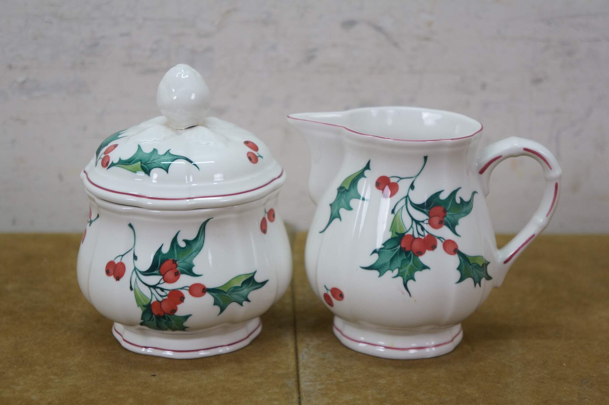 Vintage 74 piece collection of Villeroy & Boch Holly pattern dinnerware and tea service set. It features the classic Christmas holly and berry motif on white Vitro-Porcelain. Includes: 12 Soup Bowls, 12 Dinner Plates, Teapot, 12 Bread Plates, 12 Salad Plates, Creamer, 12 Saucers, Lidded Sugar Bowl, 12 Dessert Bowls