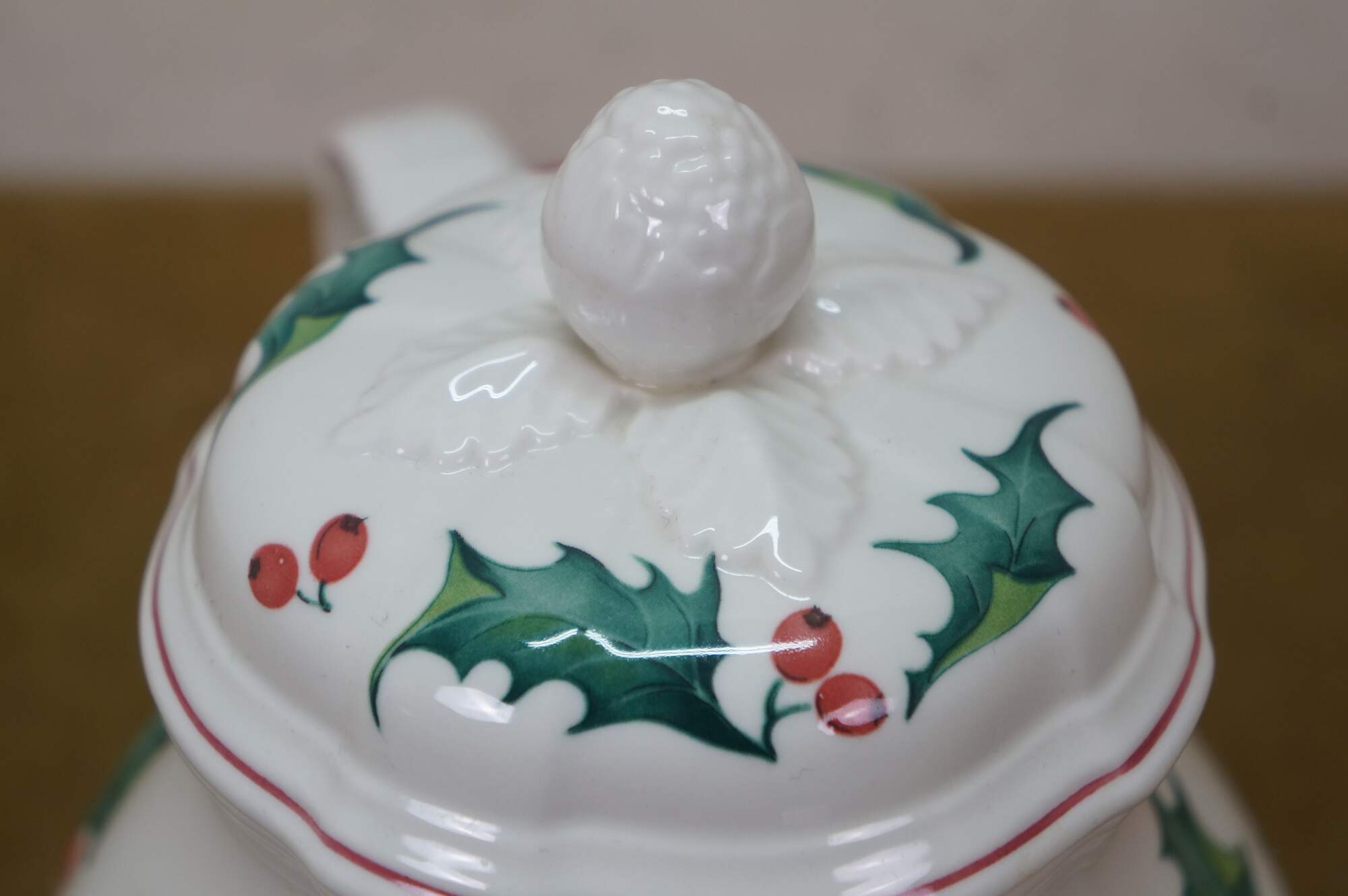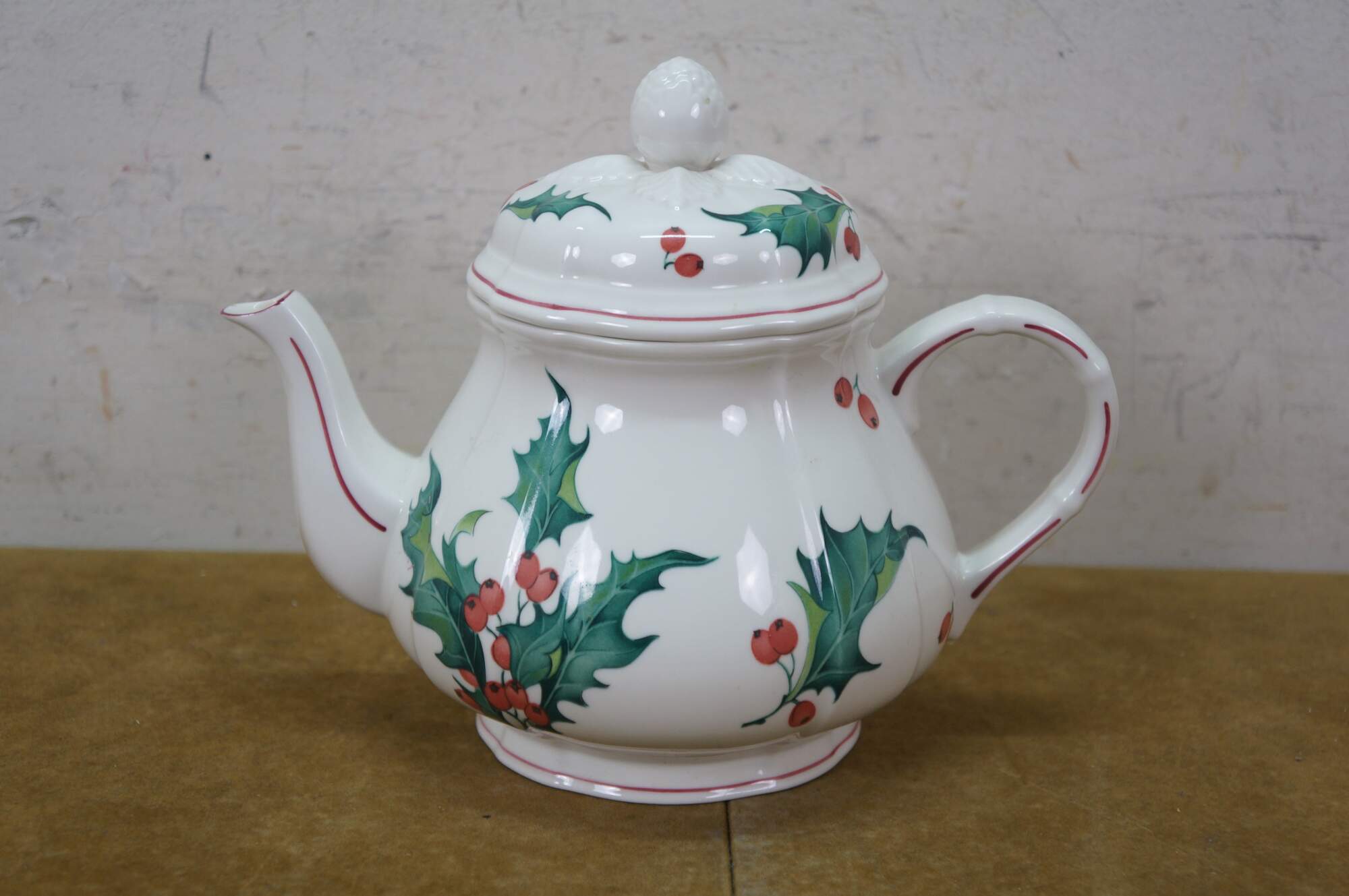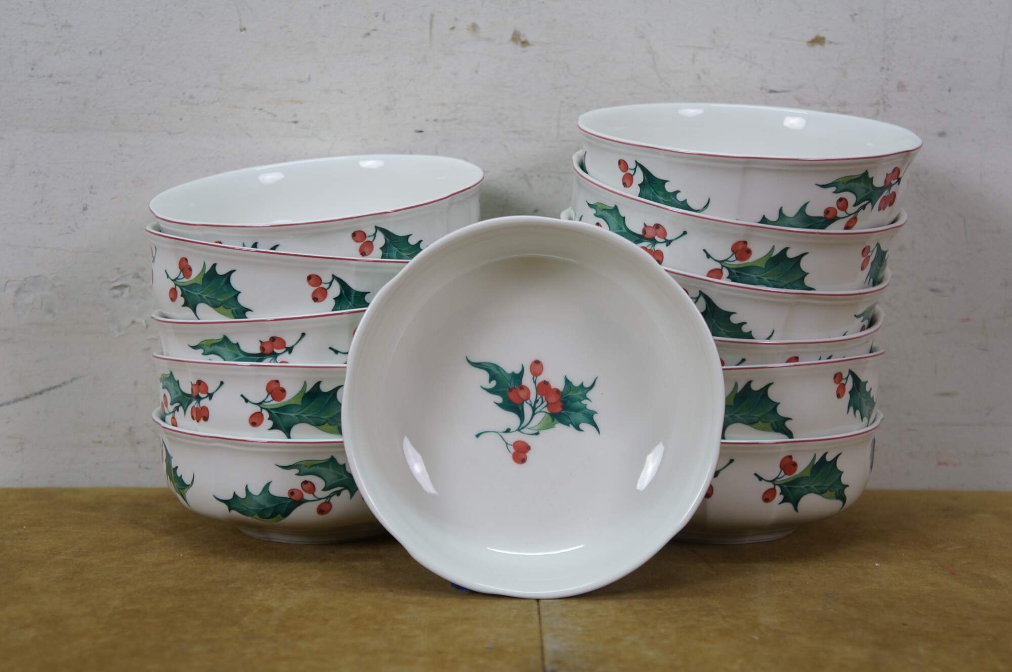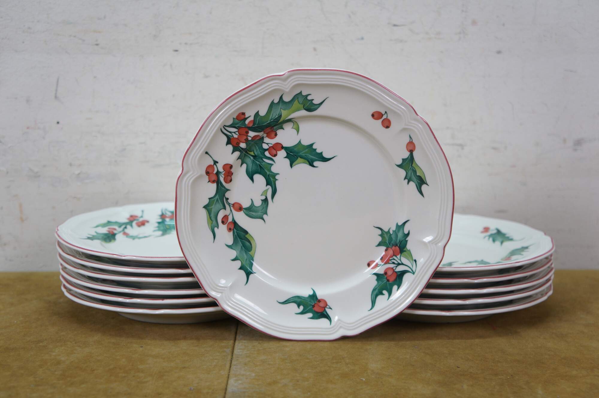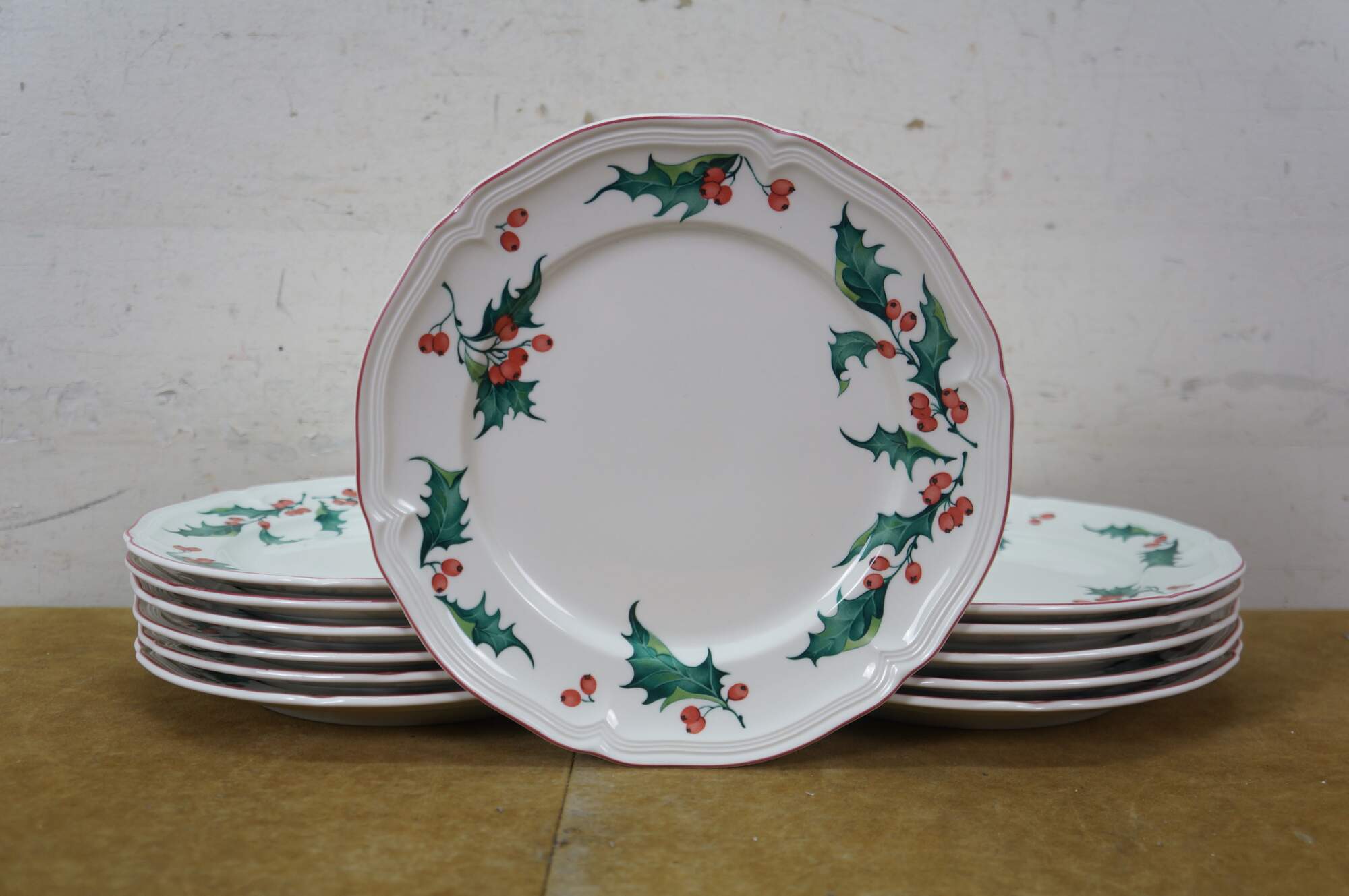 Vintage 74 piece collection of Villeroy & Boch Holly pattern dinnerware and tea service set. It features the classic Christmas holly and berry motif on white Vitro-Porcelain. Includes: 12 Soup Bowls, 12 Dinner Plates, Teapot, 12 Bread Plates, 12 Salad Plates, Creamer, 12 Saucers, Lidded Sugar Bowl, 12 Dessert Bowls