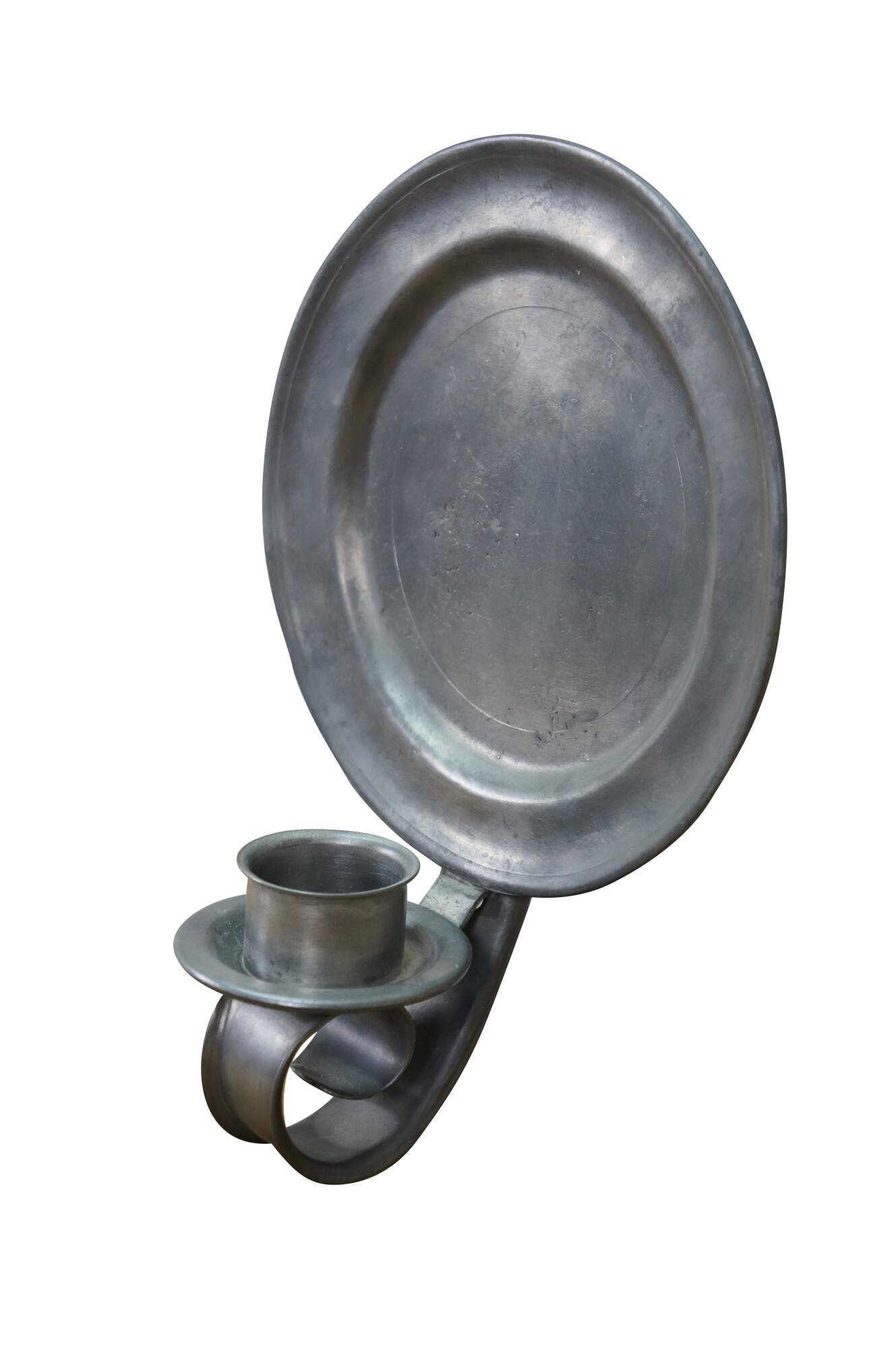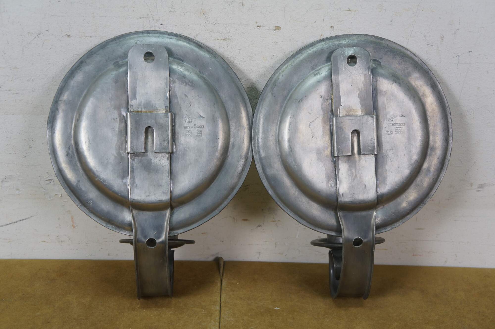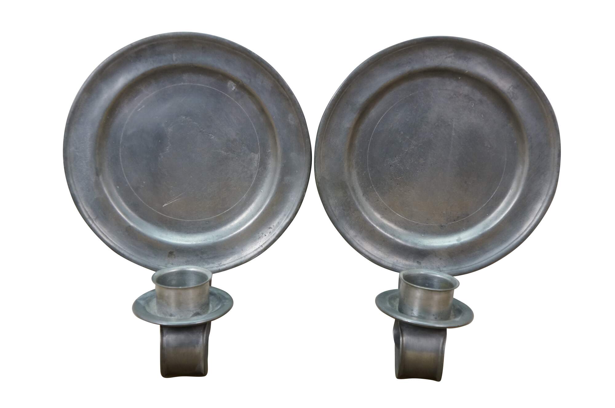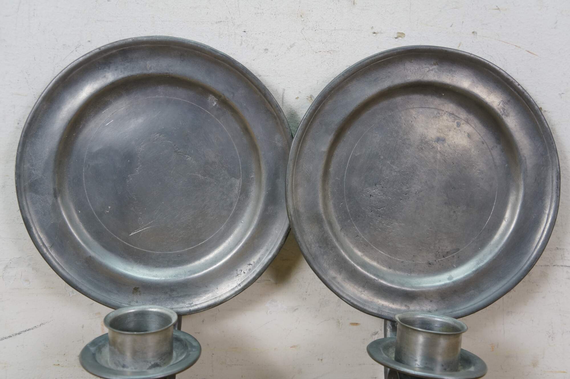 Rare antique L. Hitchcock early American pewter plate sconce candle holders.