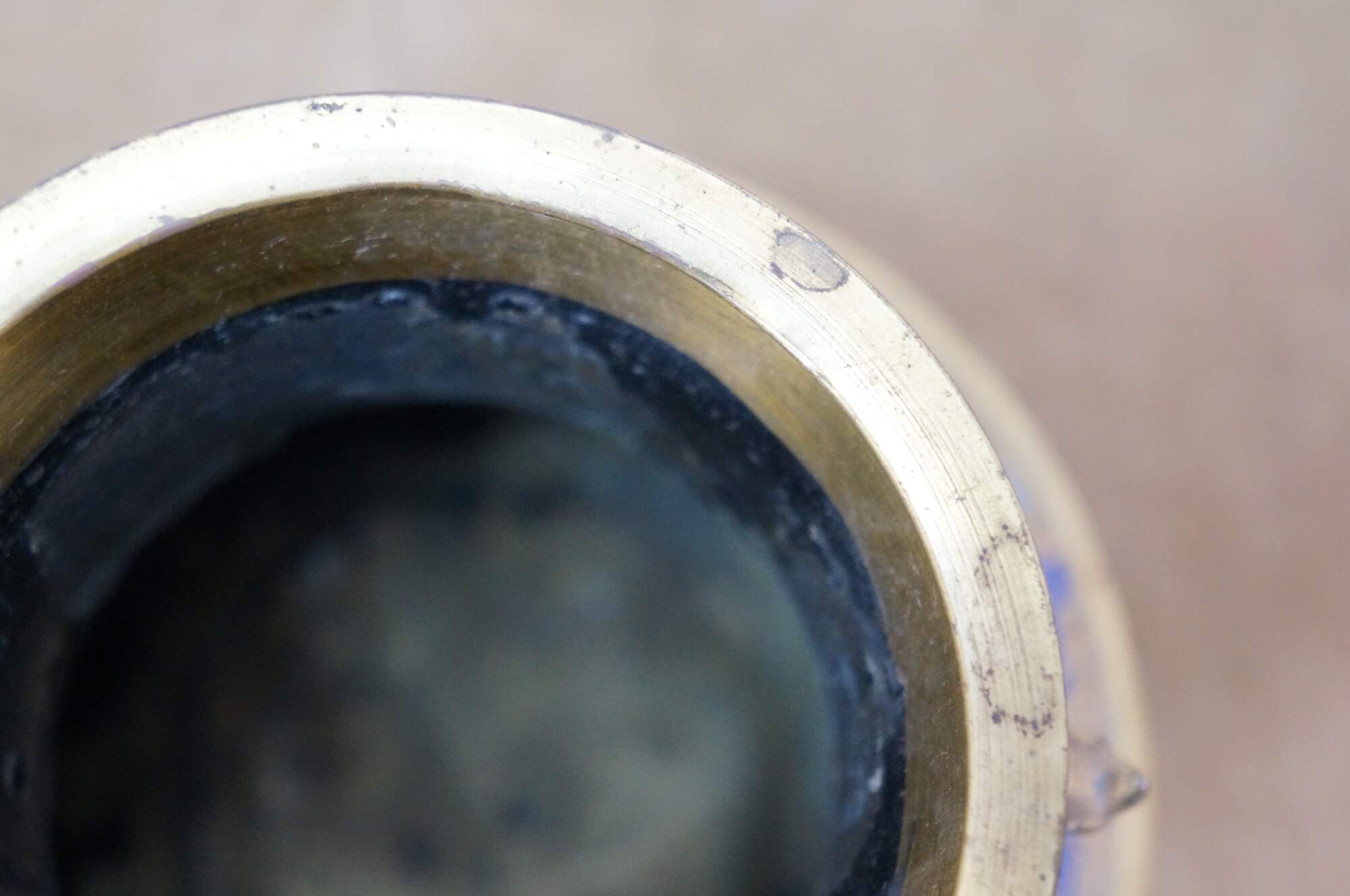 Exquisite antique Japanese bronze champlevé and cloisonné enamel vase with dragon handles. It features decorative patterns of lotus and chrysanthemum flowers, vines, and dragons. Made in Japan.