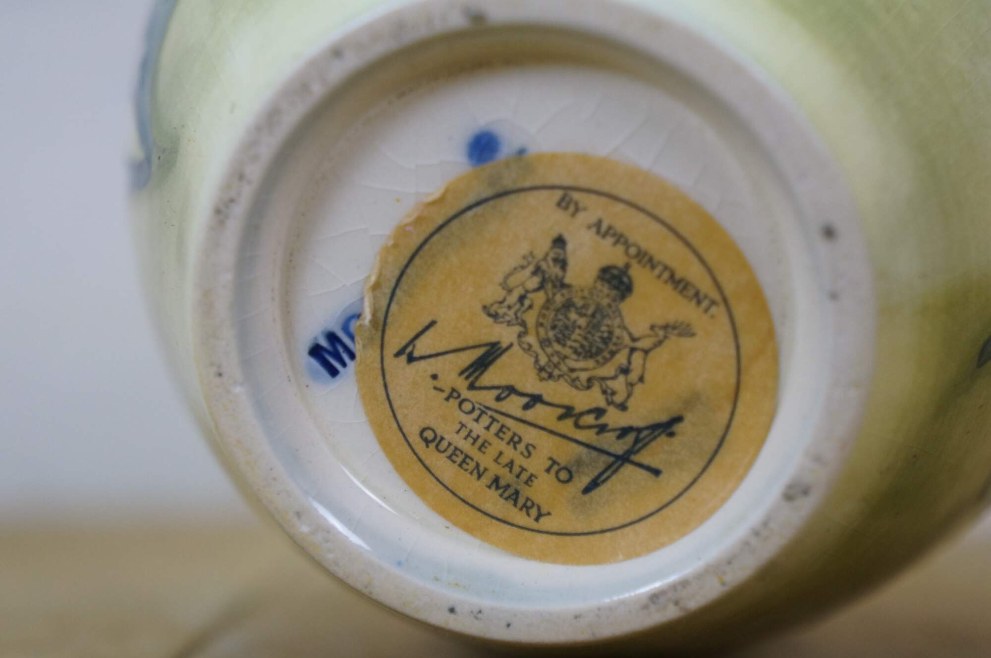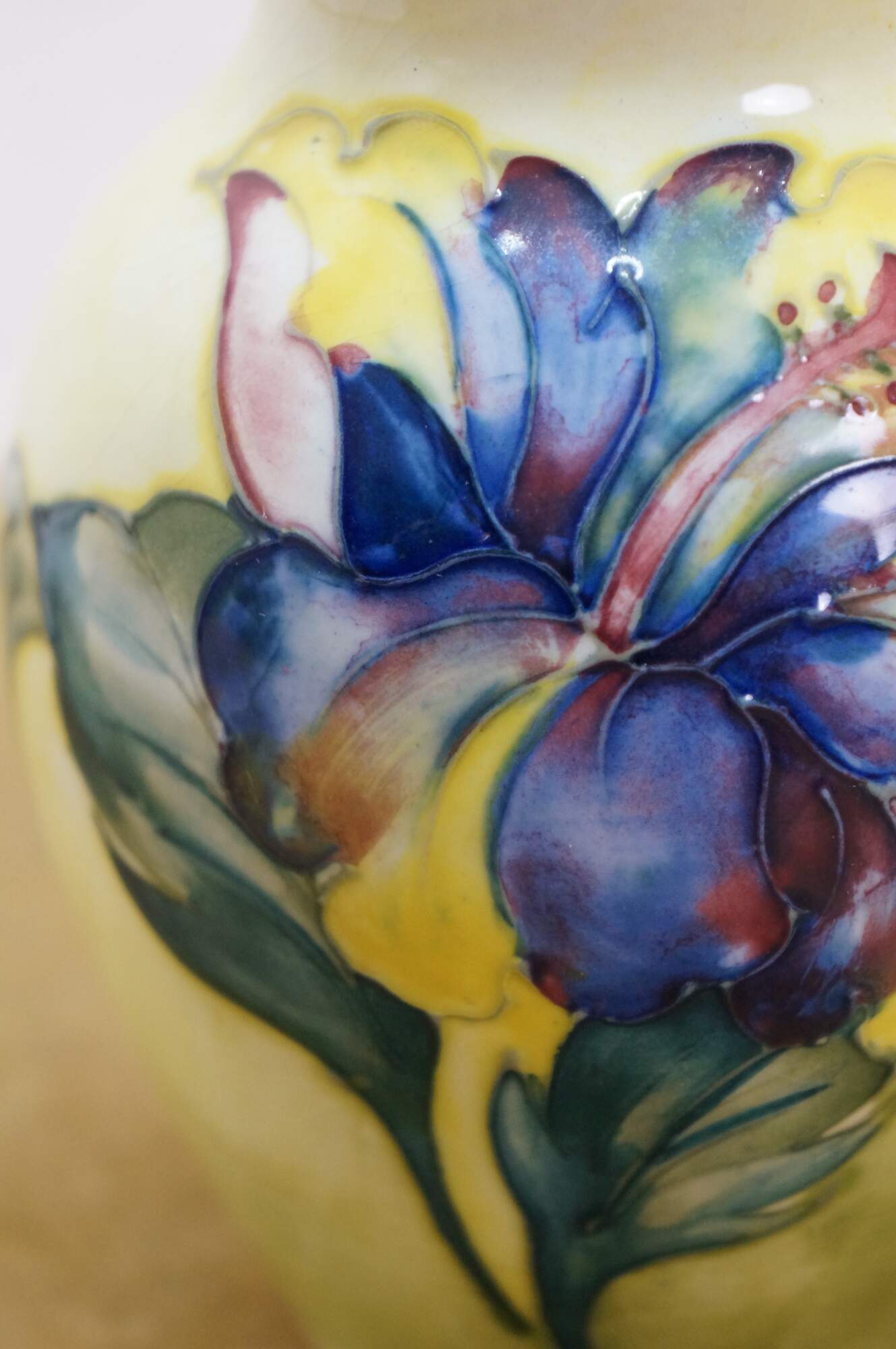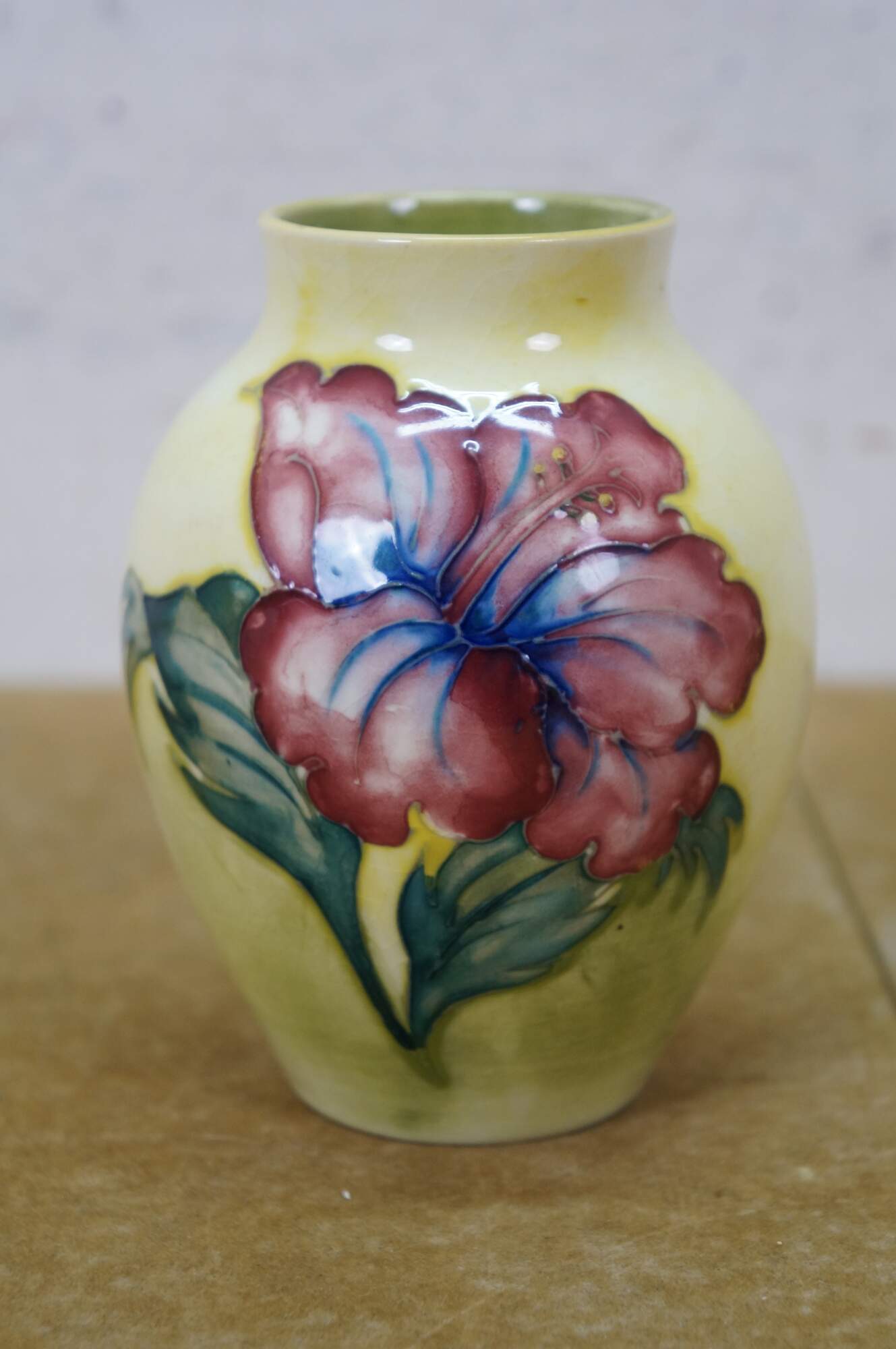 Mid Century Moorcroft pottery vase in the Hibiscus pattern. The vase features large blue and yellow hibiscus flowers with green leaves on a cream-yellow-colored ground. It was produced by the British pottery company Moorcroft between 1947 and 1953. The pattern was designed by Walter Moorcroft and crafted in Stoke-on-Trent, England.