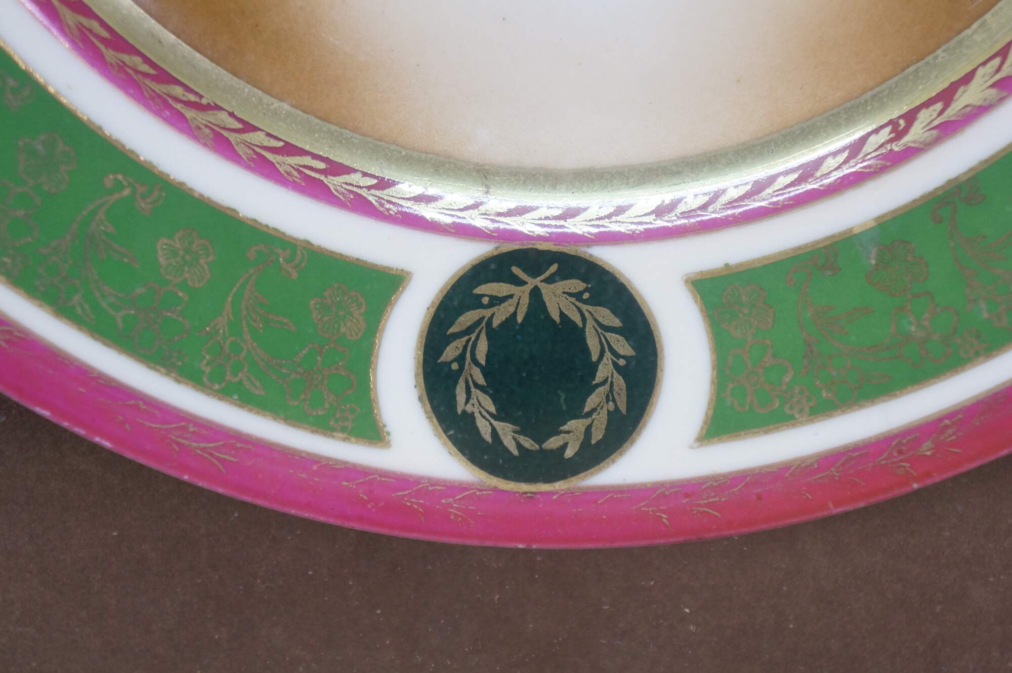 Antique Austrian Royal Vienna hand-painted porcelain portrait plate framed in a gilt shadowbox curio display frame. Features a central portrait of a woman named Constance, surrounded by a red and green border with Neoclassical / Art Nouveau gilt gold floral motifs.
