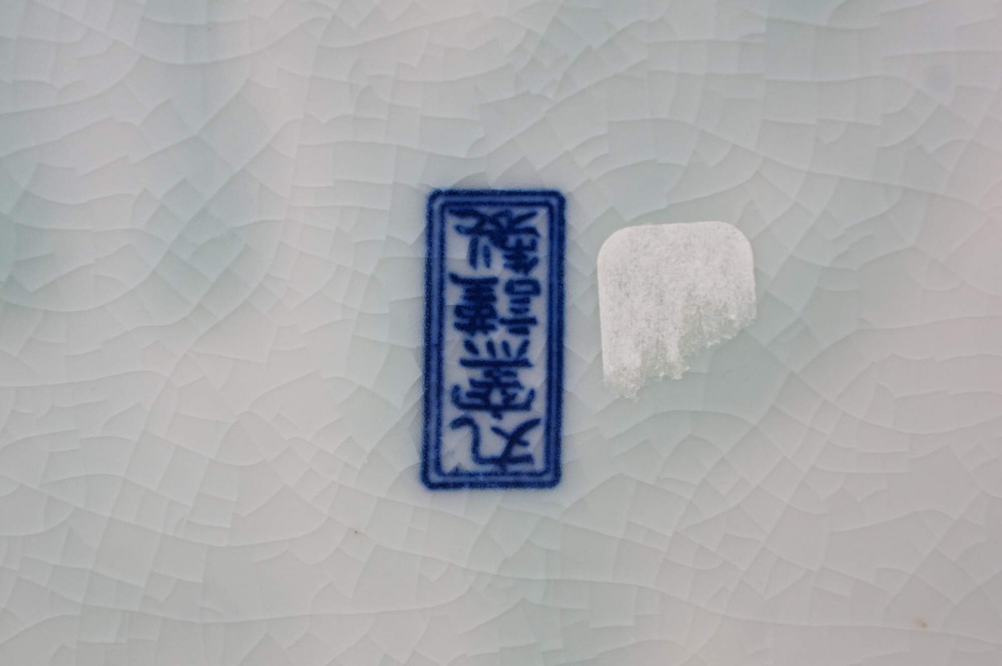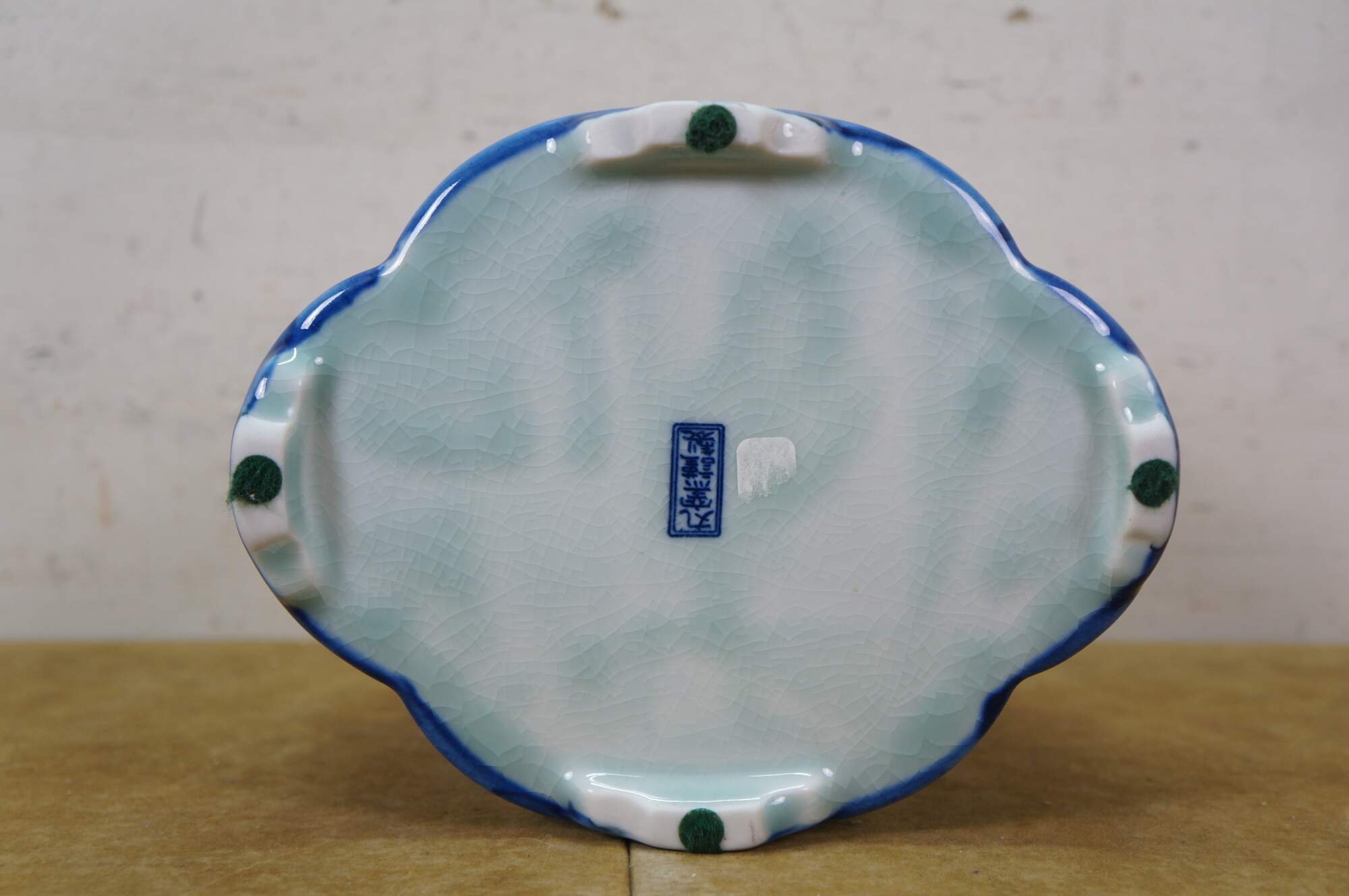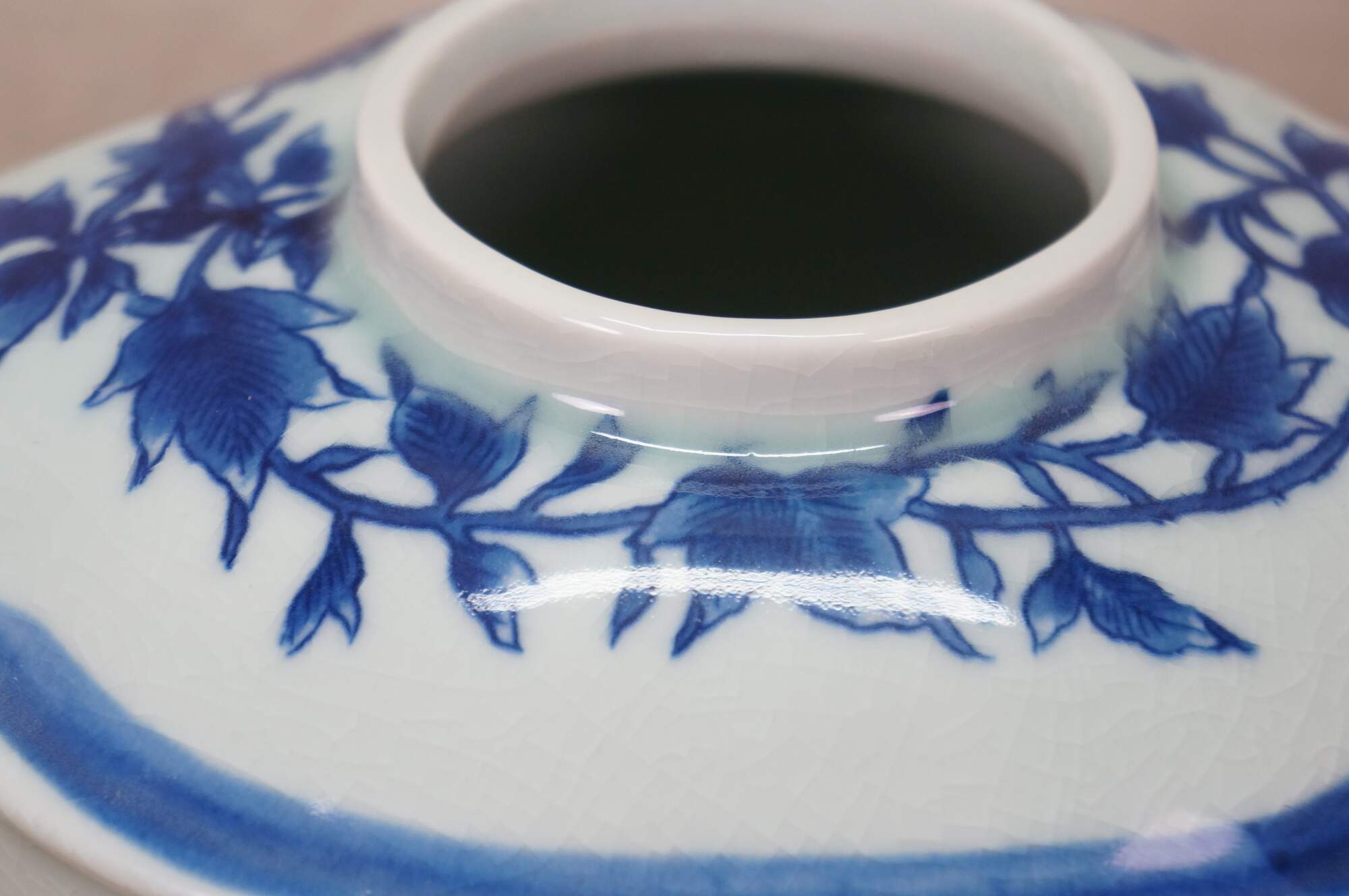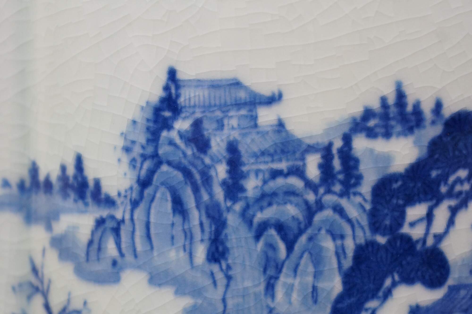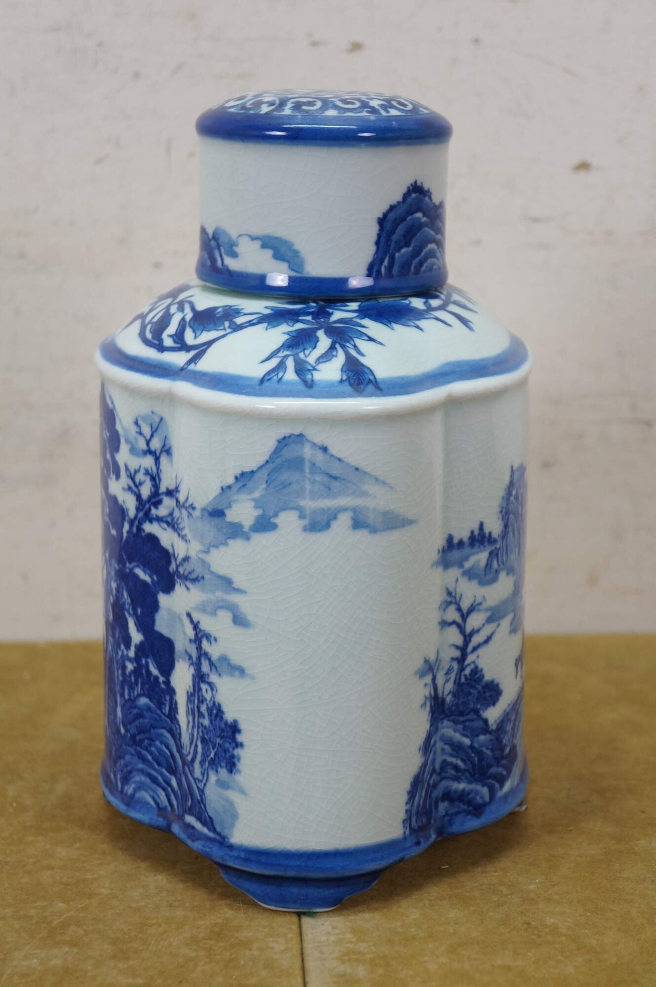 Large antique Chinese export blue and white porcelain tea caddy / ginger jar / decanter featuring hand-painted mountain landscape scene with Pagodas and a figure on a horse or donkey.