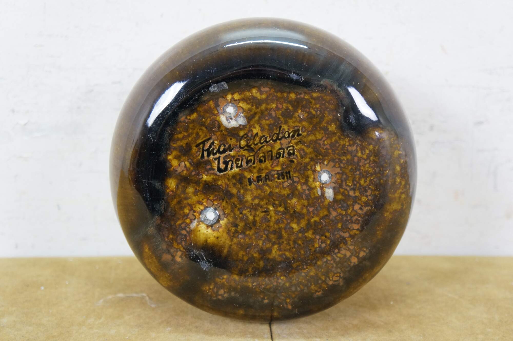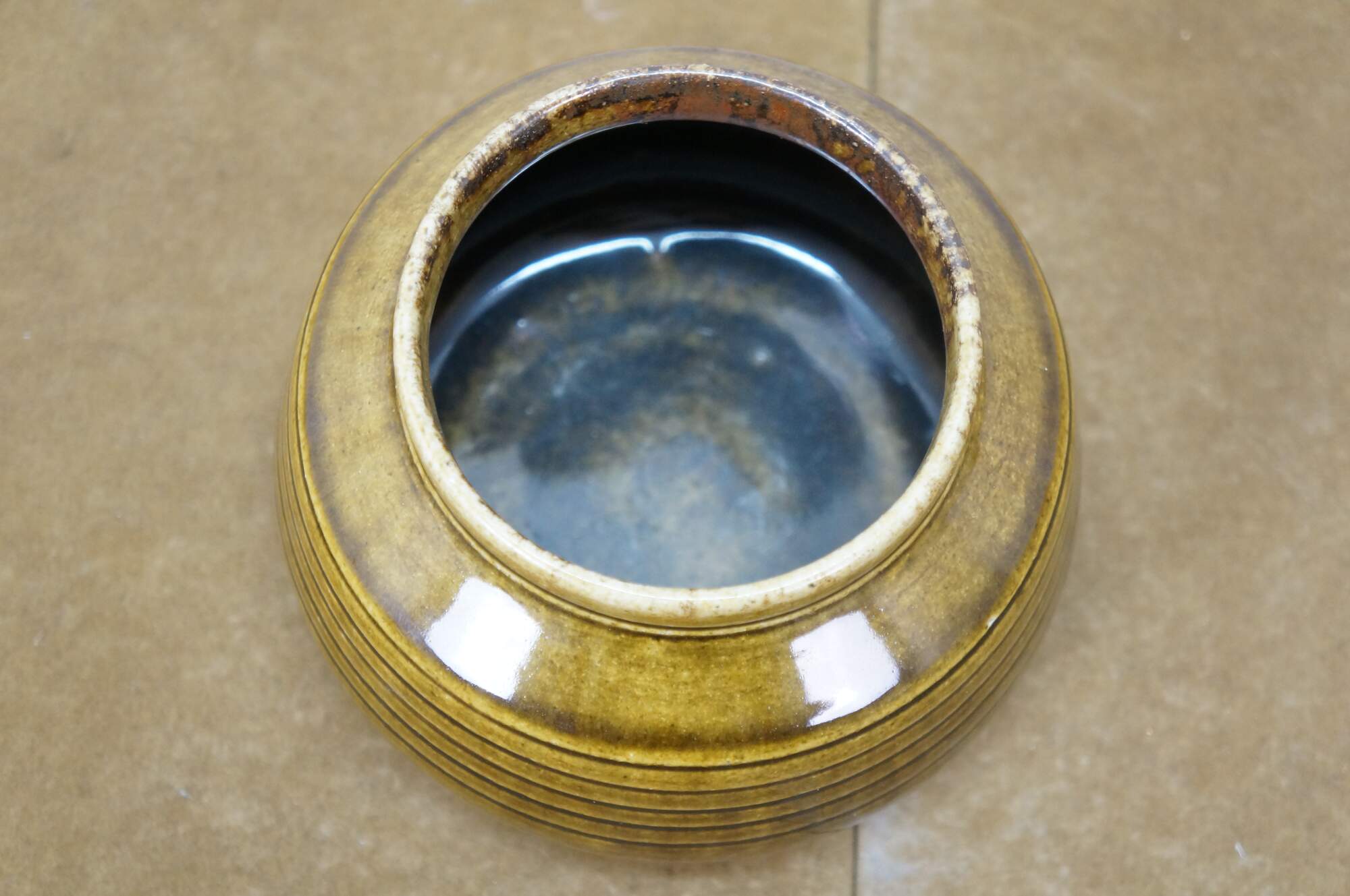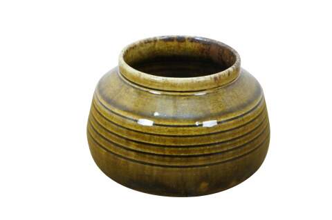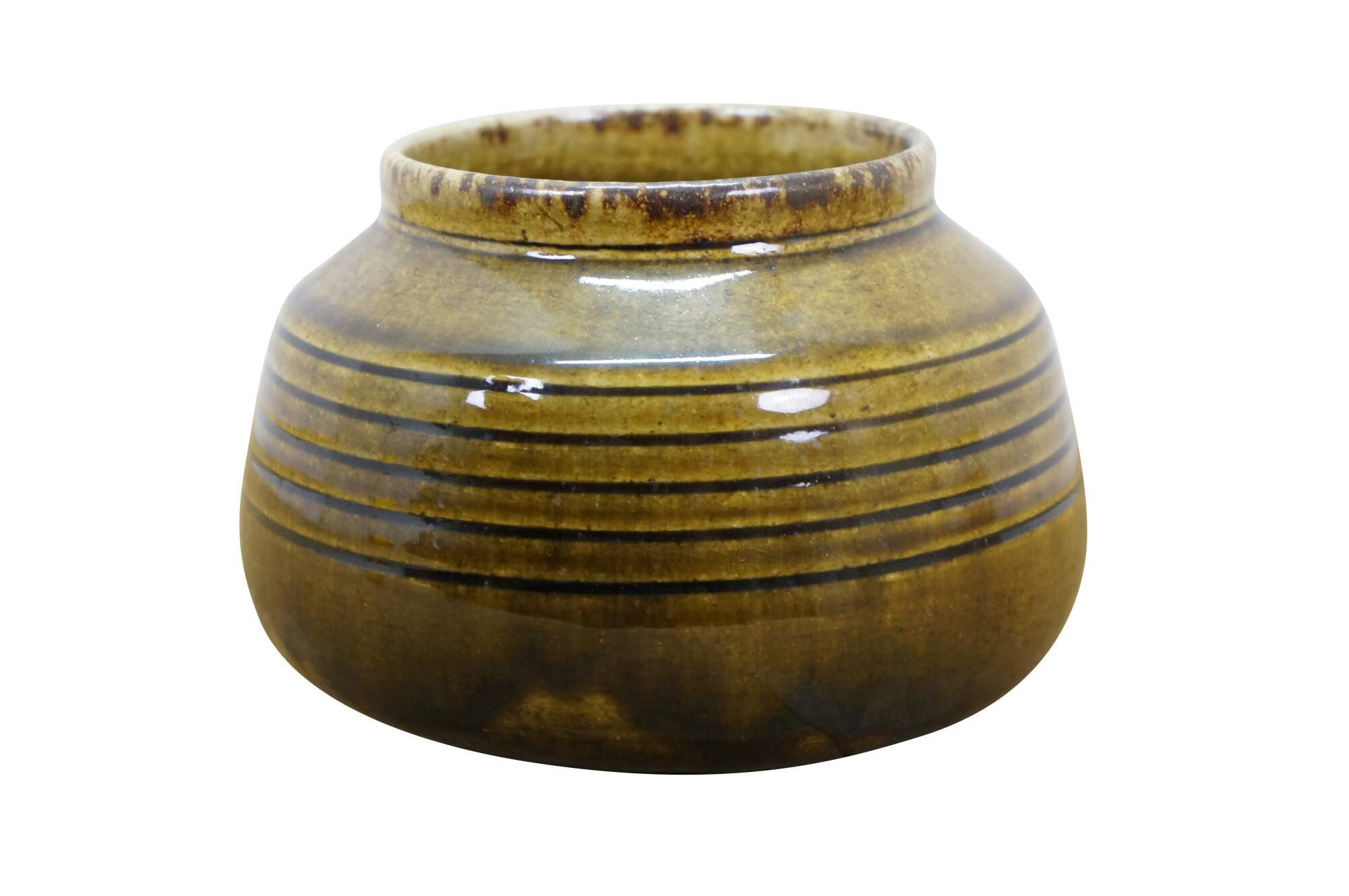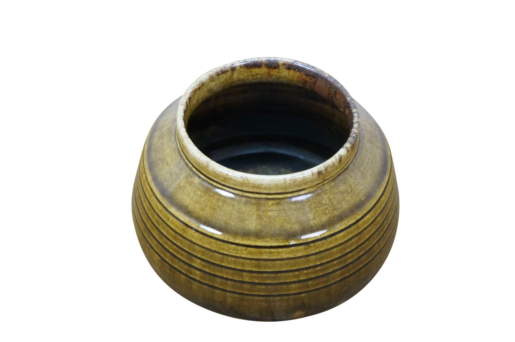 Vintage studio pottery vase or bowl by Thai Celadon. It features a ribbed texture with a brown / green / olive glaze.