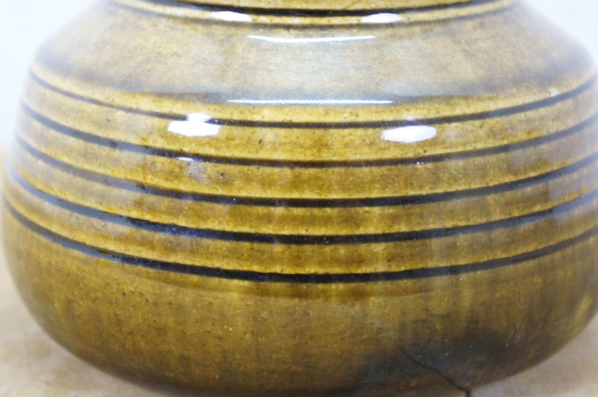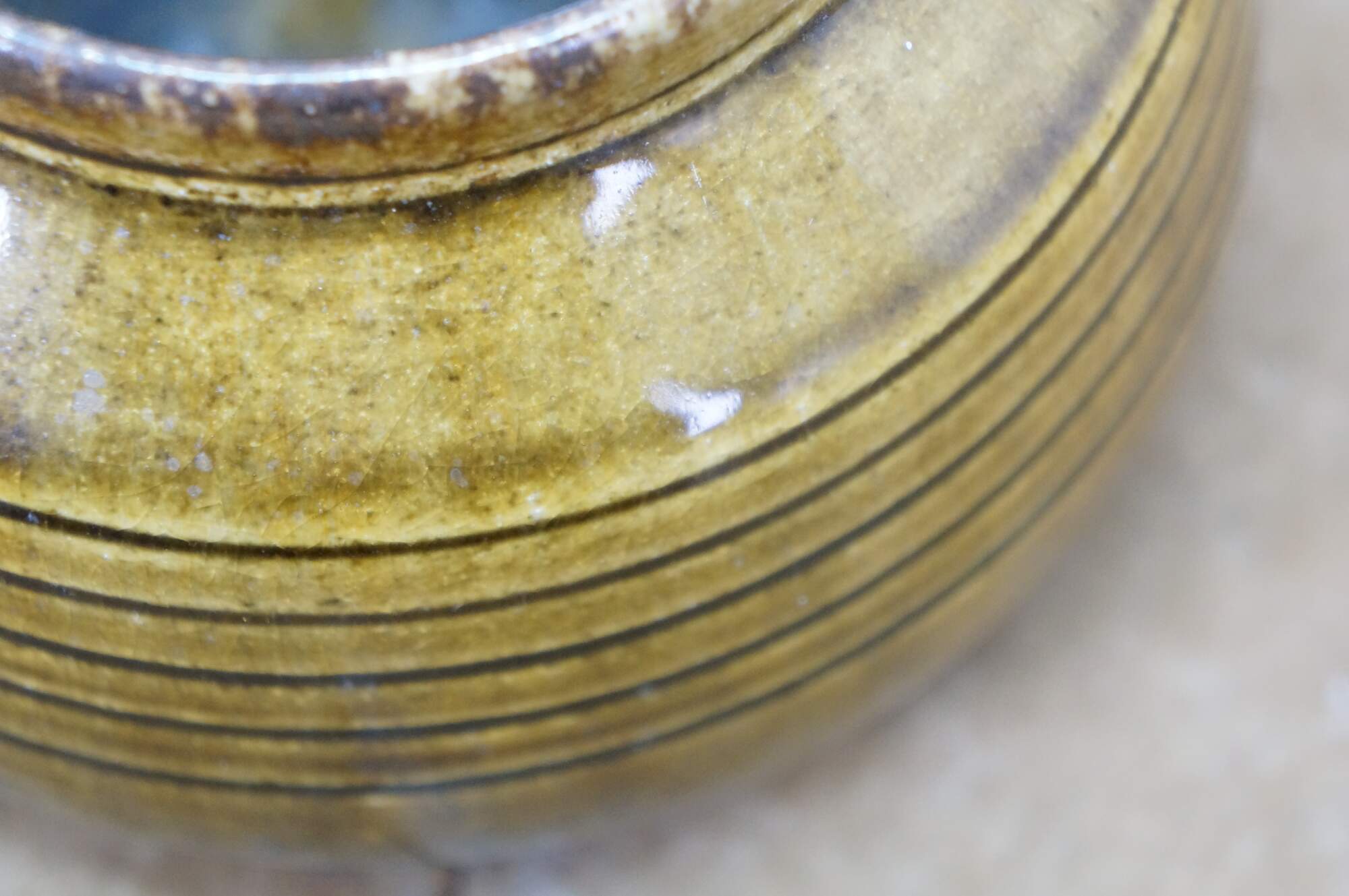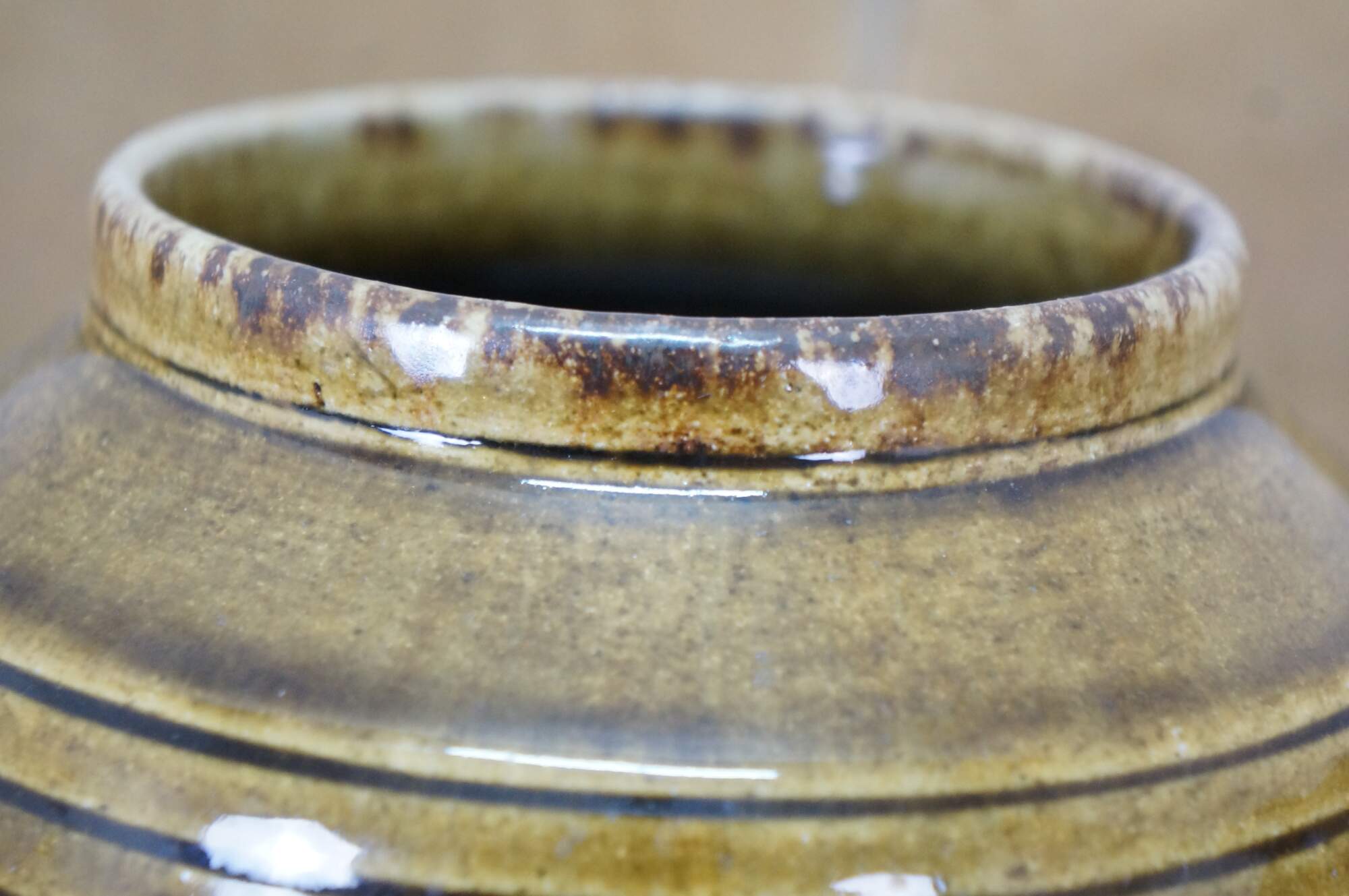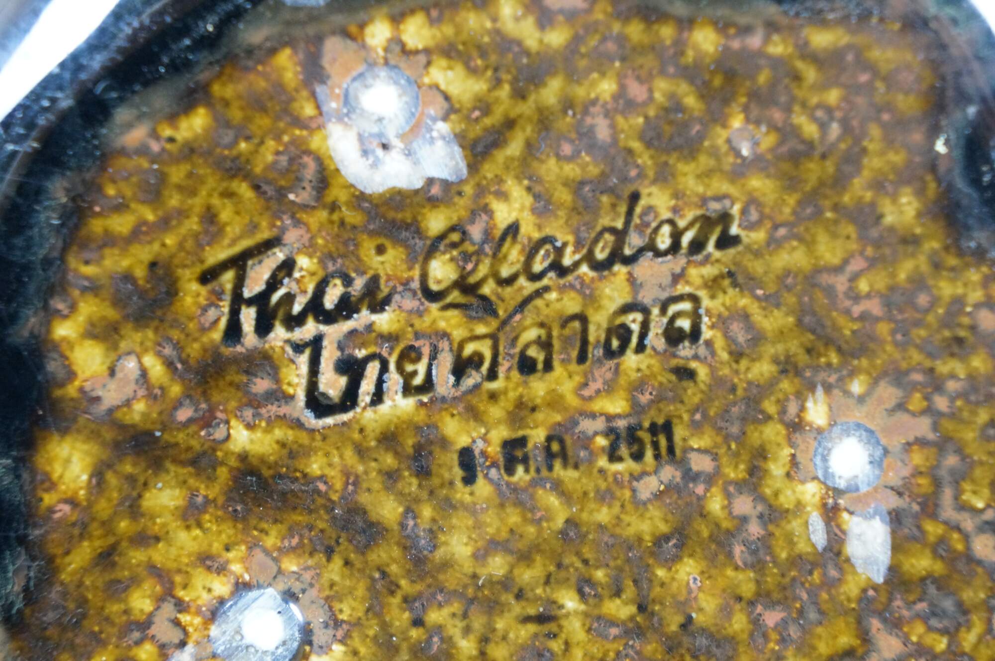 Vintage studio pottery vase or bowl by Thai Celadon. It features a ribbed texture with a brown / green / olive glaze.