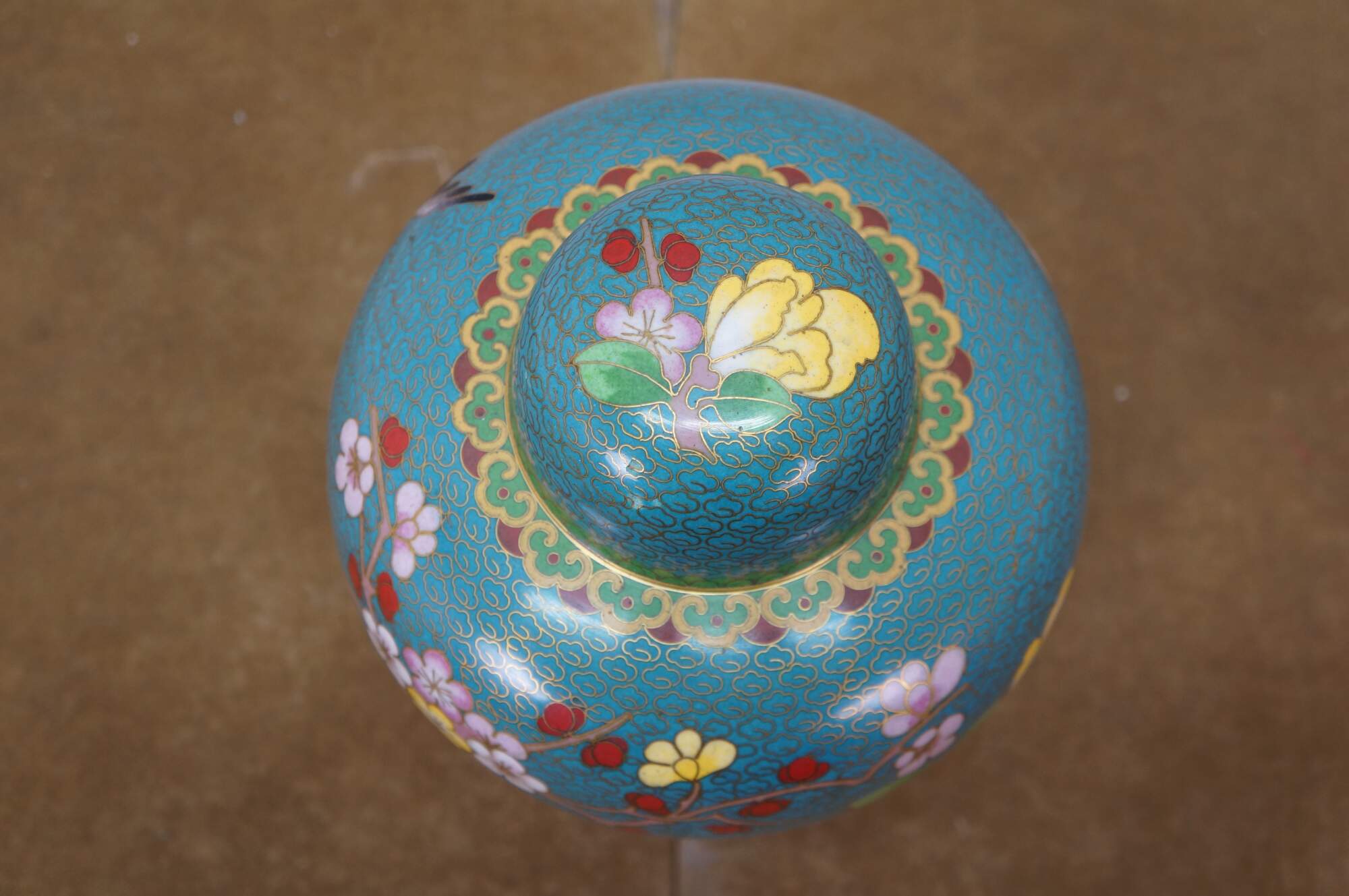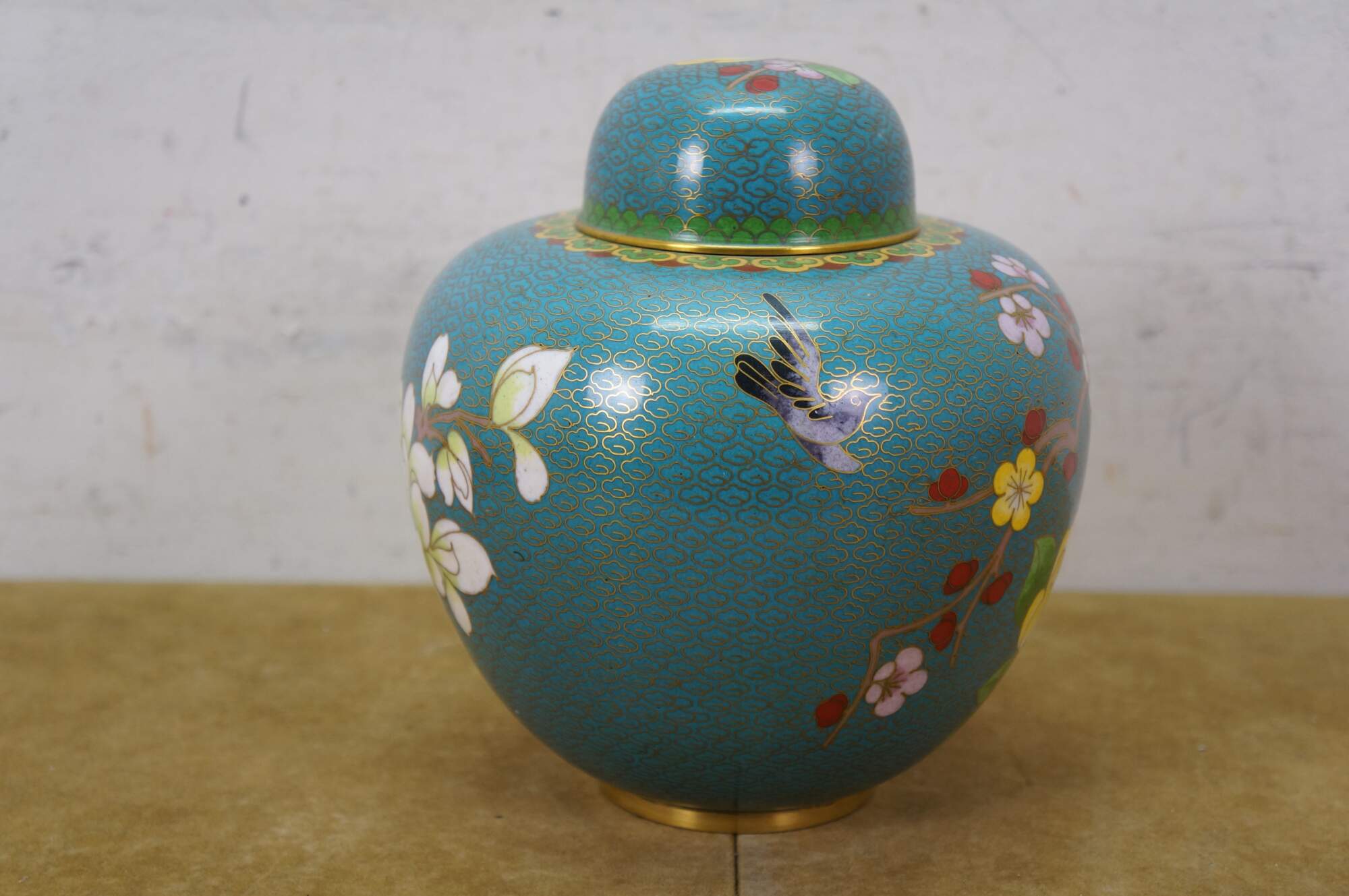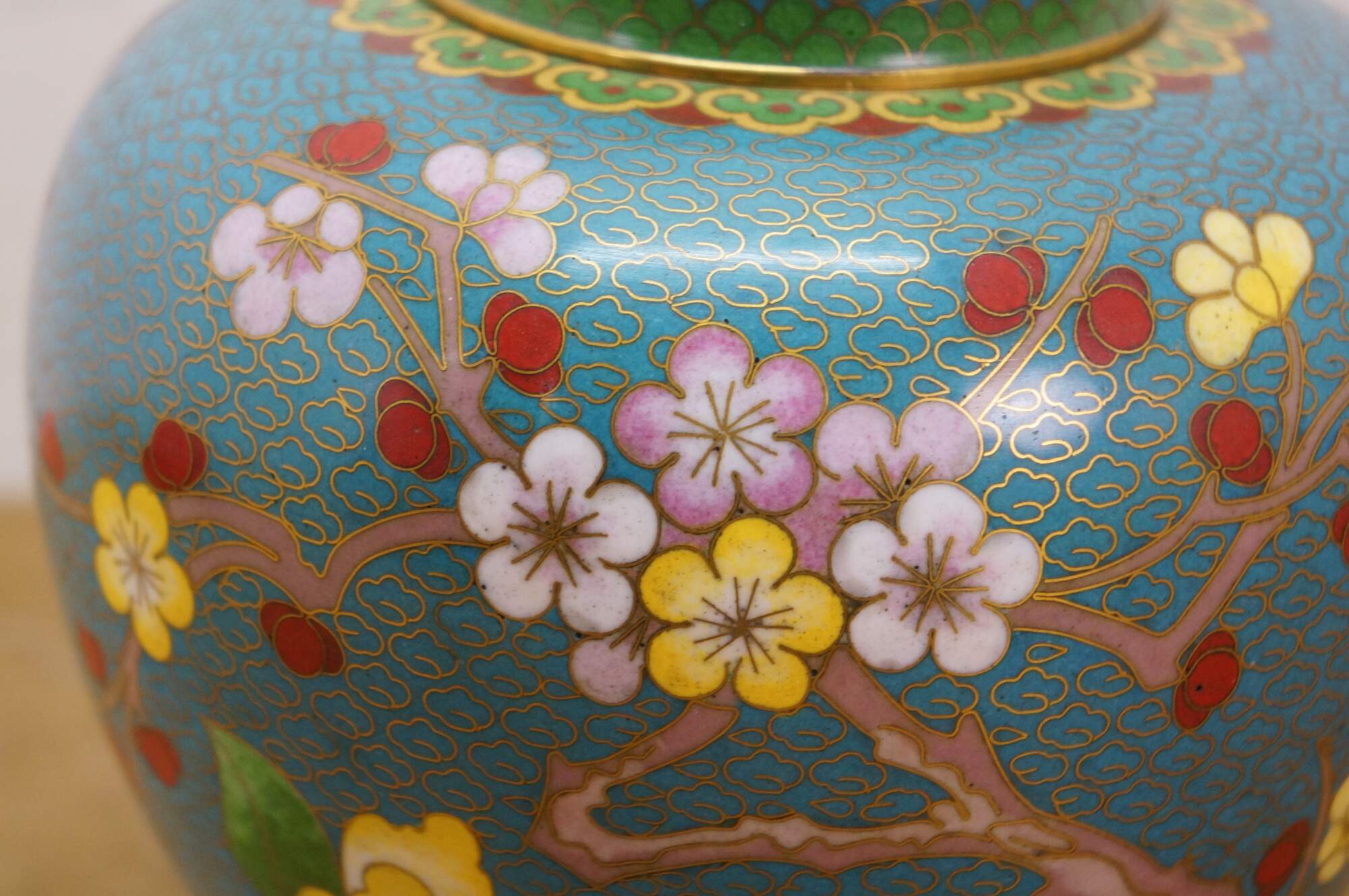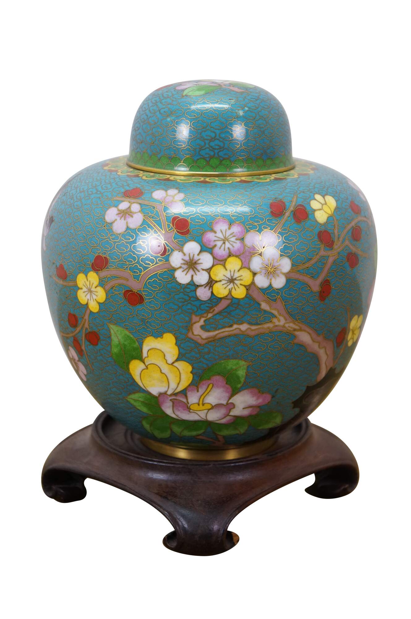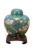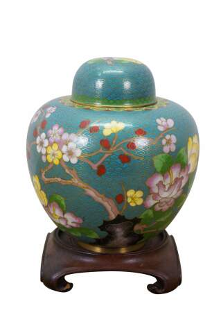 Antique Chinese brass cloisonné enameled Ginger Jar / mantle vase / lidded urn with a floral Cherry Blossom tree and bird motif against a turquoise blue sky. Includes wooden stand.