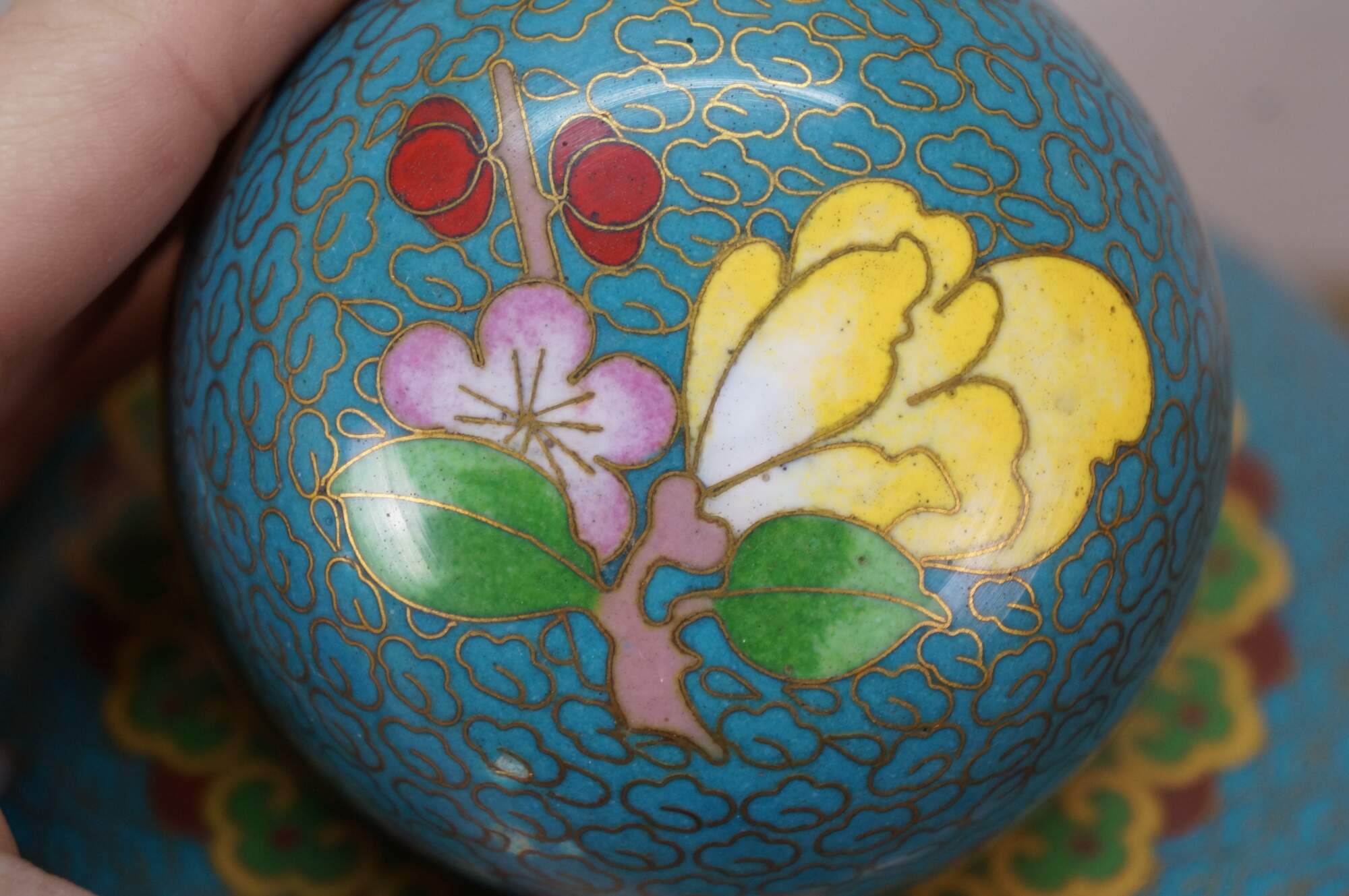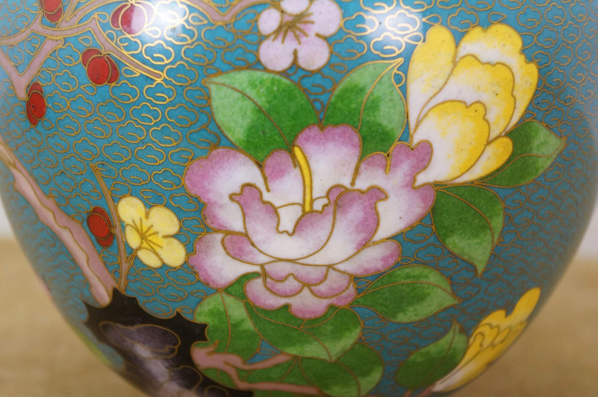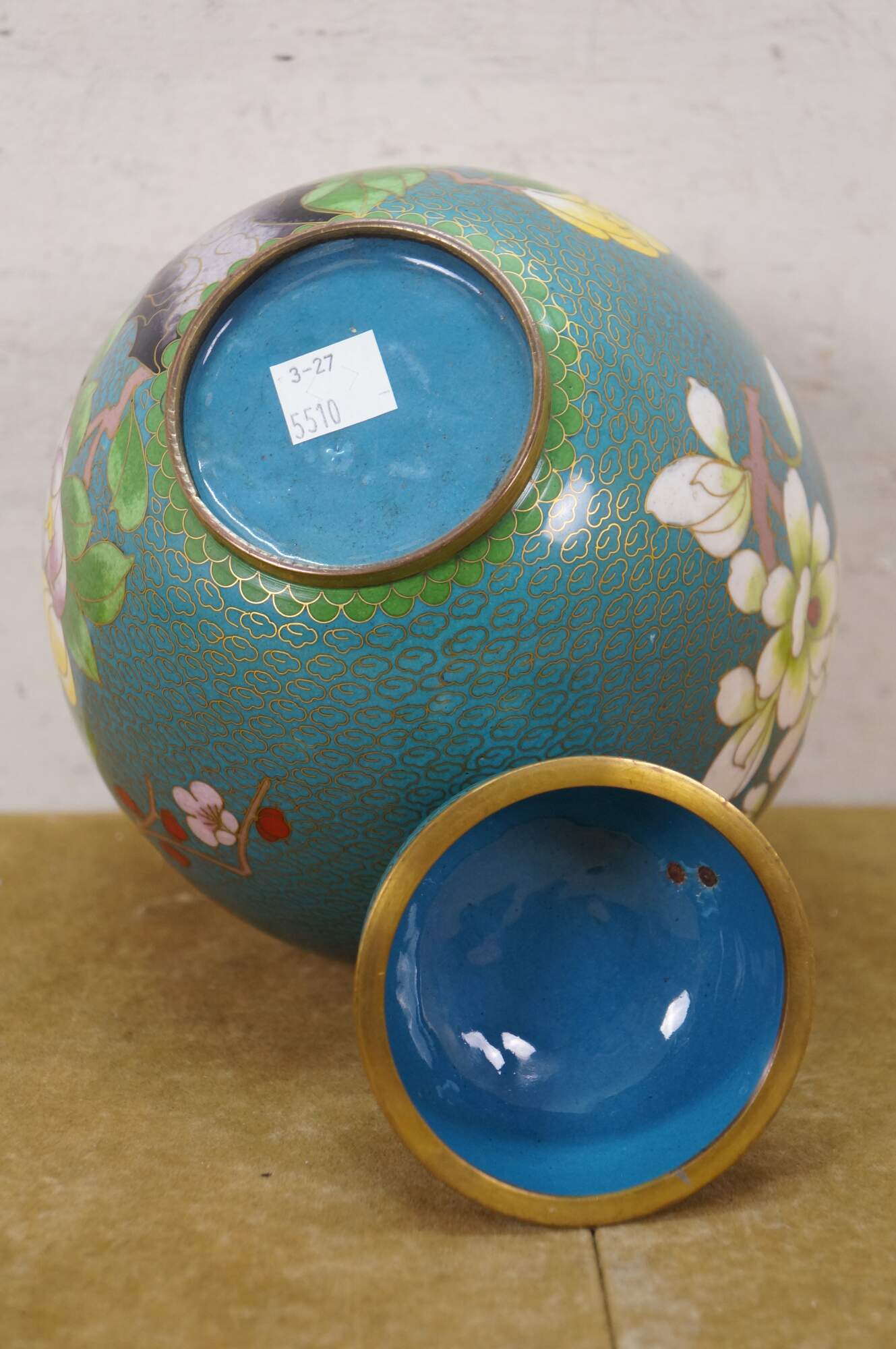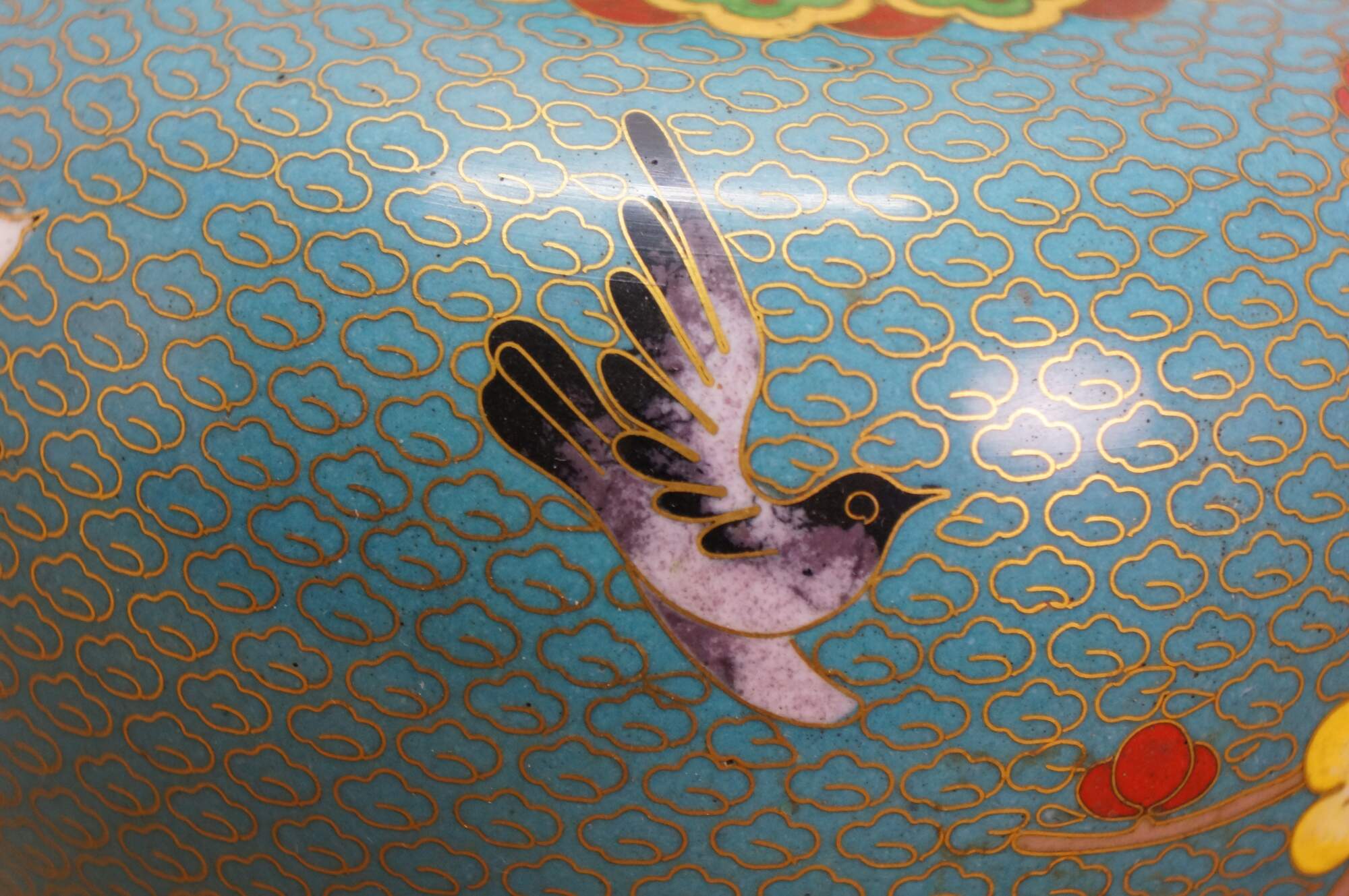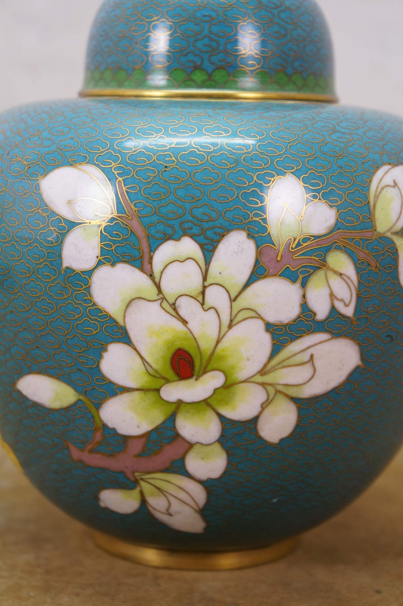 Antique Chinese brass cloisonné enameled Ginger Jar / mantle vase / lidded urn with a floral Cherry Blossom tree and bird motif against a turquoise blue sky. Includes wooden stand.