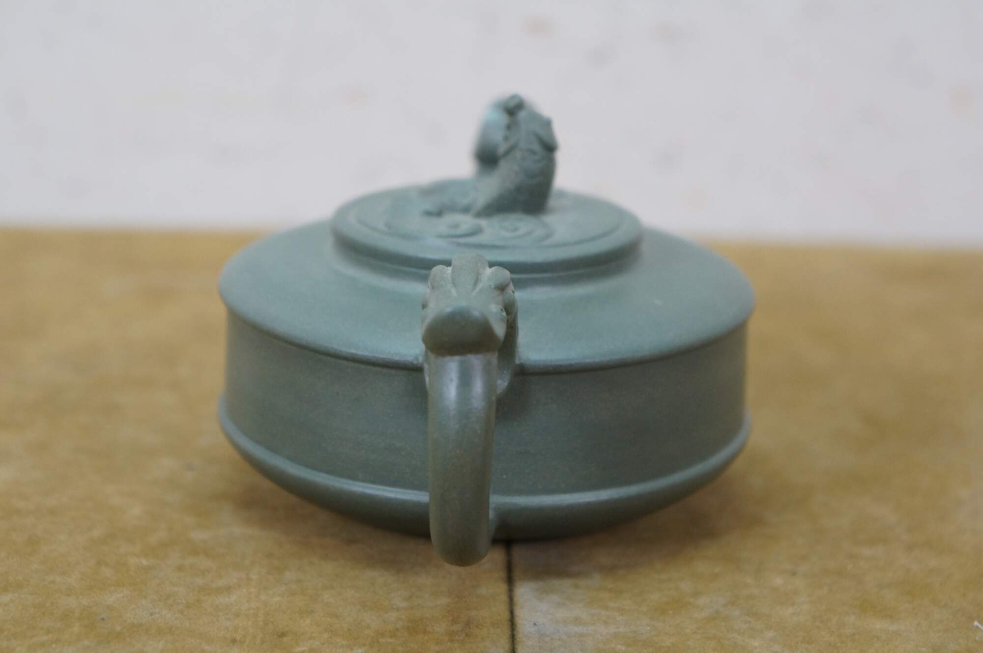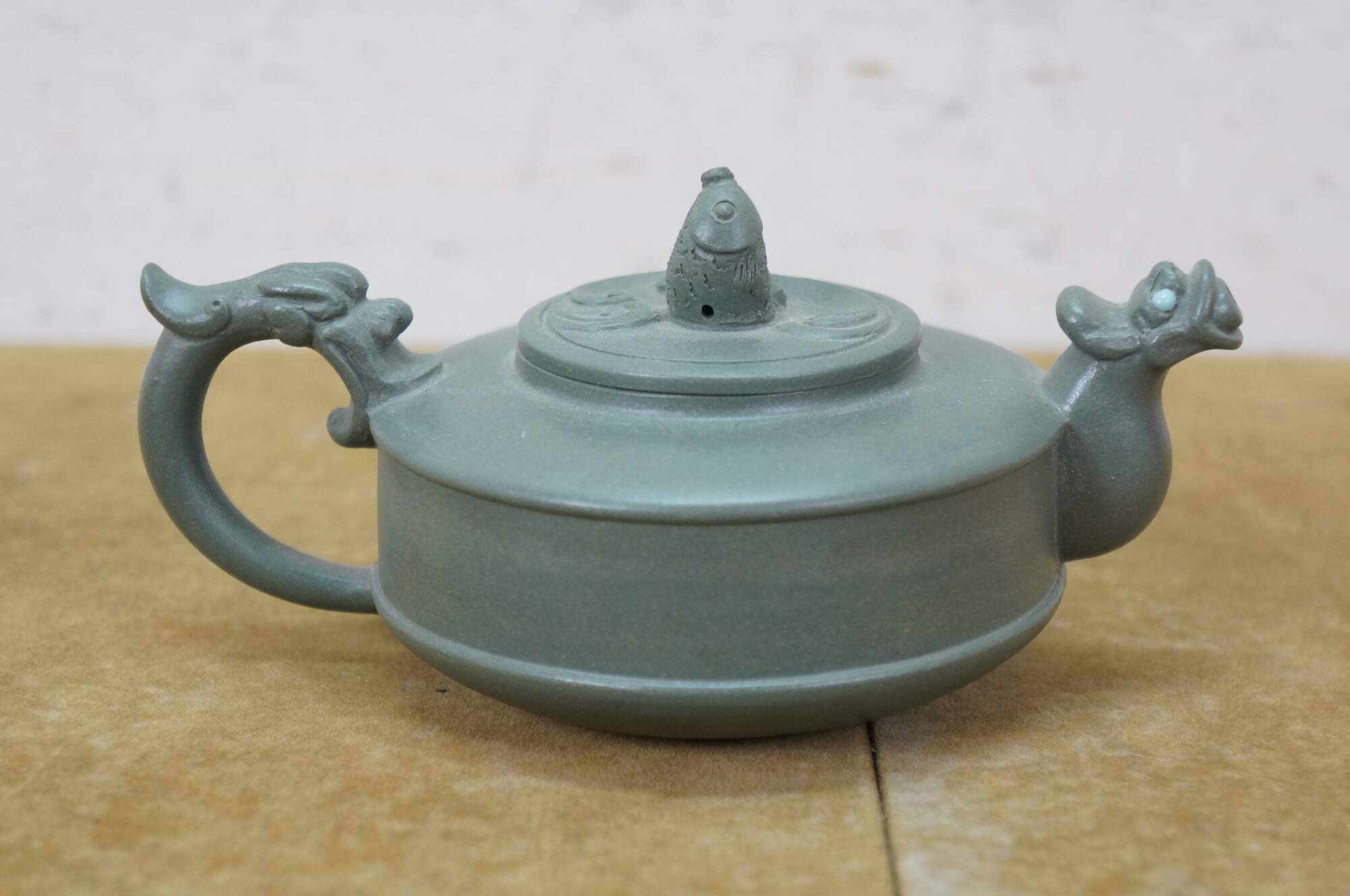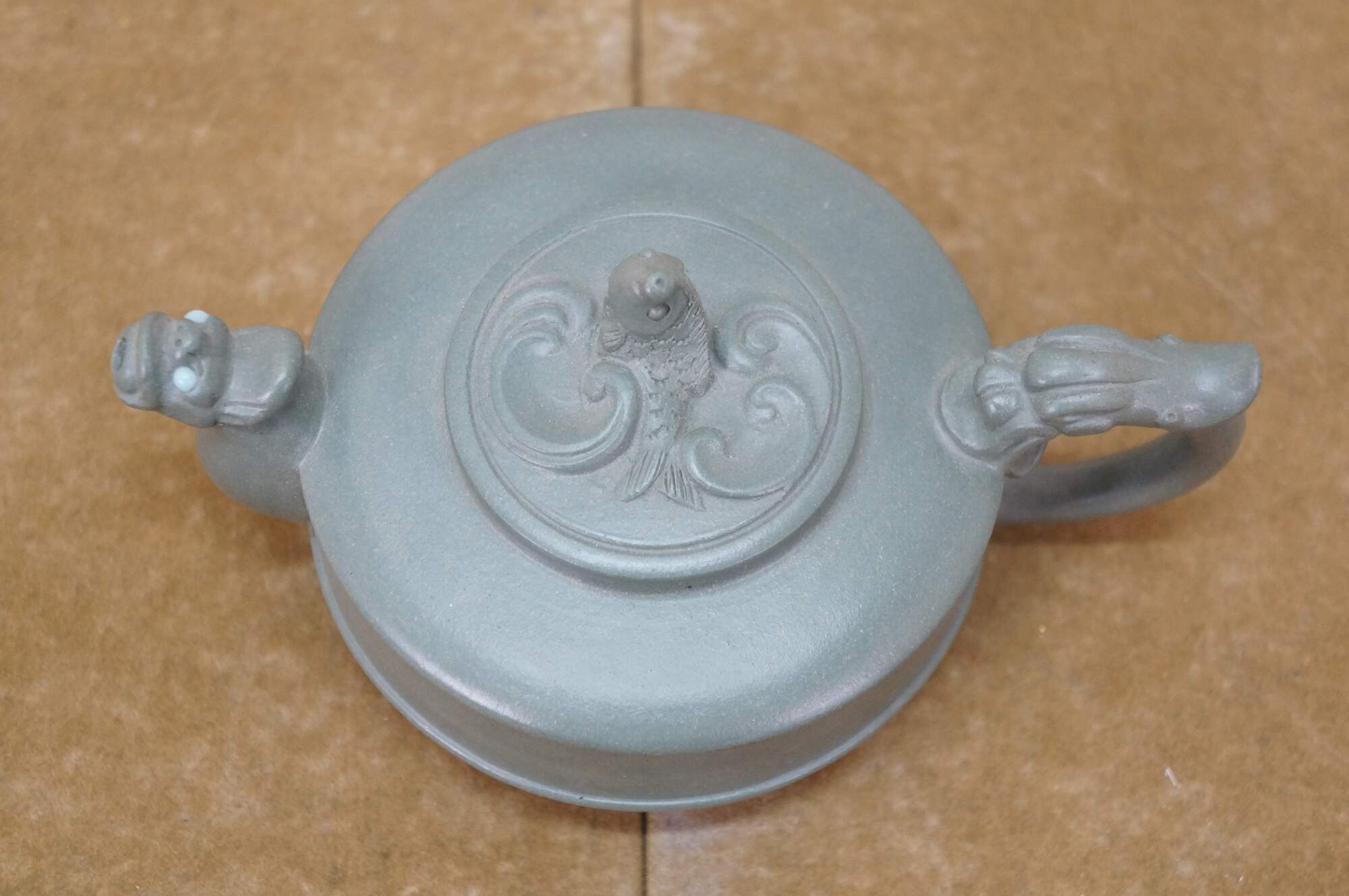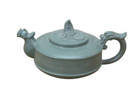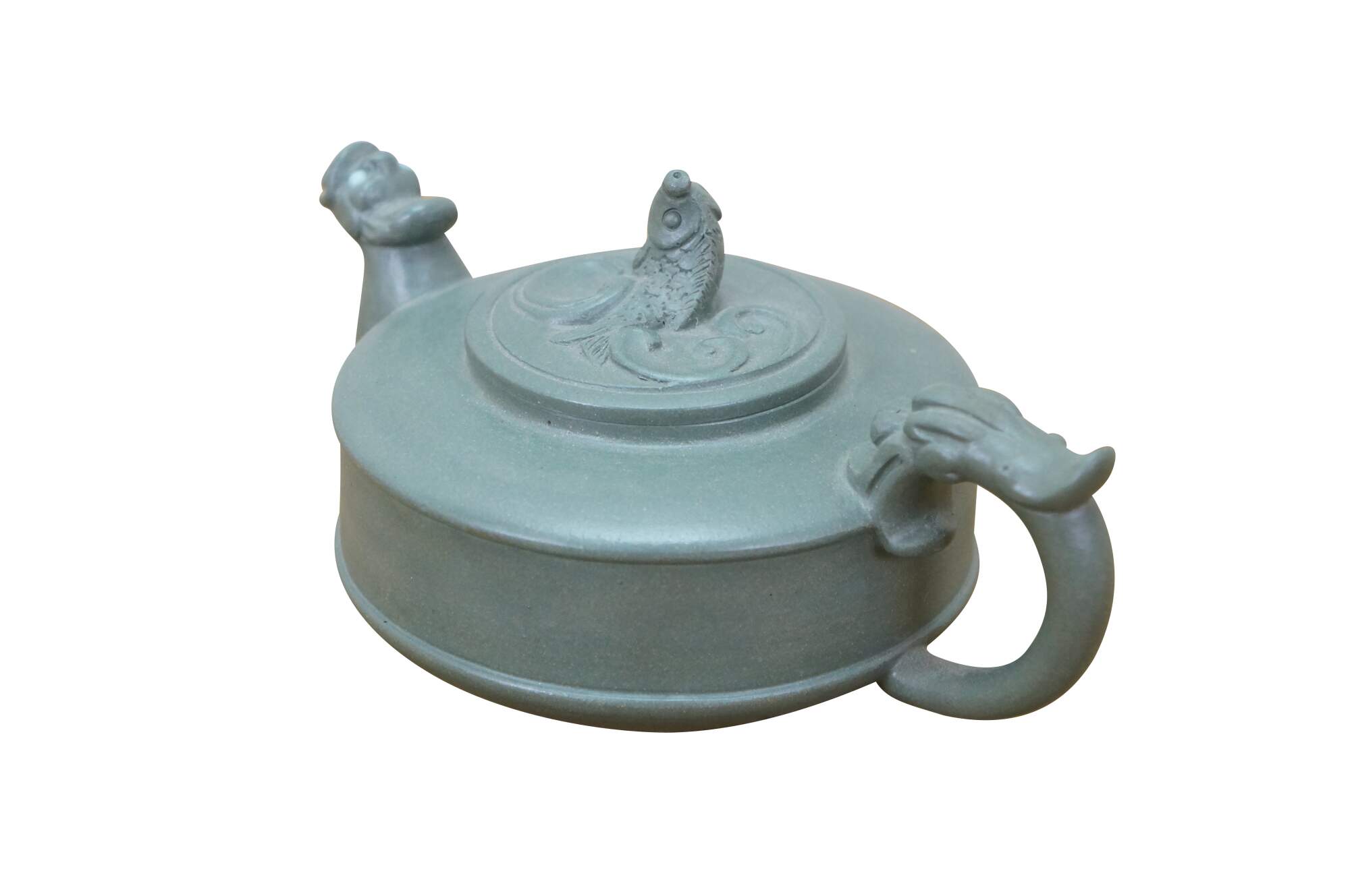 Beautiful vintage Chinese Yixing zisha green clay Kung Fu tea / coffee pot with a Dragon / serpent / Koi fish motif.