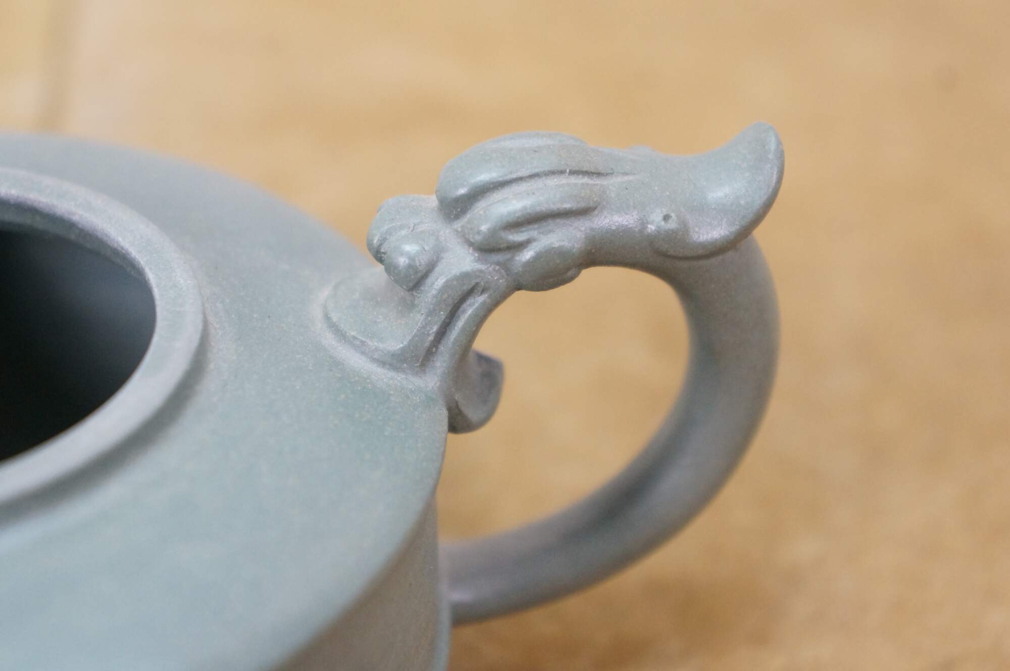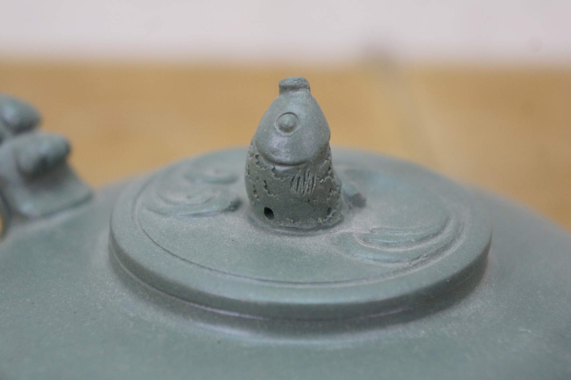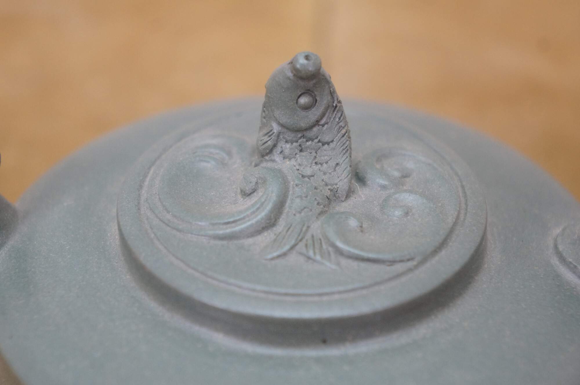 Beautiful vintage Chinese Yixing zisha green clay Kung Fu tea / coffee pot with a Dragon / serpent / Koi fish motif.