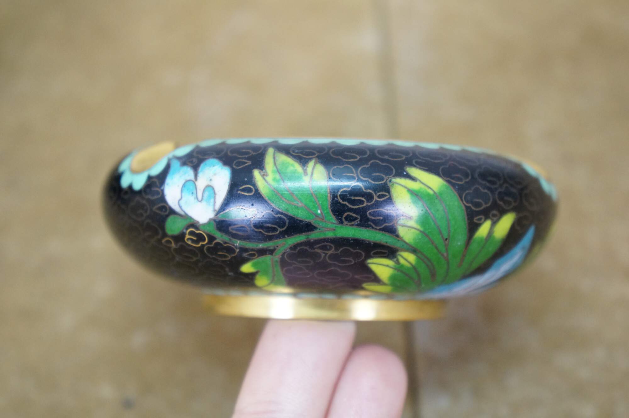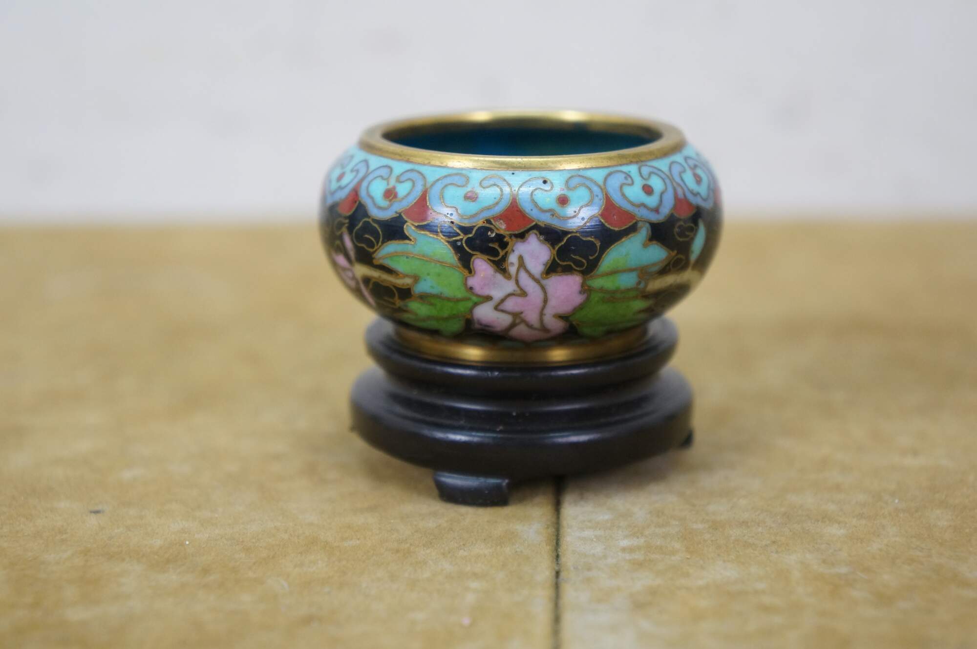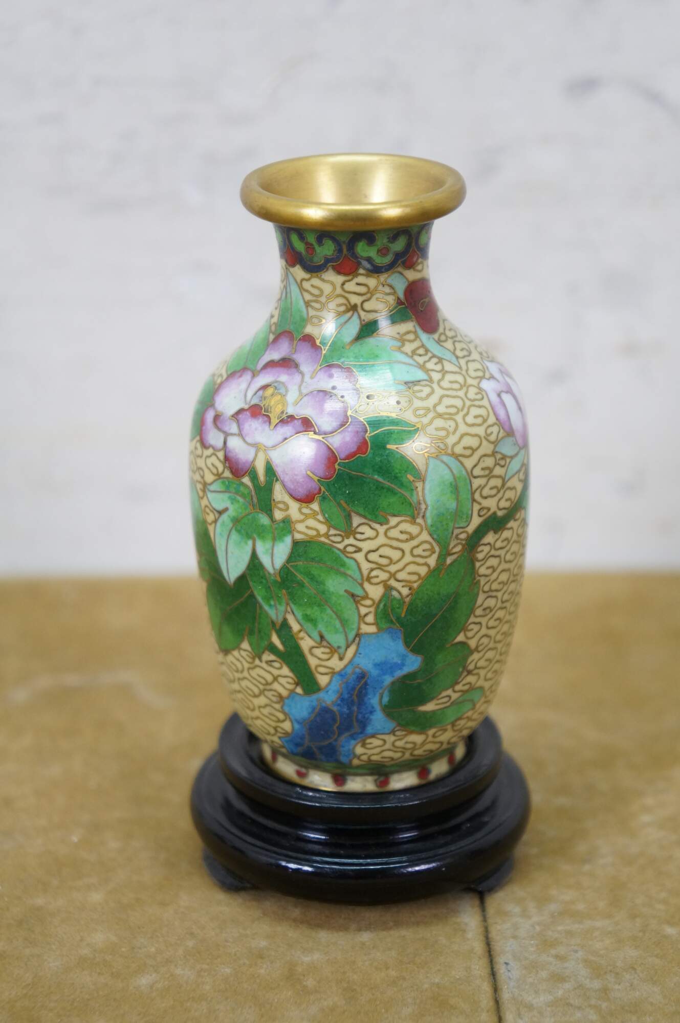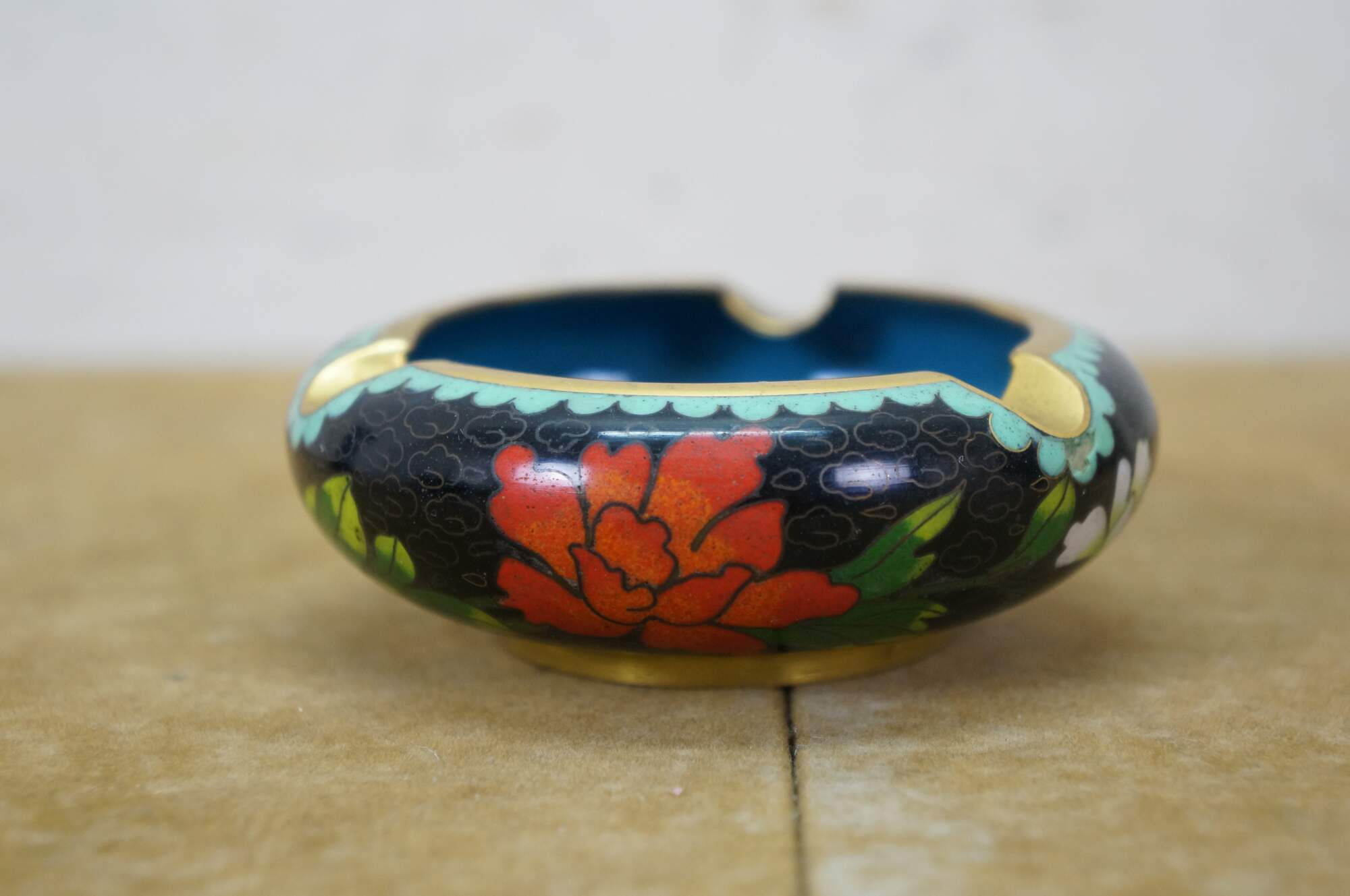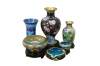 Six vintage Chinese cloisonné enamel vases, bowls / ashtrays, and vases featuring a variety of style and patterns, including cherry blossoms, chrysanthemums, peonies, and birds. Each piece includes a base.