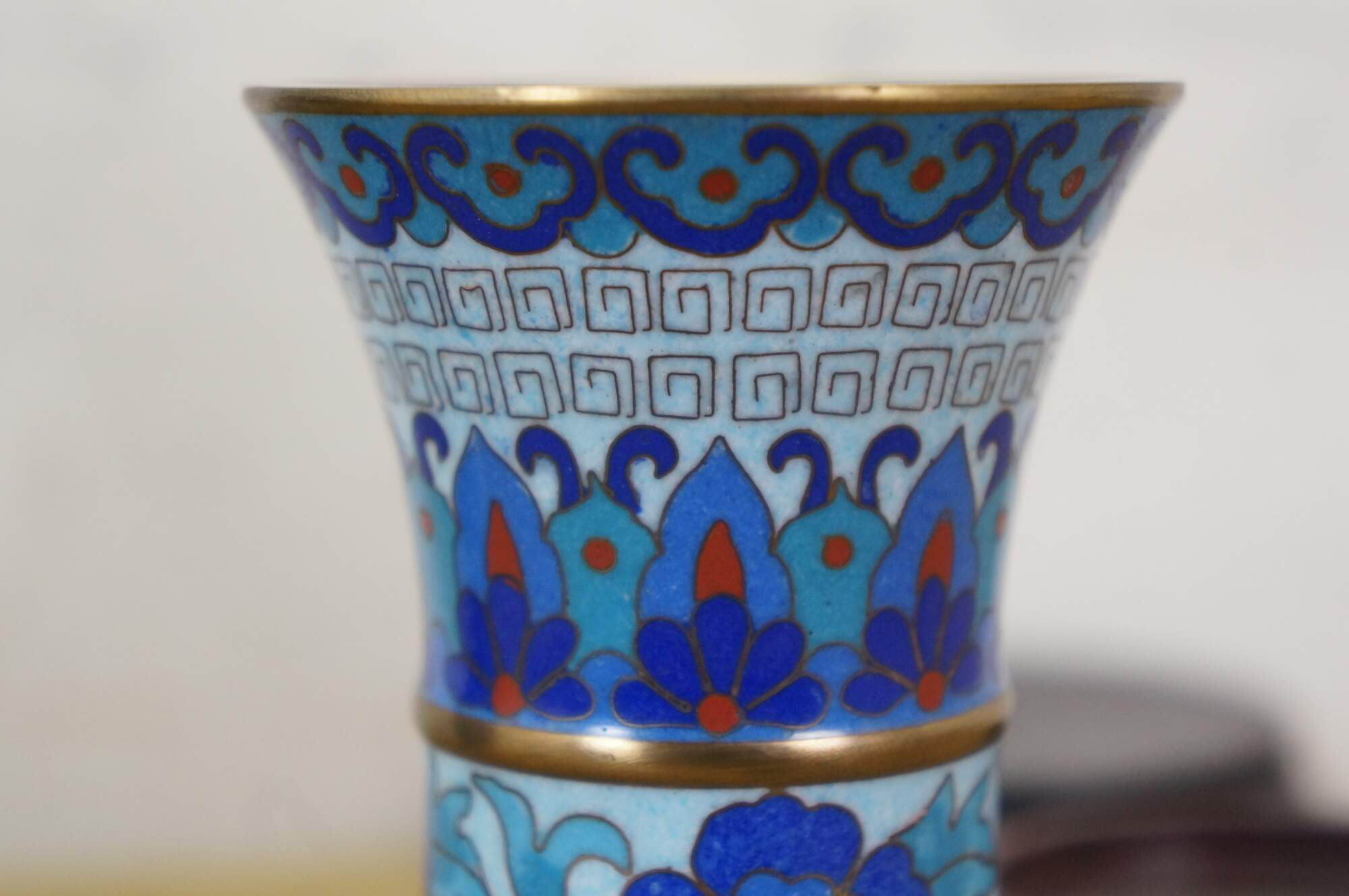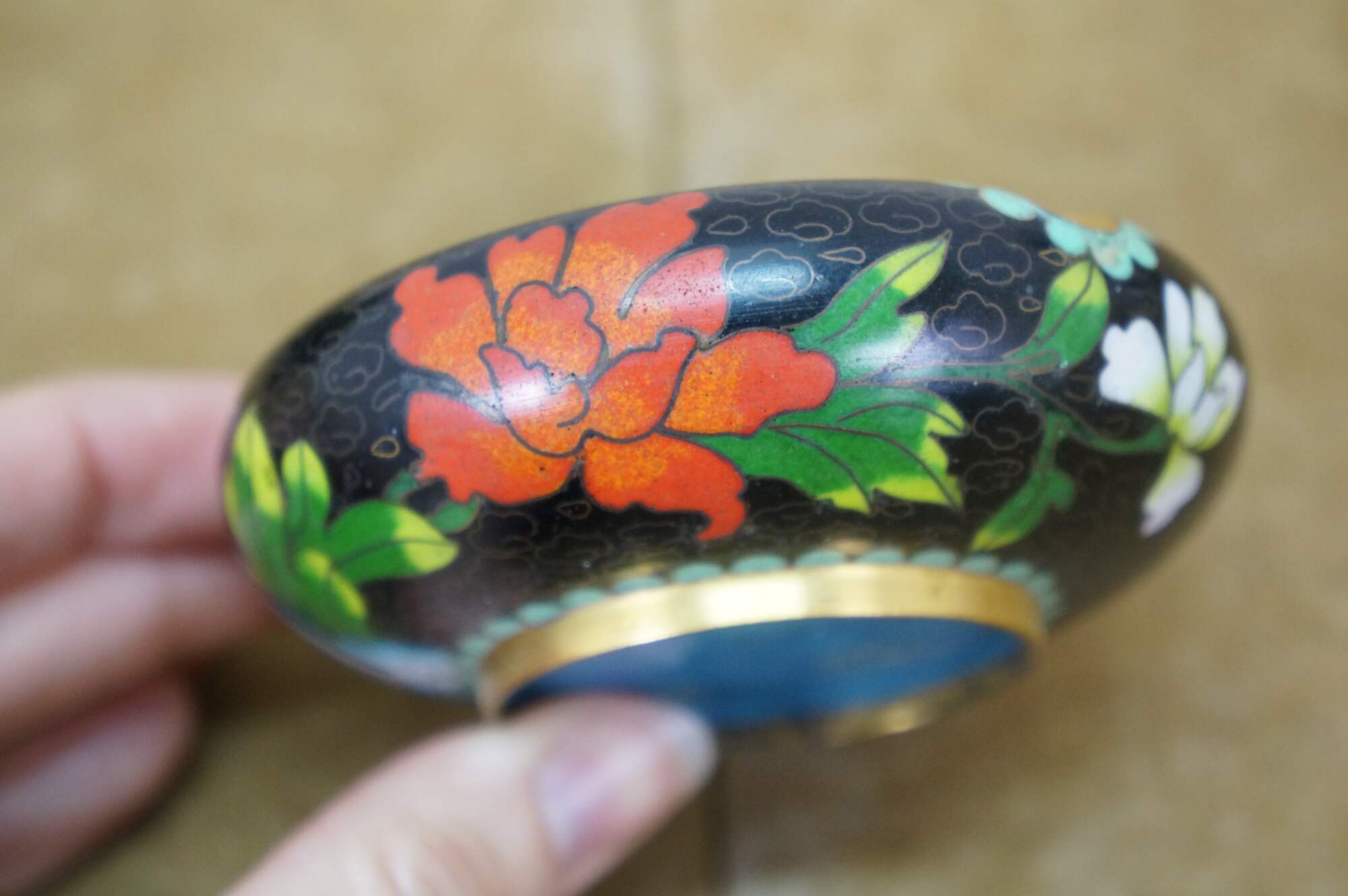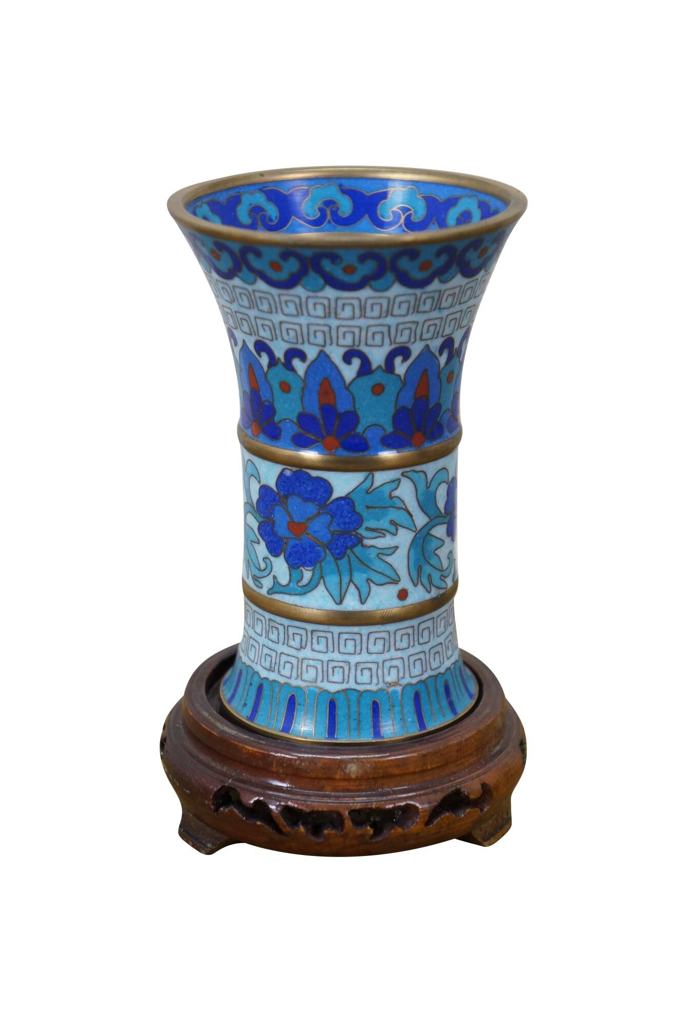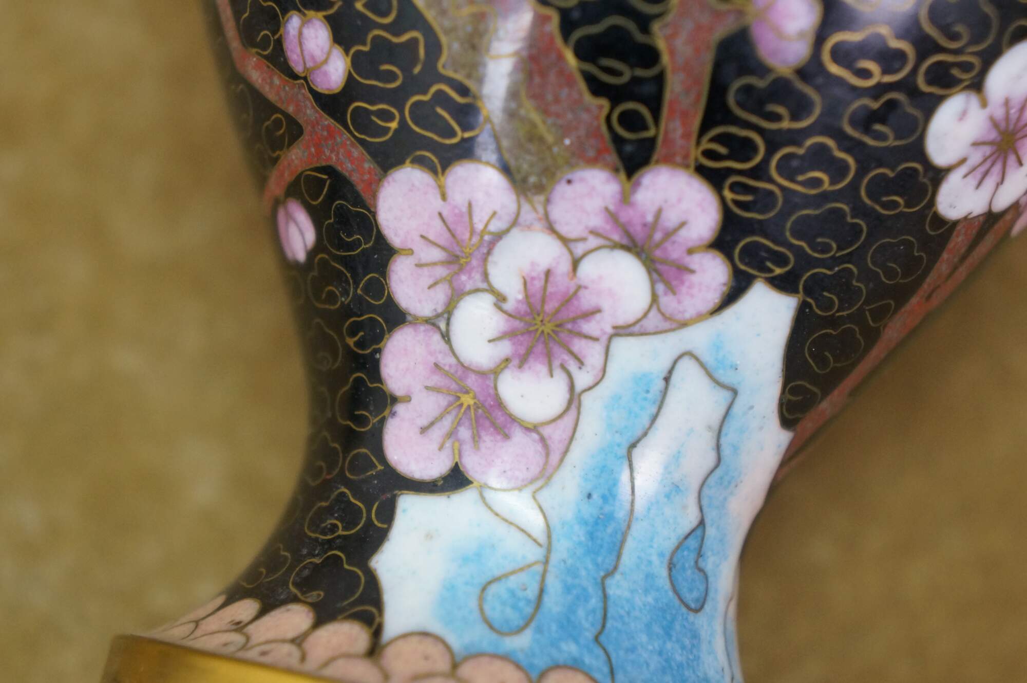 Six vintage Chinese cloisonné enamel vases, bowls / ashtrays, and vases featuring a variety of style and patterns, including cherry blossoms, chrysanthemums, peonies, and birds. Each piece includes a base.