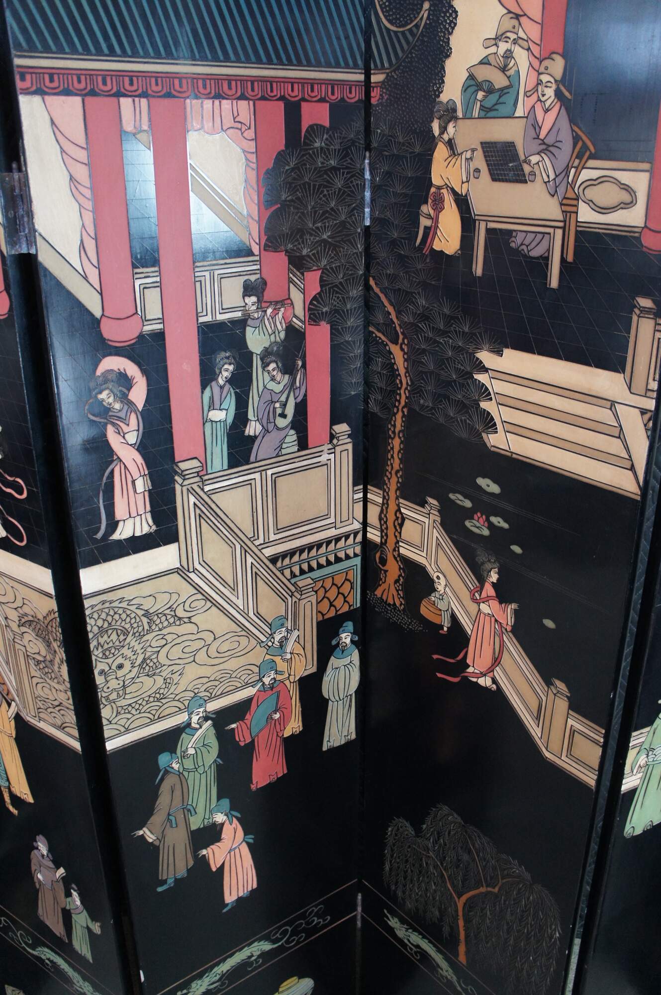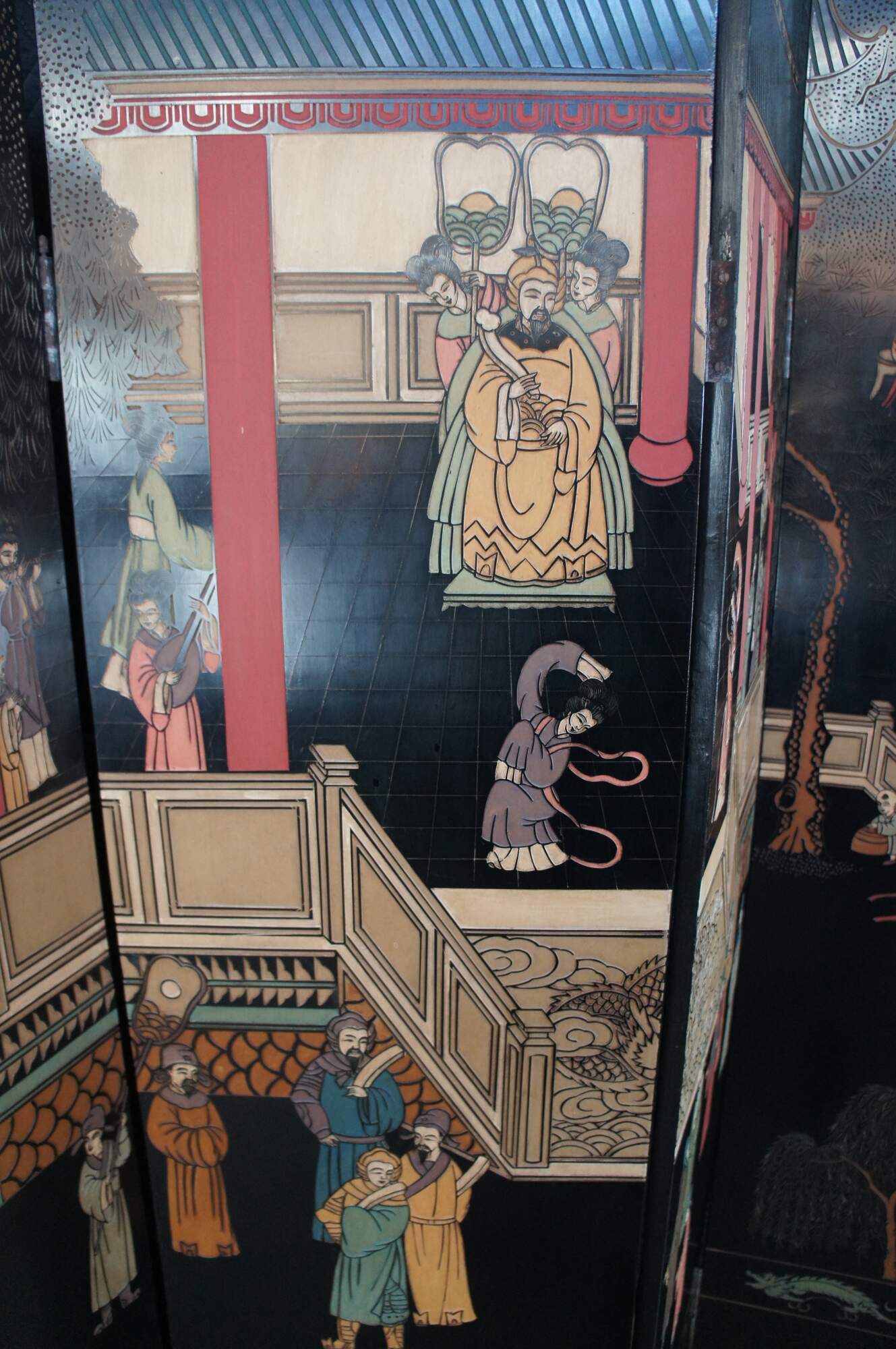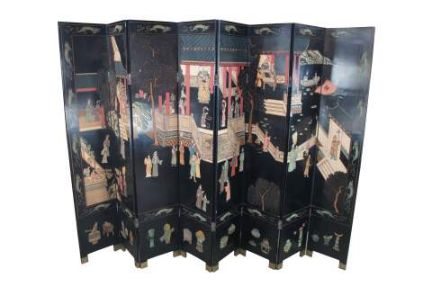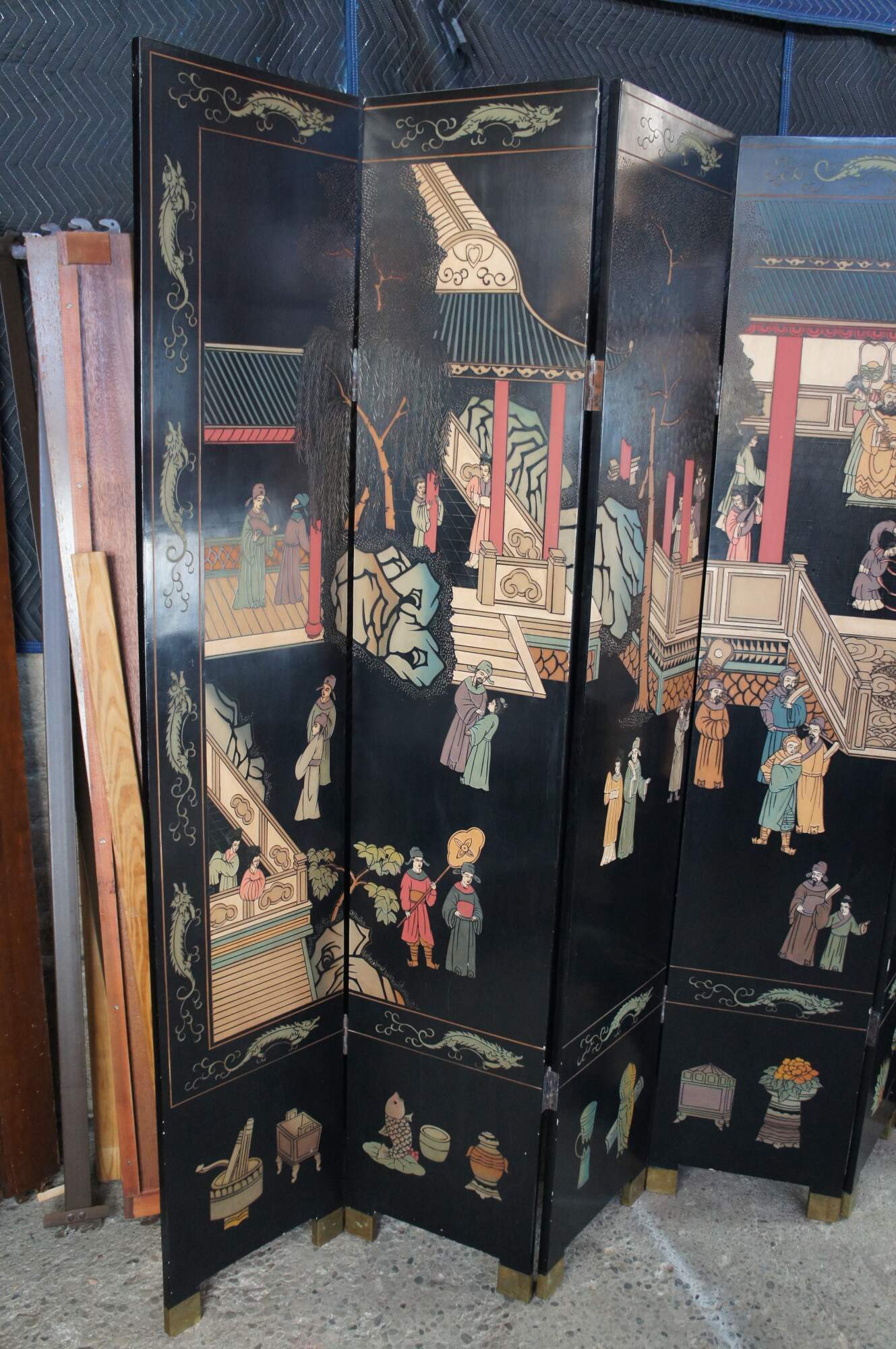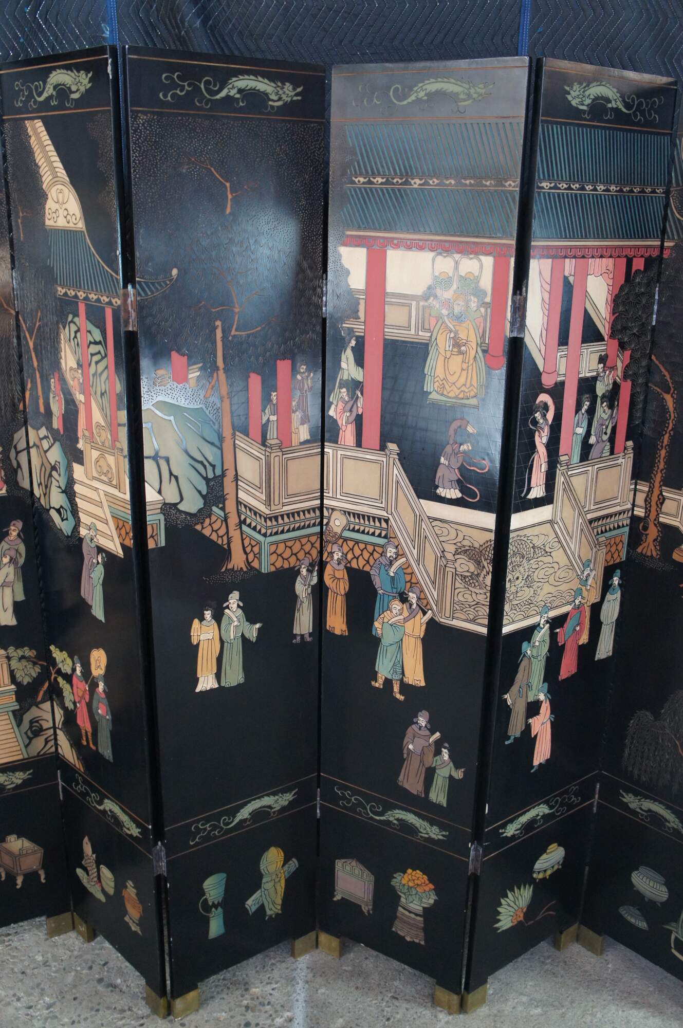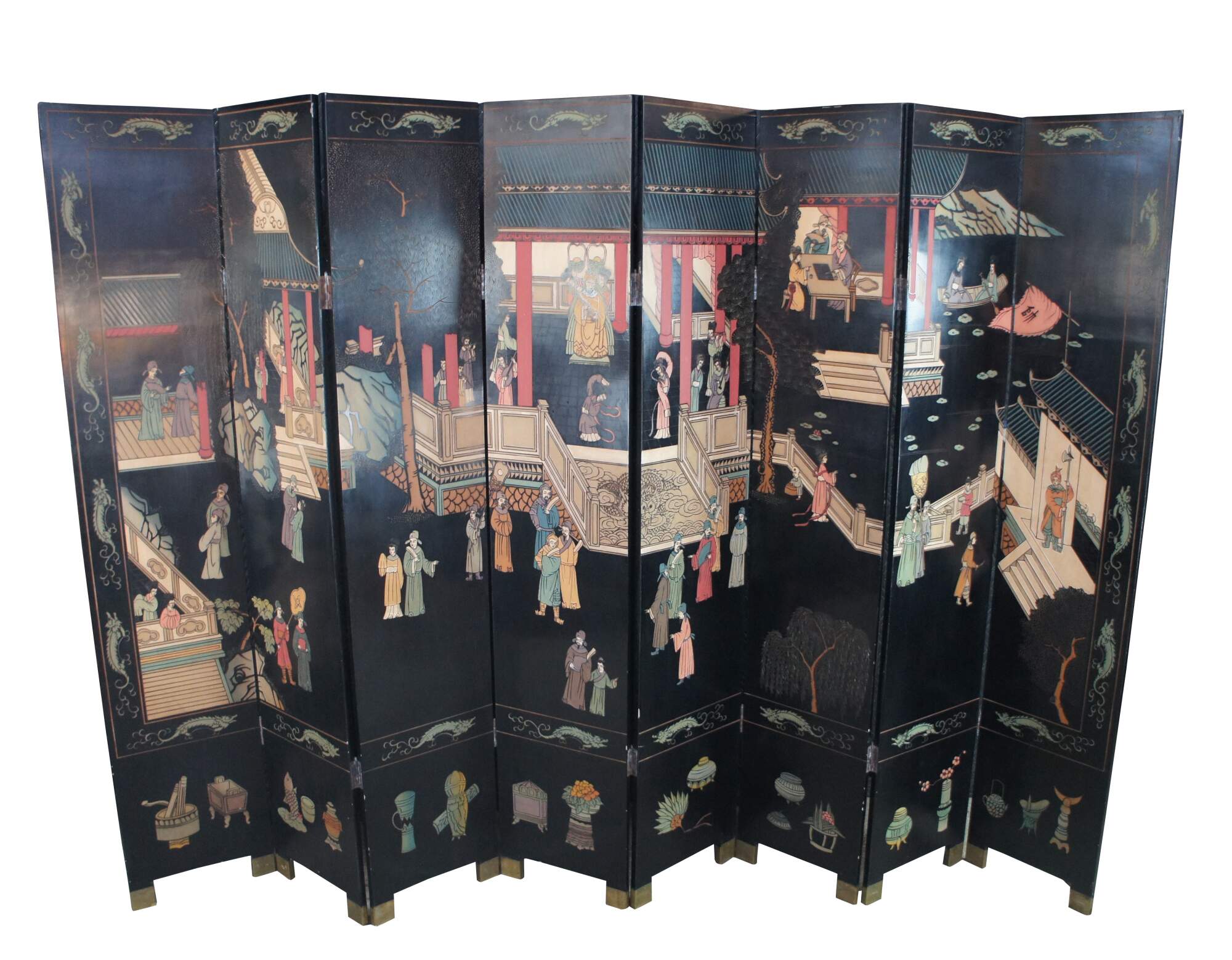 Impressive mid 20th century Chinese coromandel lacquered eight panel folding screen featuring a grand Palace / Courtyard scene. In this scene, the Emperor sits central, flanked by Geishas, musicians and dancers. At the front gate there are Samurai guards, and in the back room, figures gamble and play games. The Palace has traditional Chinese elements with gnarled pines, Willow trees, and Pagoda style architecture. The border has a repeating pattern of mythical Dragons / Serpents, and the bottom is adorned with scholars tools / ancient pots and garden elements.