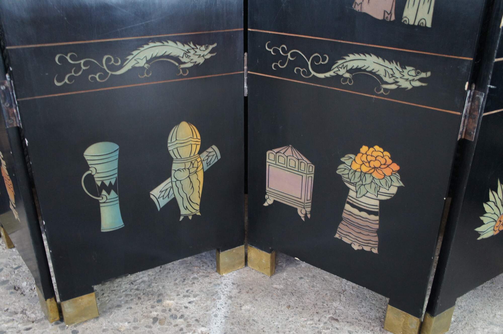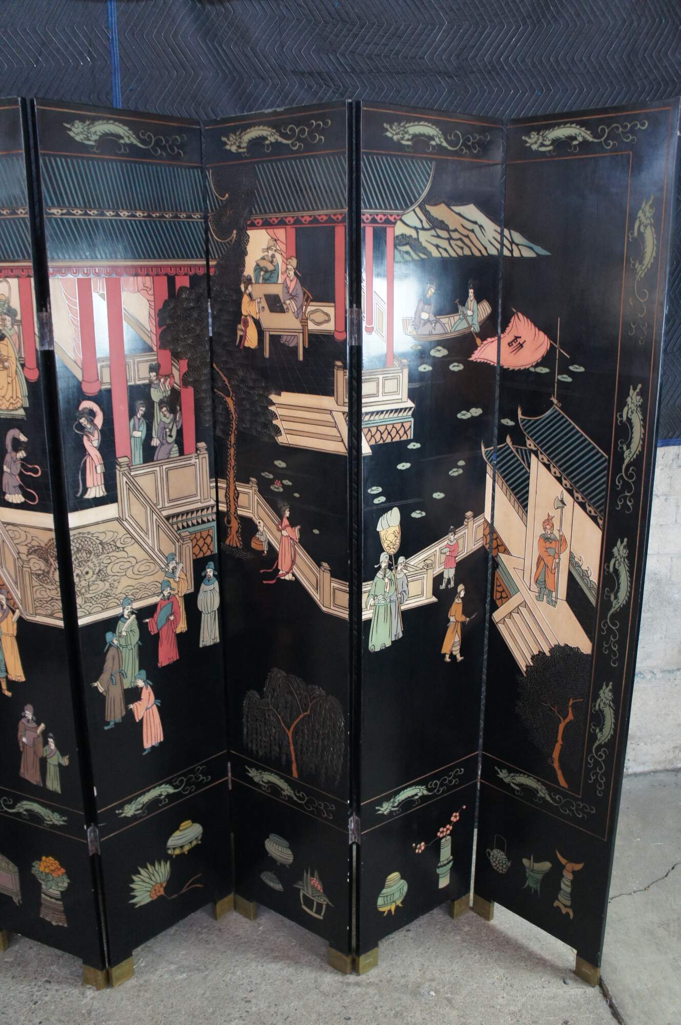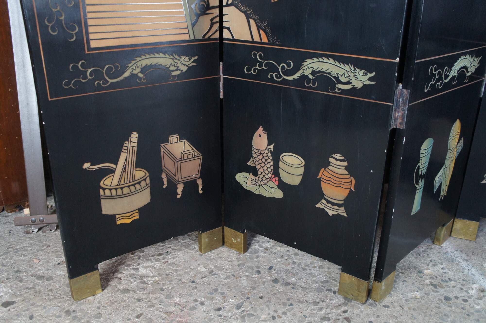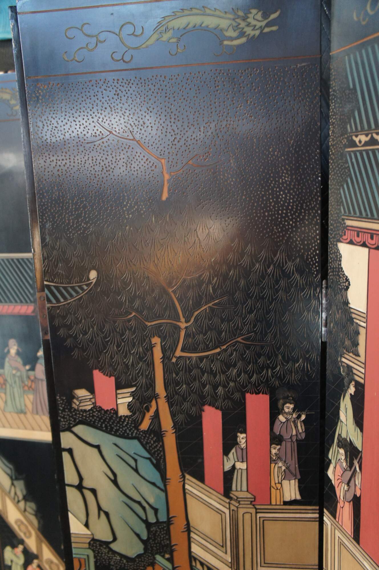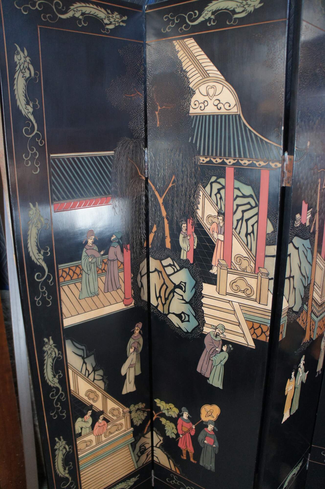 Impressive mid 20th century Chinese coromandel lacquered eight panel folding screen featuring a grand Palace / Courtyard scene. In this scene, the Emperor sits central, flanked by Geishas, musicians and dancers. At the front gate there are Samurai guards, and in the back room, figures gamble and play games. The Palace has traditional Chinese elements with gnarled pines, Willow trees, and Pagoda style architecture. The border has a repeating pattern of mythical Dragons / Serpents, and the bottom is adorned with scholars tools / ancient pots and garden elements.