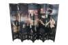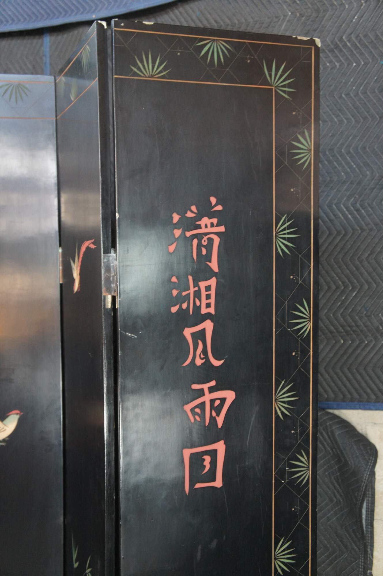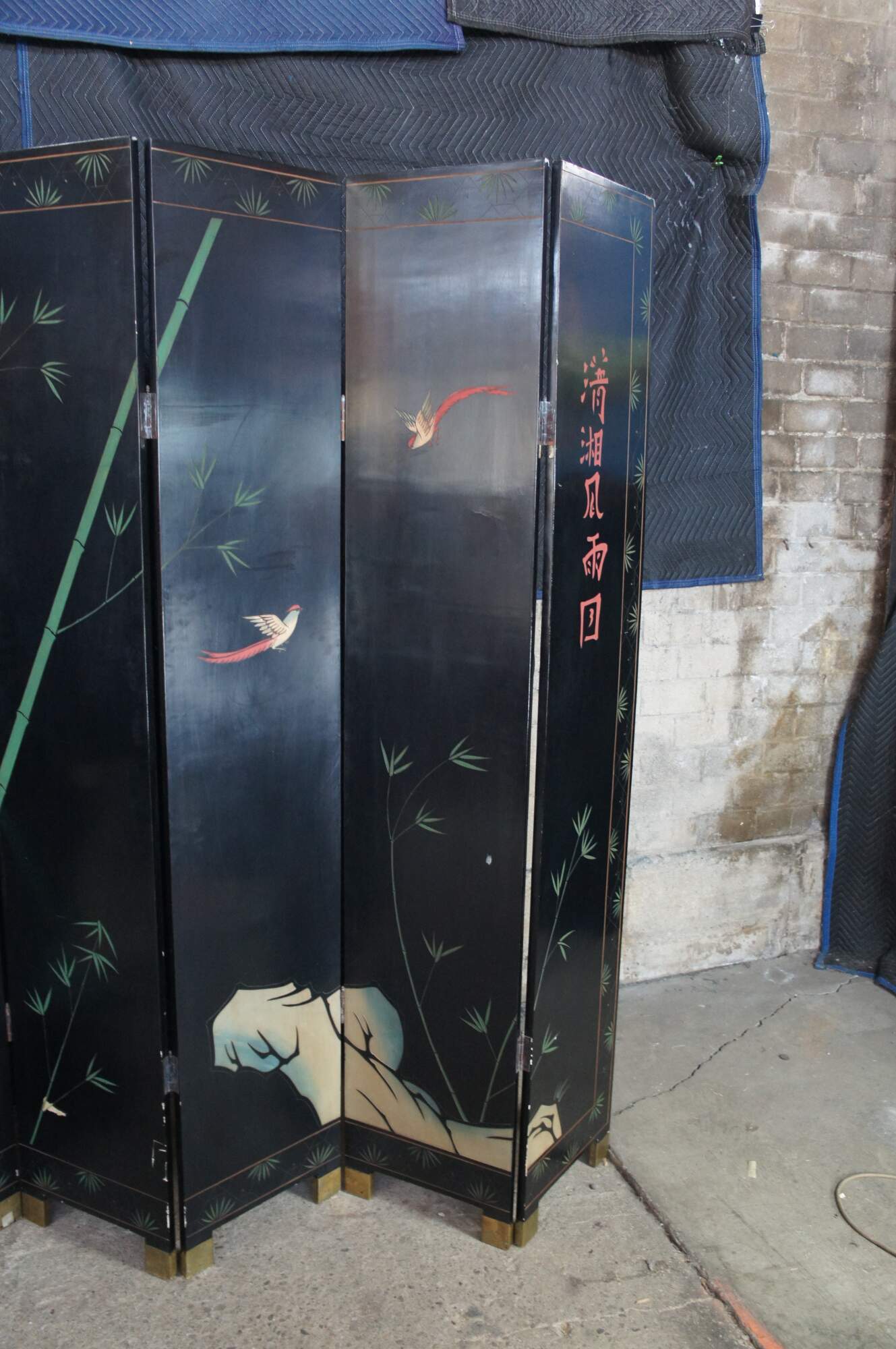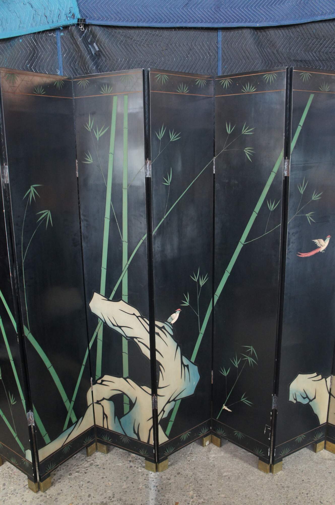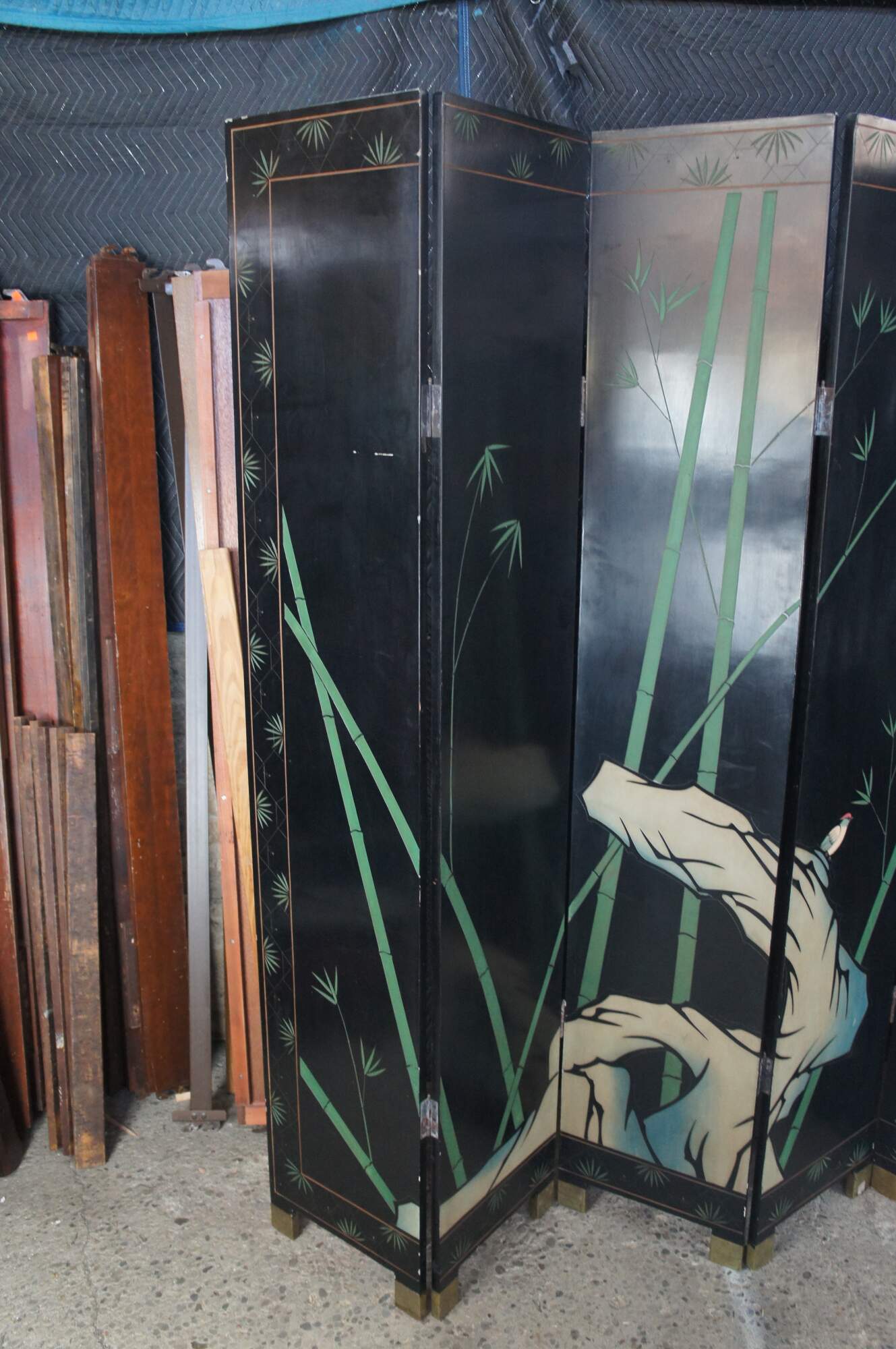 The back of the screen has a more minimalist panorama featuring sculptural scholars rocks, bamboo stalks, and Phoenix birds. Scholars' rocks, or gongshi, were prized by Chinese artists as a source of inspiration for painting, poetry and calligraphy. The scene is bordered with bamboo leaves scattered throughout. Brass capped feet.