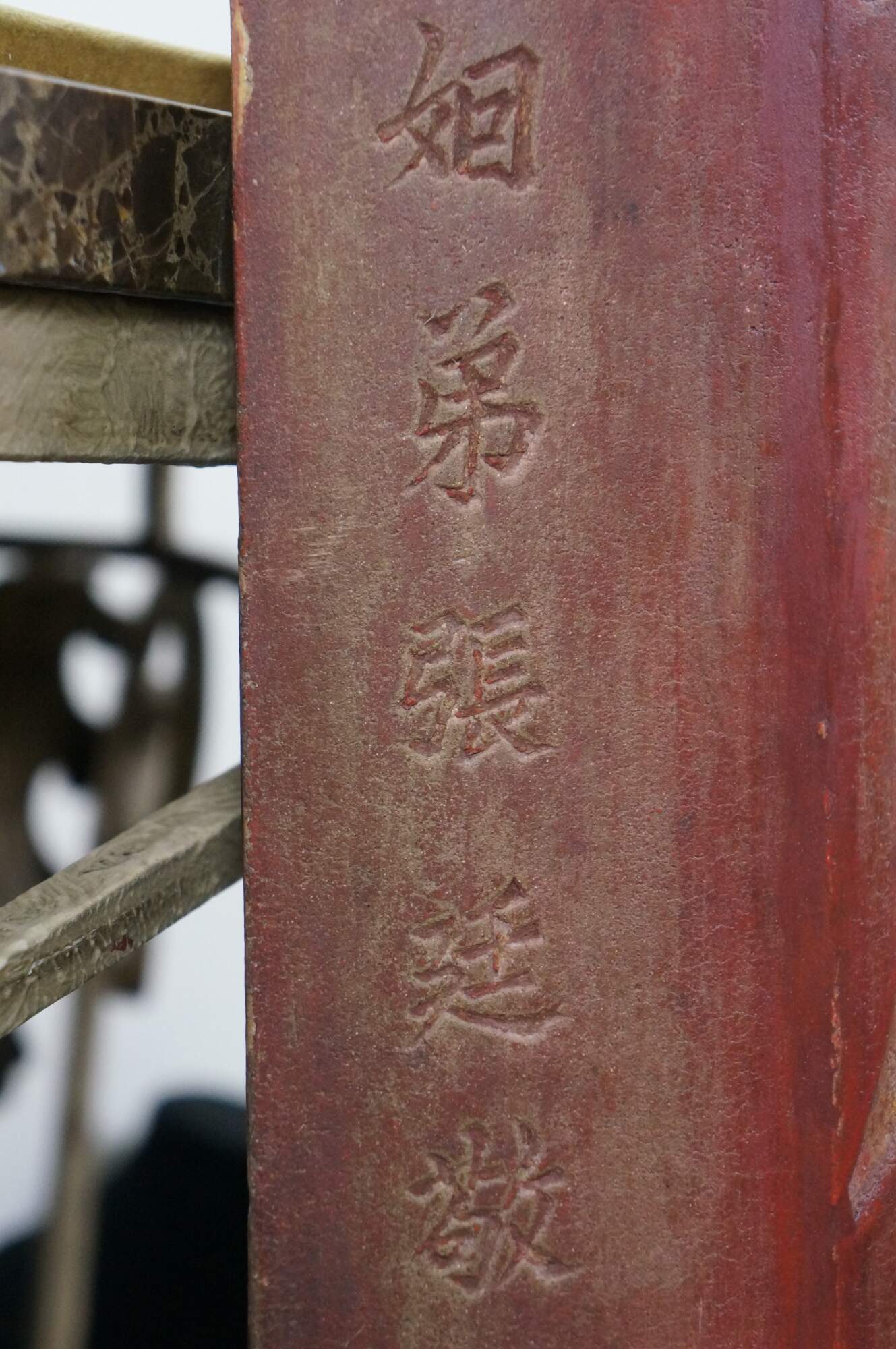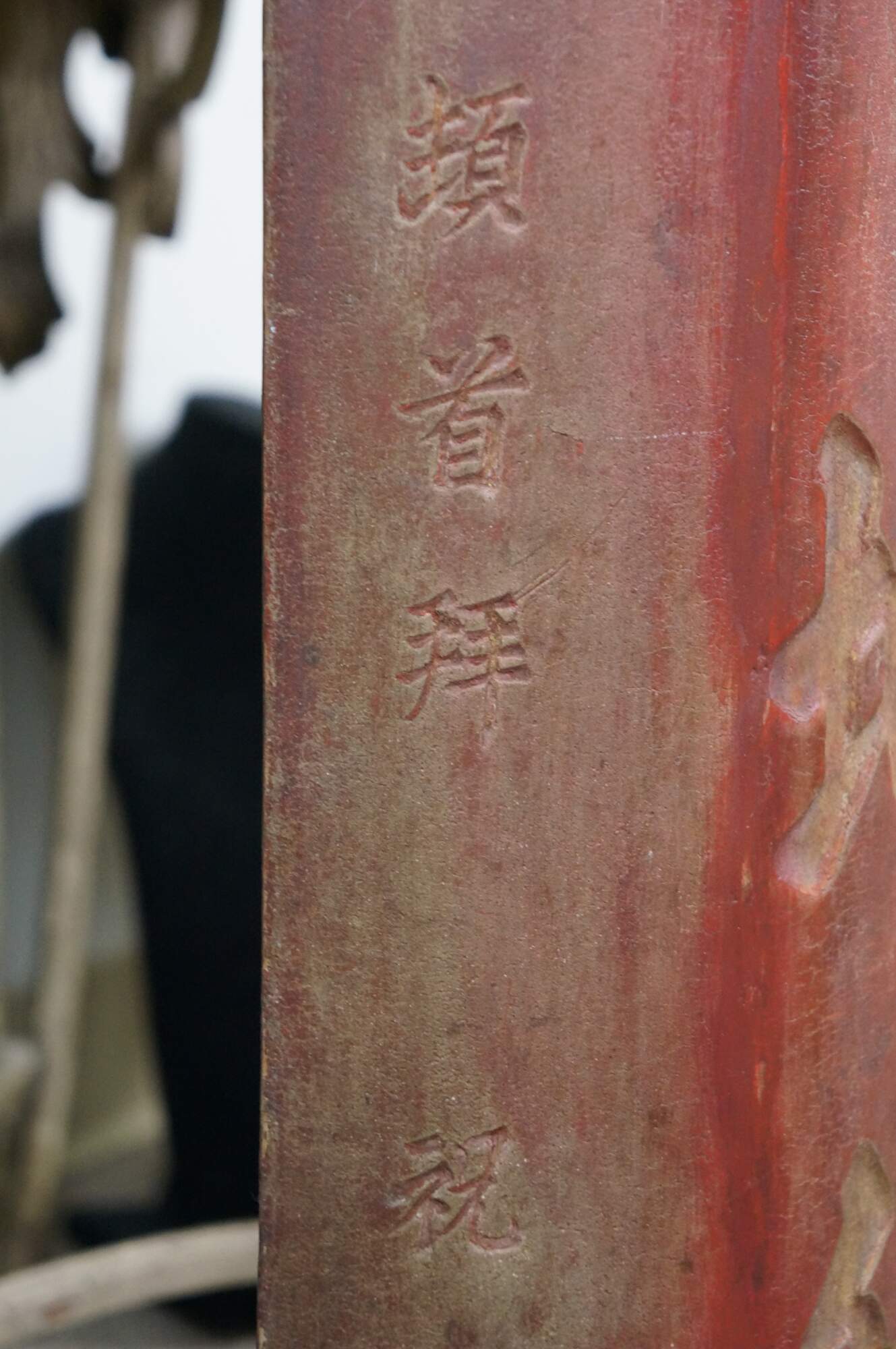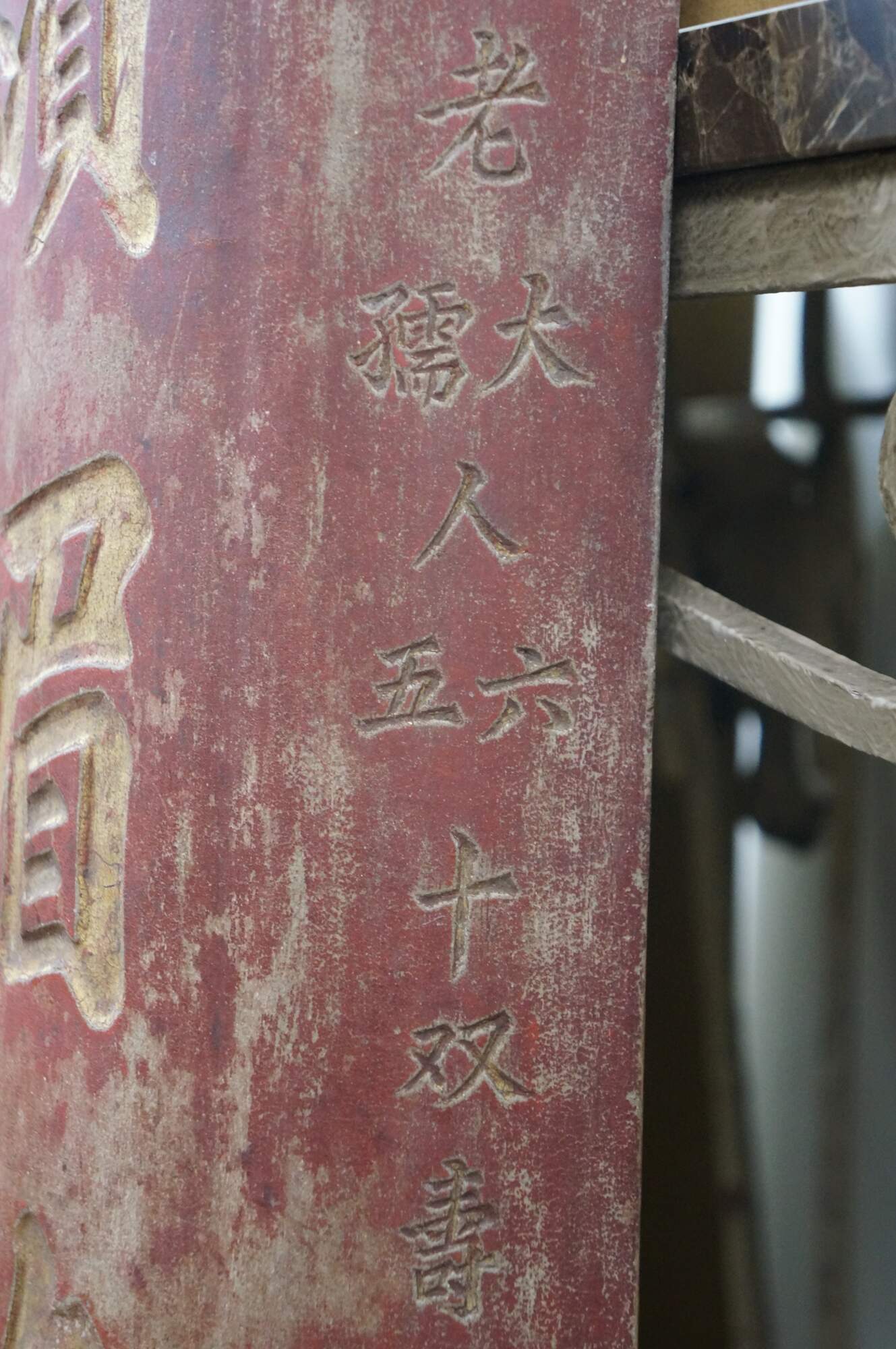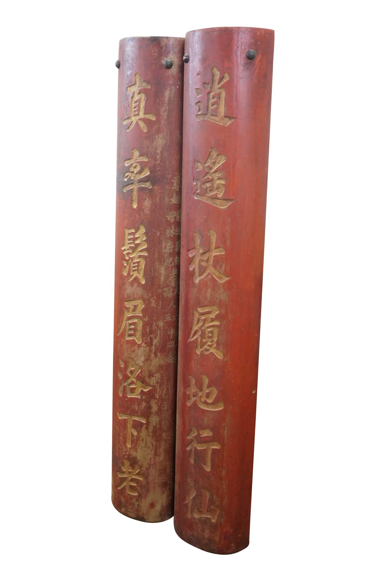 Beautiful pair of antique Chinese wooden couplet wall plaques dating to the late Qing Dynasty. Hand-carved with traditional Chinese gold calligraphy and red lacquer, these panels were a birthday gift given by a person named Tingjing Zhang 張廷