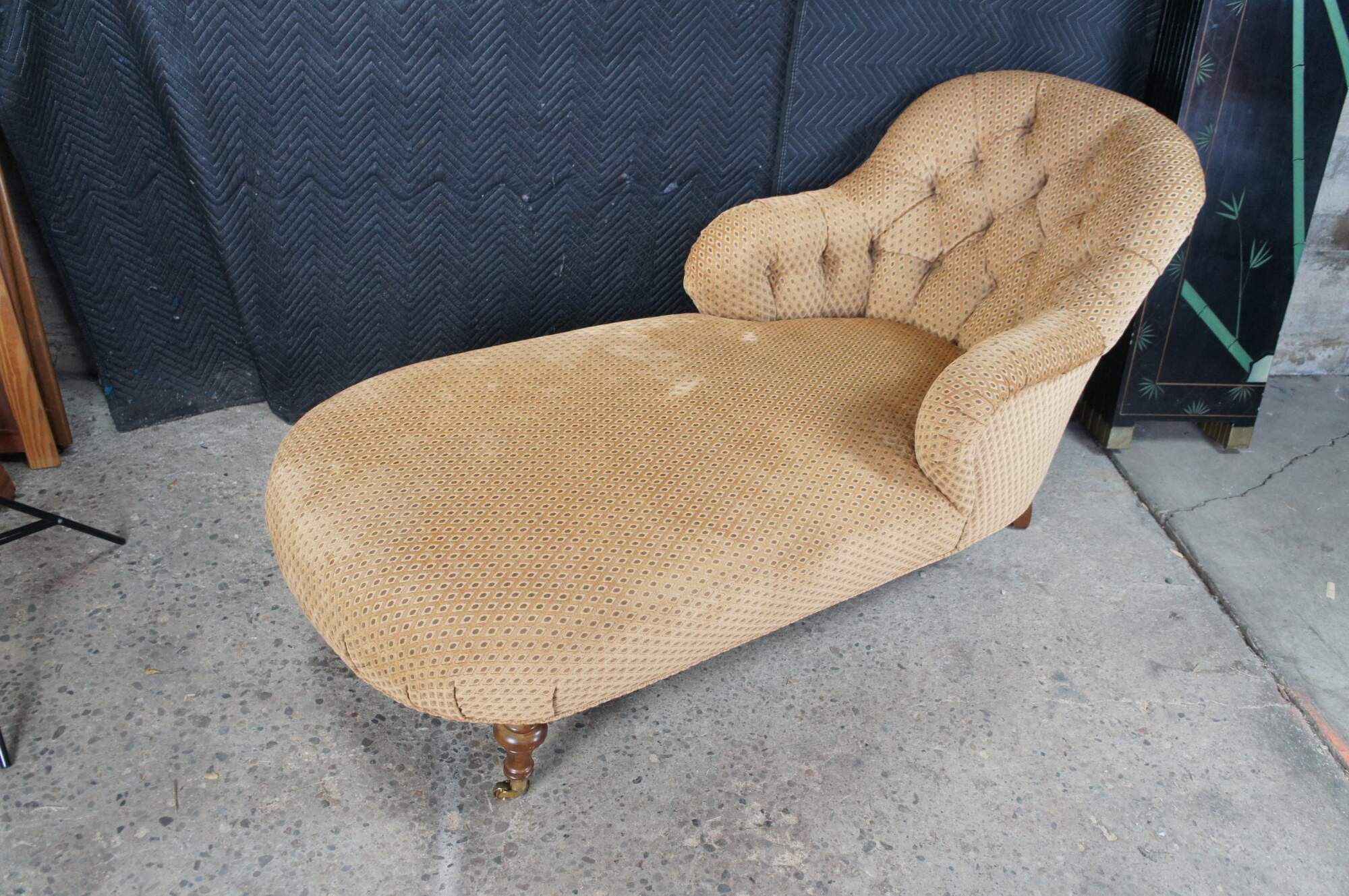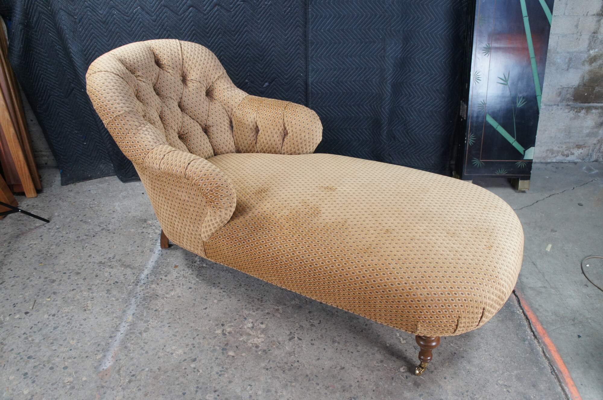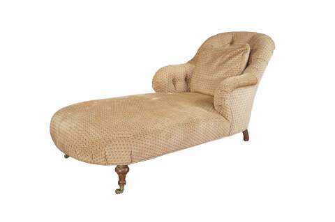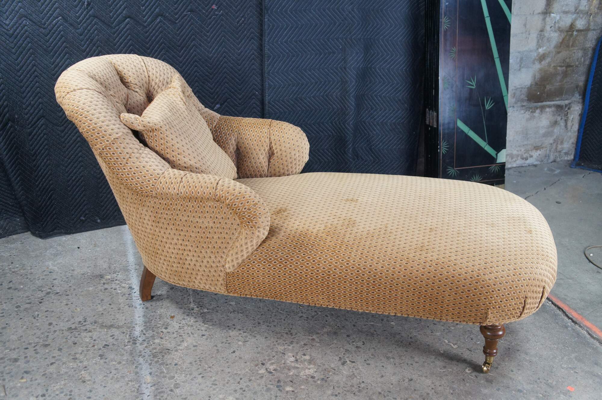Antique Victorian era chaise lounge / day bed / fainting couch / settee. It features a tufted diamond upholstery with rolled arms, supported by turned walnut legs with brass castors.