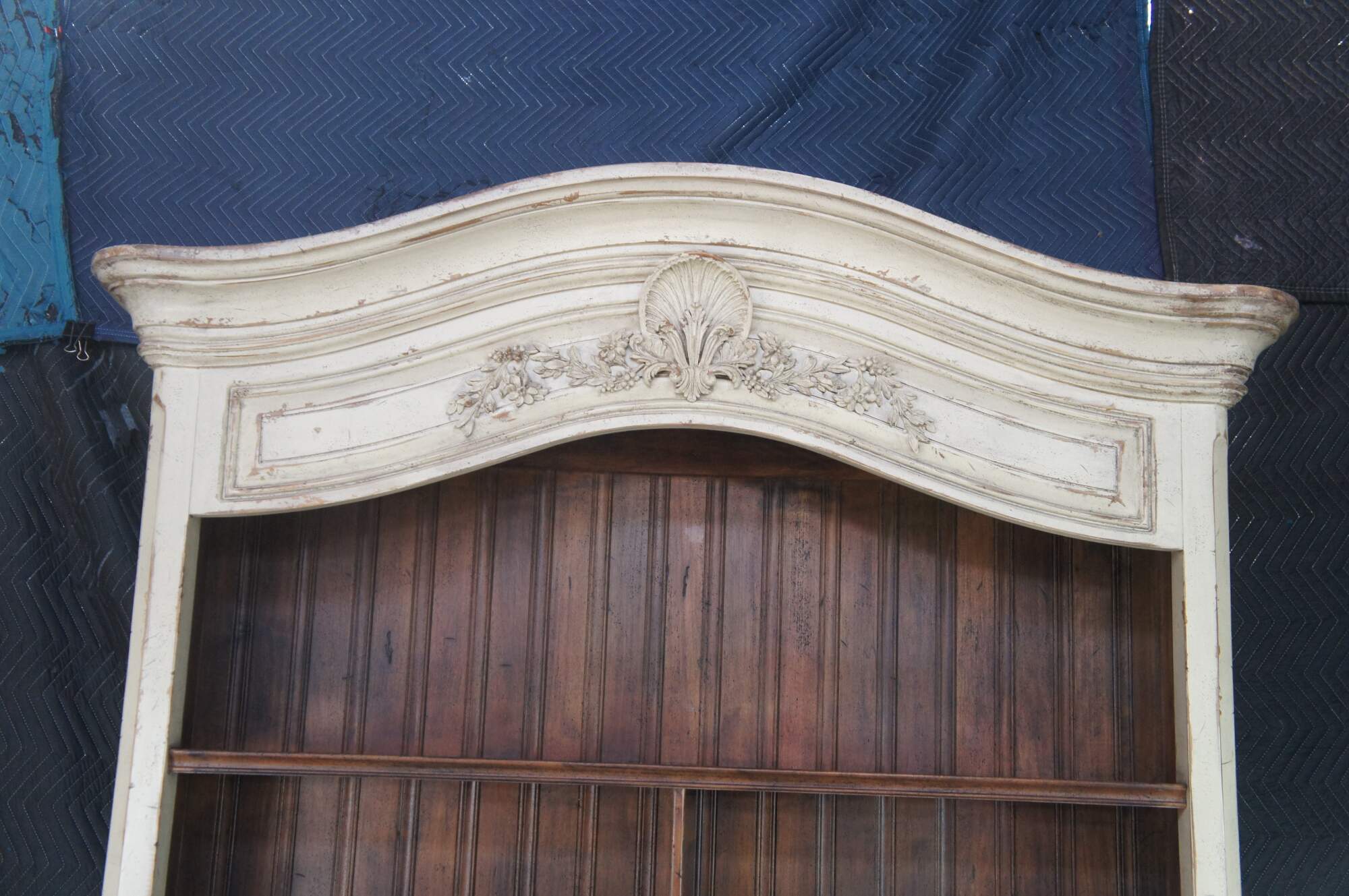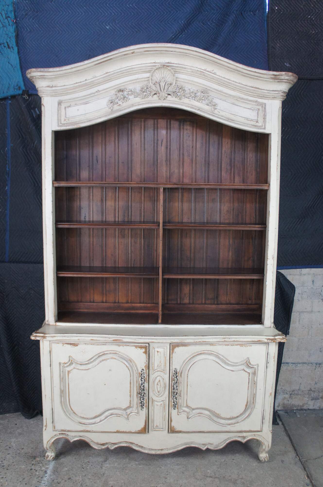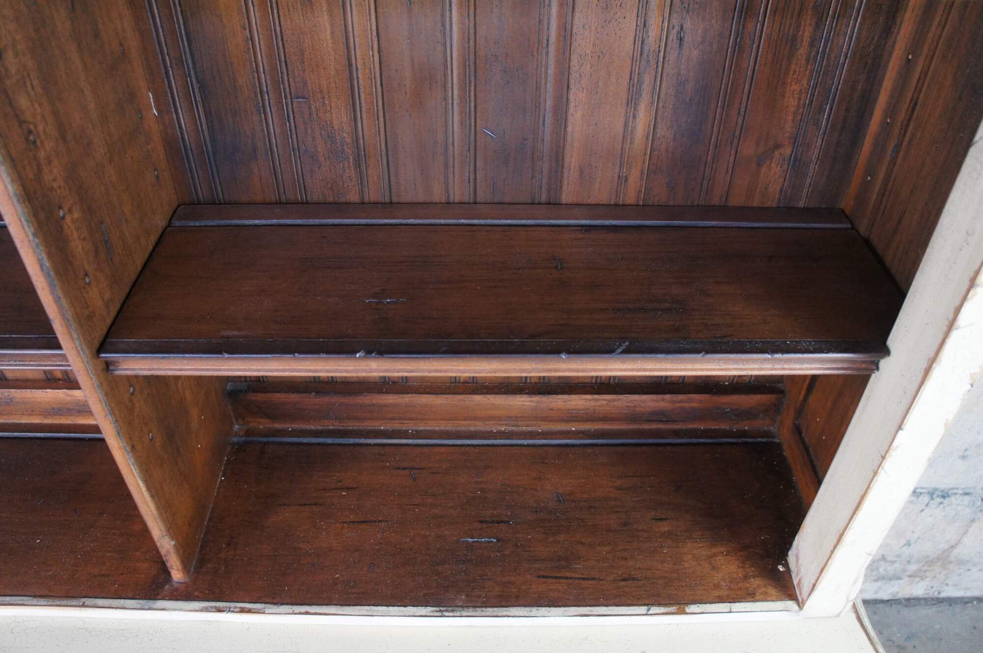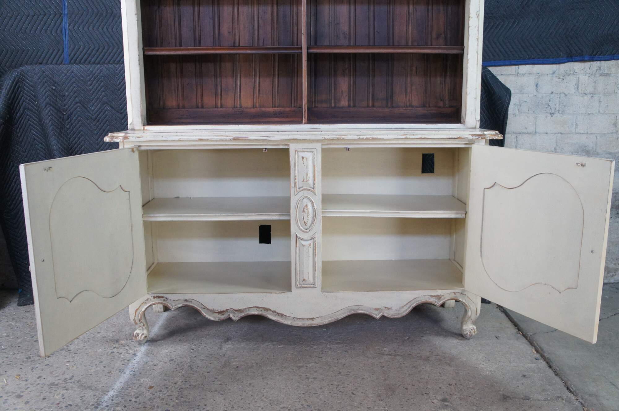 2 Available. A very large and impressive vintage Habersham Plantation Corporation Bourgogne hutch bookcase / curio cabinet. Made from mahogany featuring French Provincial / Louis XV styling a stepback design with upper bookcase and lower cabinet.