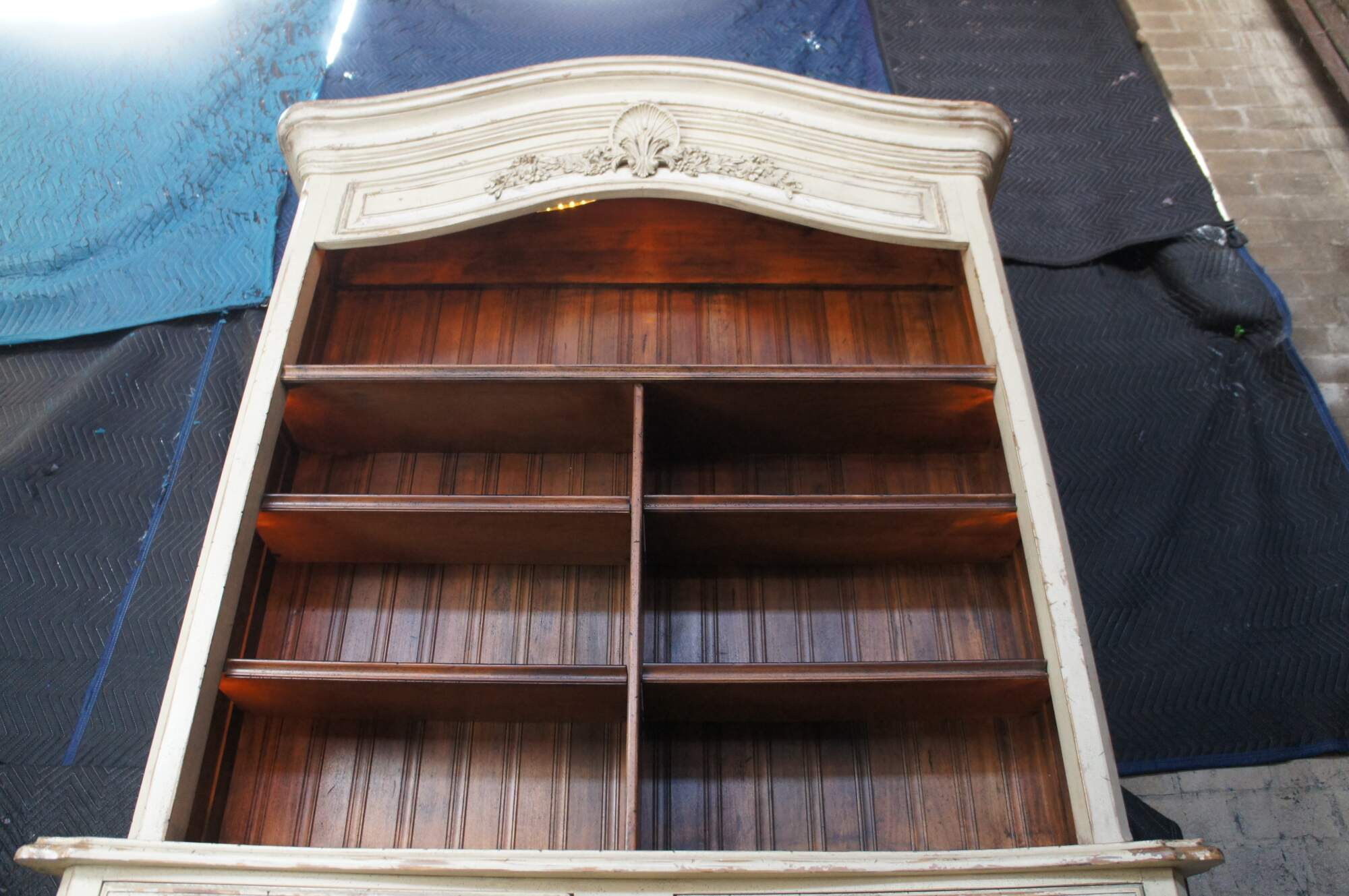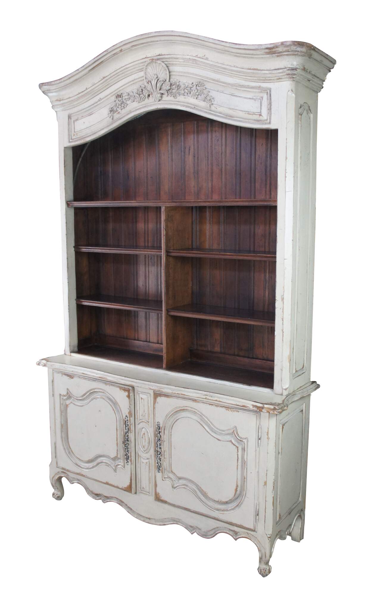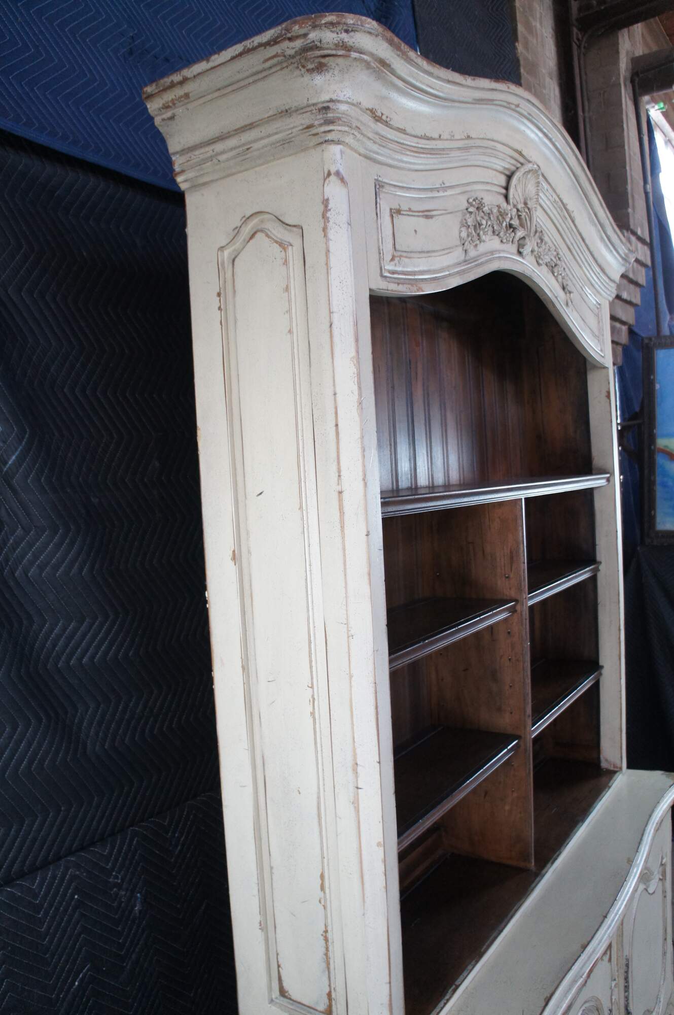 2 Available. A very large and impressive vintage Habersham Plantation Corporation Bourgogne hutch bookcase / curio cabinet. Made from mahogany featuring French Provincial / Louis XV styling a stepback design with upper bookcase and lower cabinet.