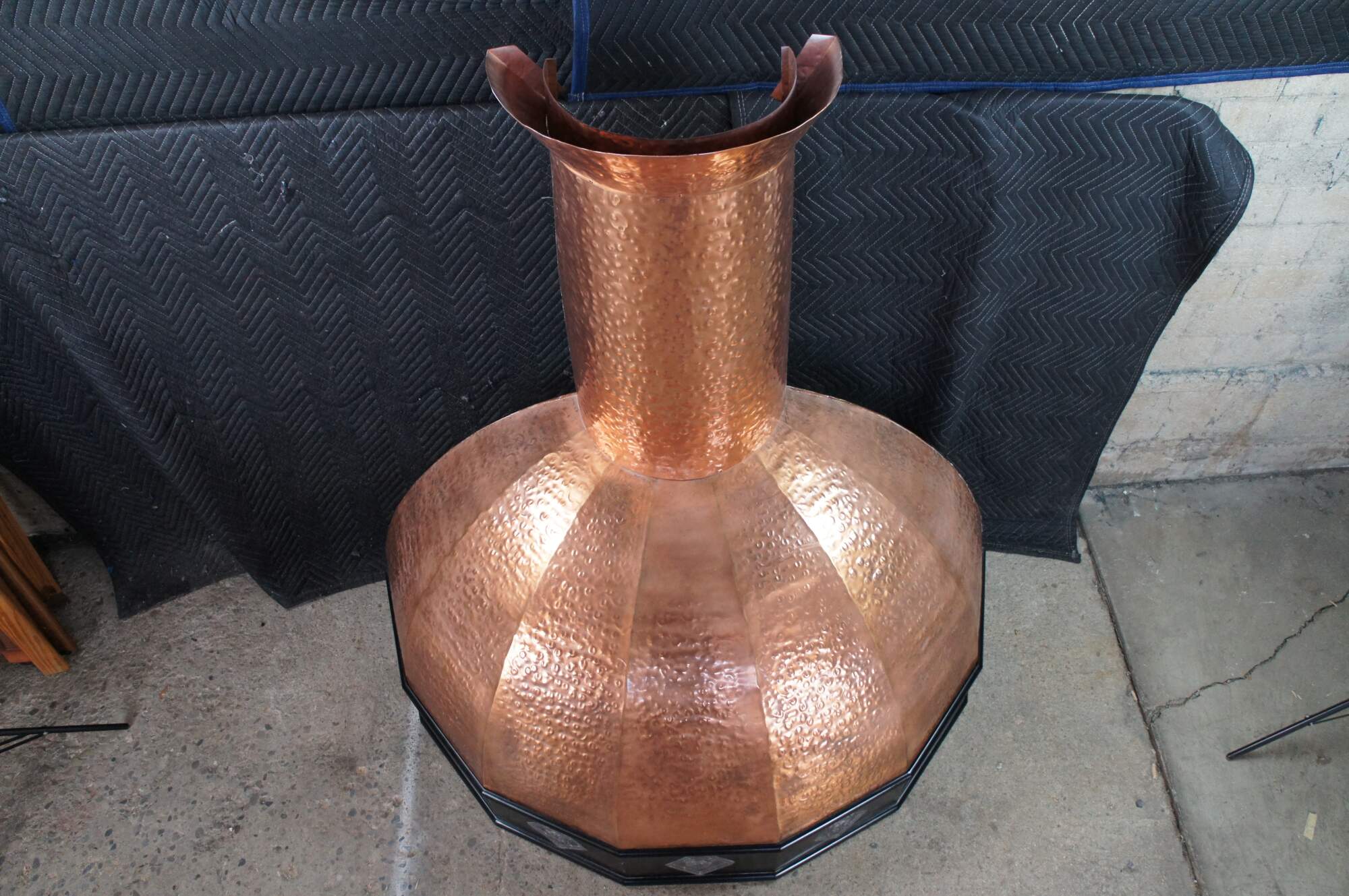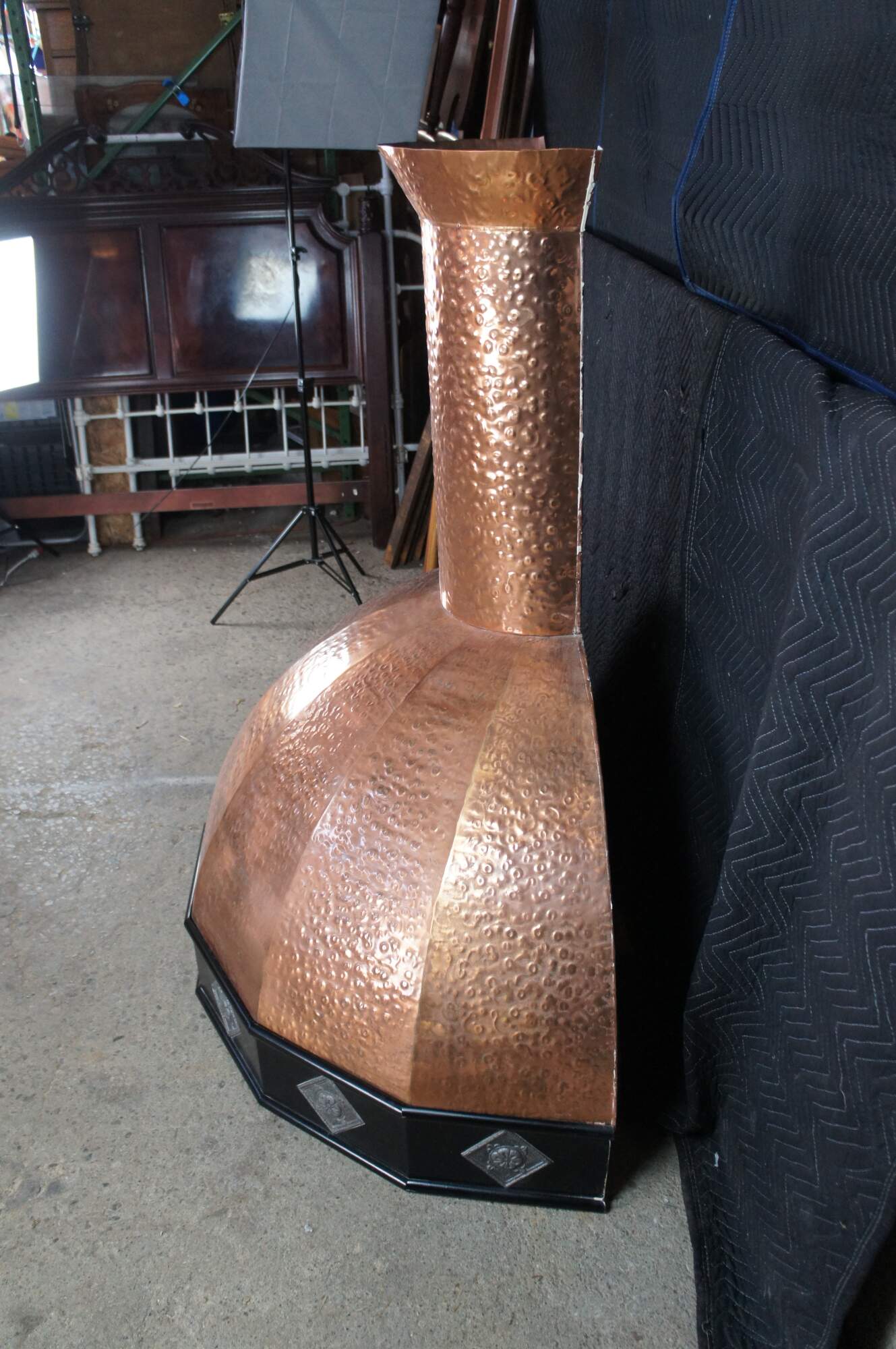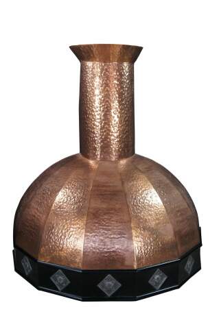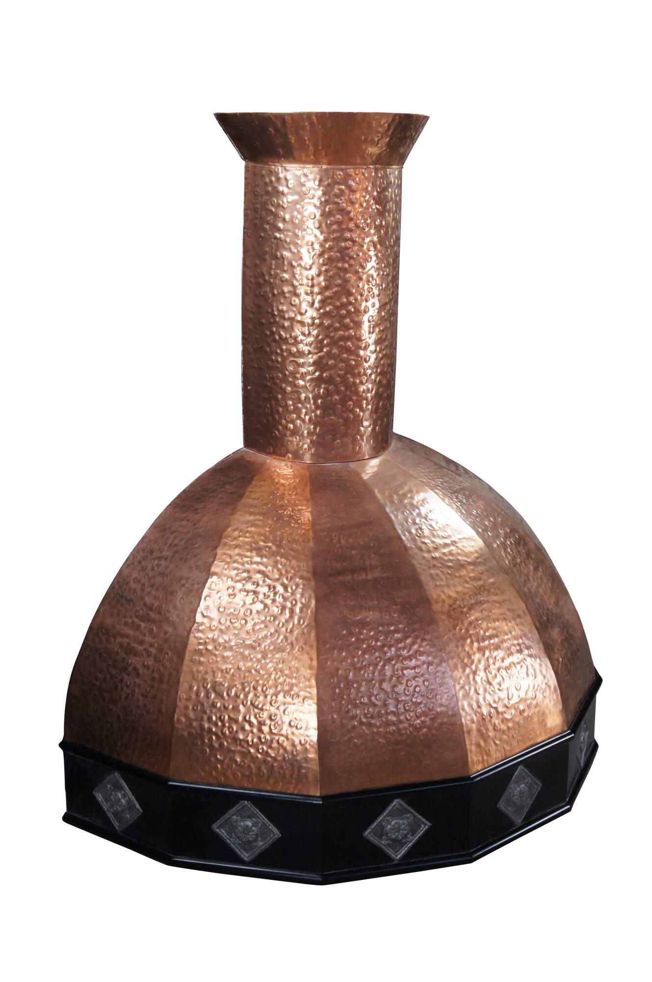 Vintage hammered copper range hood featuring a wide rounded dome base with geometric accents. and tall cylindrical chimney.