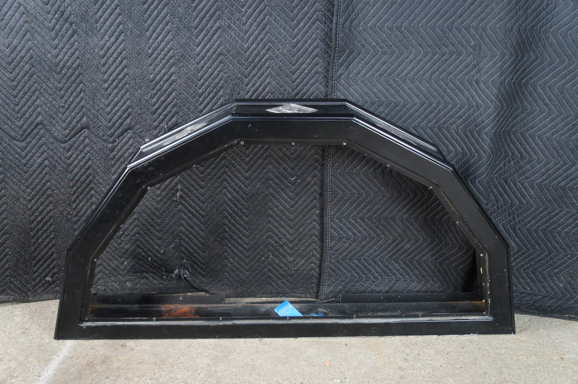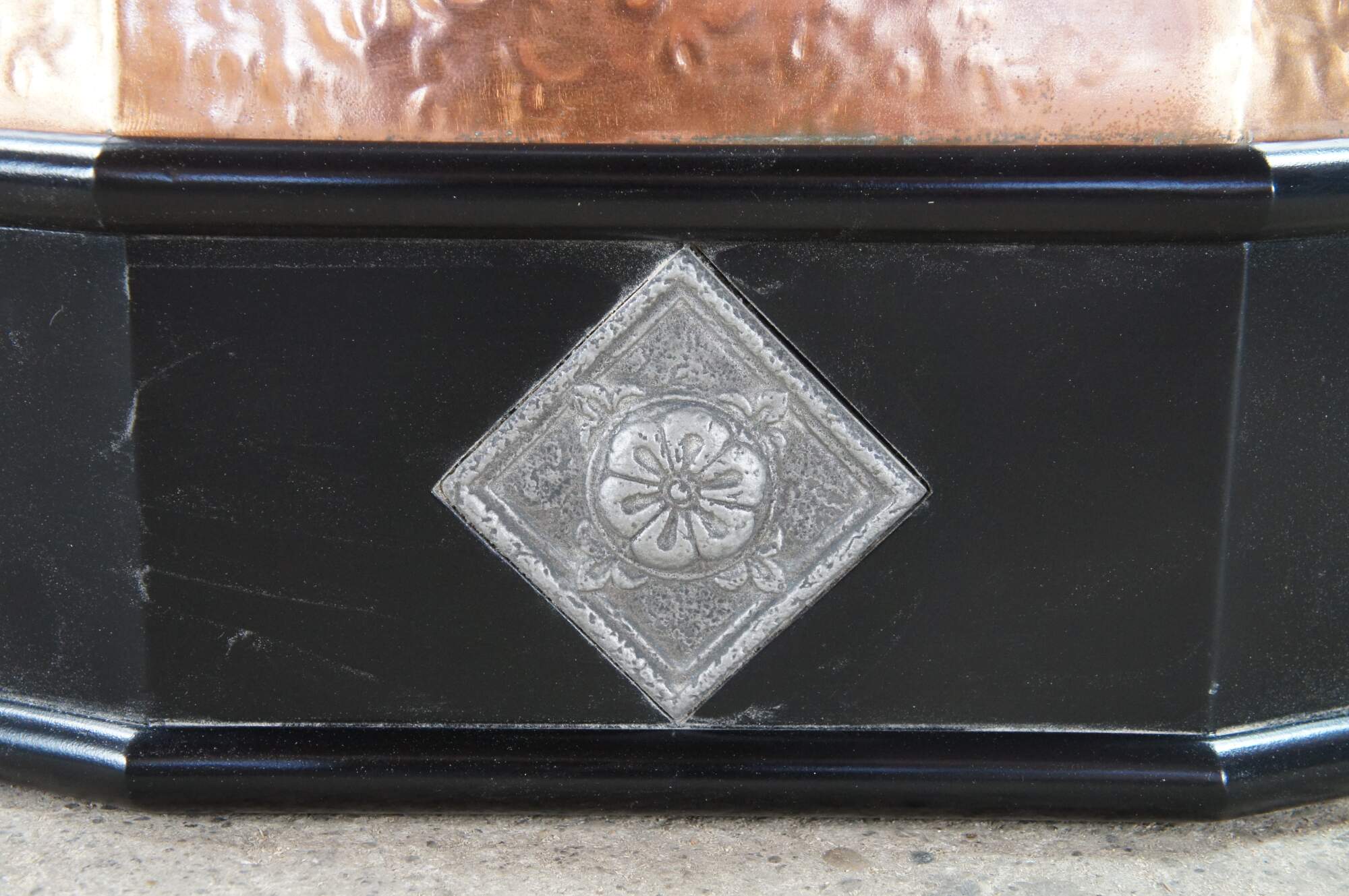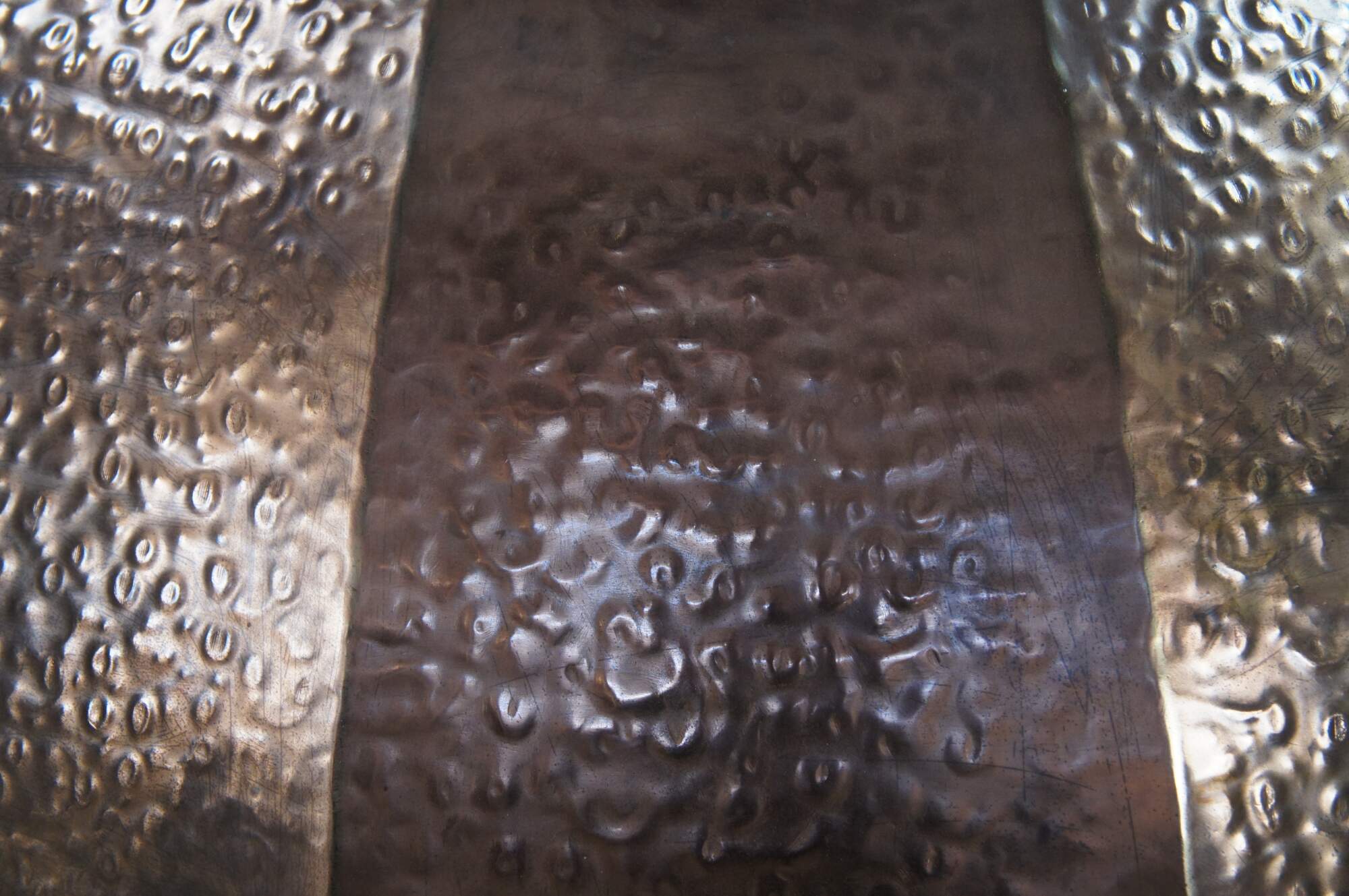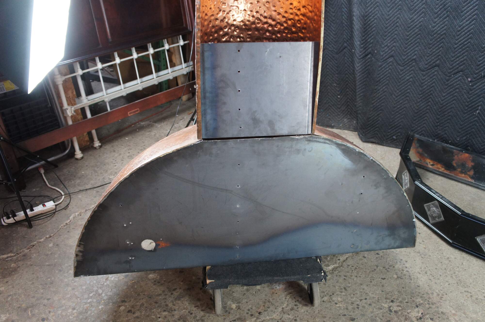 Vintage hammered copper range hood featuring a wide rounded dome base with geometric accents. and tall cylindrical chimney.