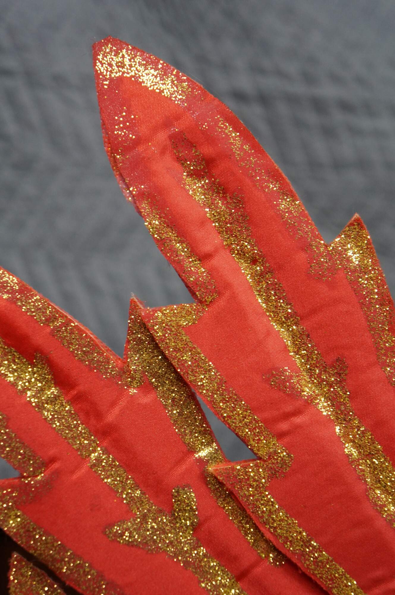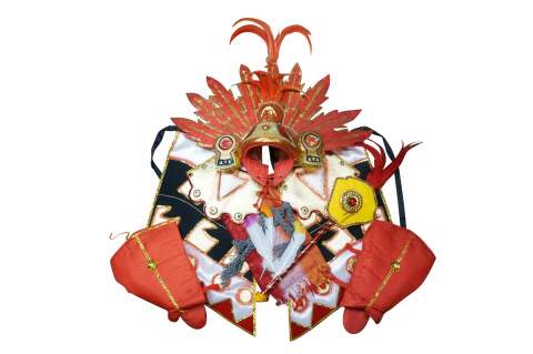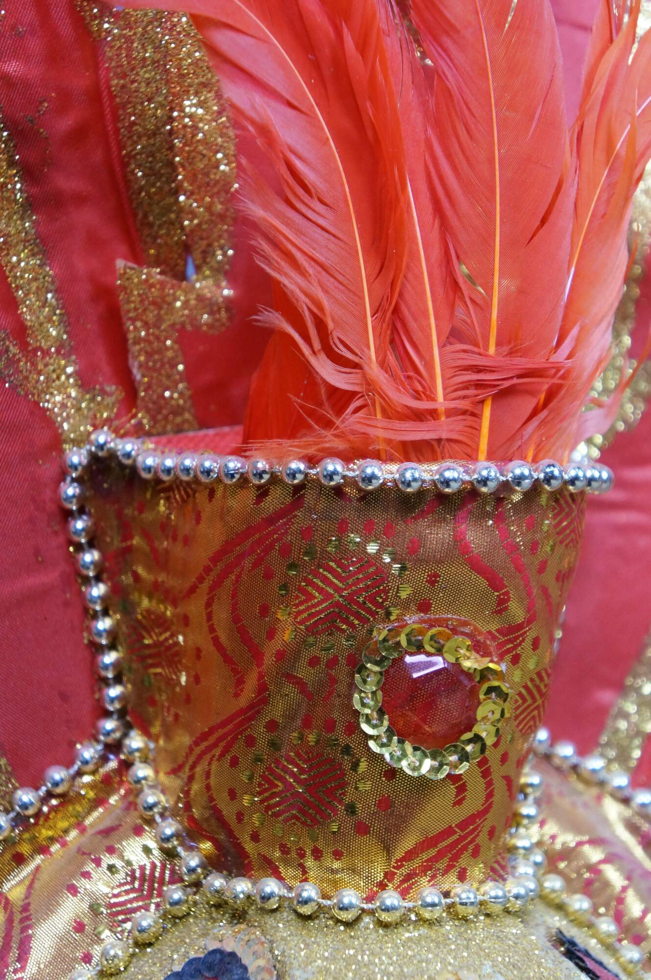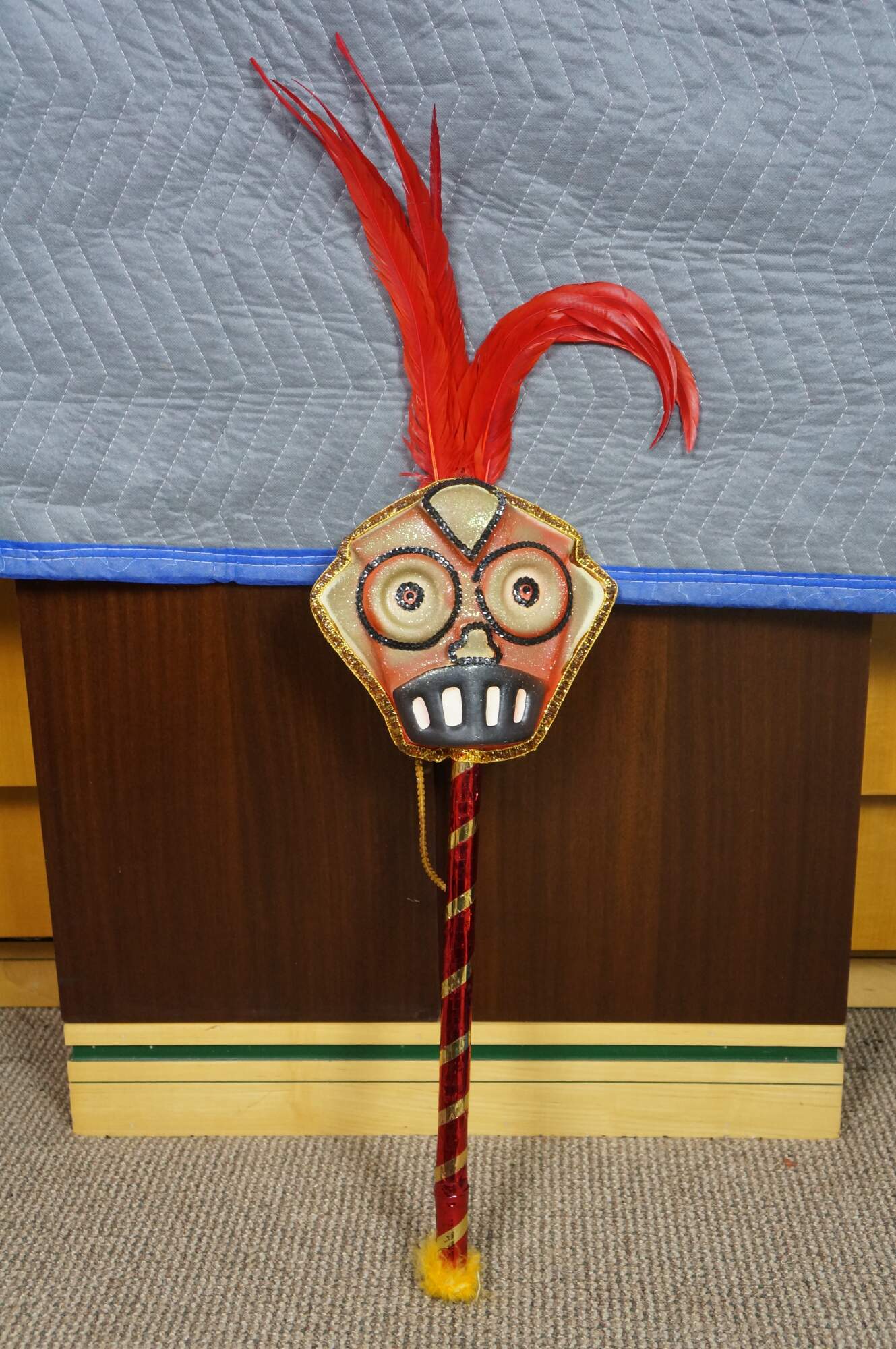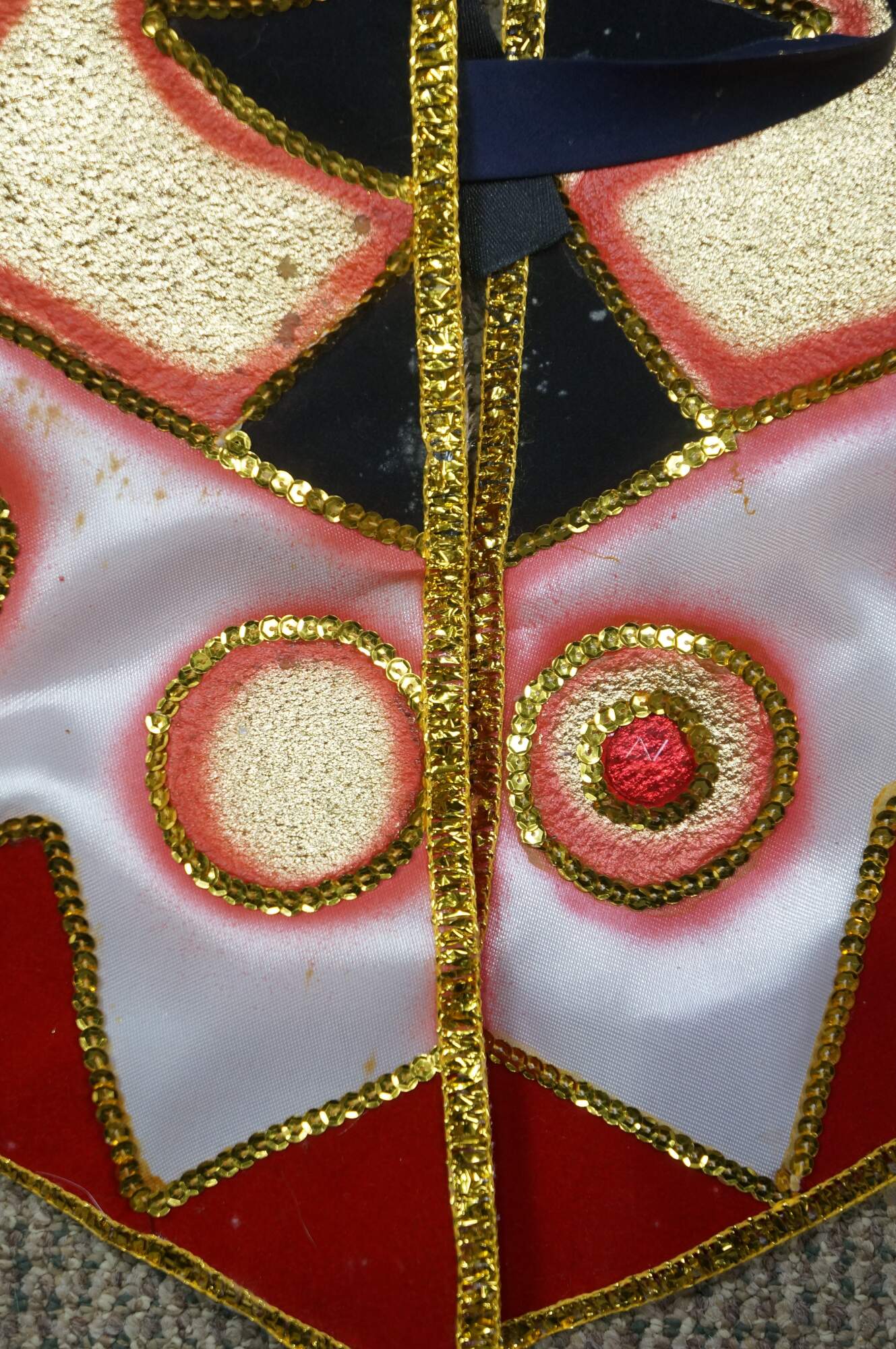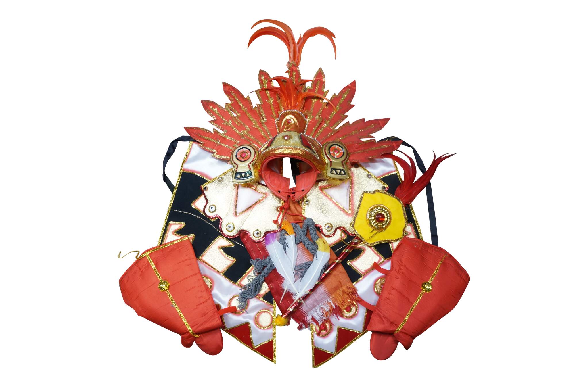 Rare vintage Bohemian Junkanoo festival / parade outfit. It features an elaborate headdress with red feathers and gold goddess flames, and includes full body 'shoulder to boots' costume with two hand held staff masks.