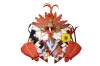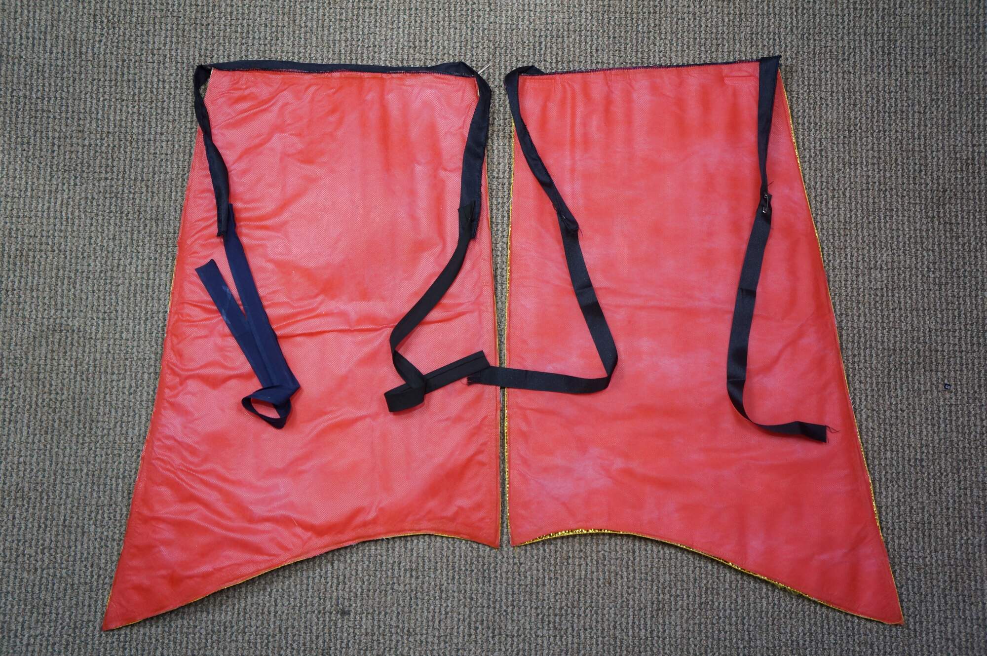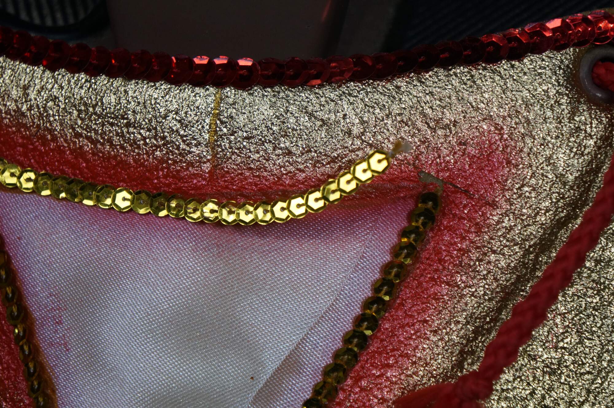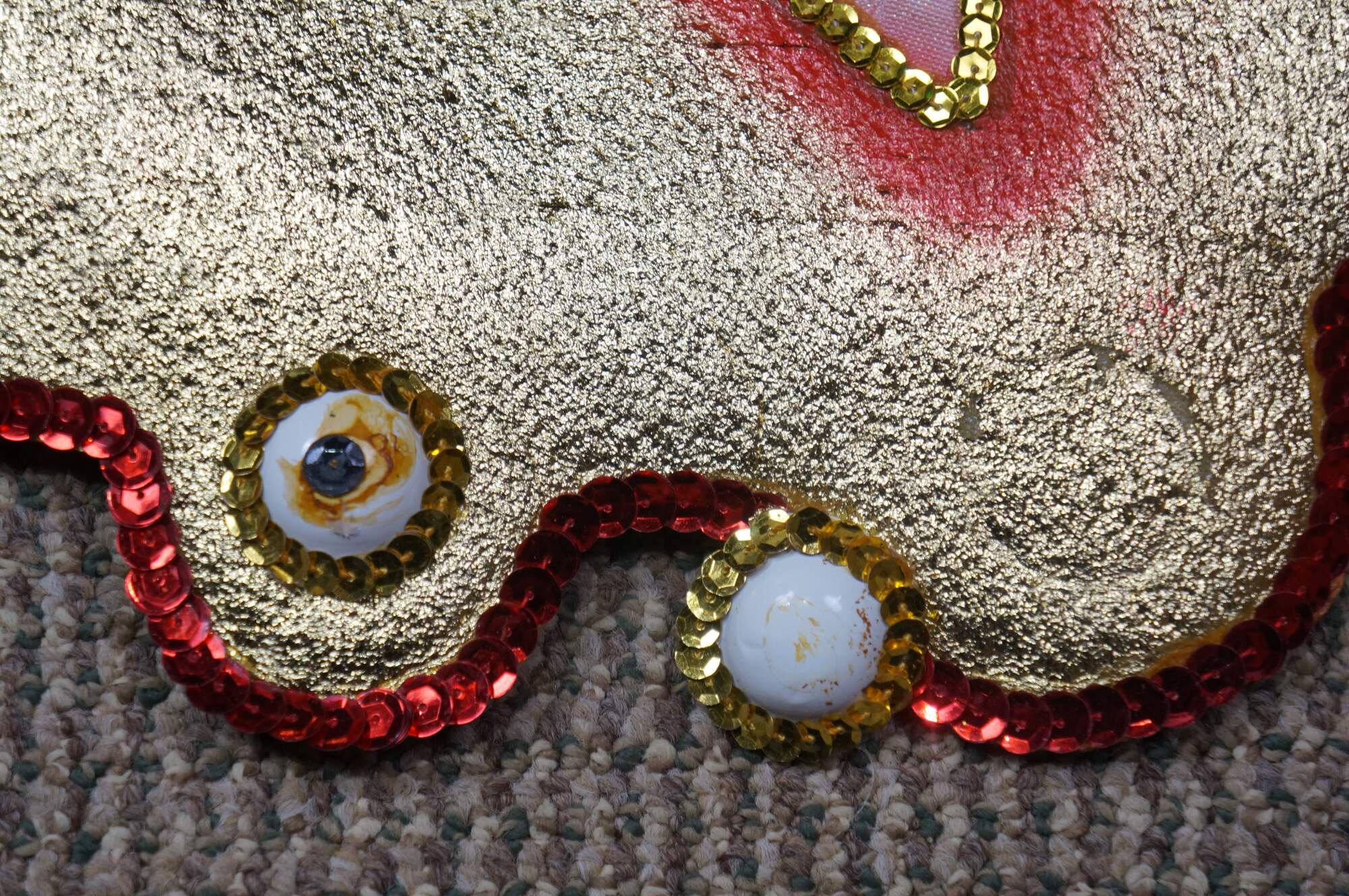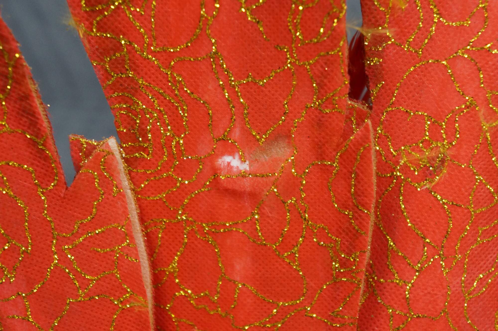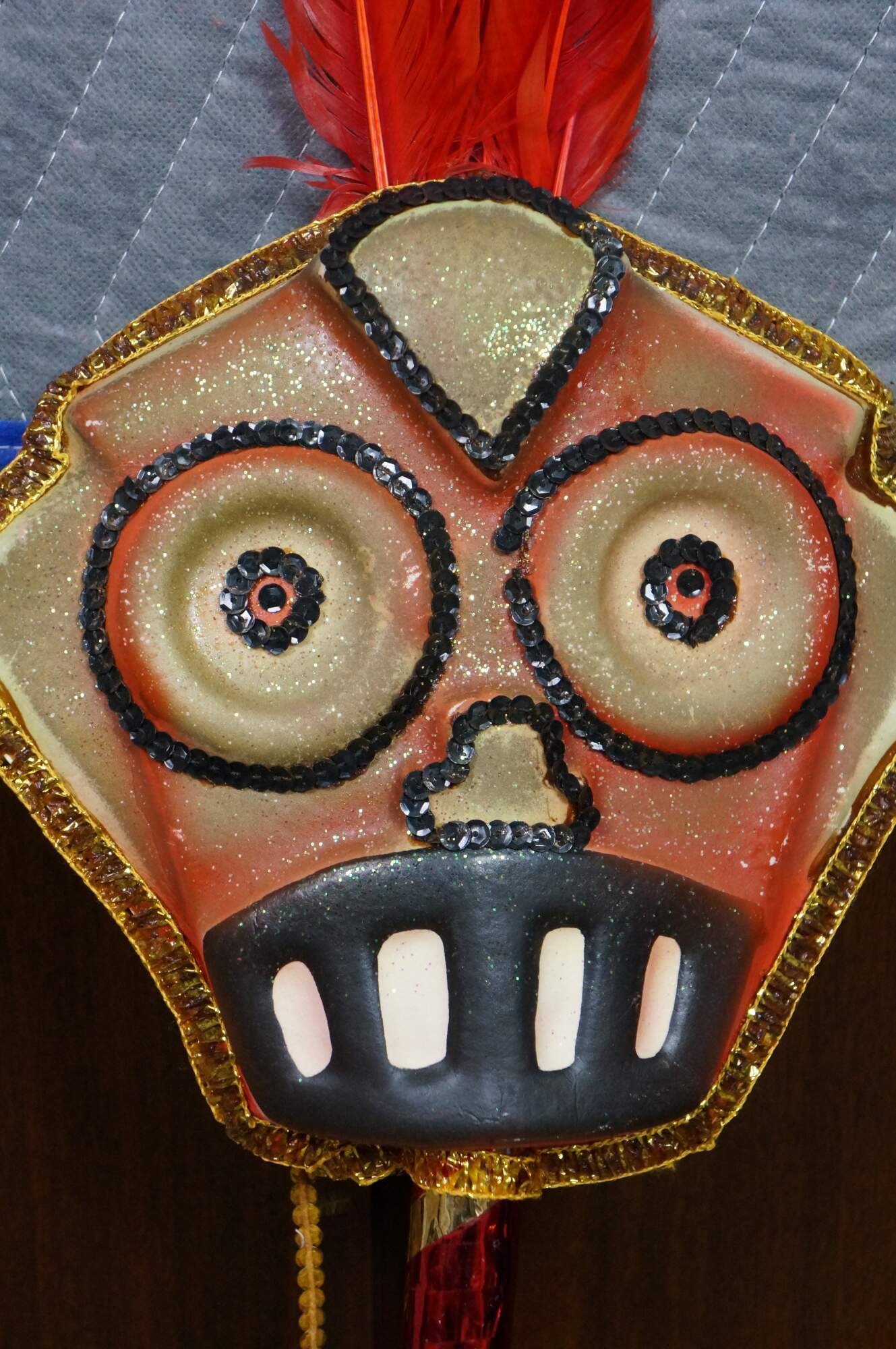 Rare vintage Bohemian Junkanoo festival / parade outfit. It features an elaborate headdress with red feathers and gold goddess flames, and includes full body 'shoulder to boots' costume with two hand held staff masks.