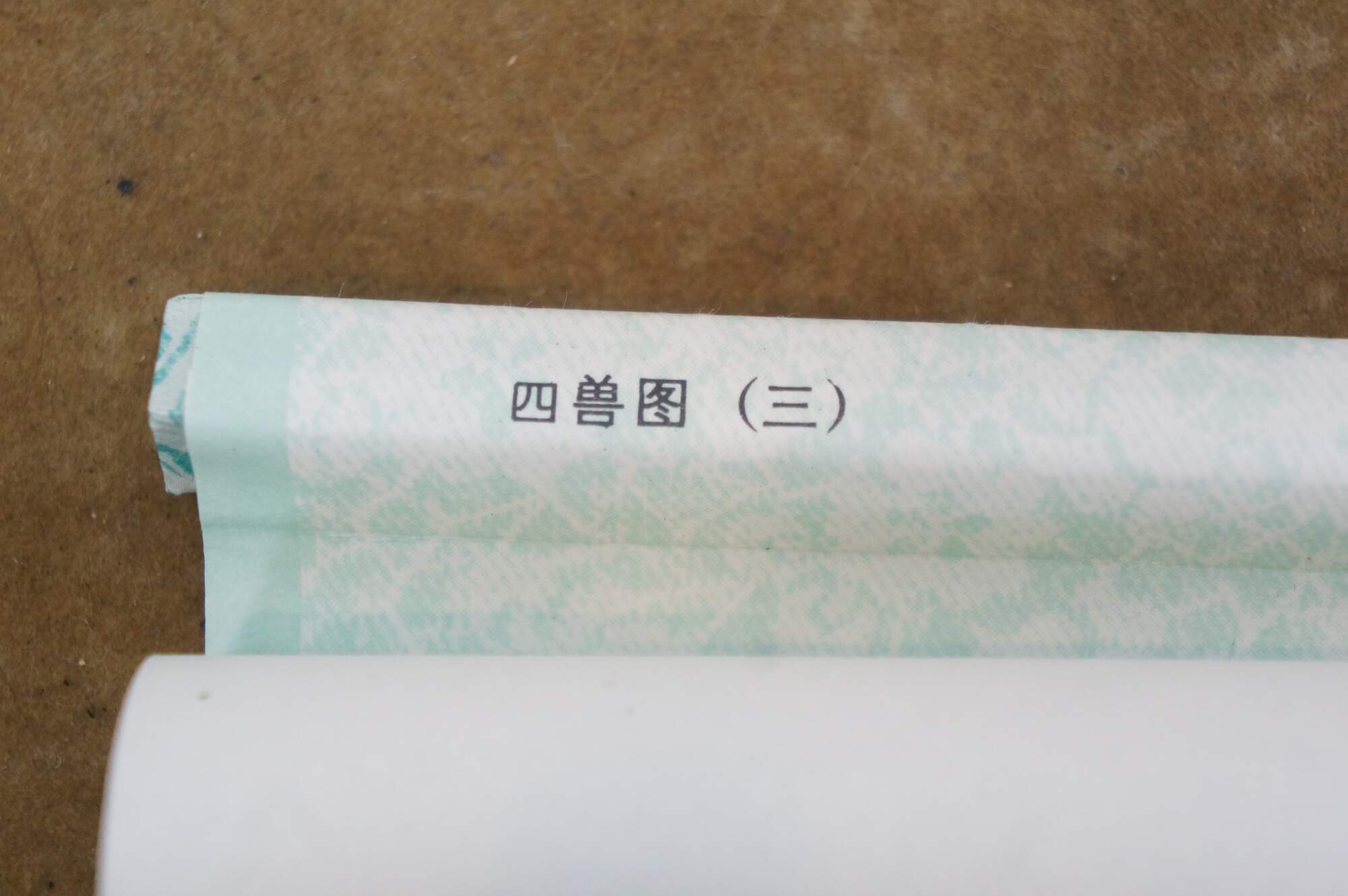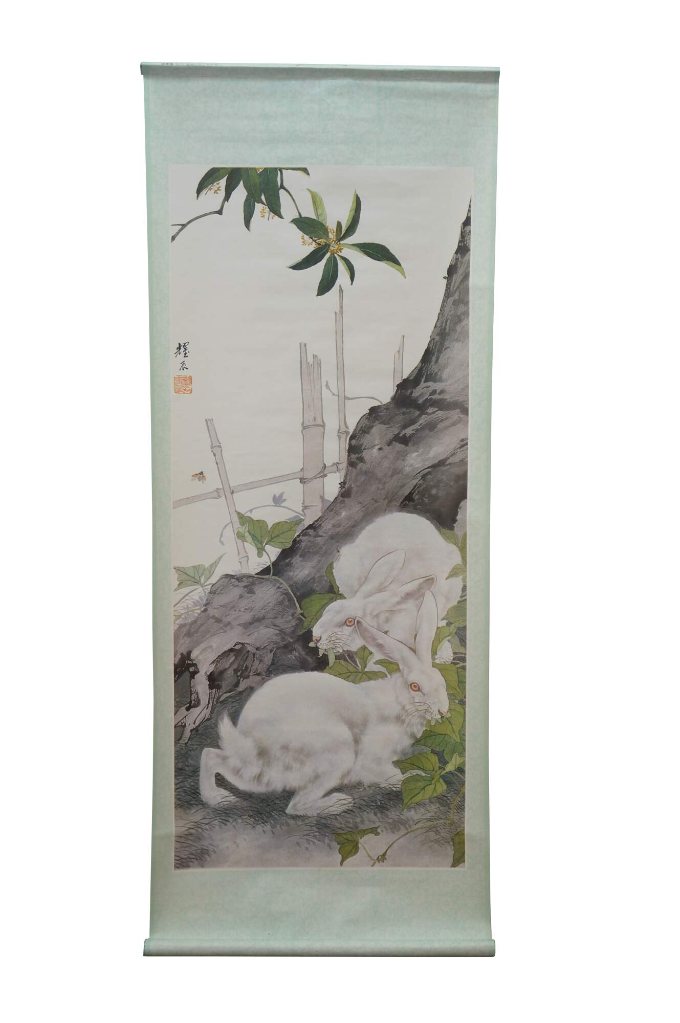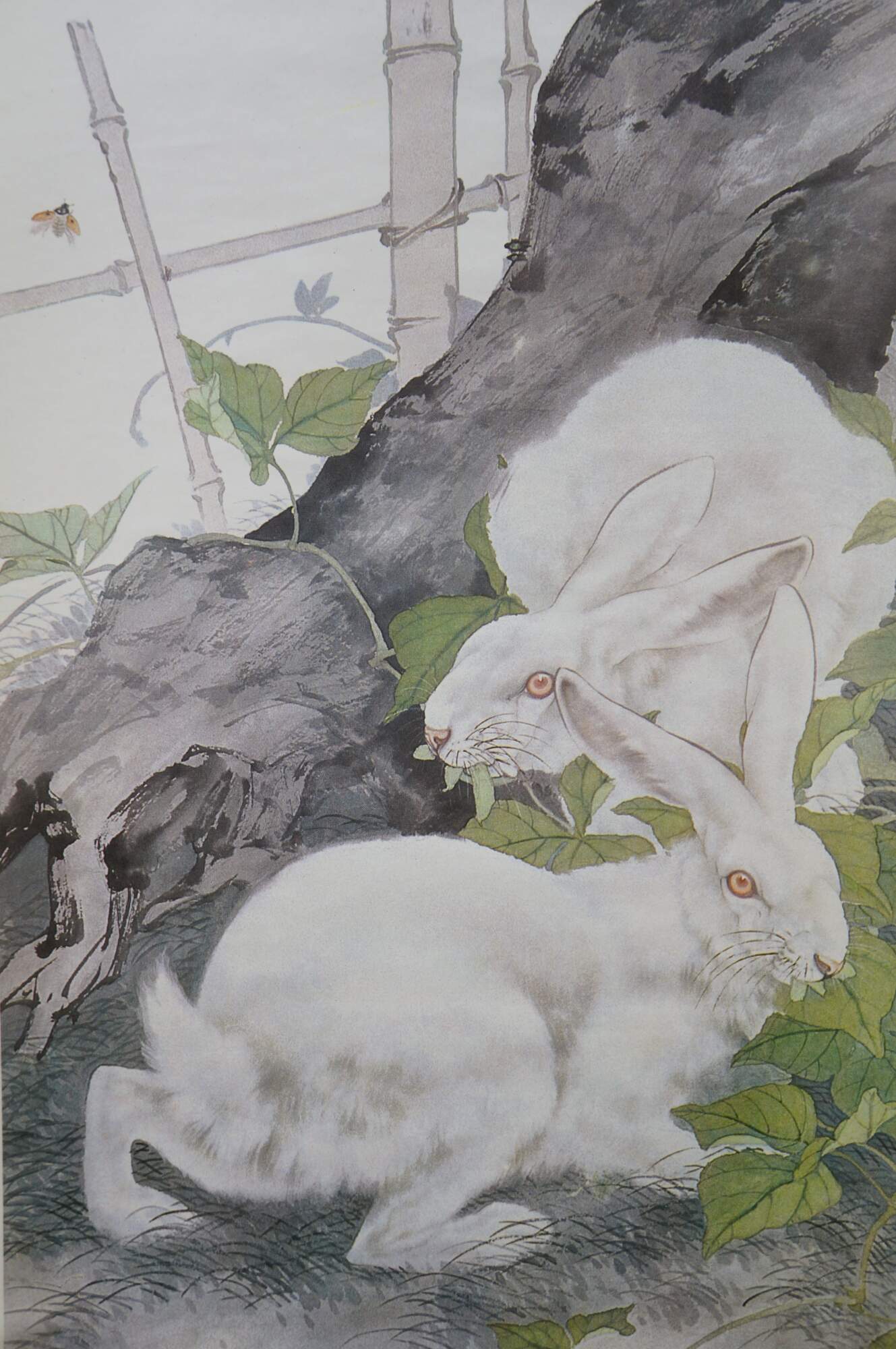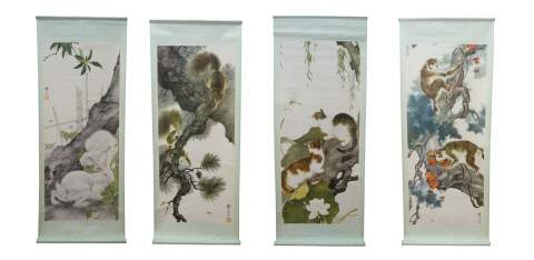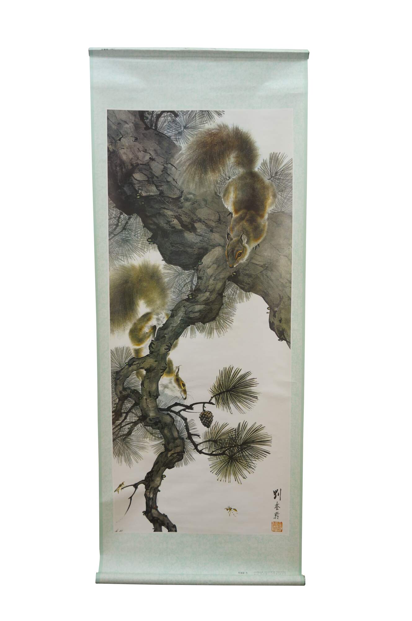 Four vintage Chinese hanging scroll prints after Liu Kuiling, circa 1979. Titled the Four Beasts paintings collection and includes: Rabbits in a Bamboo garden; Squirrels in a gnarled pine; Cats indulged with a Dragonfly; and Monkeys in an oak tree.
