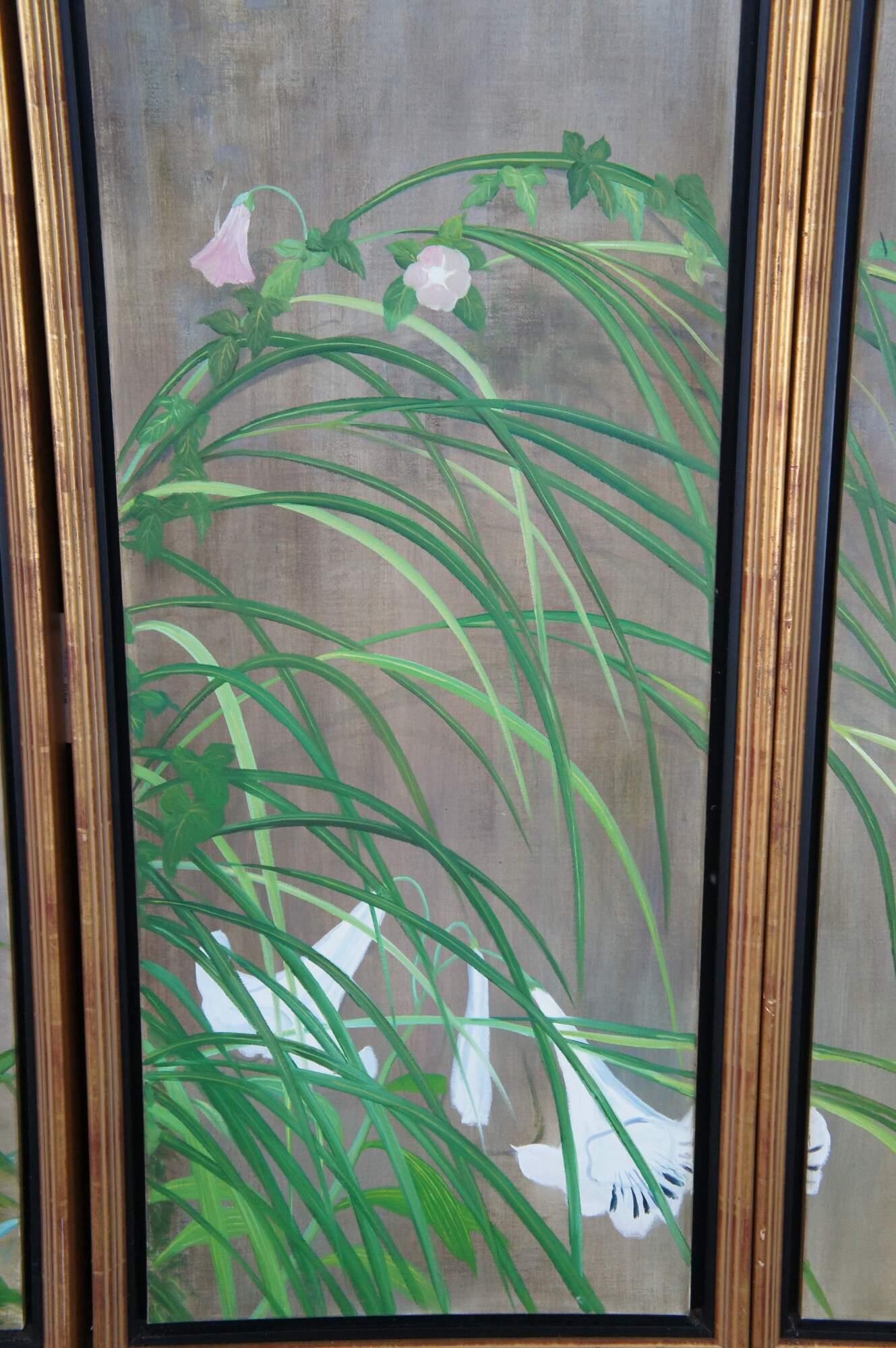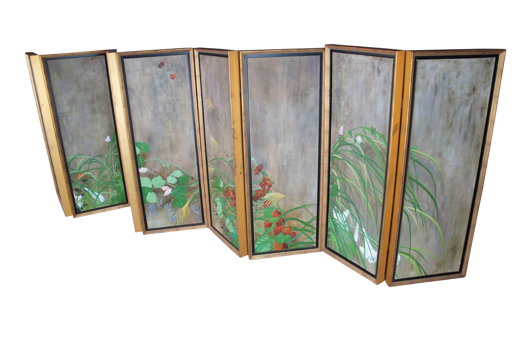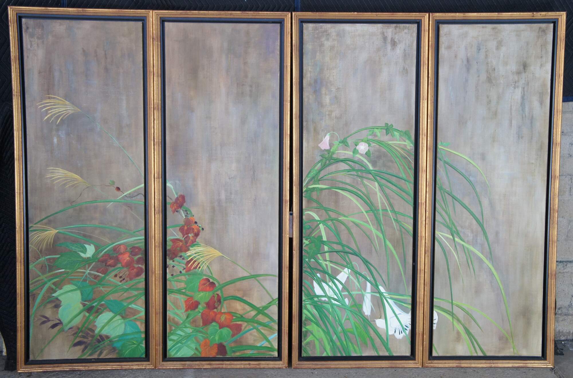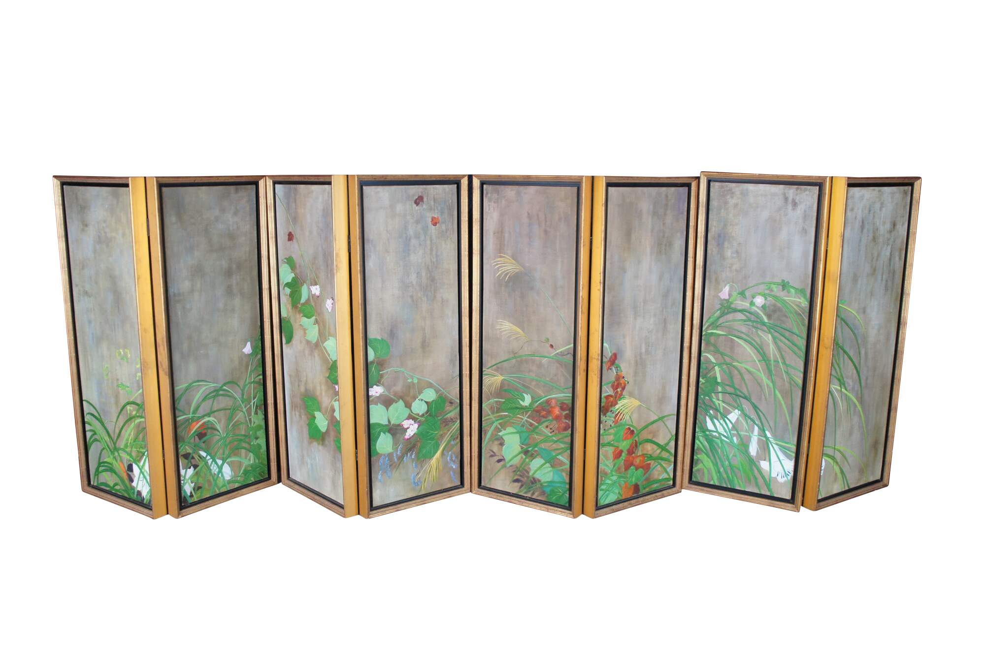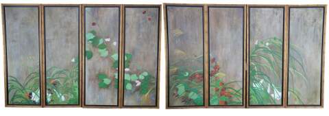 Summer Rain is a masterpiece that was painted by Sakai Hoisu during the Edo-period (1603-1868). This contemporary example after the artist separates the work into eight canvas connected through four separate folding screens or room dividers. Each canvas is a masterfully hand painted oil painting framed in wood with gold trim. Summer Rain showcases a refreshing atmosphere of a thunderstorm in Japan. Also known as Summer and Autumn Flower Plants. Each of the four screens can stand alone. Mounting hardware could be added to hang along a wall. Backing is fabric covered.