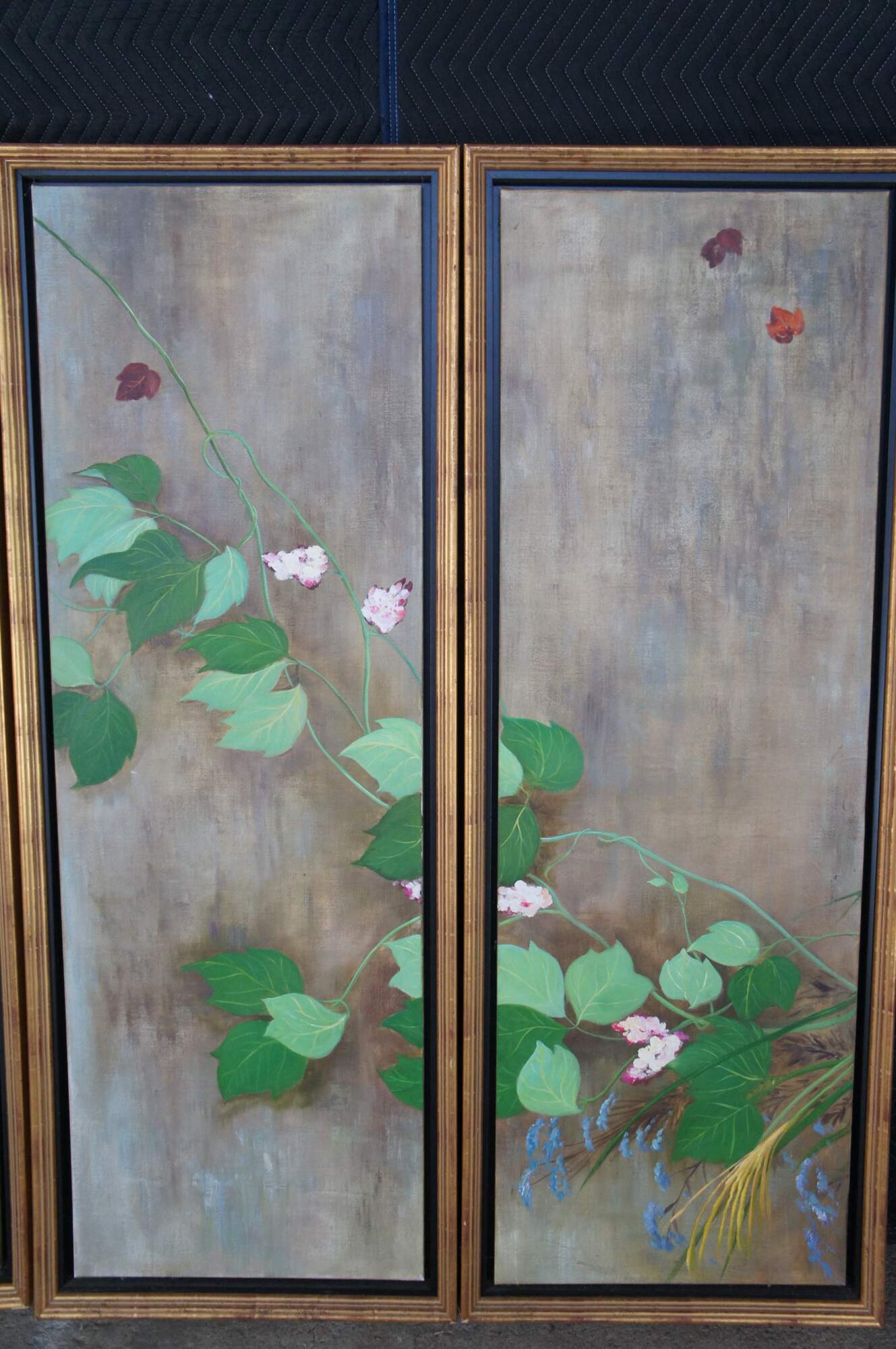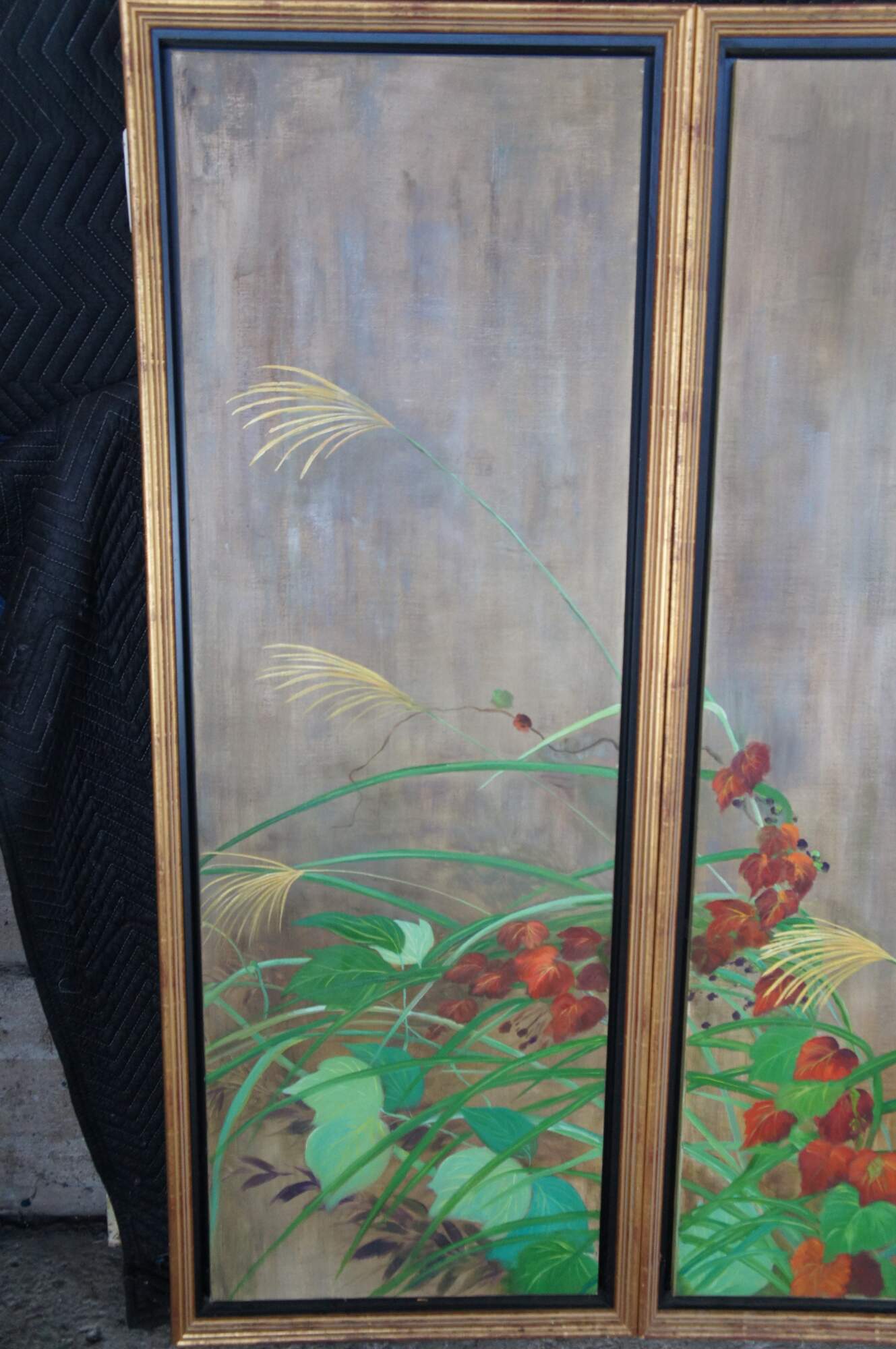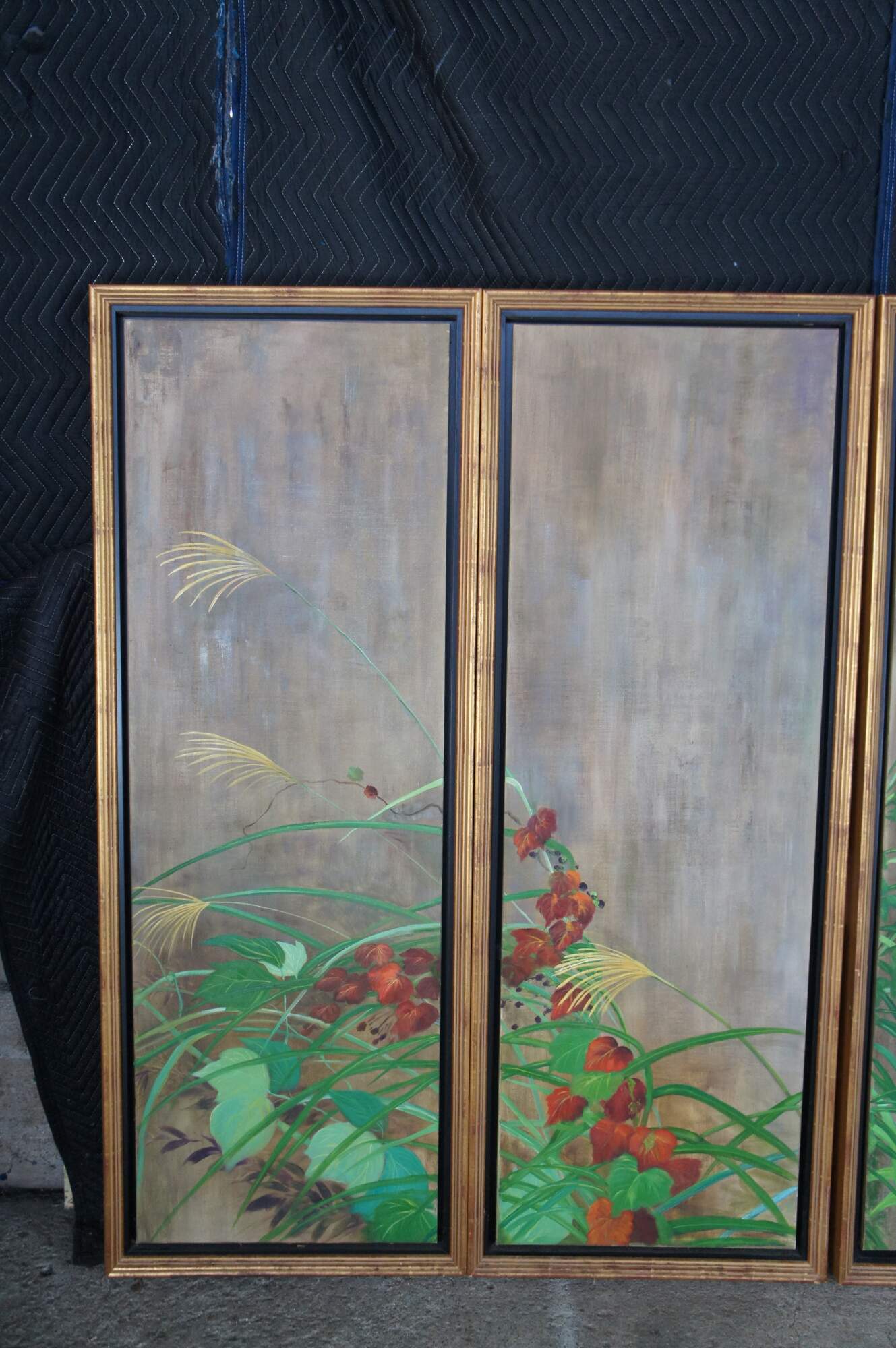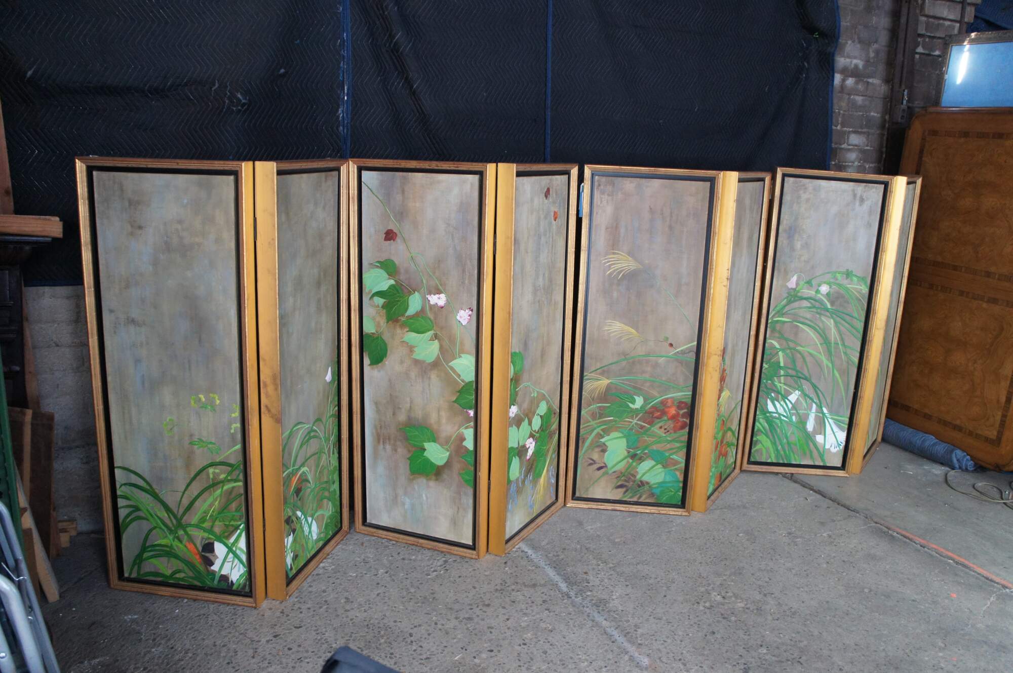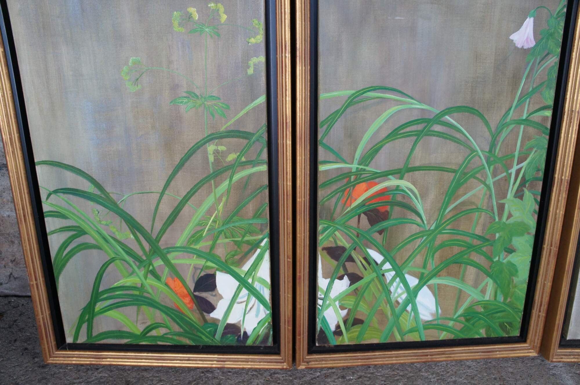 Summer Rain is a masterpiece that was painted by Sakai Hoisu during the Edo-period (1603-1868). This contemporary example after the artist separates the work into eight canvas connected through four separate folding screens or room dividers. Each canvas is a masterfully hand painted oil painting framed in wood with gold trim. Summer Rain showcases a refreshing atmosphere of a thunderstorm in Japan. Also known as Summer and Autumn Flower Plants. Each of the four screens can stand alone. Mounting hardware could be added to hang along a wall. Backing is fabric covered.