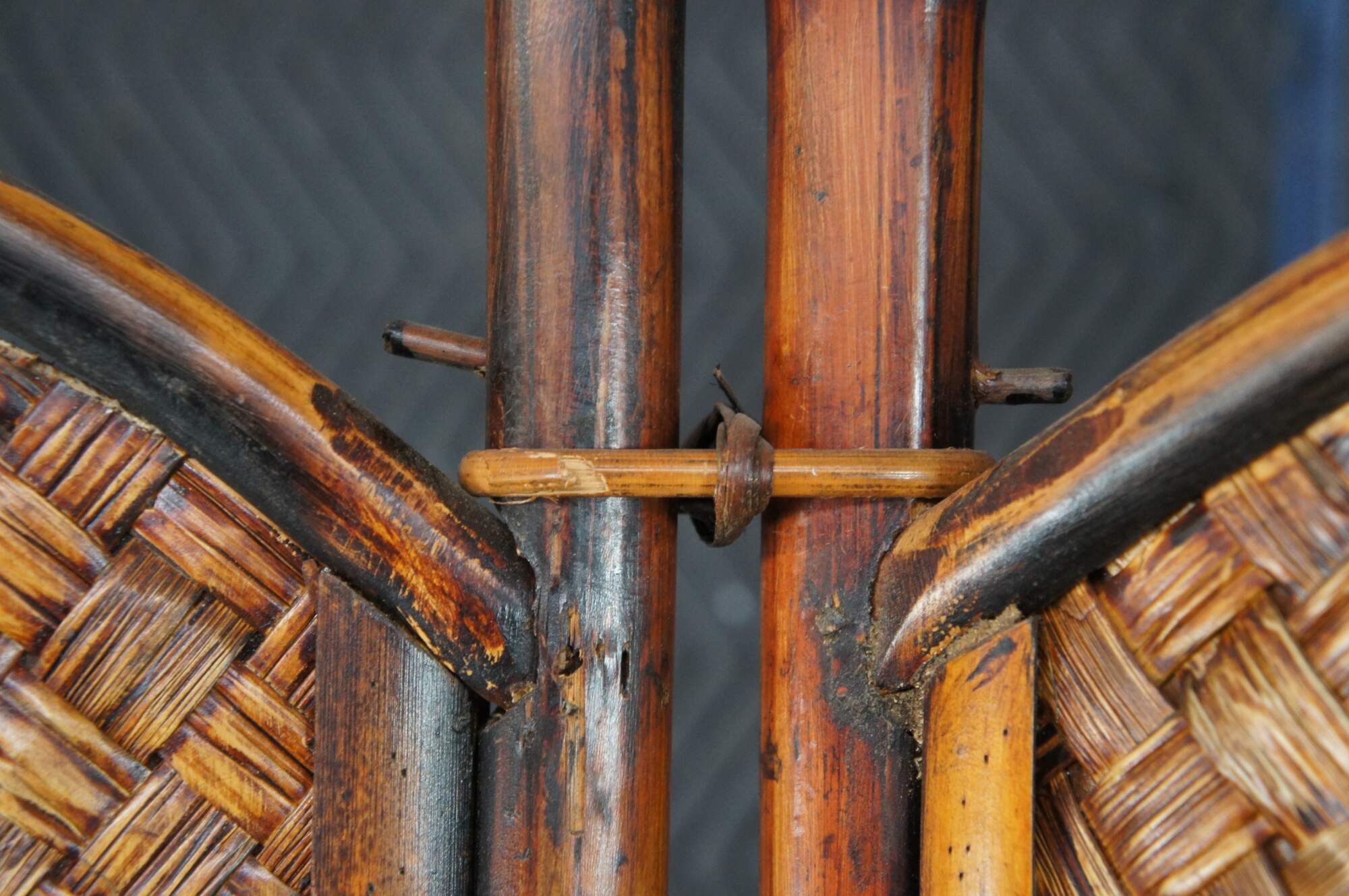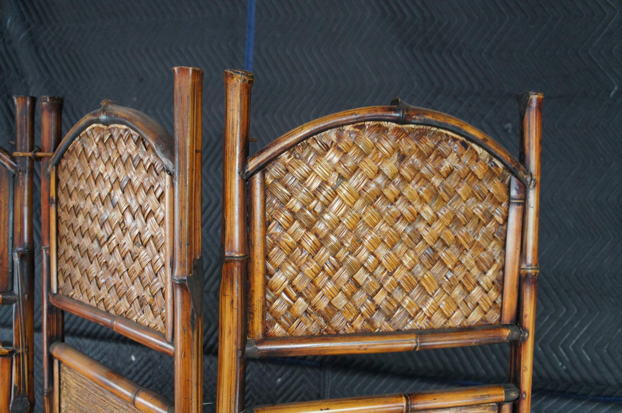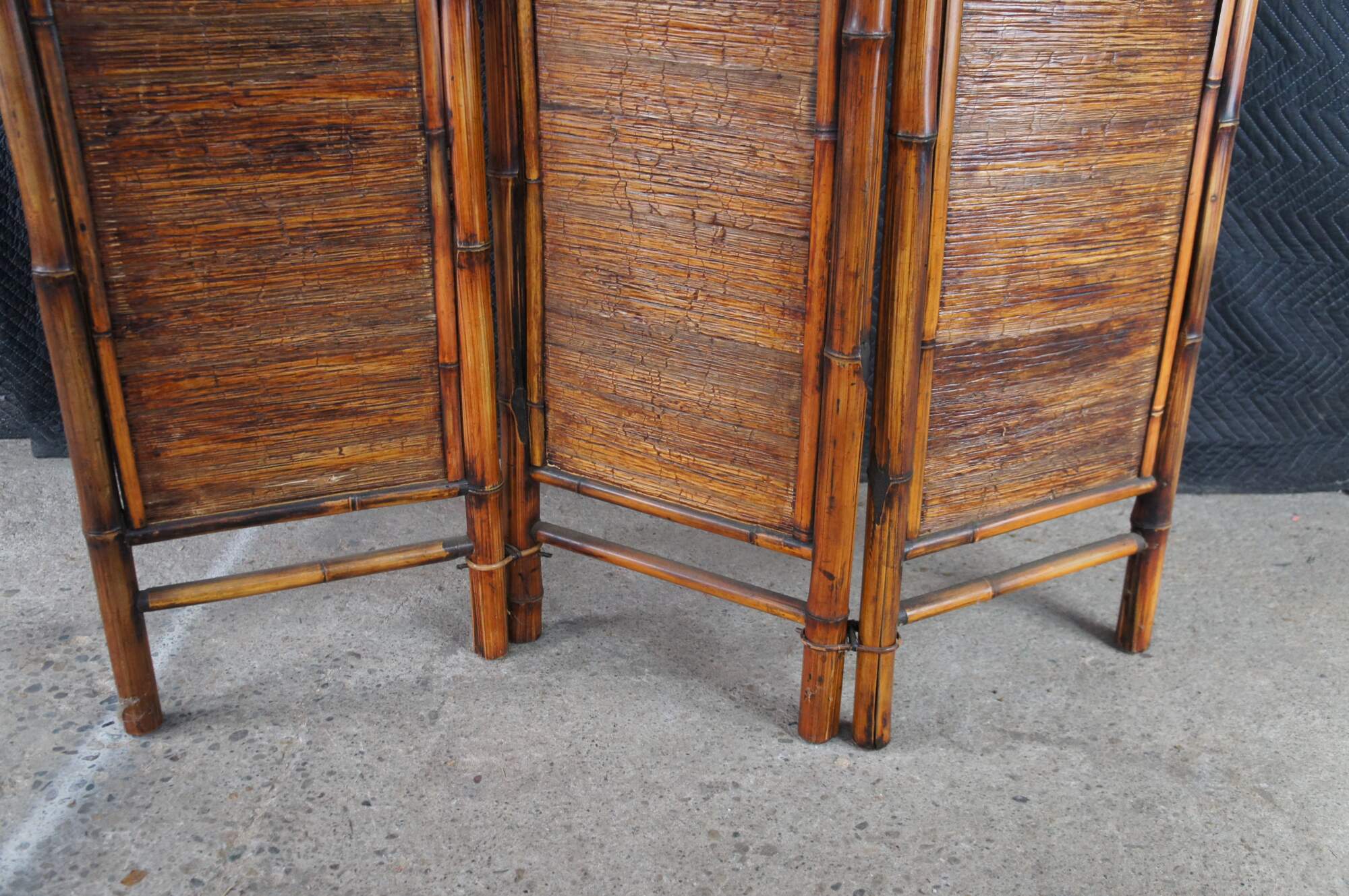 Good Condition, one of the split reed pieces connecting the bamboo is missing and was replaced with a metal wire