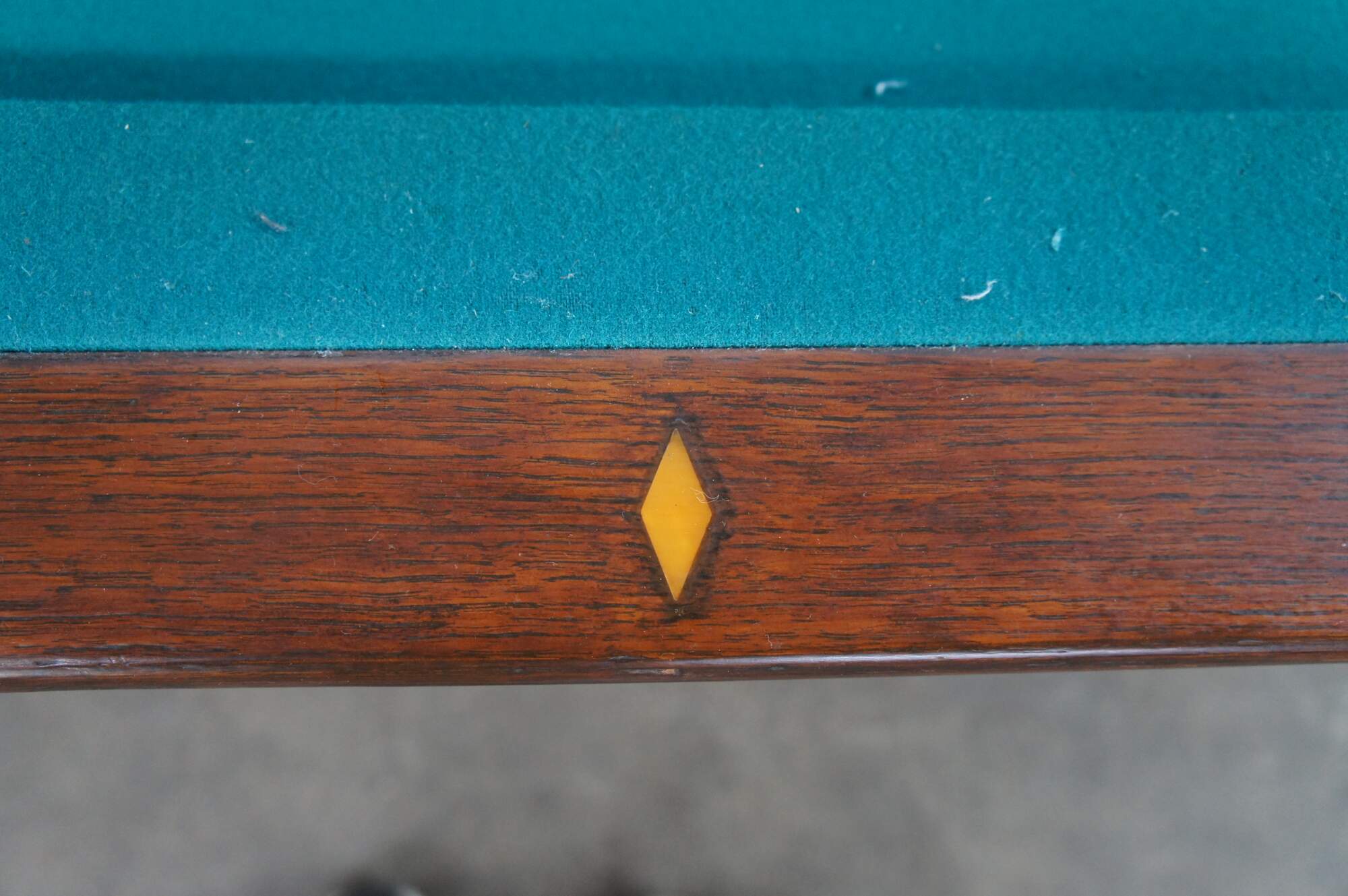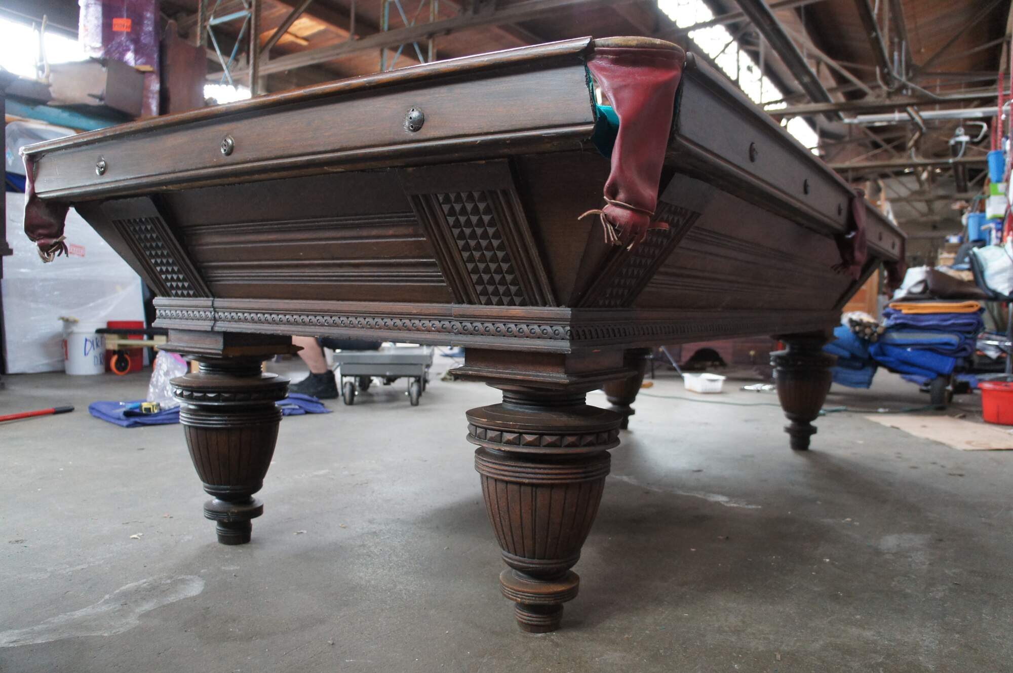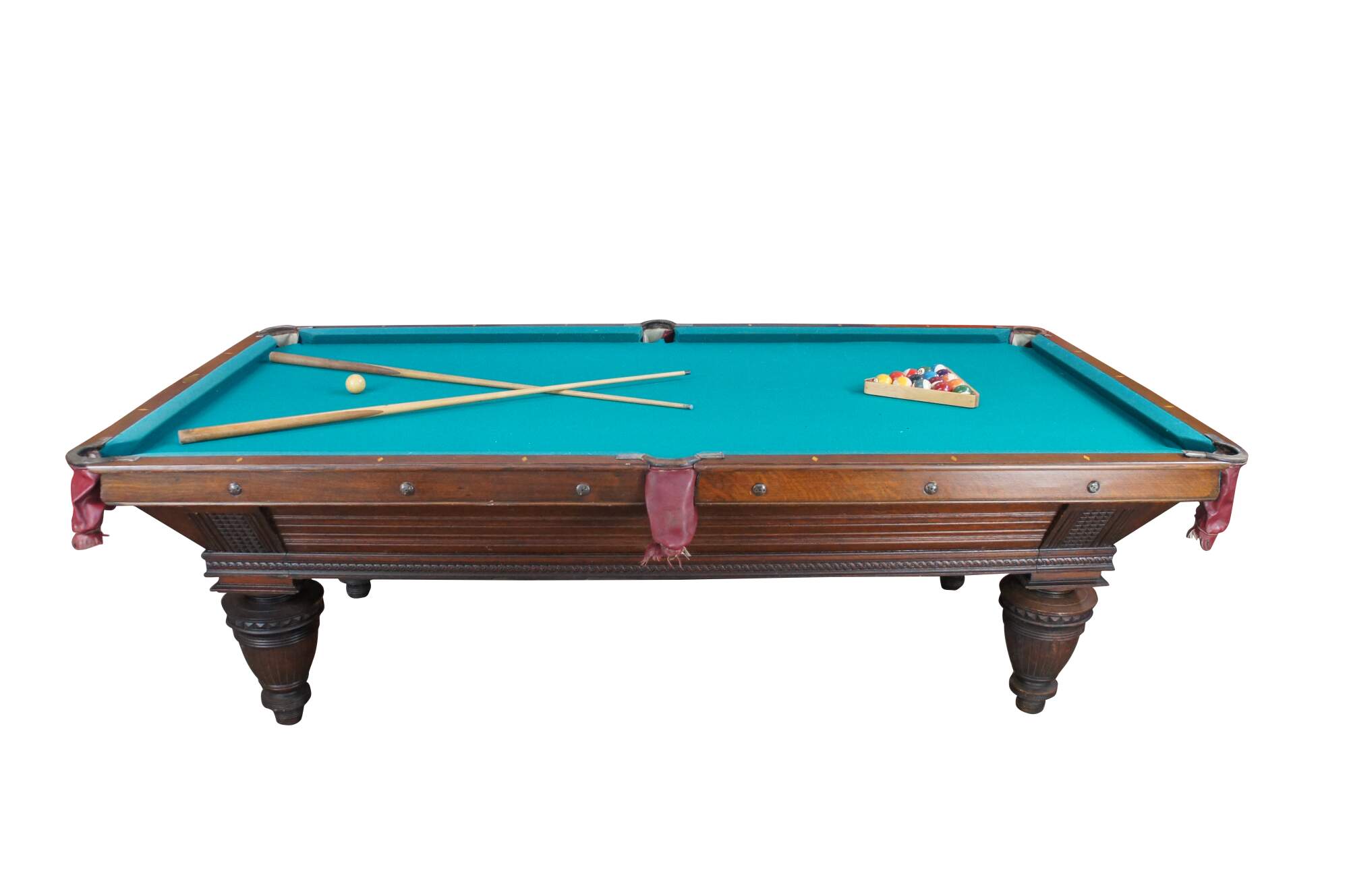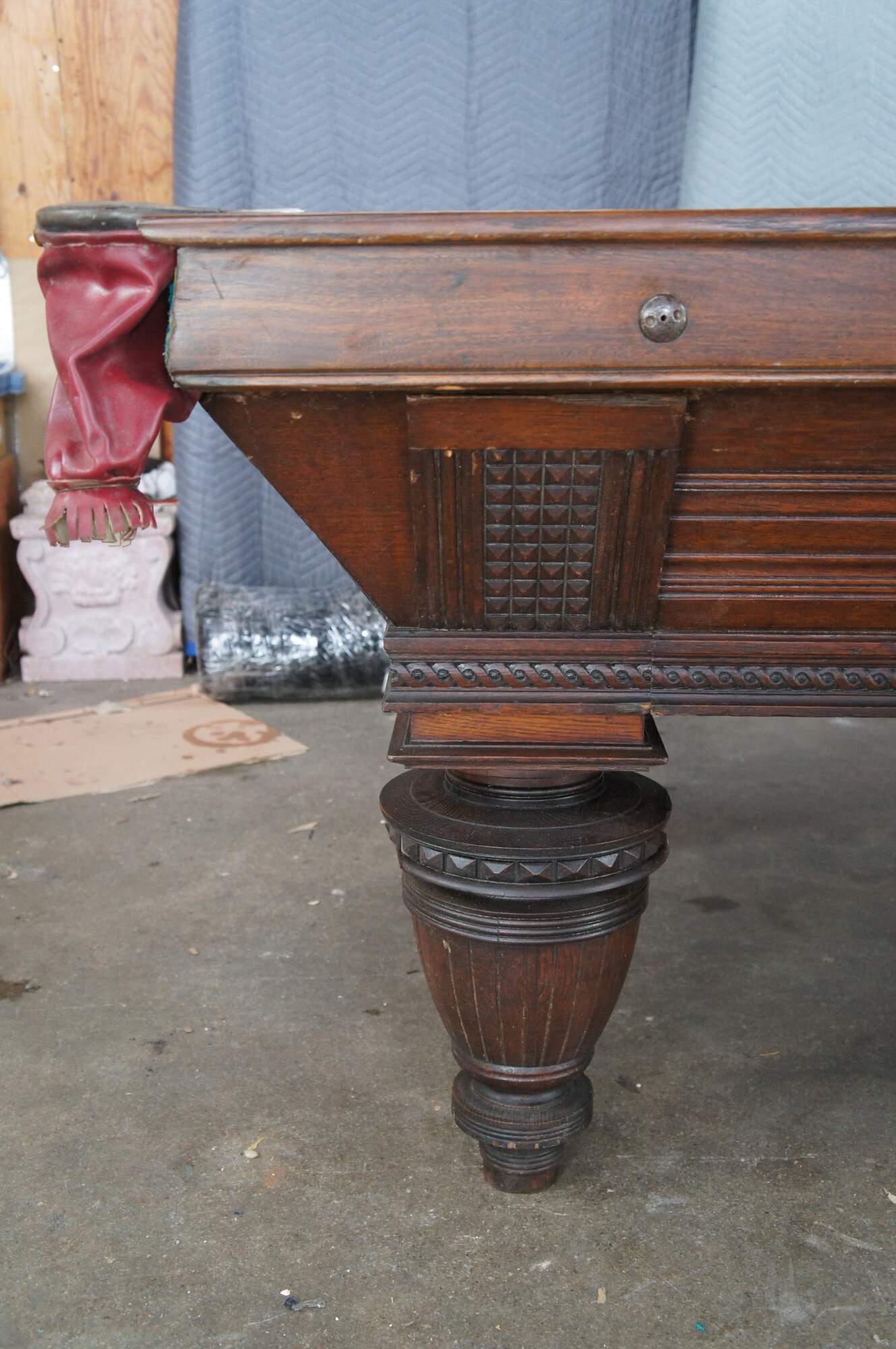 Antique Brunswick Balke Collender Improved Union League Pool Table, Circa Late 1894s to early 1900s, #34026. The Improved Union League Design drew inspiration from Jacobean and Egyptian Styling. Made from oak and quartersawn oak with carved molding over fluted and turned legs, with square caps. The table has three piece Vermont 1" slate, Monarch Cushions, red leather or interlaced leather pockets, some original and several other sticks, Belgian made Amarith balls and additional accessories. Includes table cover
