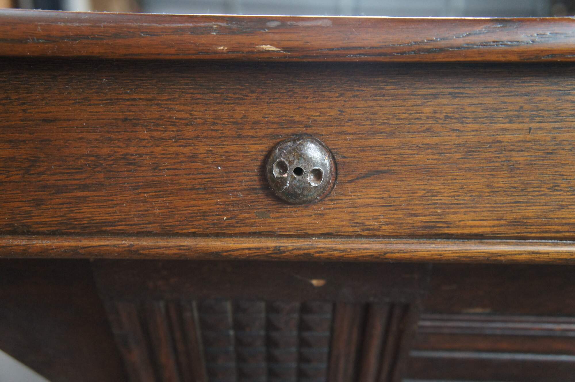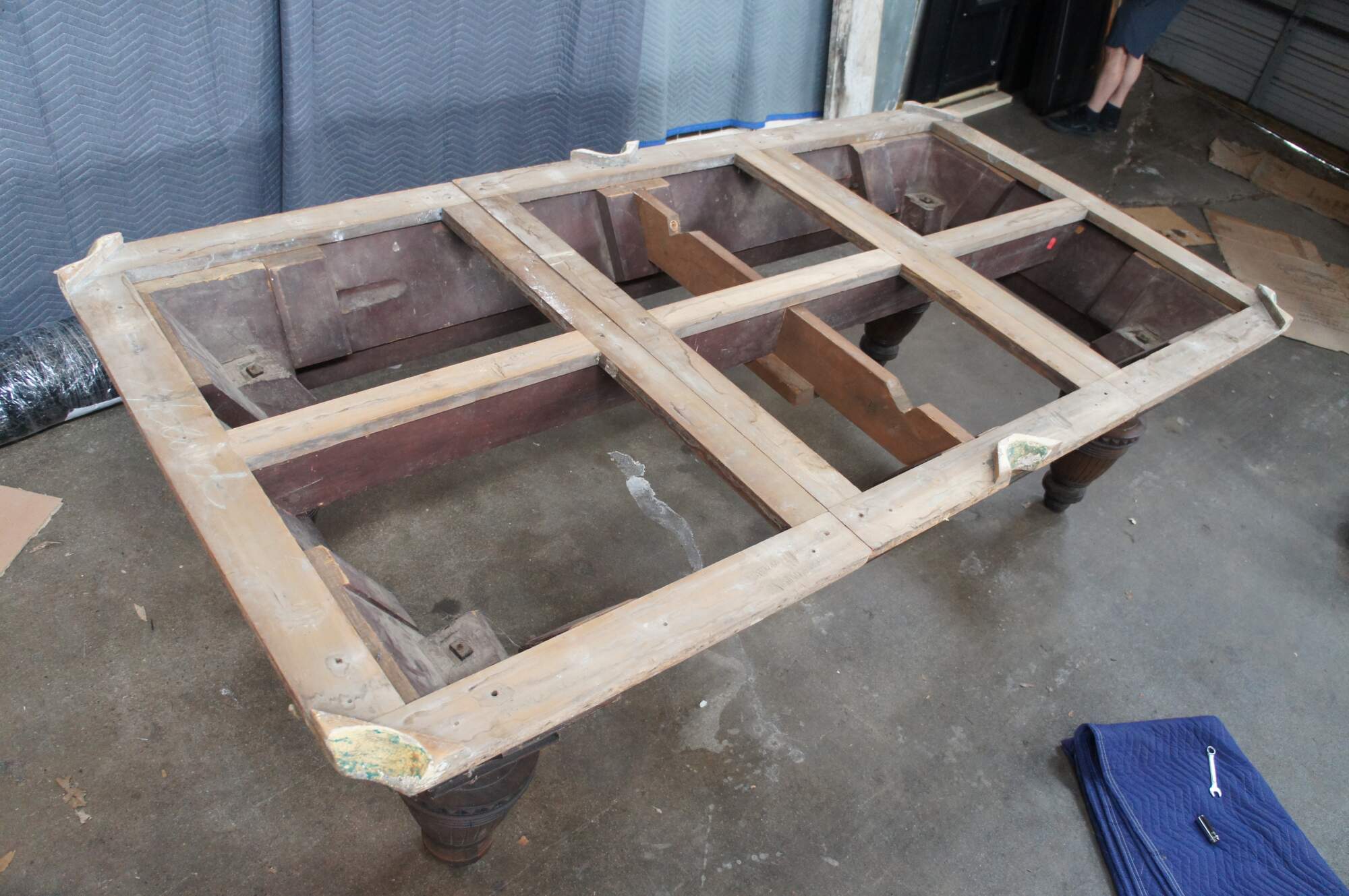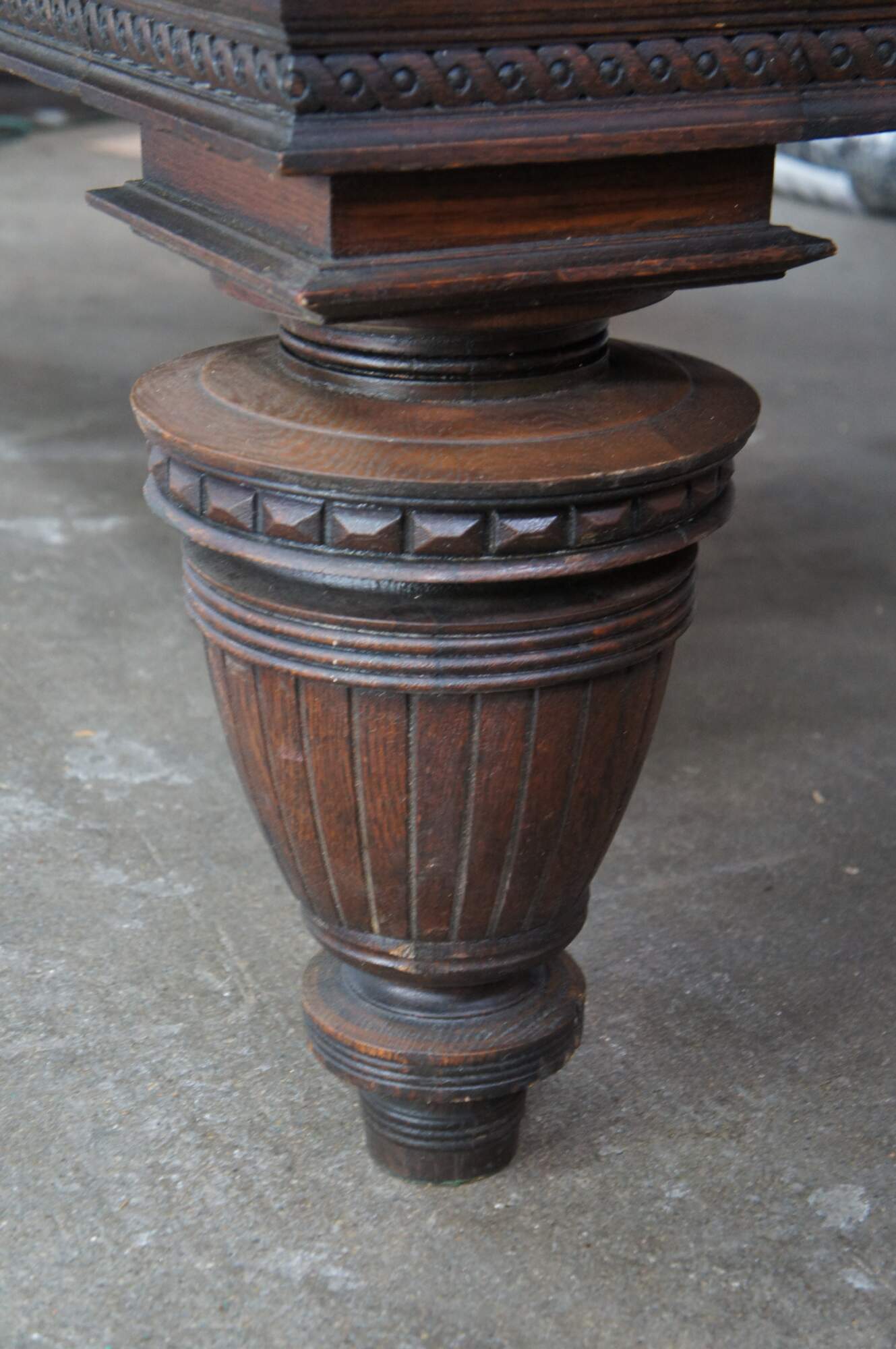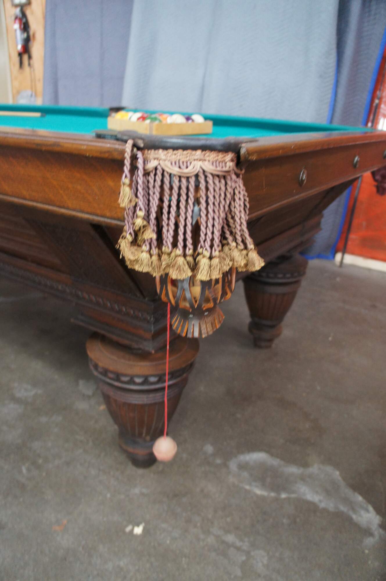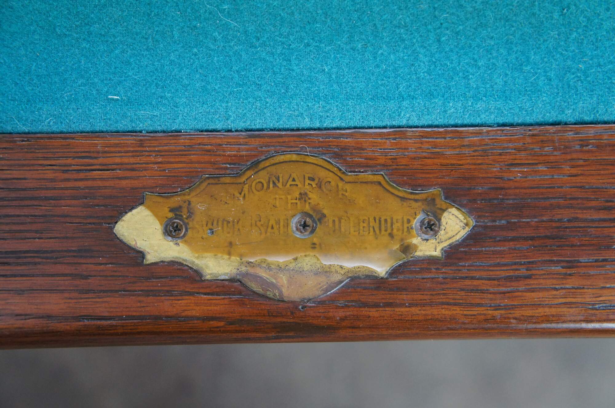 Antique Brunswick Balke Collender Improved Union League Pool Table, Circa Late 1894s to early 1900s, #34026. The Improved Union League Design drew inspiration from Jacobean and Egyptian Styling. Made from oak and quartersawn oak with carved molding over fluted and turned legs, with square caps. The table has three piece Vermont 1" slate, Monarch Cushions, red leather or interlaced leather pockets, some original and several other sticks, Belgian made Amarith balls and additional accessories. Includes table cover