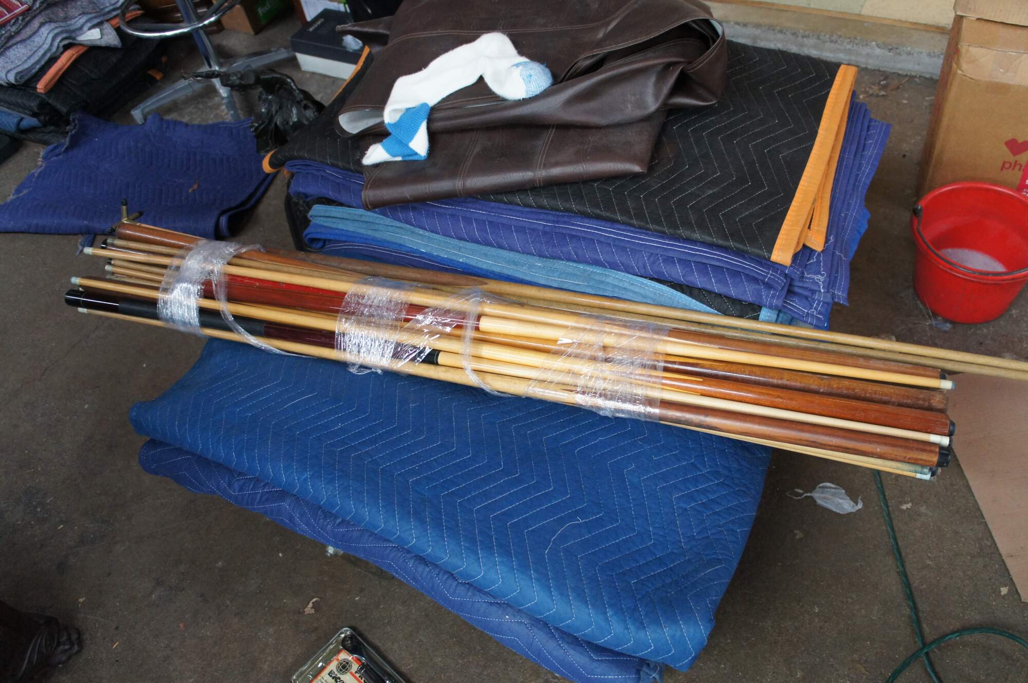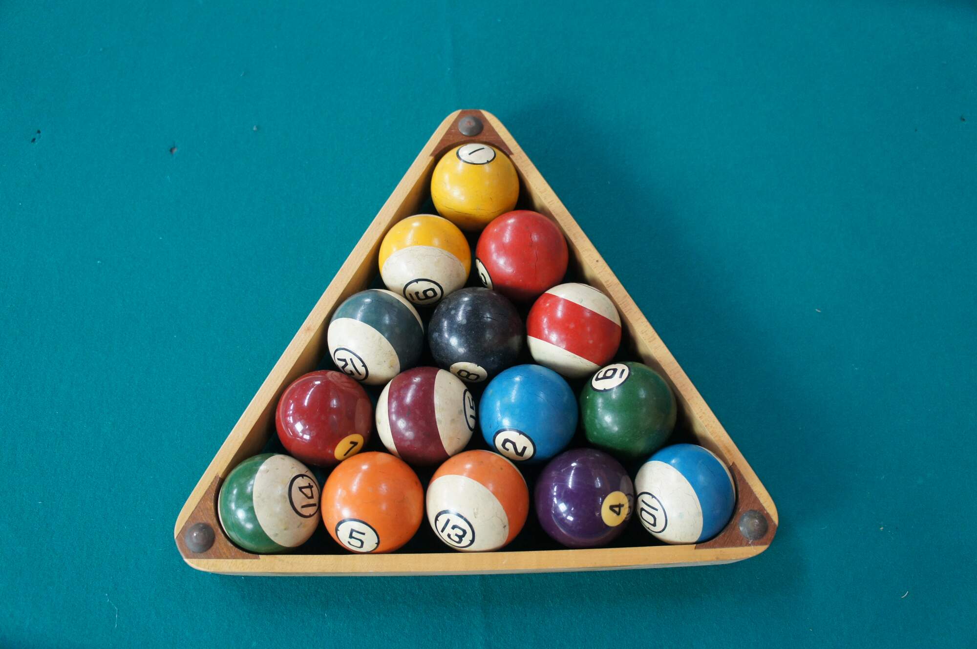 Fair; wear and distressing from age and use. Marking and edgewear. Table felt should be replaced. Current felt is worn with holes. Two of the Belgian Amarith Balls are missing. Others are worn with splits and crazing to finish. Some sticks are wrapped. Leather pockets are dry