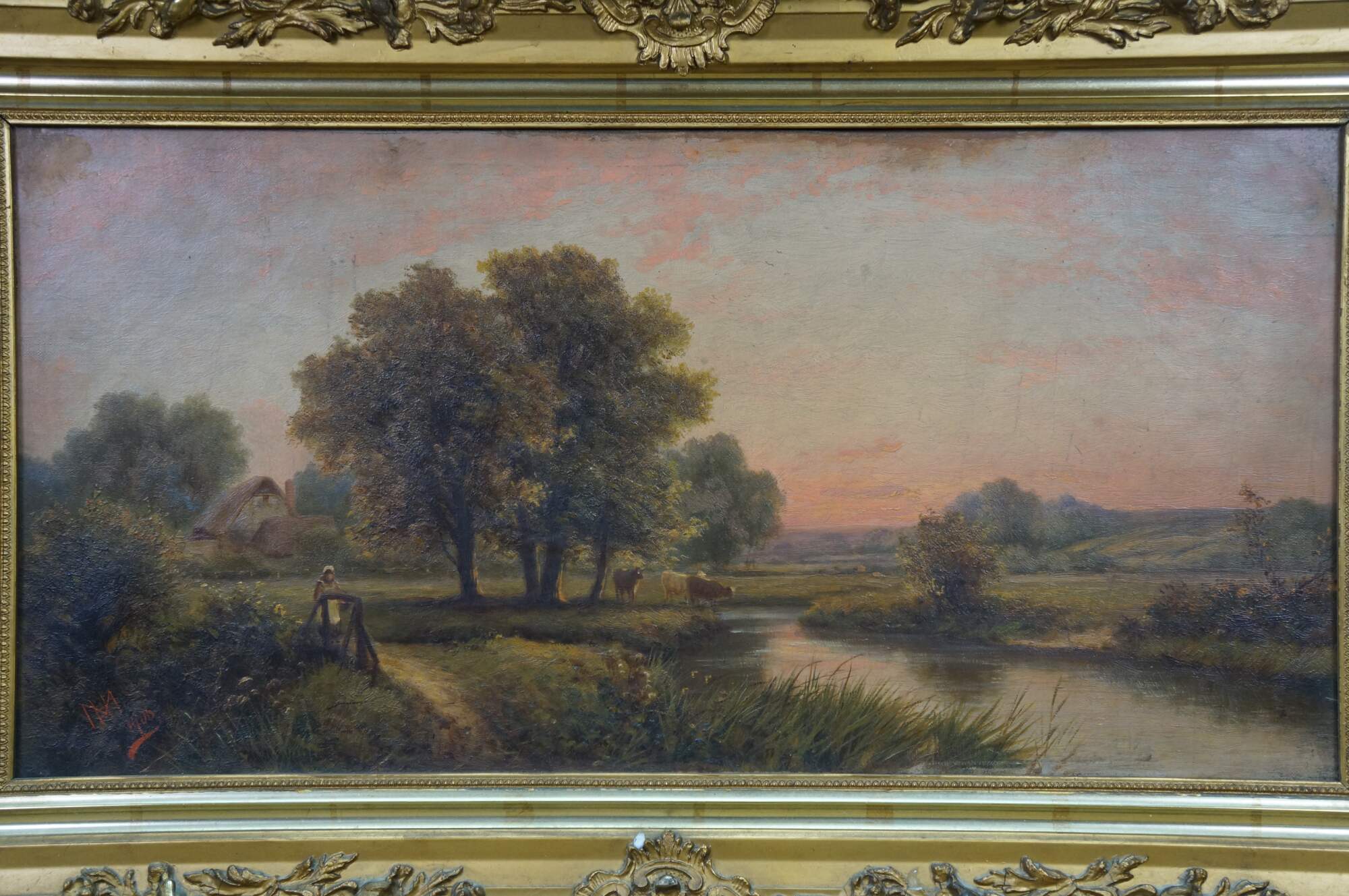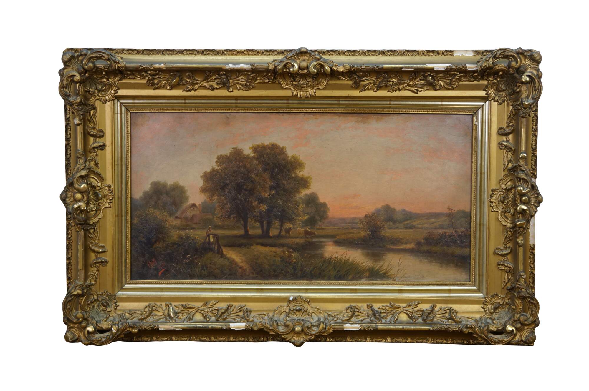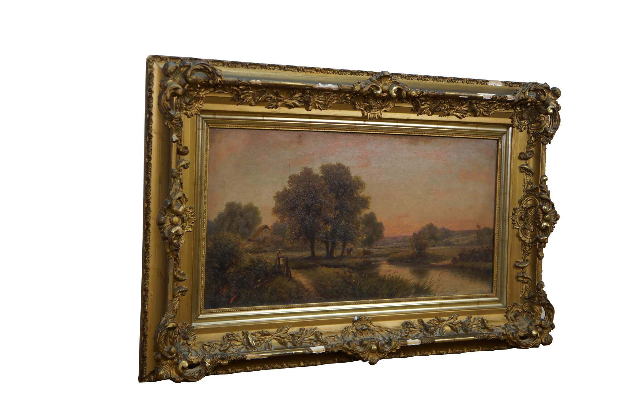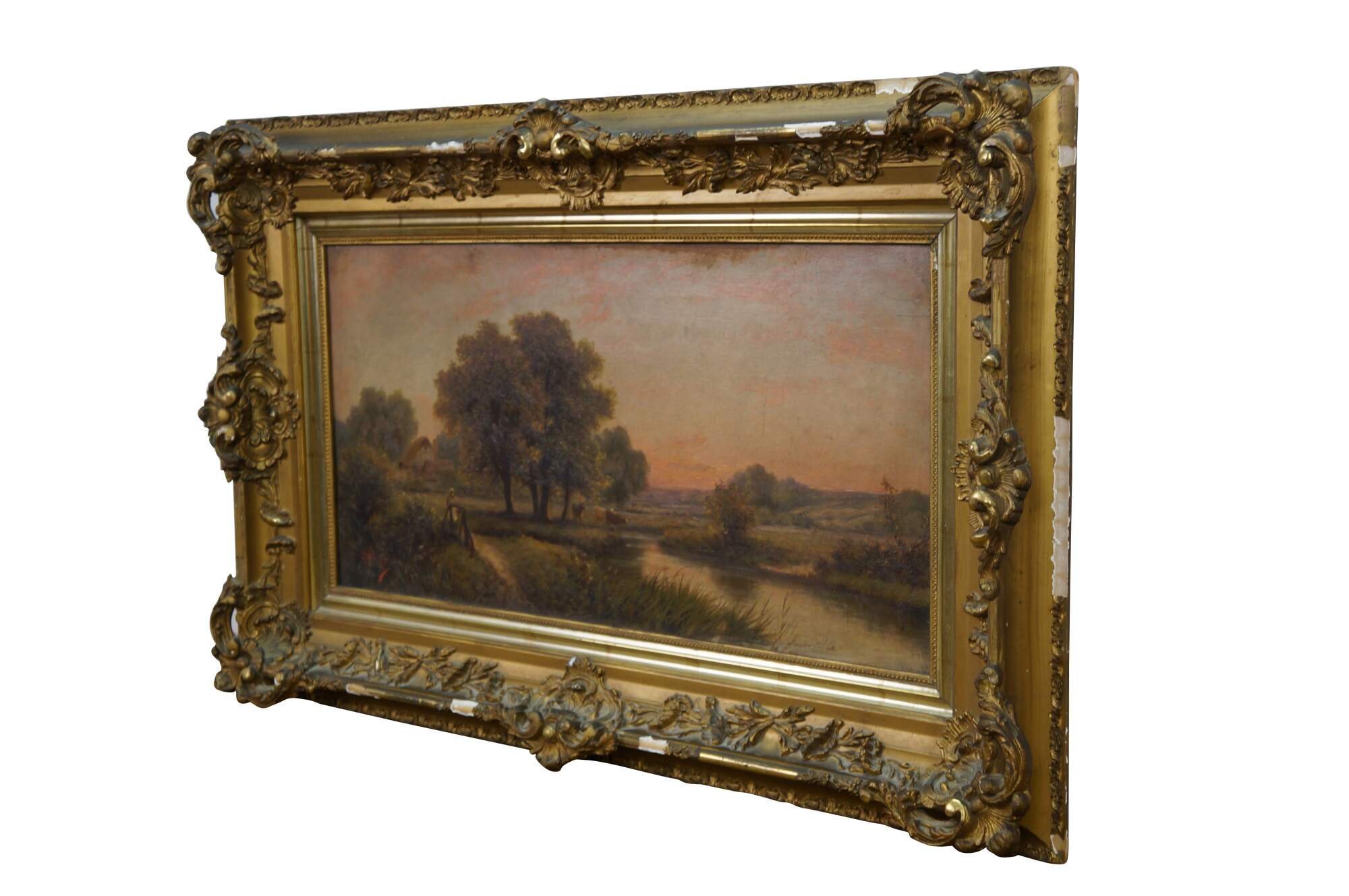 Antique 1906 Henry Maidment country farmhouse oil painting featuring a sunset pastoral landscape scene on the farm. Large trees give shade to the cows grazing at the river's edge while a figure strolls along a nearby path. In the distance, a thatched farmhouse awaits the evening. Ornate baroque gold gilt frame.