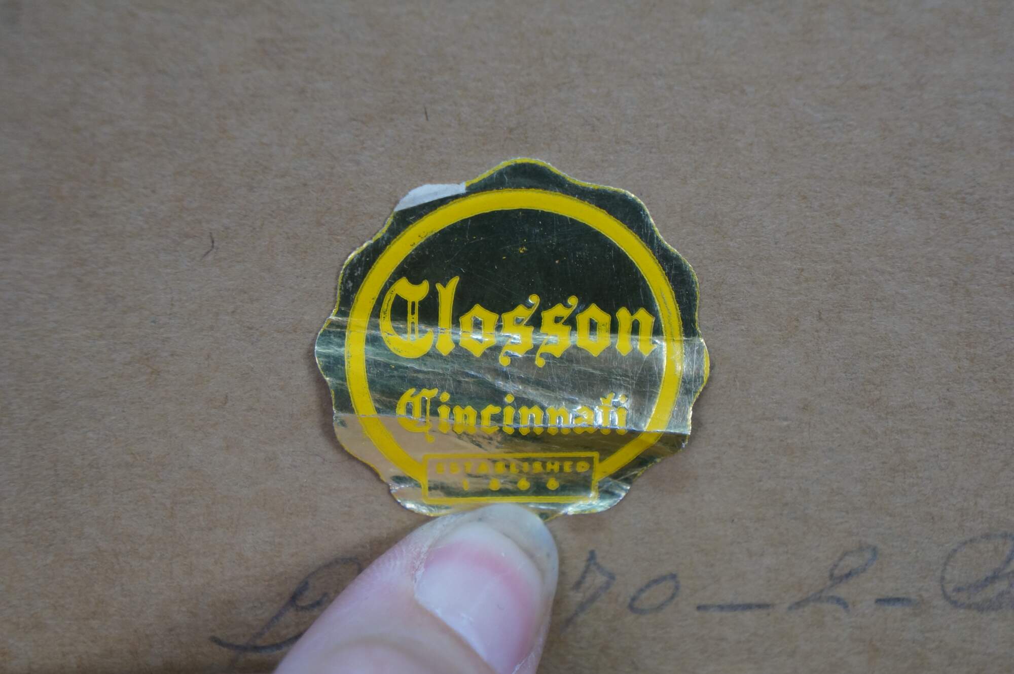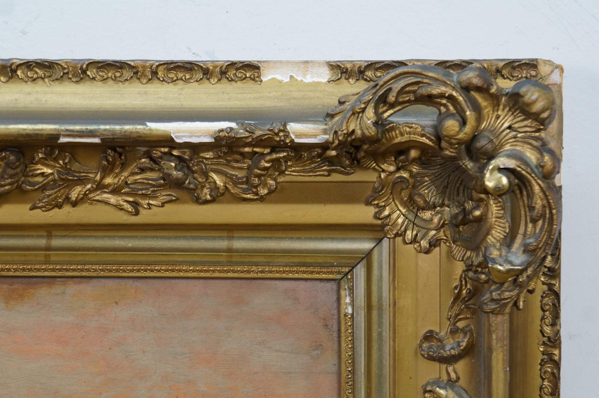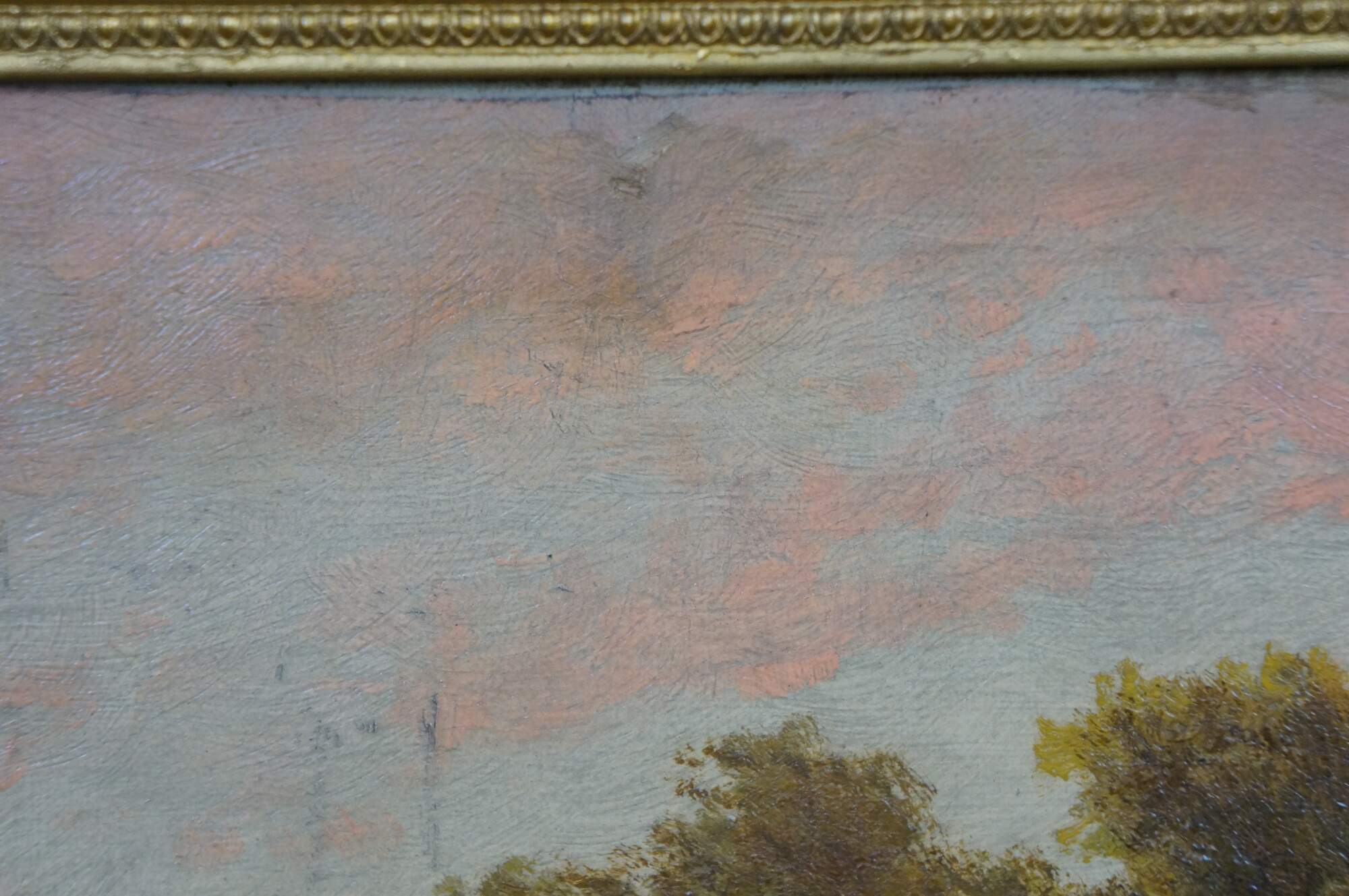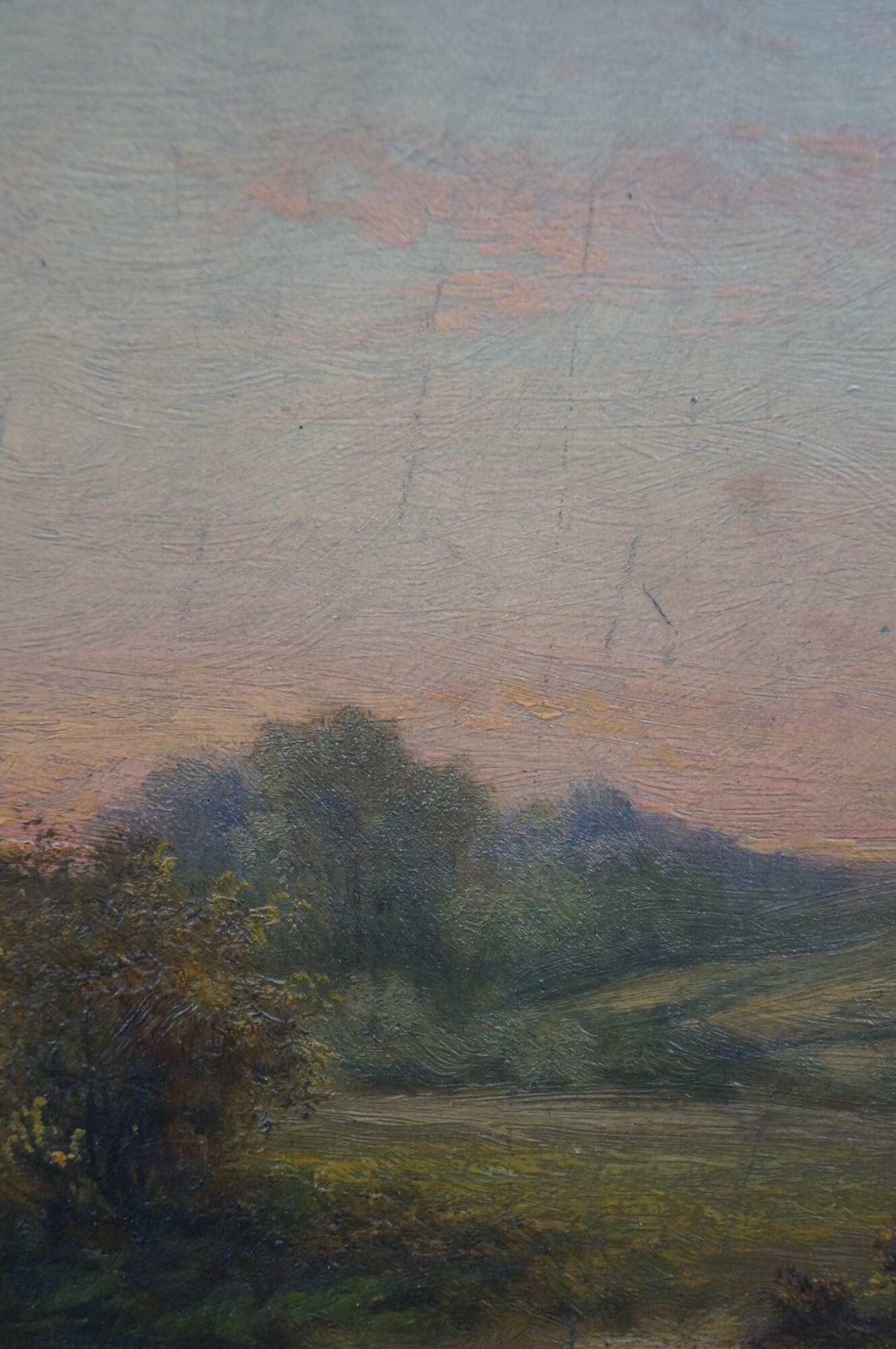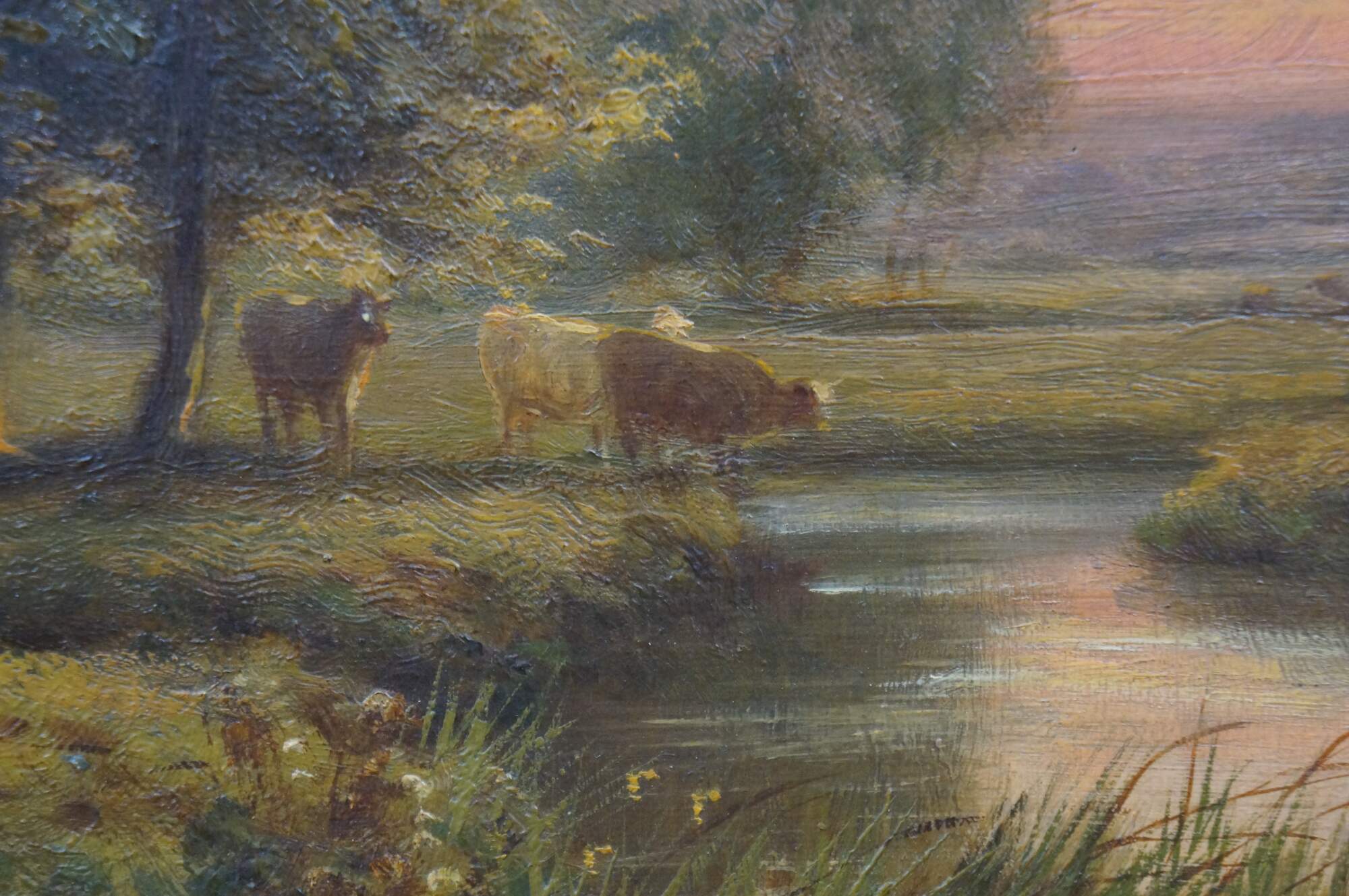 Antique 1906 Henry Maidment country farmhouse oil painting featuring a sunset pastoral landscape scene on the farm. Large trees give shade to the cows grazing at the river's edge while a figure strolls along a nearby path. In the distance, a thatched farmhouse awaits the evening. Ornate baroque gold gilt frame.