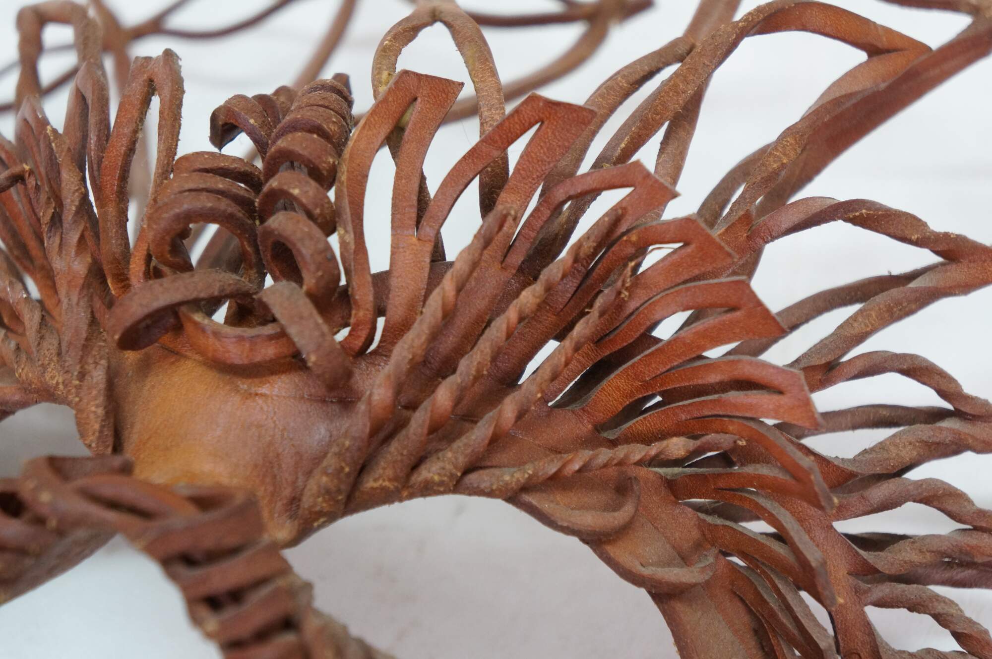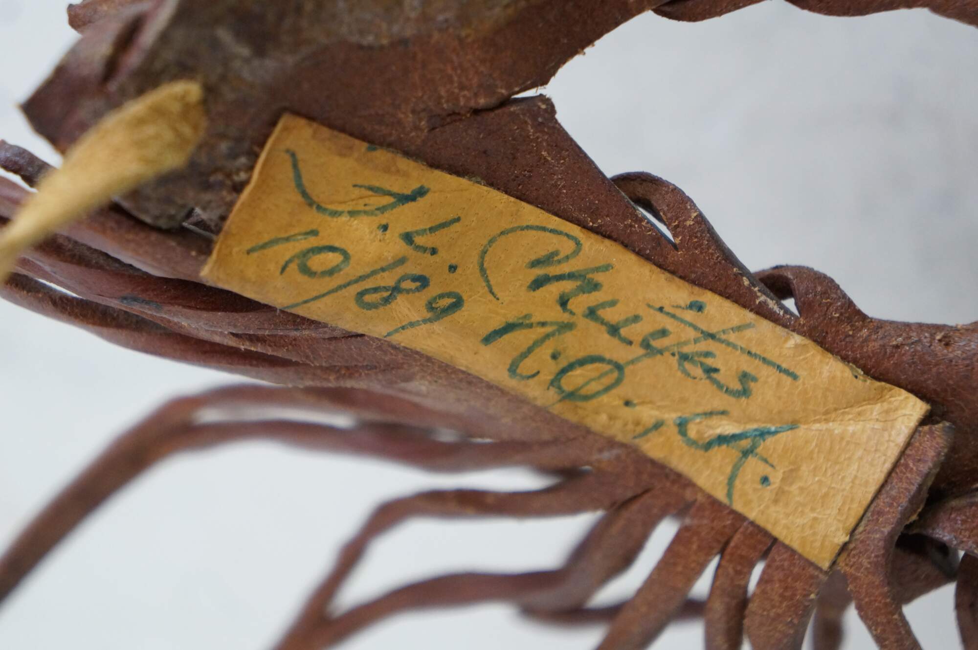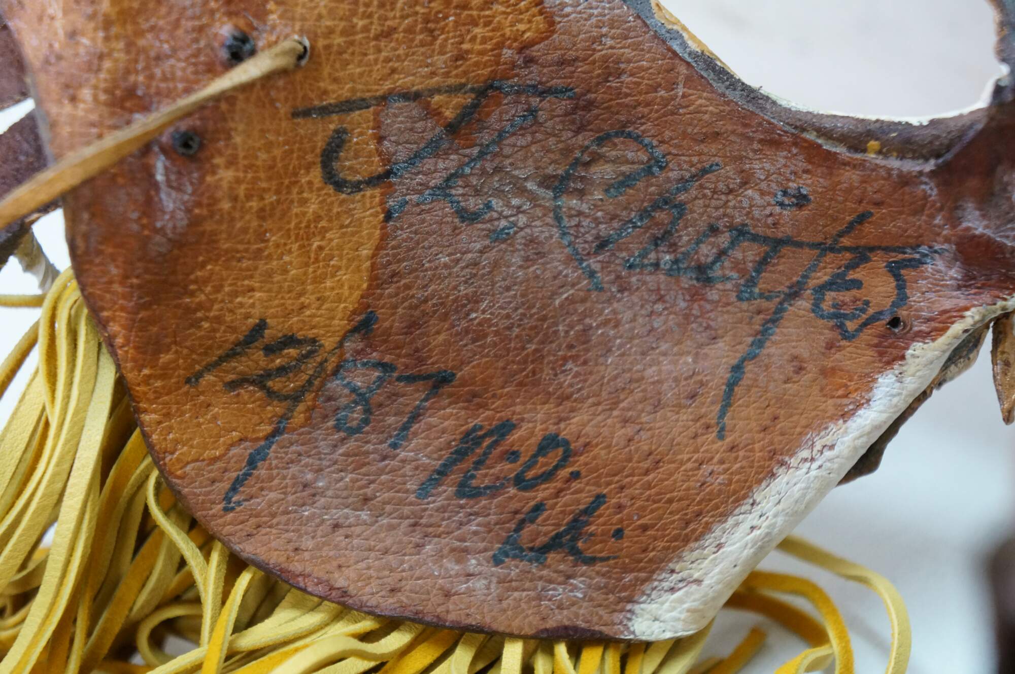 Two vintage J.L. Chuites hand made face mask art sculptures. Signed by the American master leather artist JL Chuites of Parthenon, Arkansas, circa 1987 and 1989.