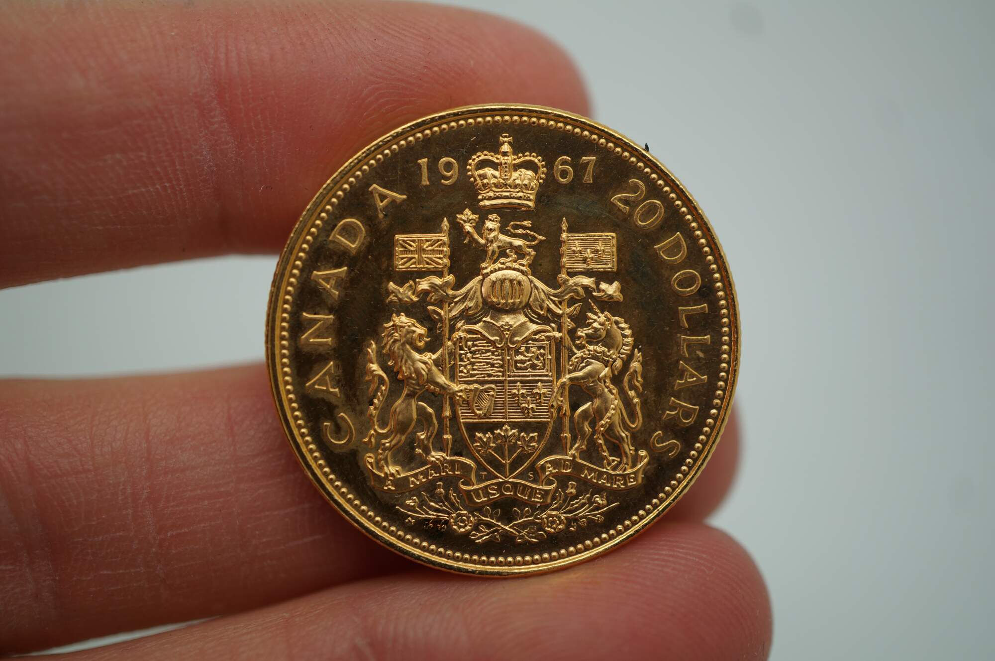 Key Features: Includes a $20 coin struck in 22-karat gold, as well as silver and bronze coins honoring Canada's 100th anniversary. Design: The coins feature special Centennial designs by artist Alex Colville, depicting Canadian wildlife. Packaging: The set is housed in its original dark blue presentation case with a white interior bearing the Royal Canadian Mint logo.