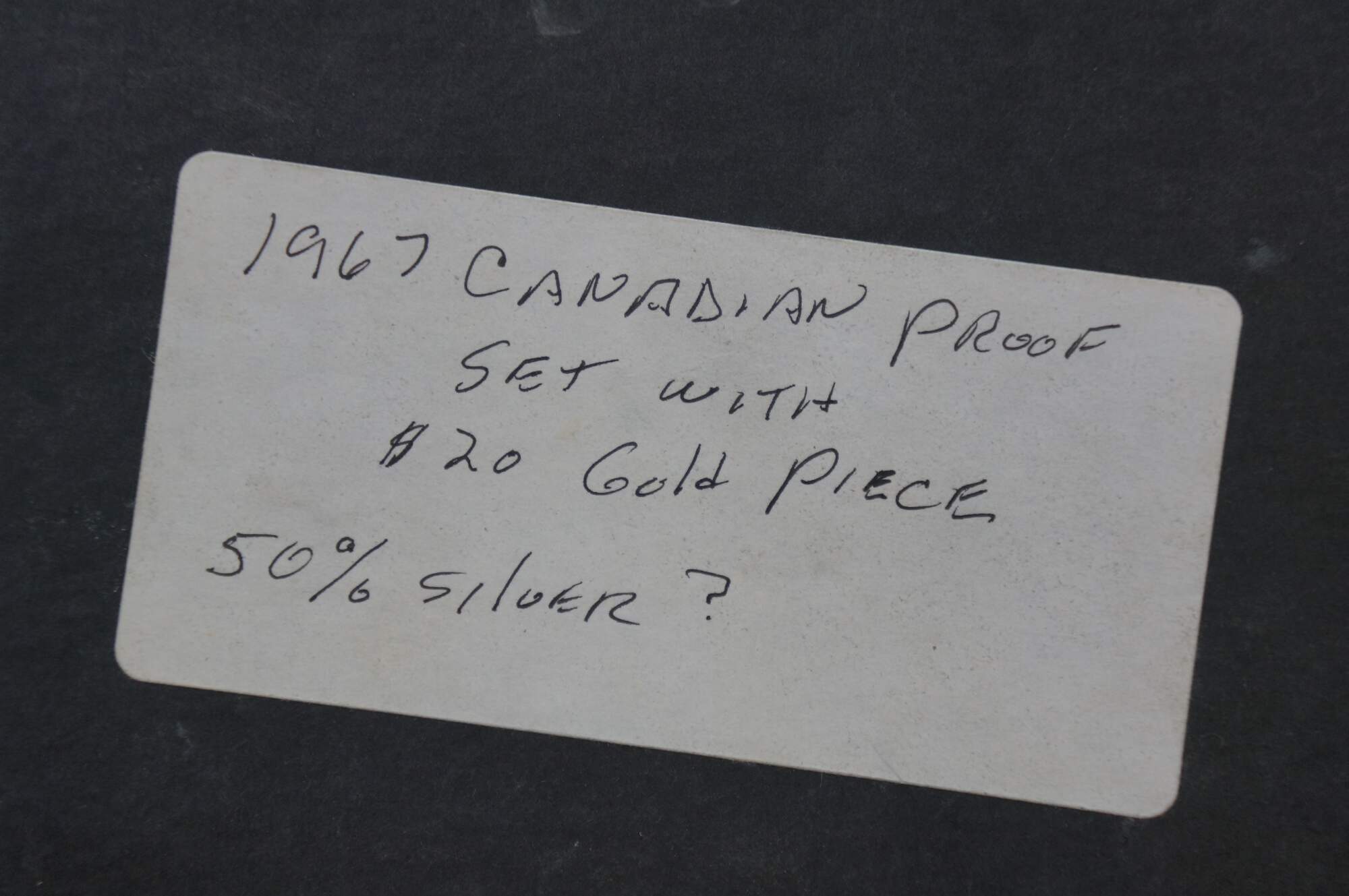 Mid century, circa 1967 Canadian Confederation Centennial 7-Coin Proof Set, featuring all circulating denominations from one cent to one dollar, plus a commemorative $20 gold coin.