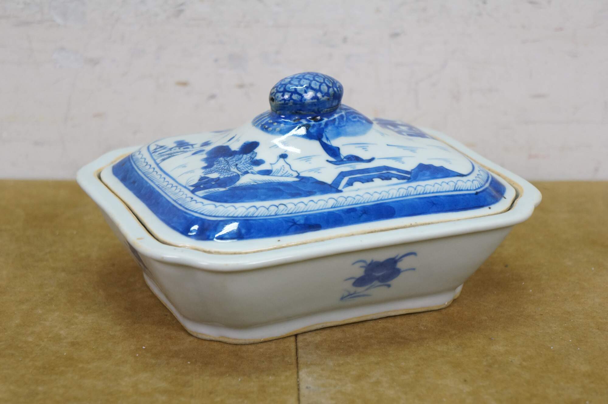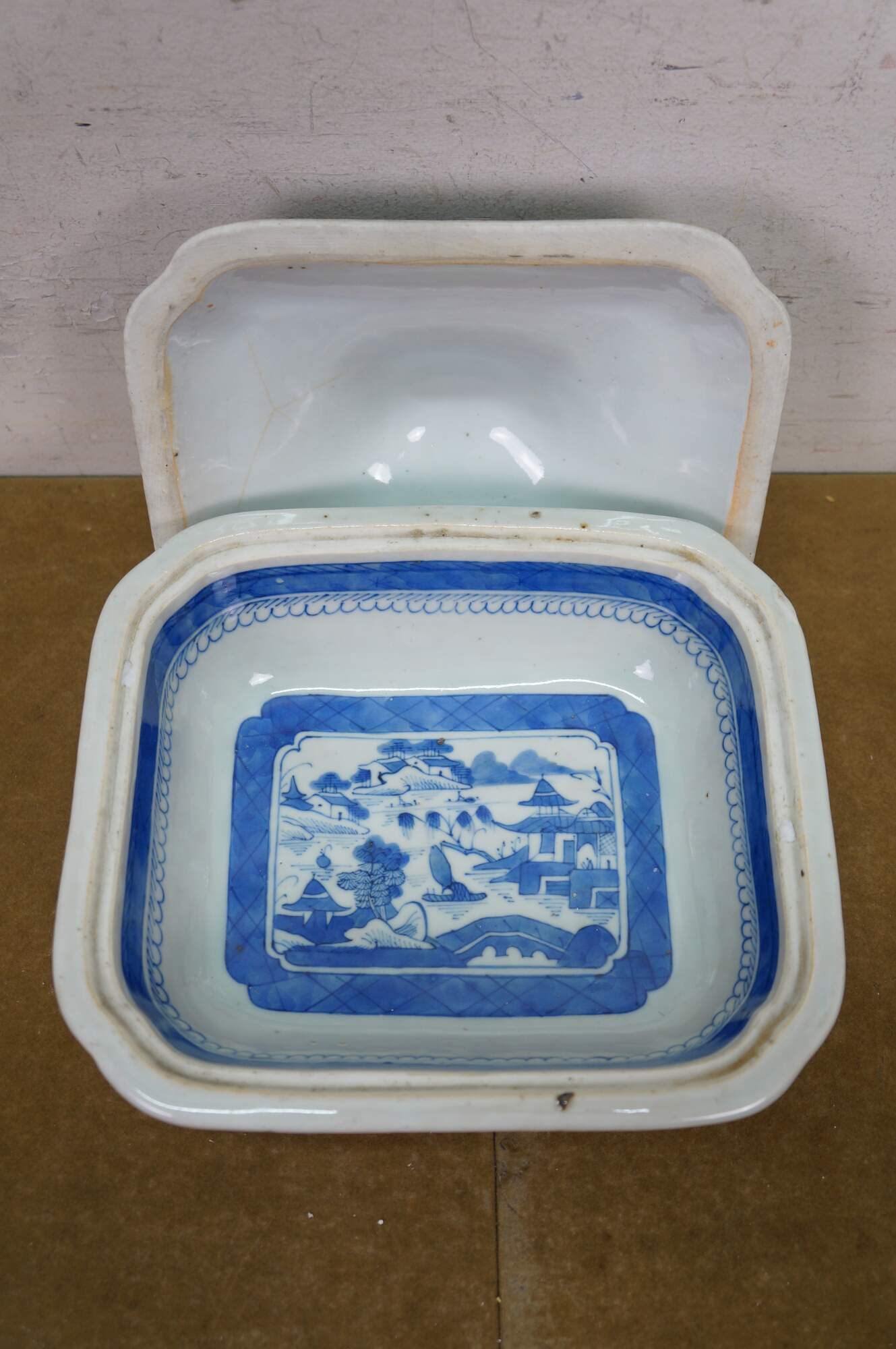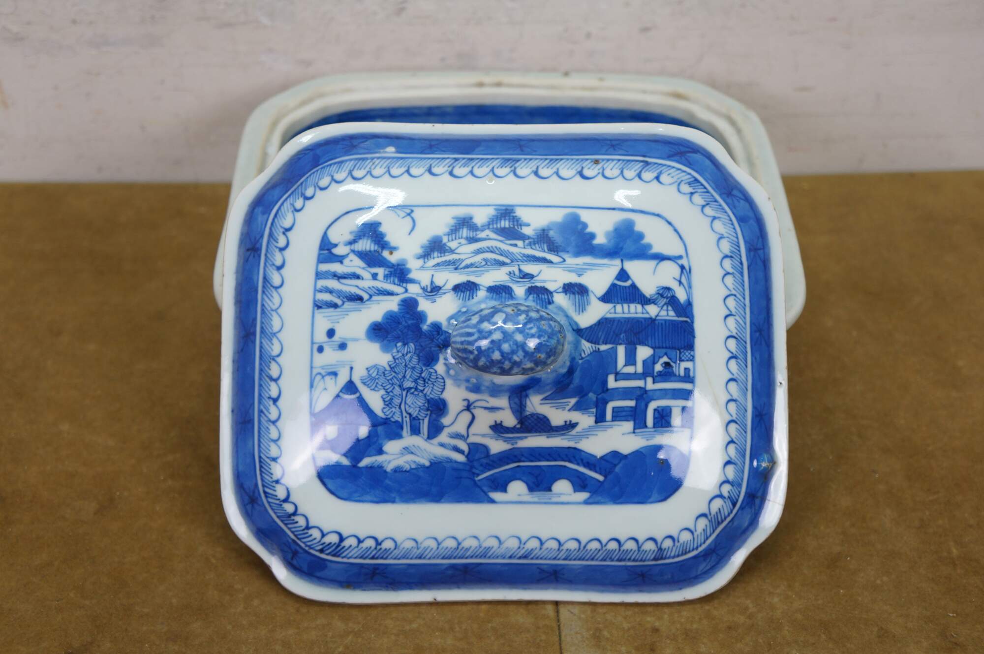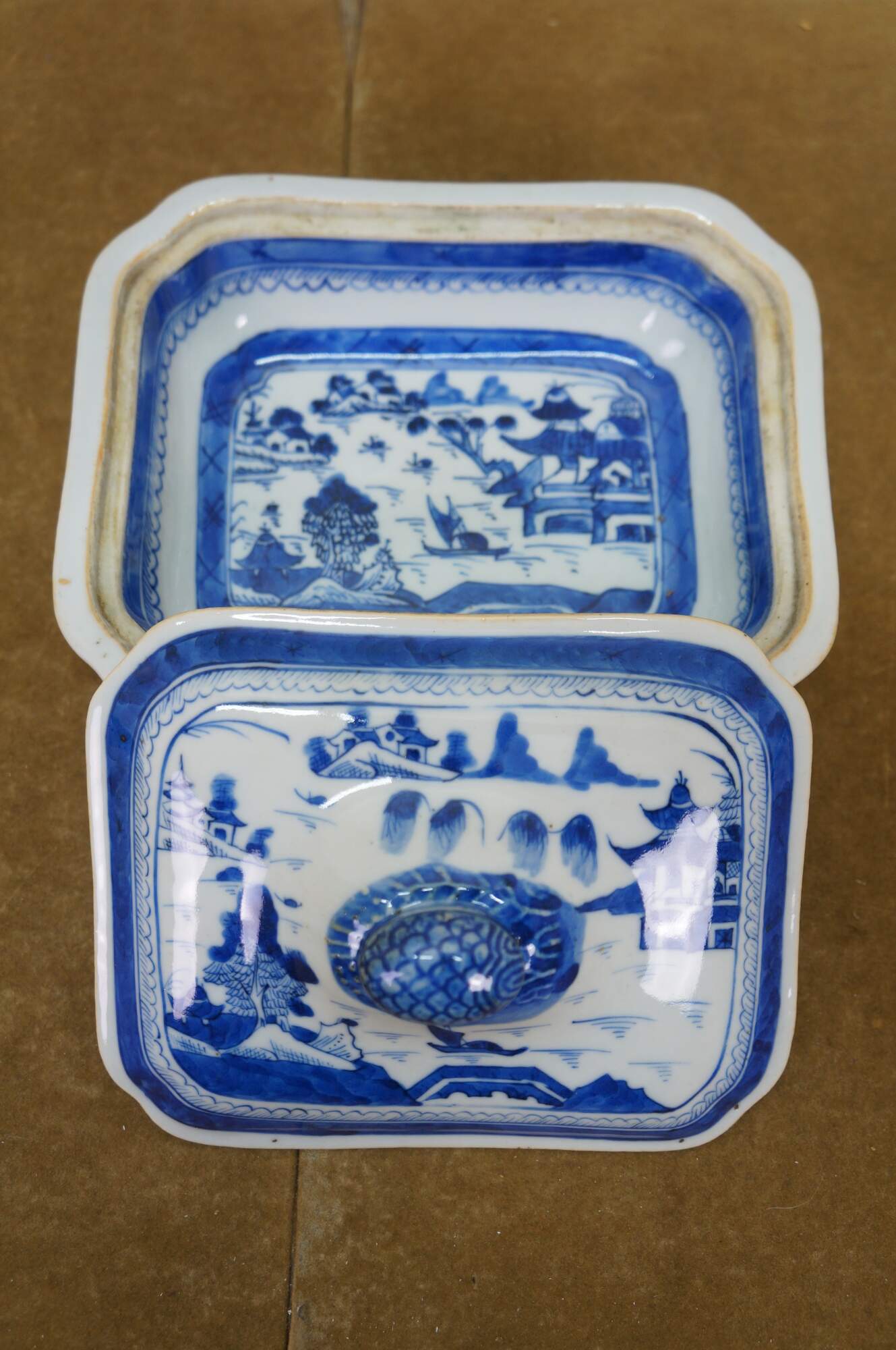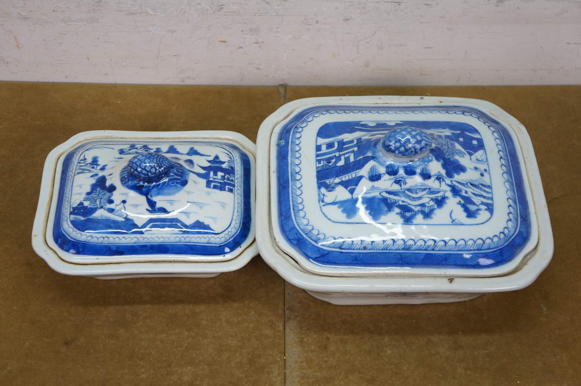 Antique 19th century Qing Dynasty Chinese Canton export blue and white porcelain serving pieces. Includes two vegetable tureens with lids and one oval serving platter.� Features classic Chinoiserie landscapes with pagodas, tea houses, willow patterns and pineapple finial.