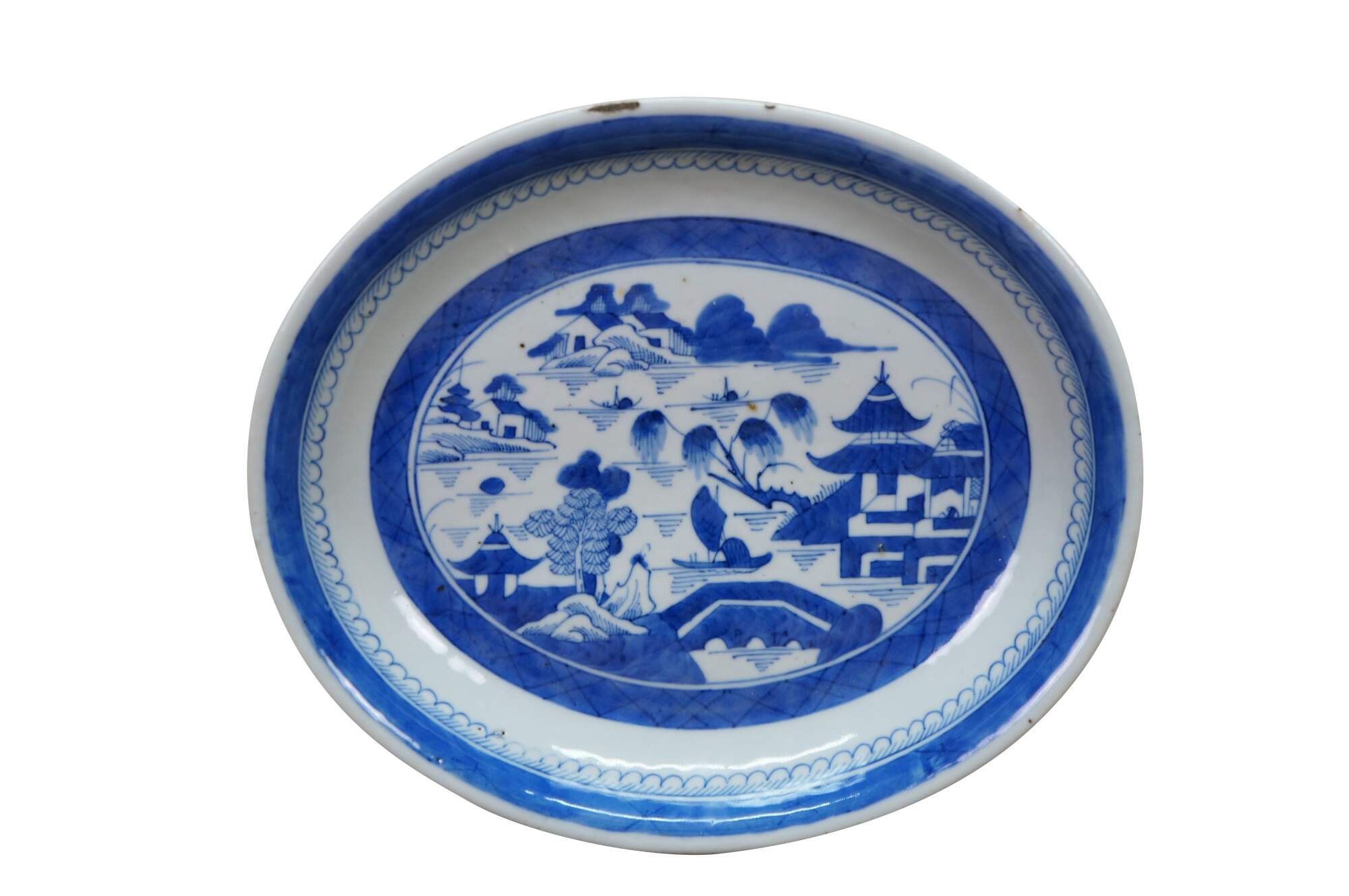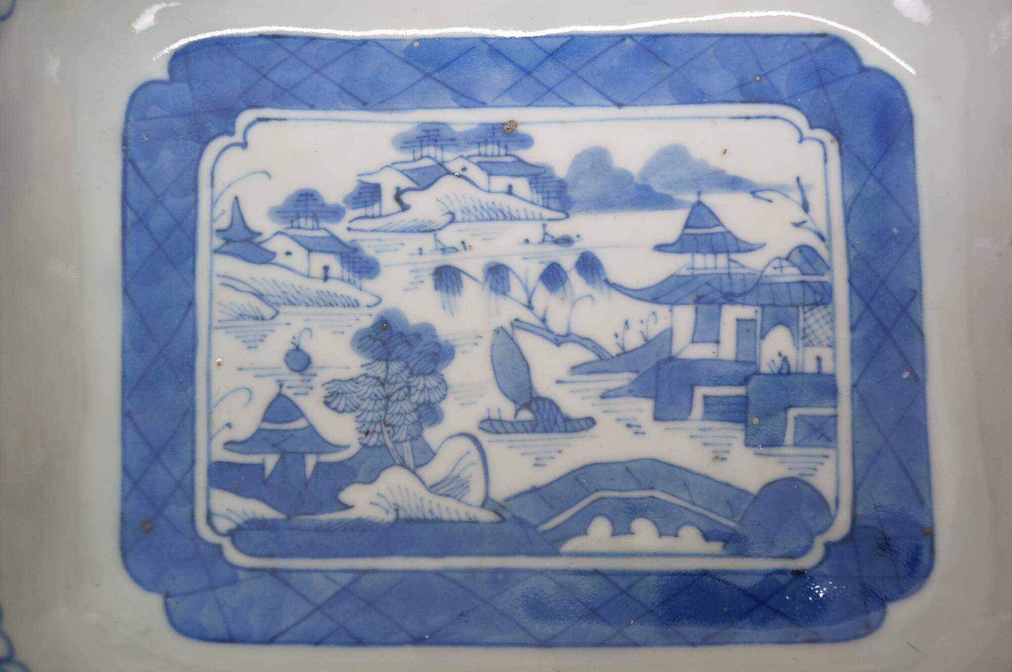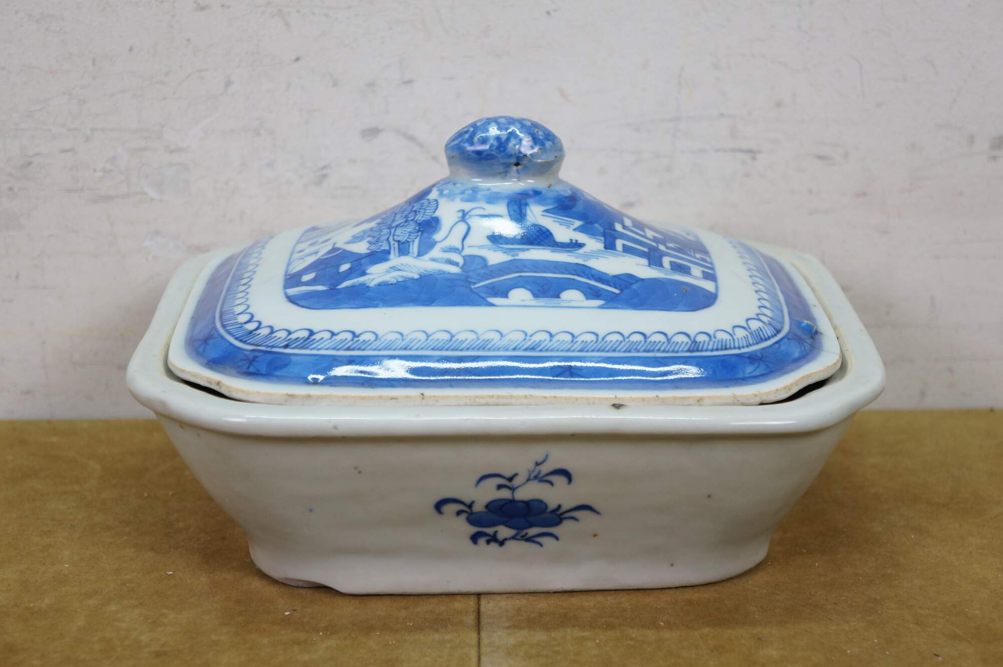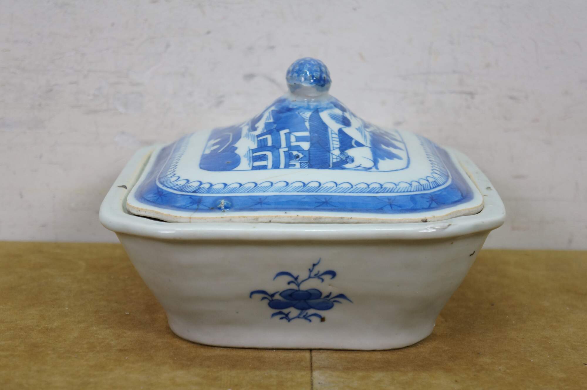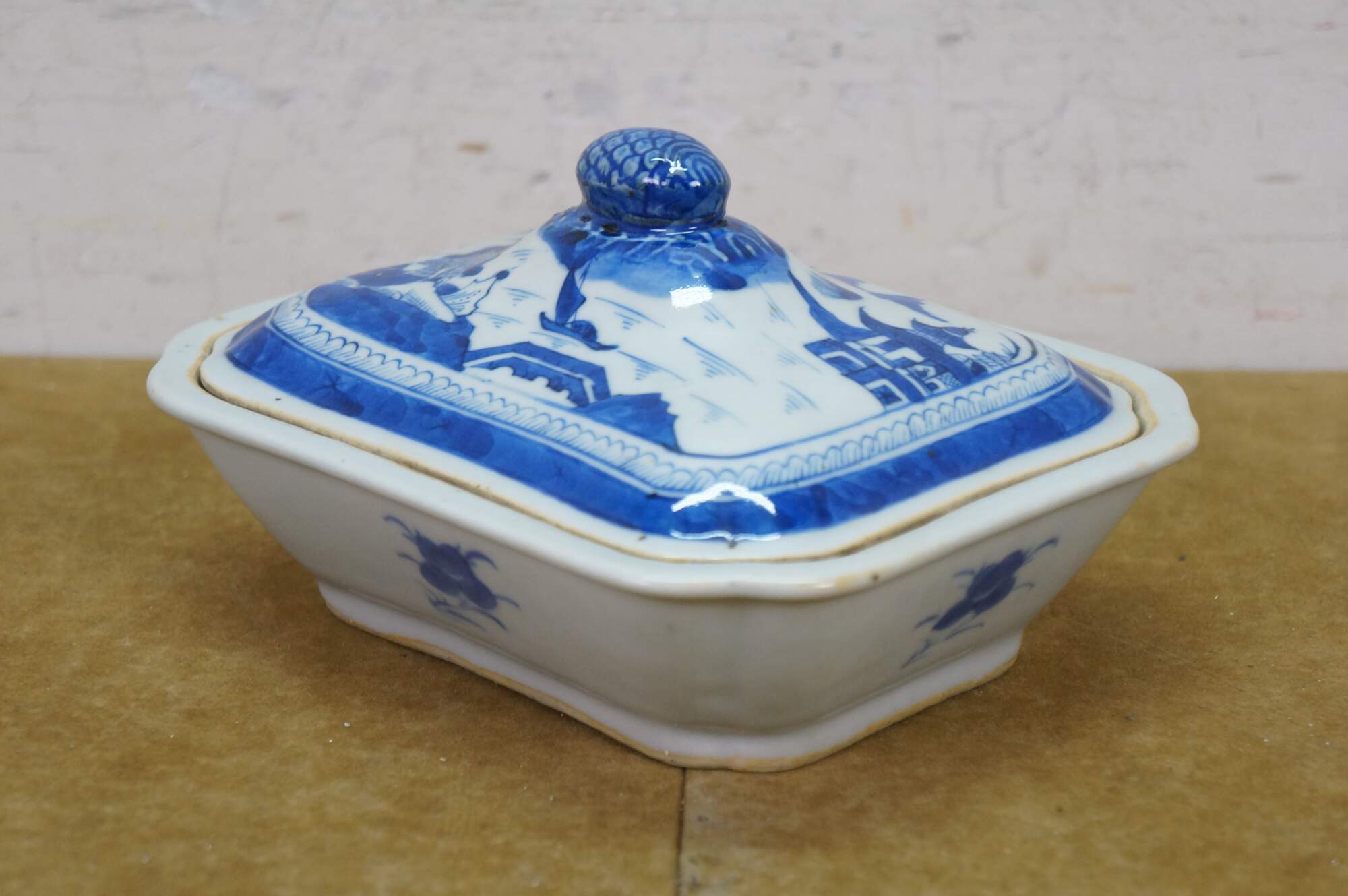 Antique 19th century Qing Dynasty Chinese Canton export blue and white porcelain serving pieces. Includes two vegetable tureens with lids and one oval serving platter.� Features classic Chinoiserie landscapes with pagodas, tea houses, willow patterns and pineapple finial.