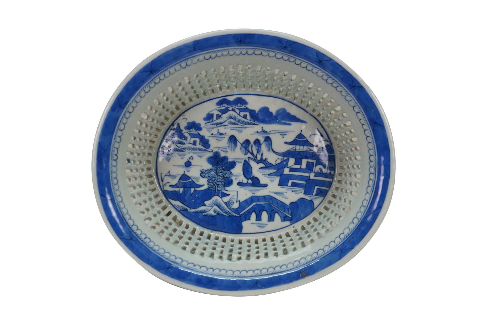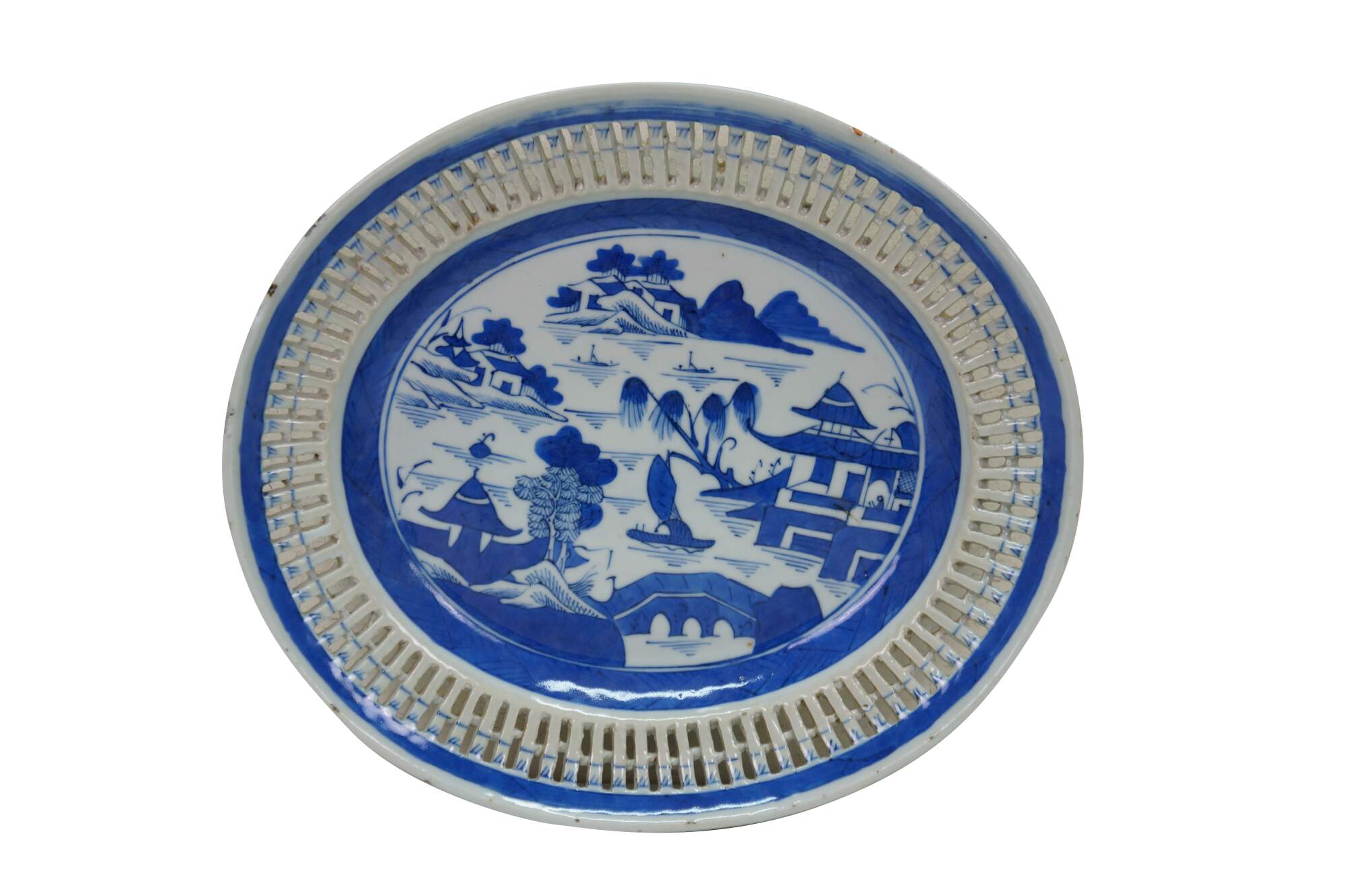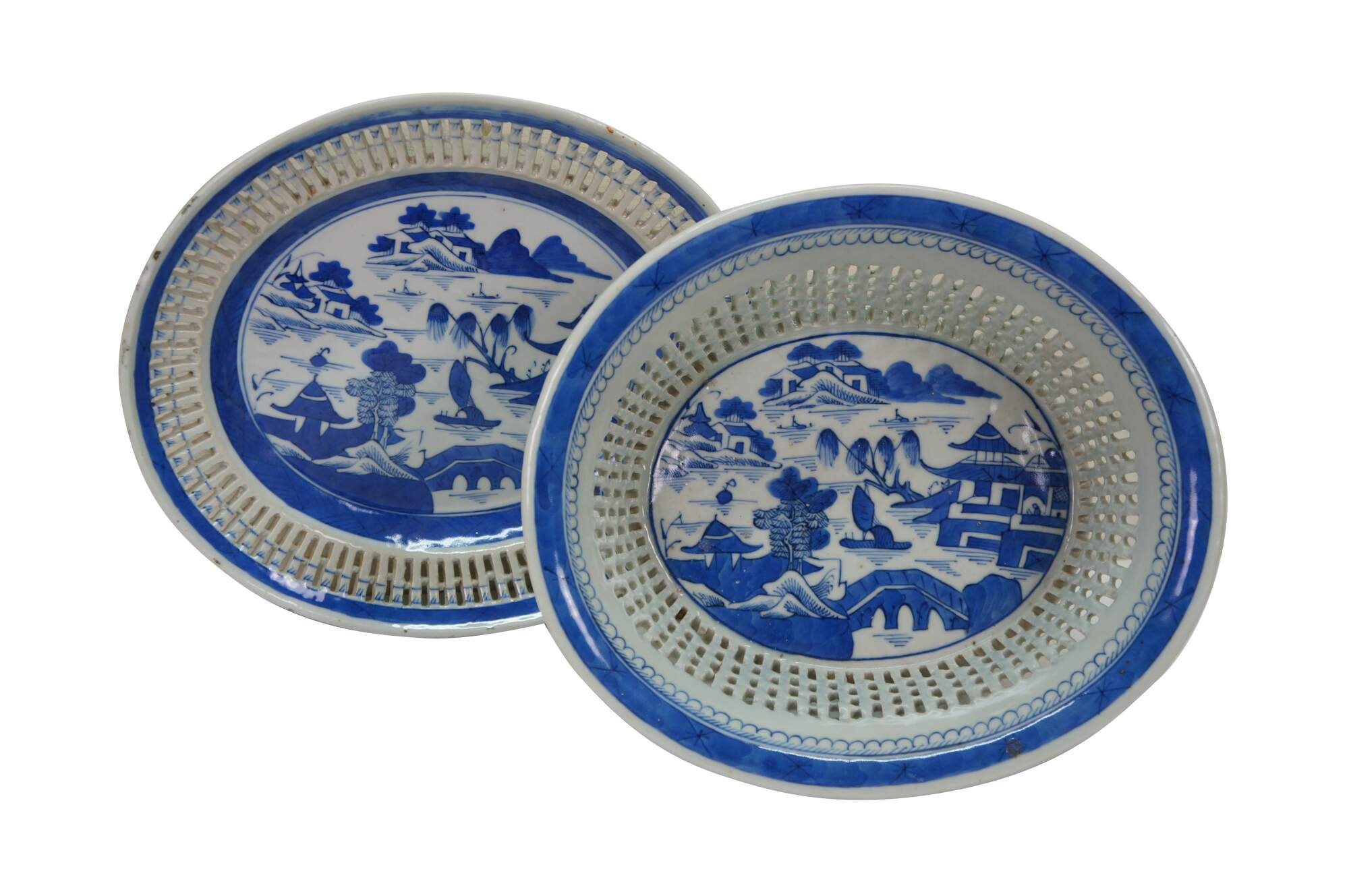 Antique 19th century Qing Dynasty Chinese Canton export blue and white porcelain serving pieces. Includes one shallow bowl / underplate and one compote / fruit basket.� Features classic Chinoiserie landscapes with pagodas, tea houses, boats, mountains and willow trees.