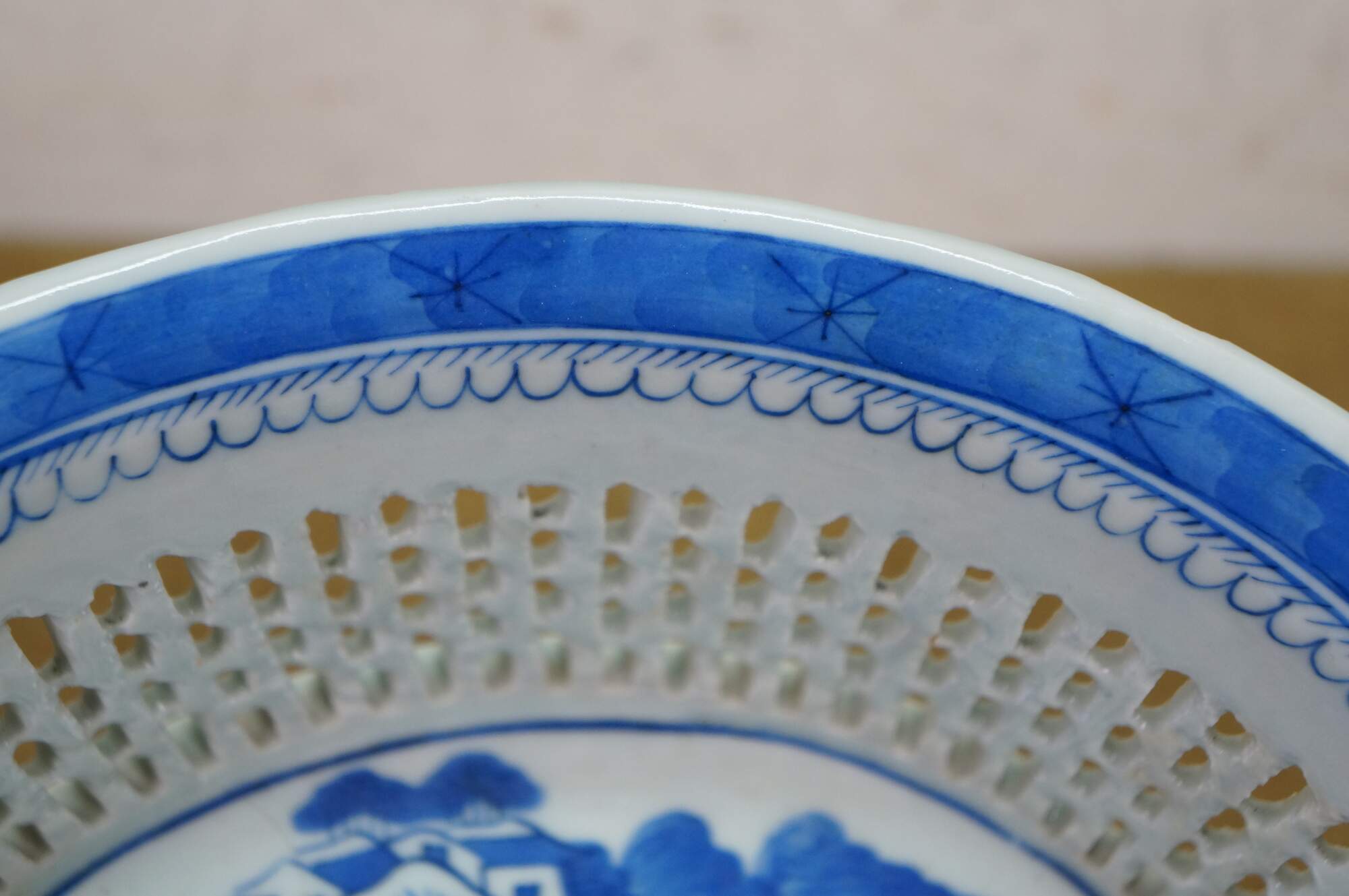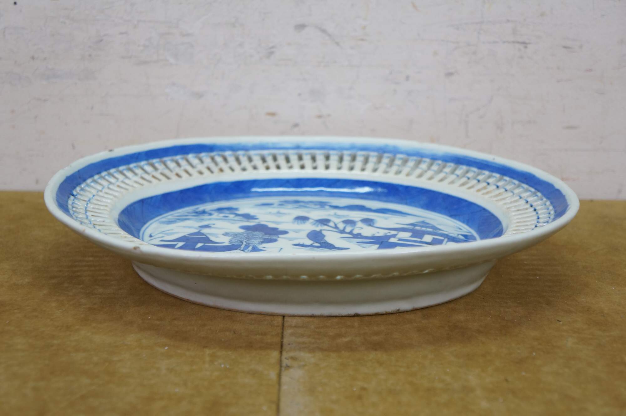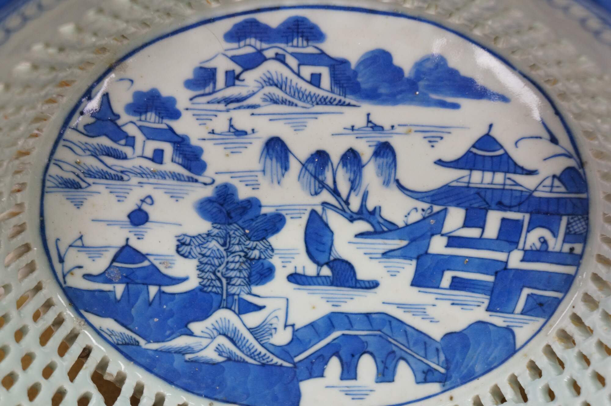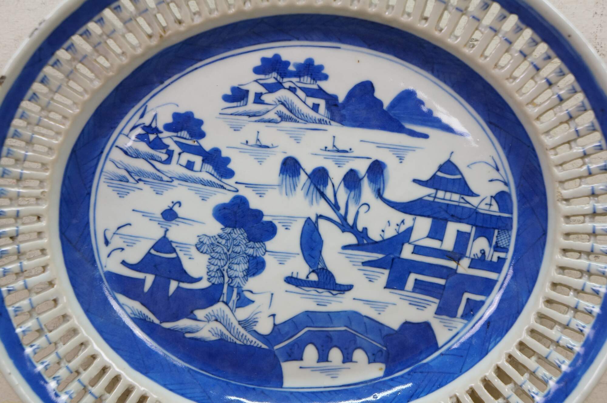 Antique 19th century Qing Dynasty Chinese Canton export blue and white porcelain serving pieces. Includes one shallow bowl / underplate and one compote / fruit basket.� Features classic Chinoiserie landscapes with pagodas, tea houses, boats, mountains and willow trees.