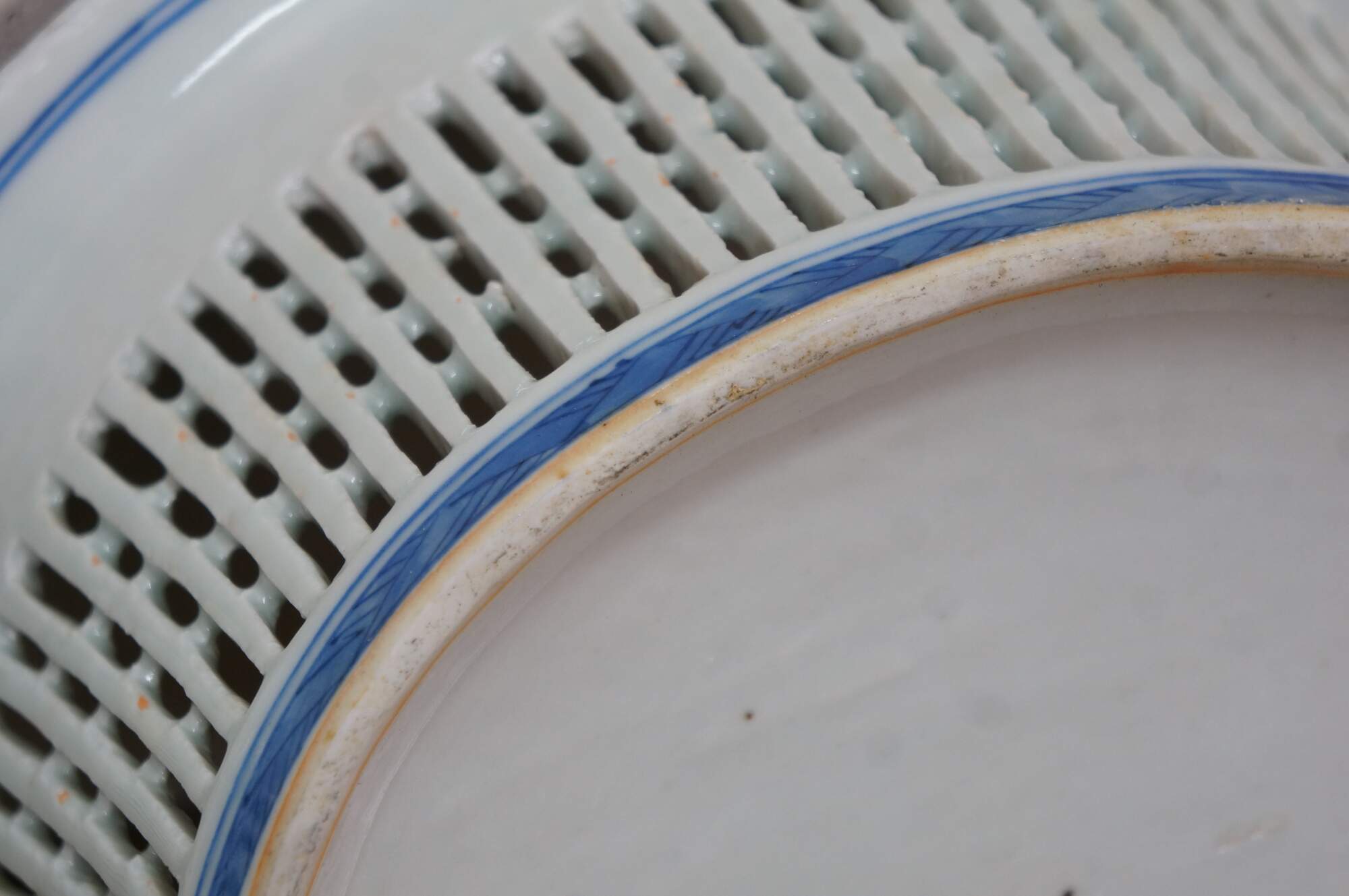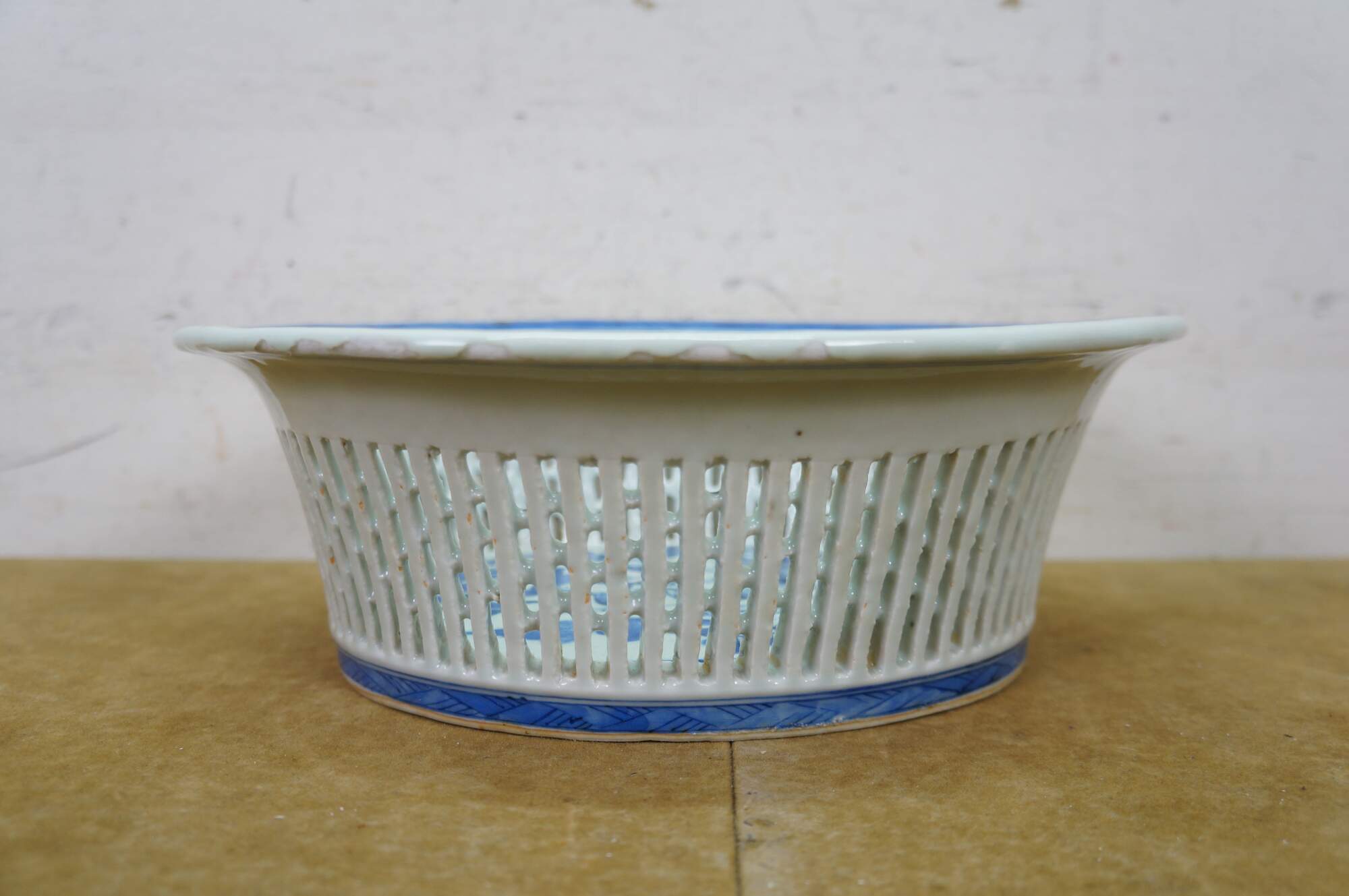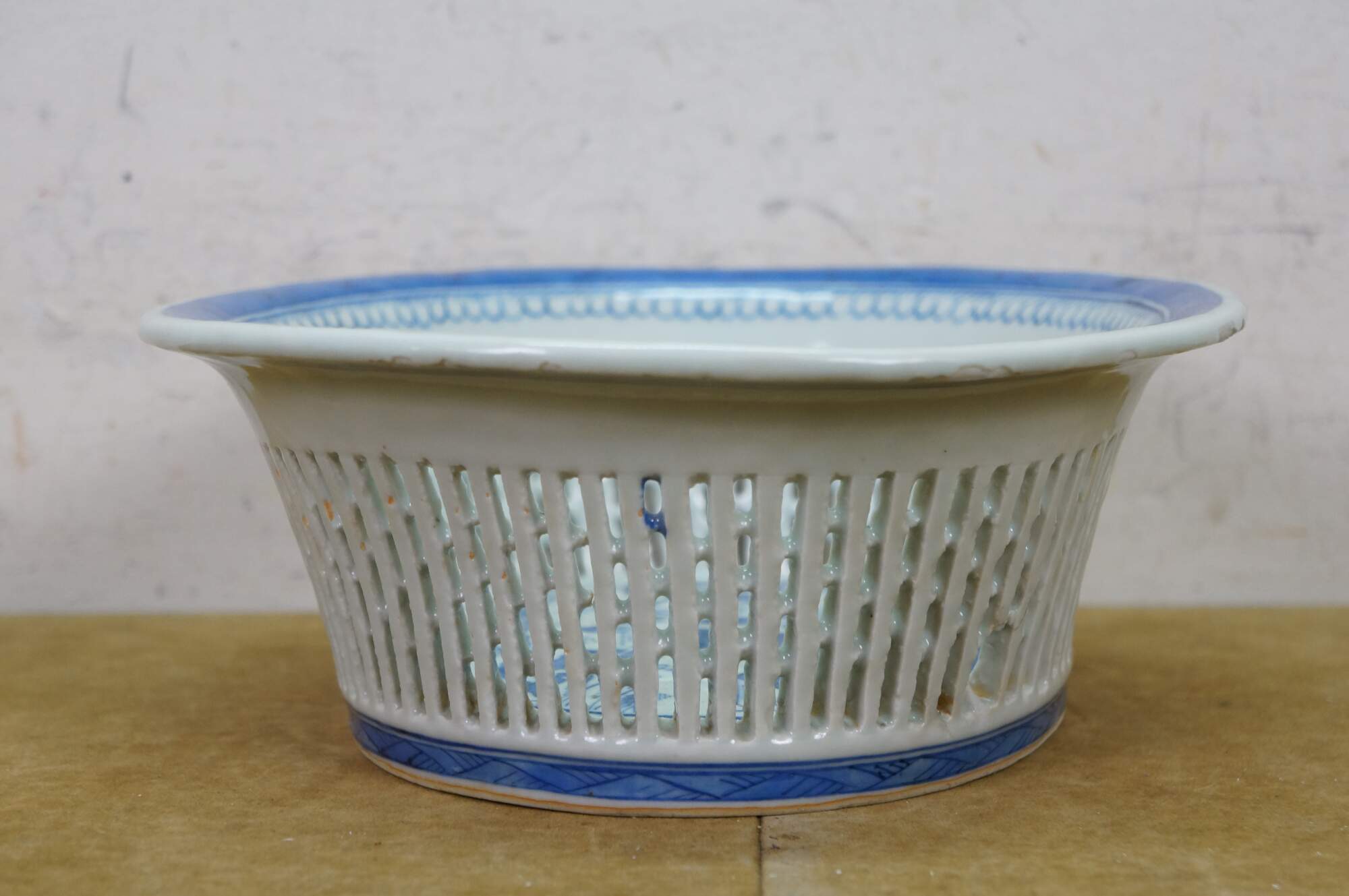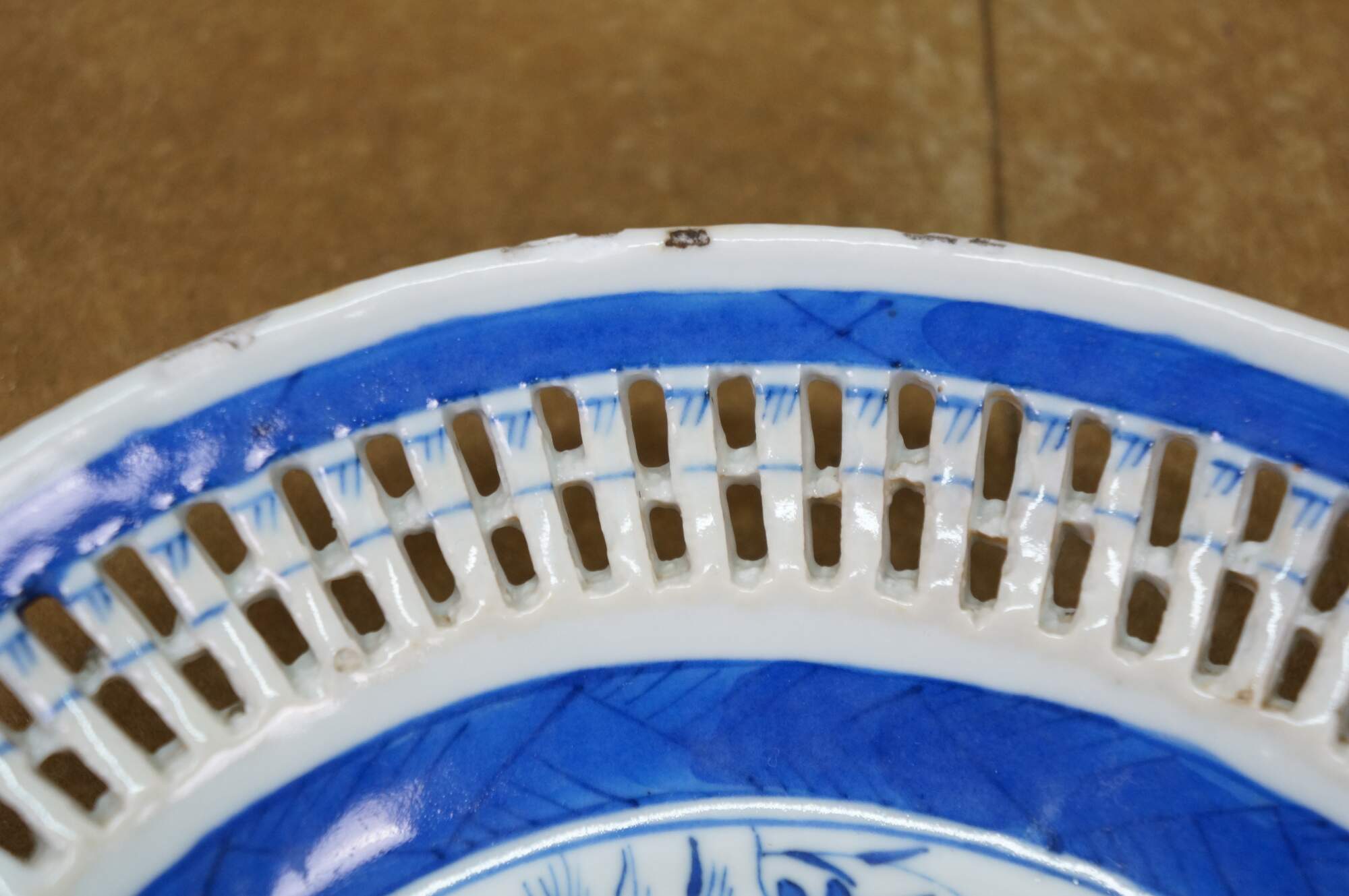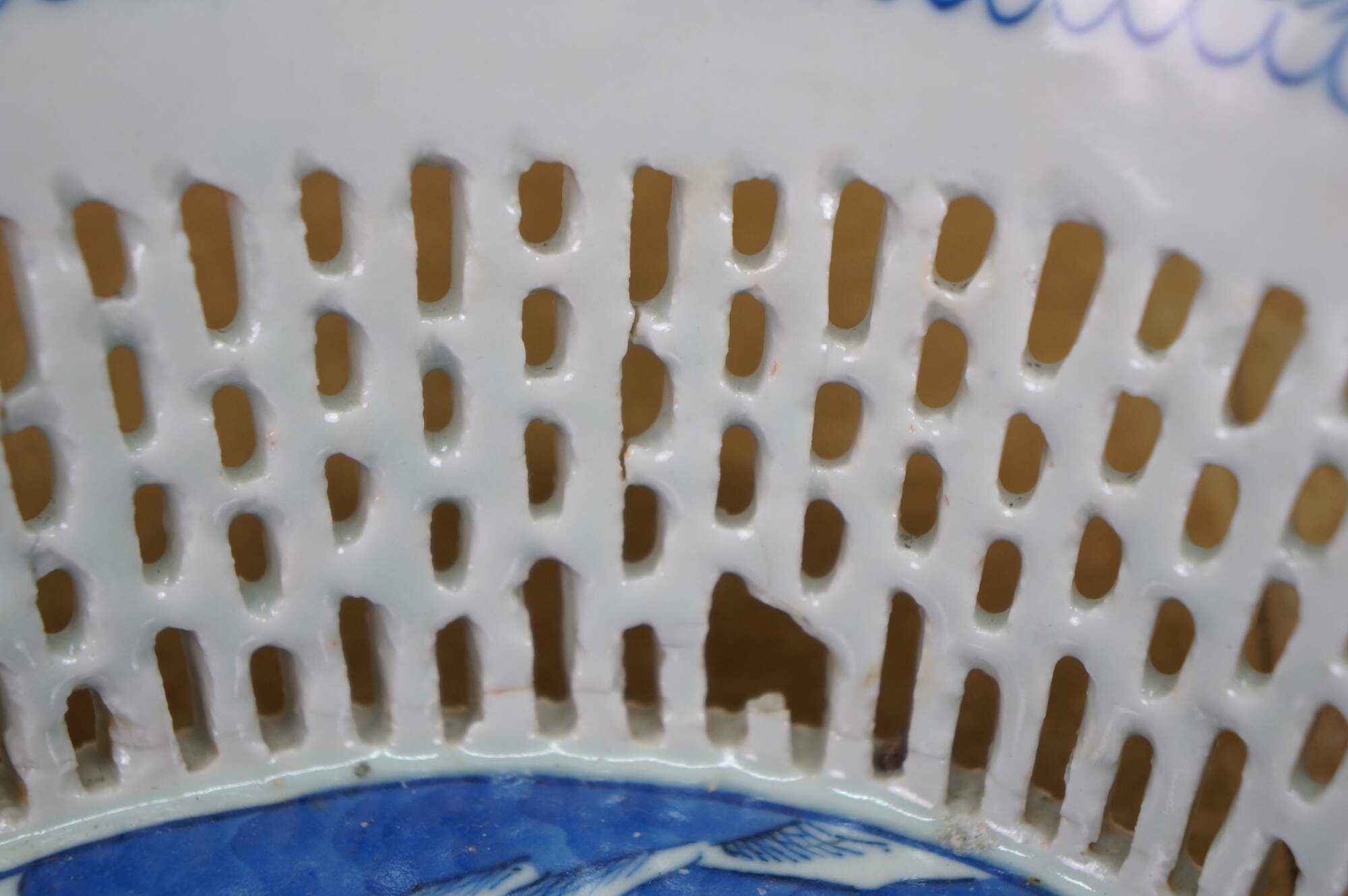 Discoloration; chipped edges; some cracked/missing weave
