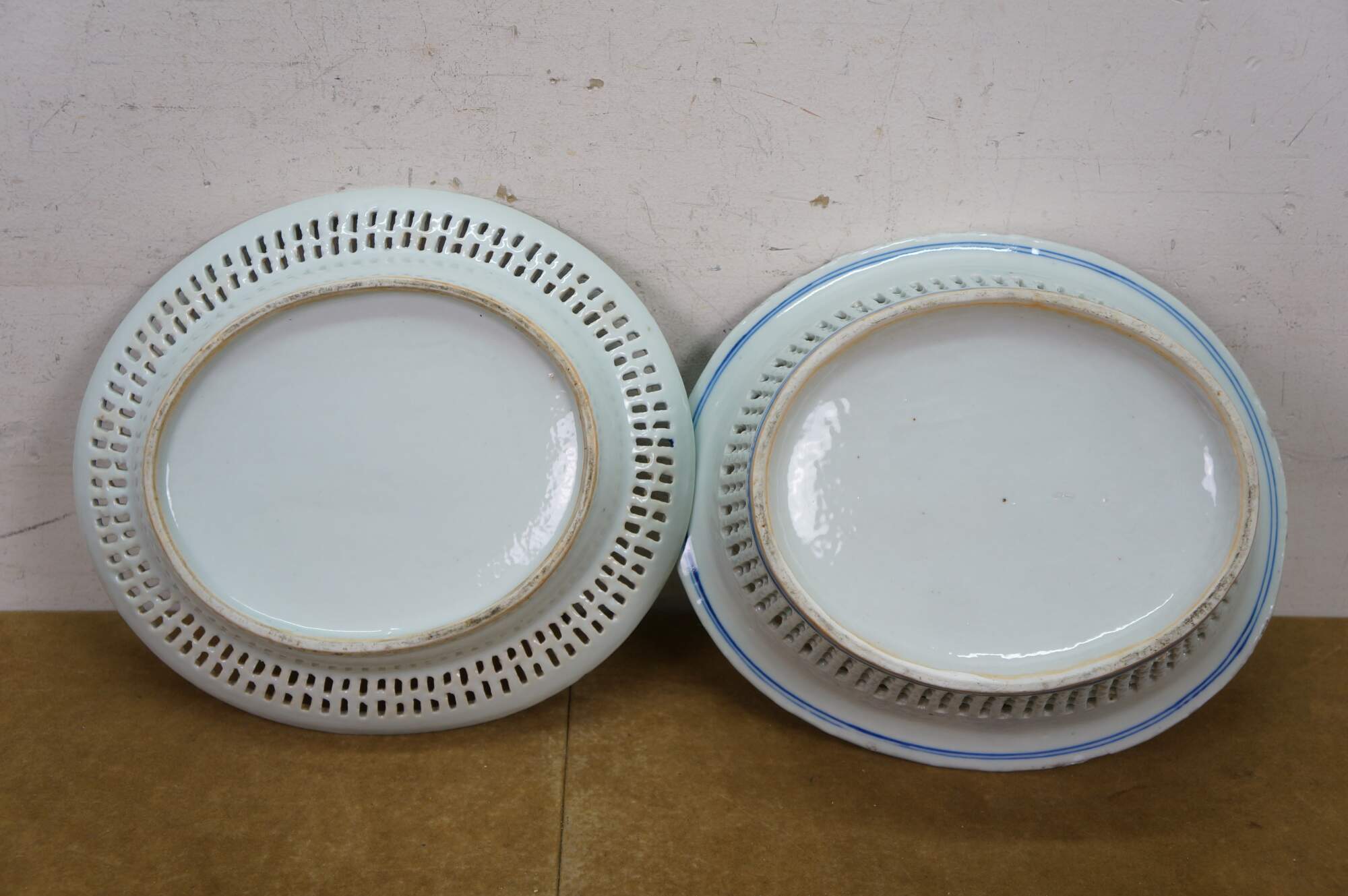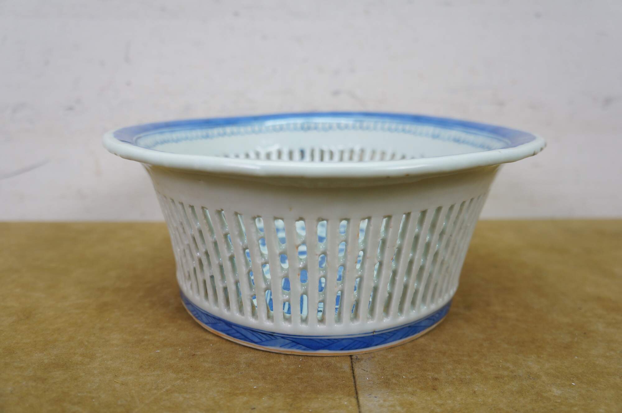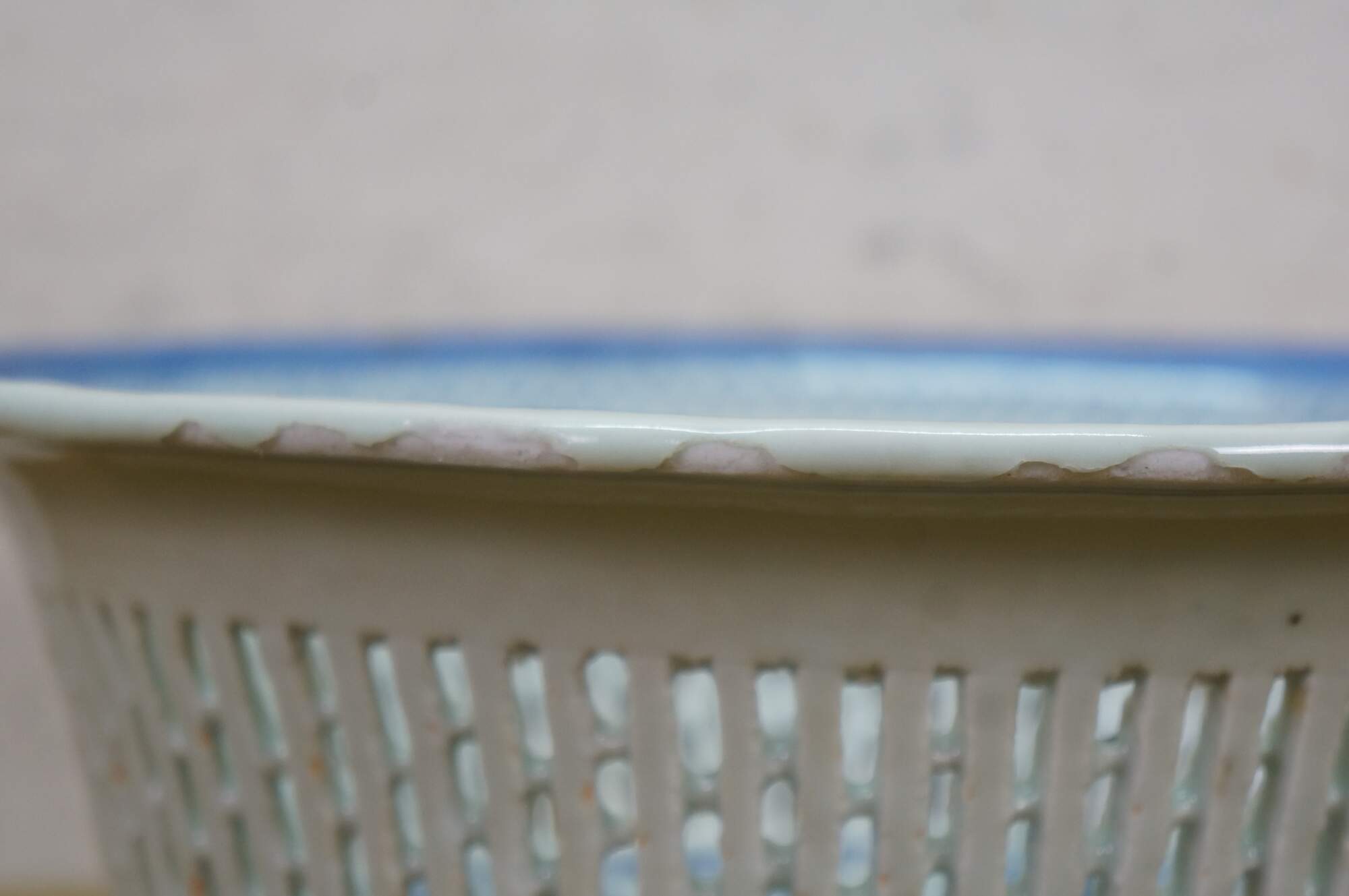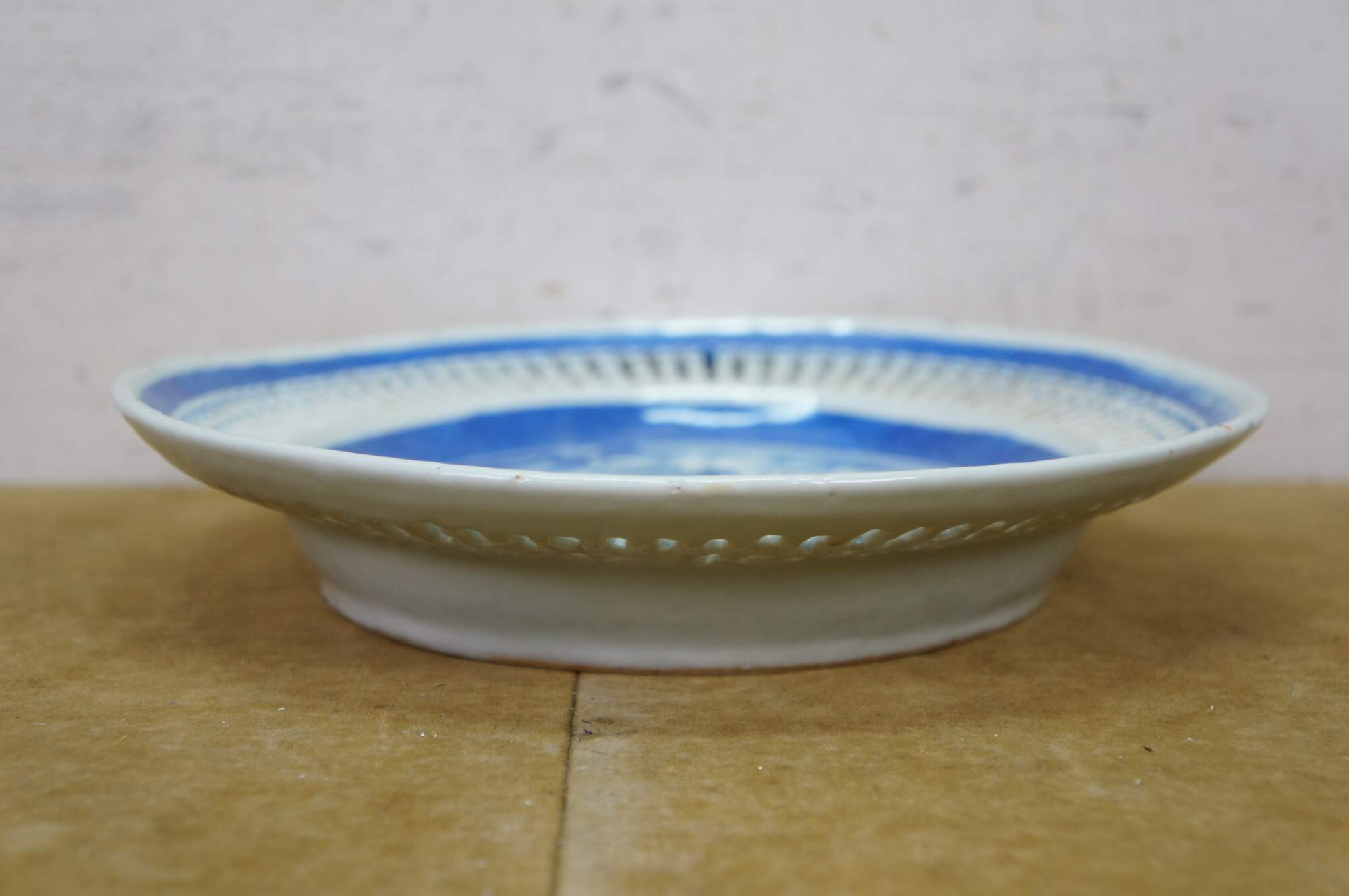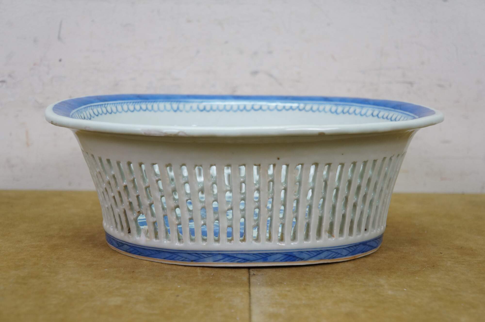Discoloration; chipped edges; some cracked/missing weave