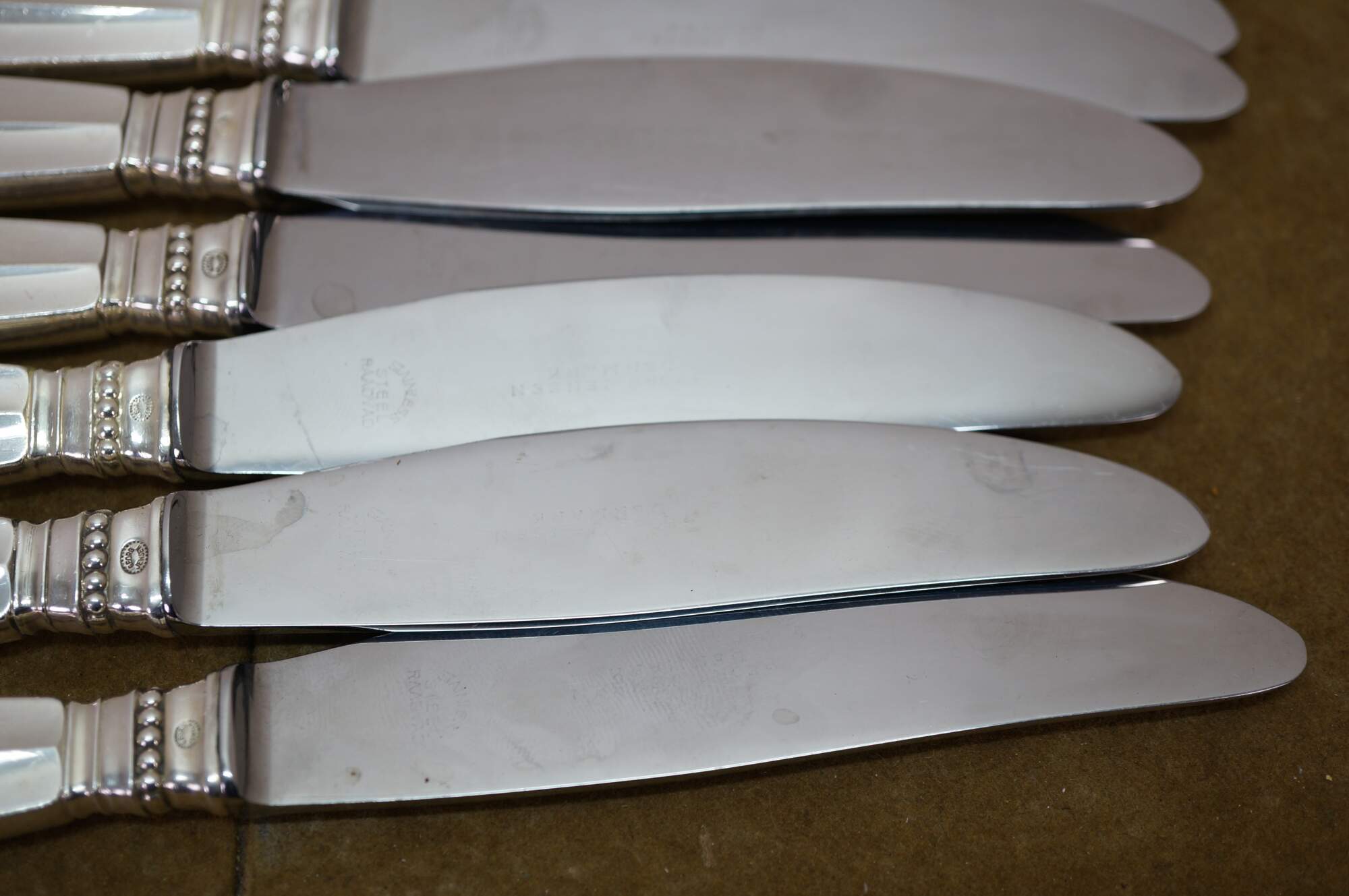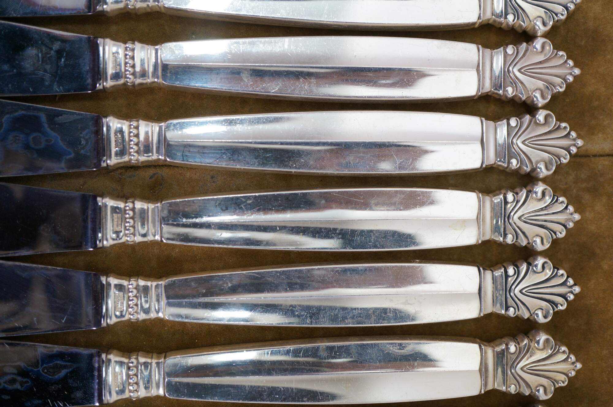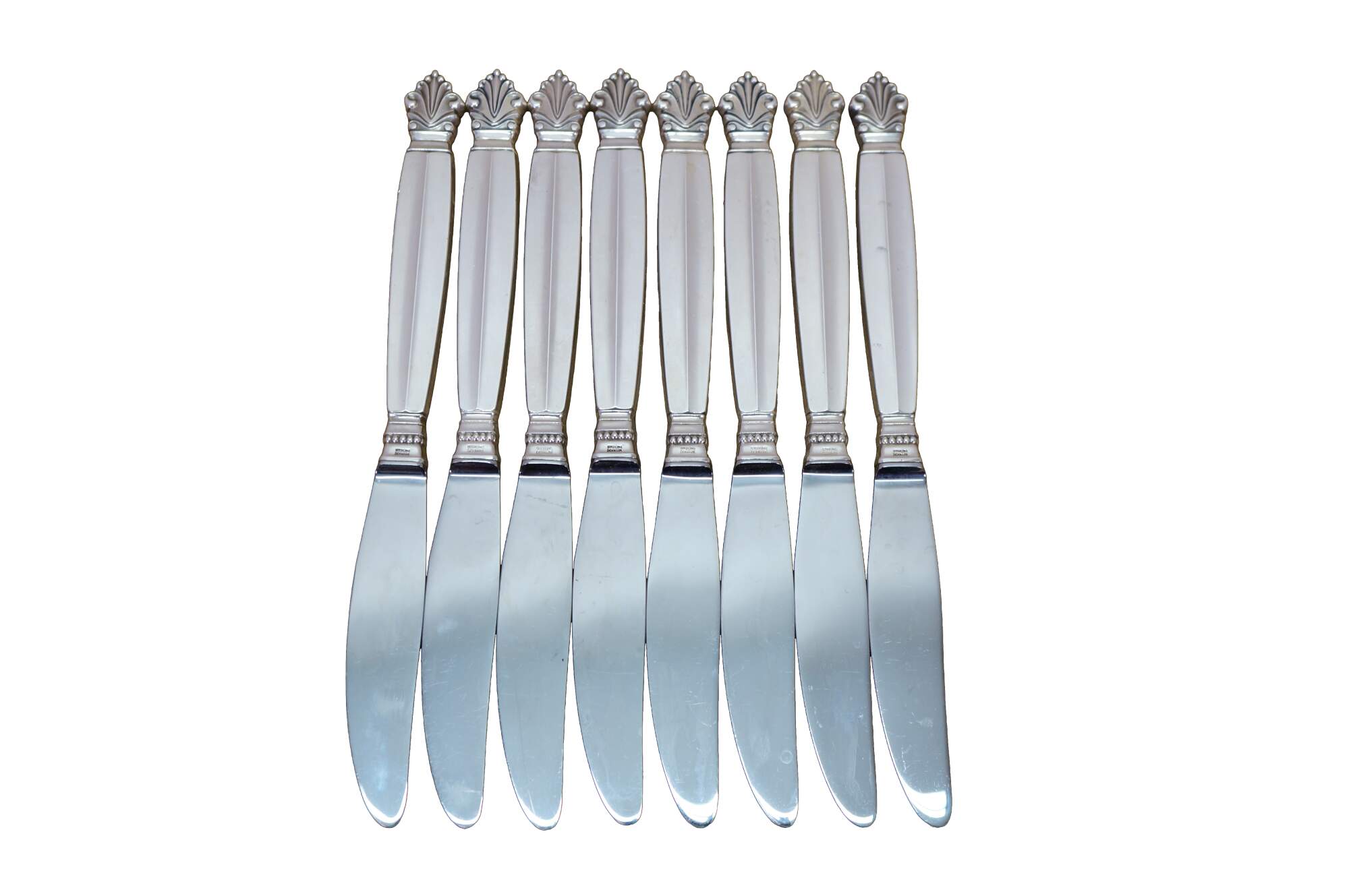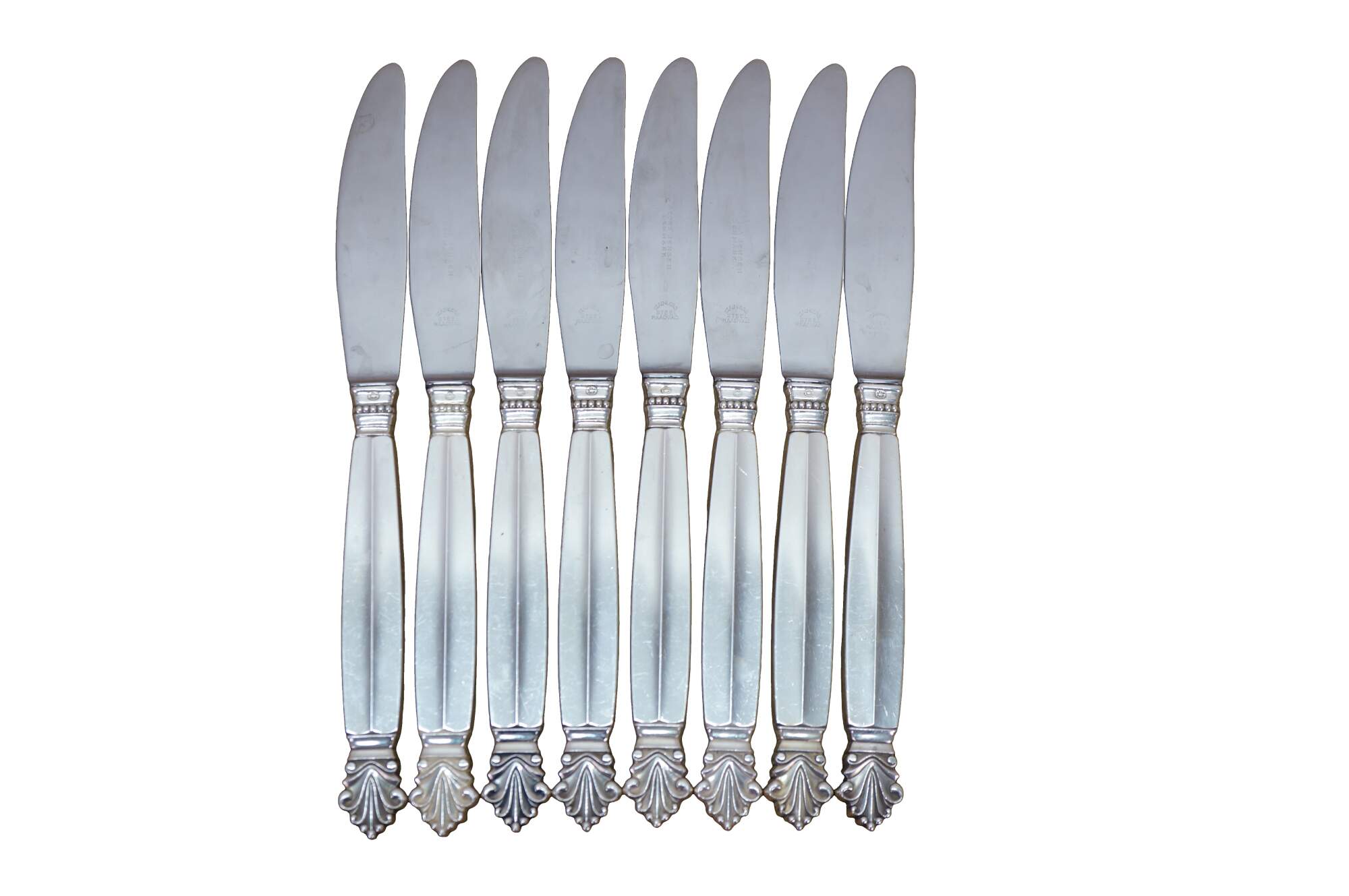 Eight antique Georg Jensen Denmark Sterling Silver 925 steel blade dinner knives in the Acanthus (Dronning) pattern. The Acanthus pattern was designed by Johan Rohde and introduced in 1917 - a romantic swirl design tops each handle. Each knife features a sterling silver handle and stainless steel Raadvad blade.
