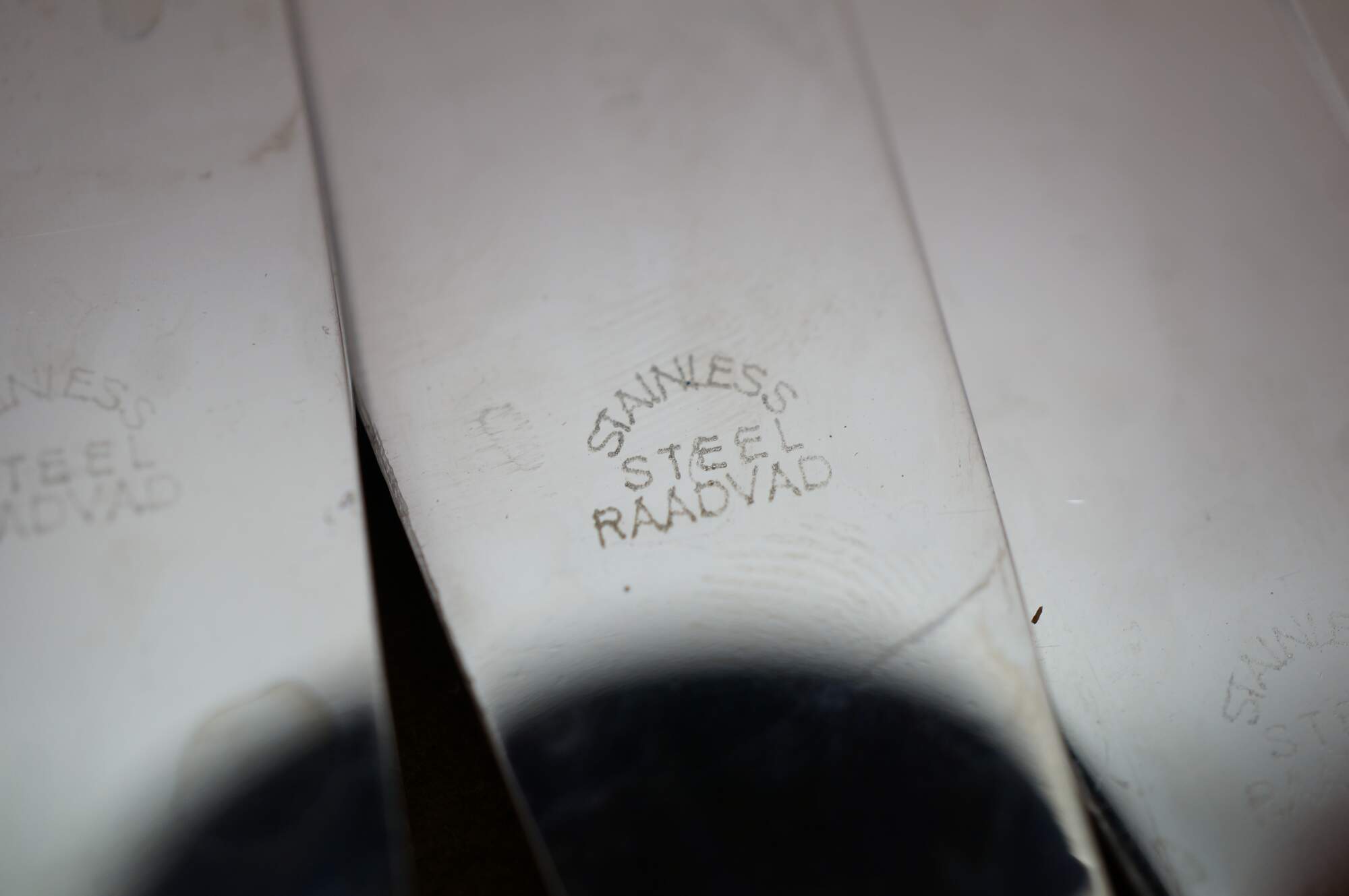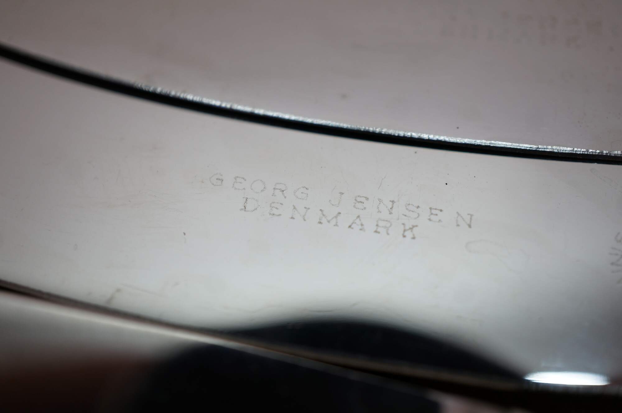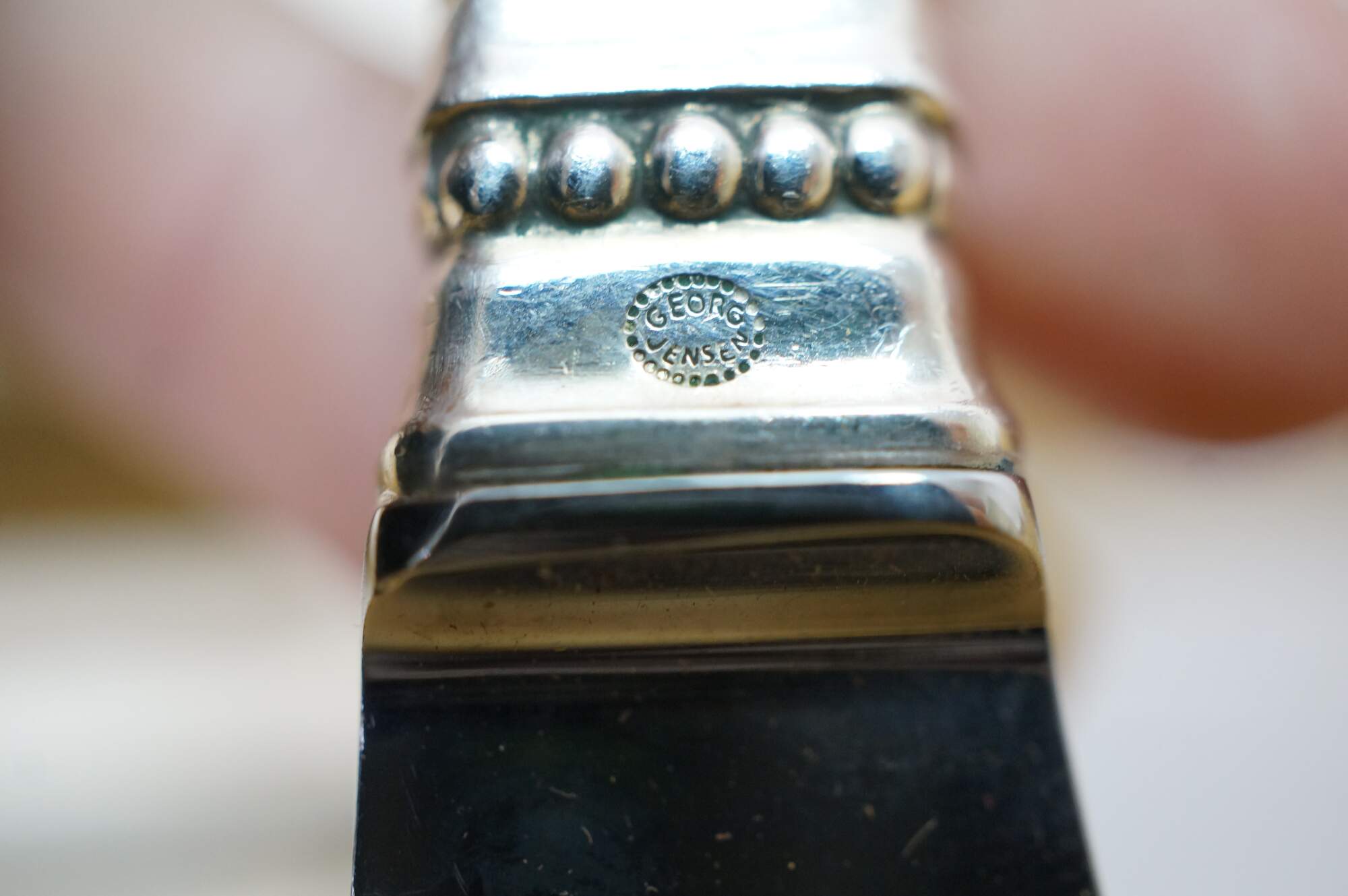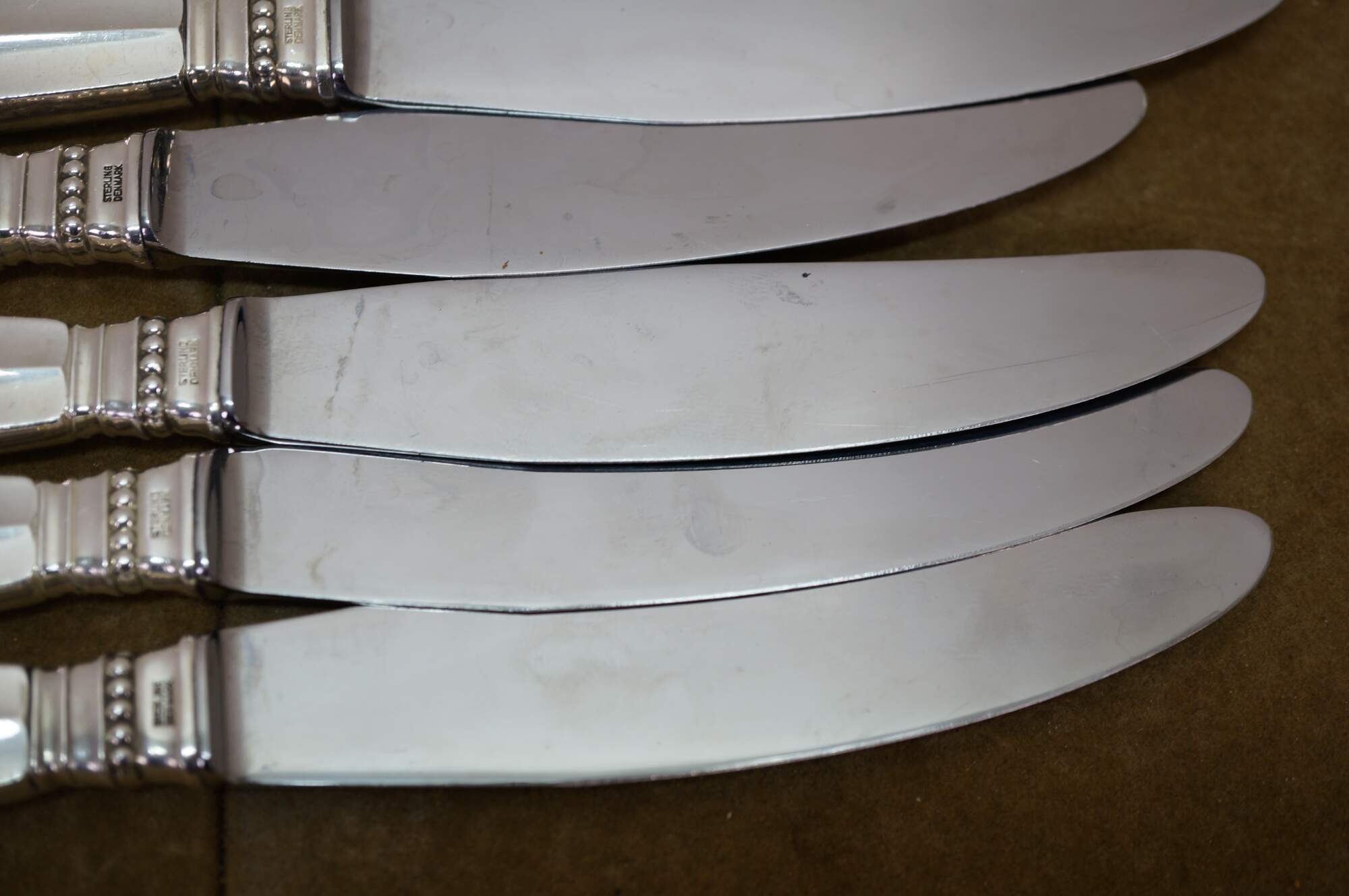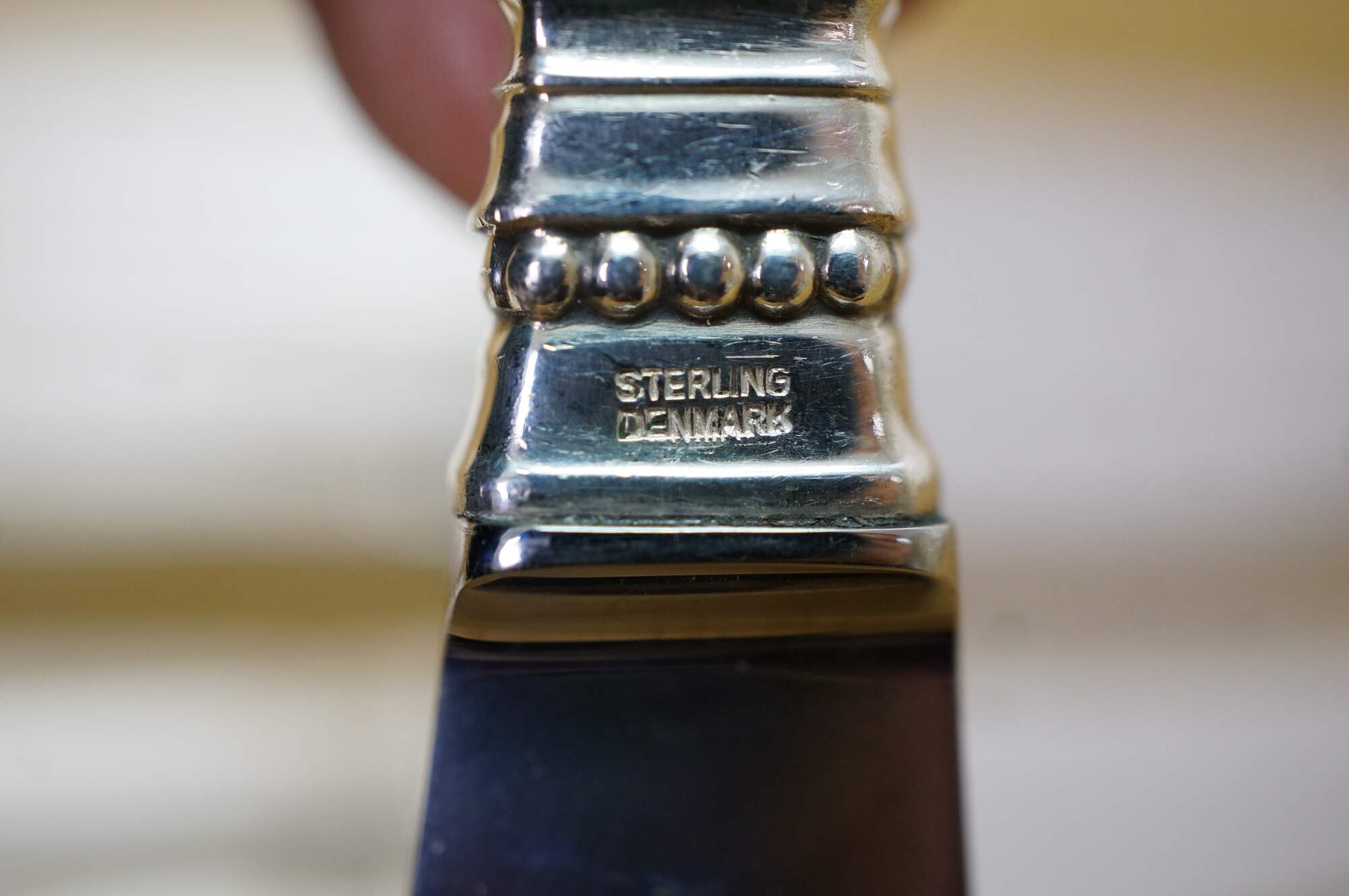 Eight antique Georg Jensen Denmark Sterling Silver 925 steel blade dinner knives in the Acanthus (Dronning) pattern. The Acanthus pattern was designed by Johan Rohde and introduced in 1917 - a romantic swirl design tops each handle. Each knife features a sterling silver handle and stainless steel Raadvad blade.