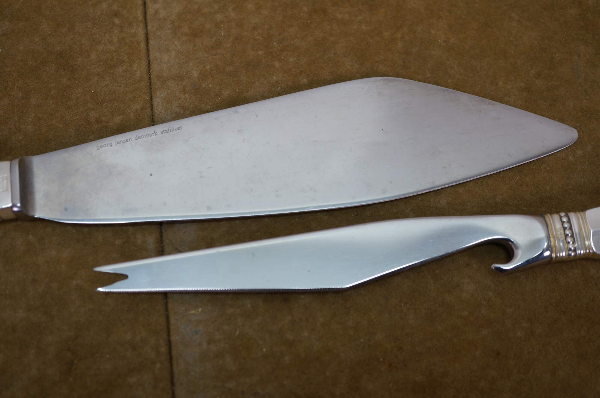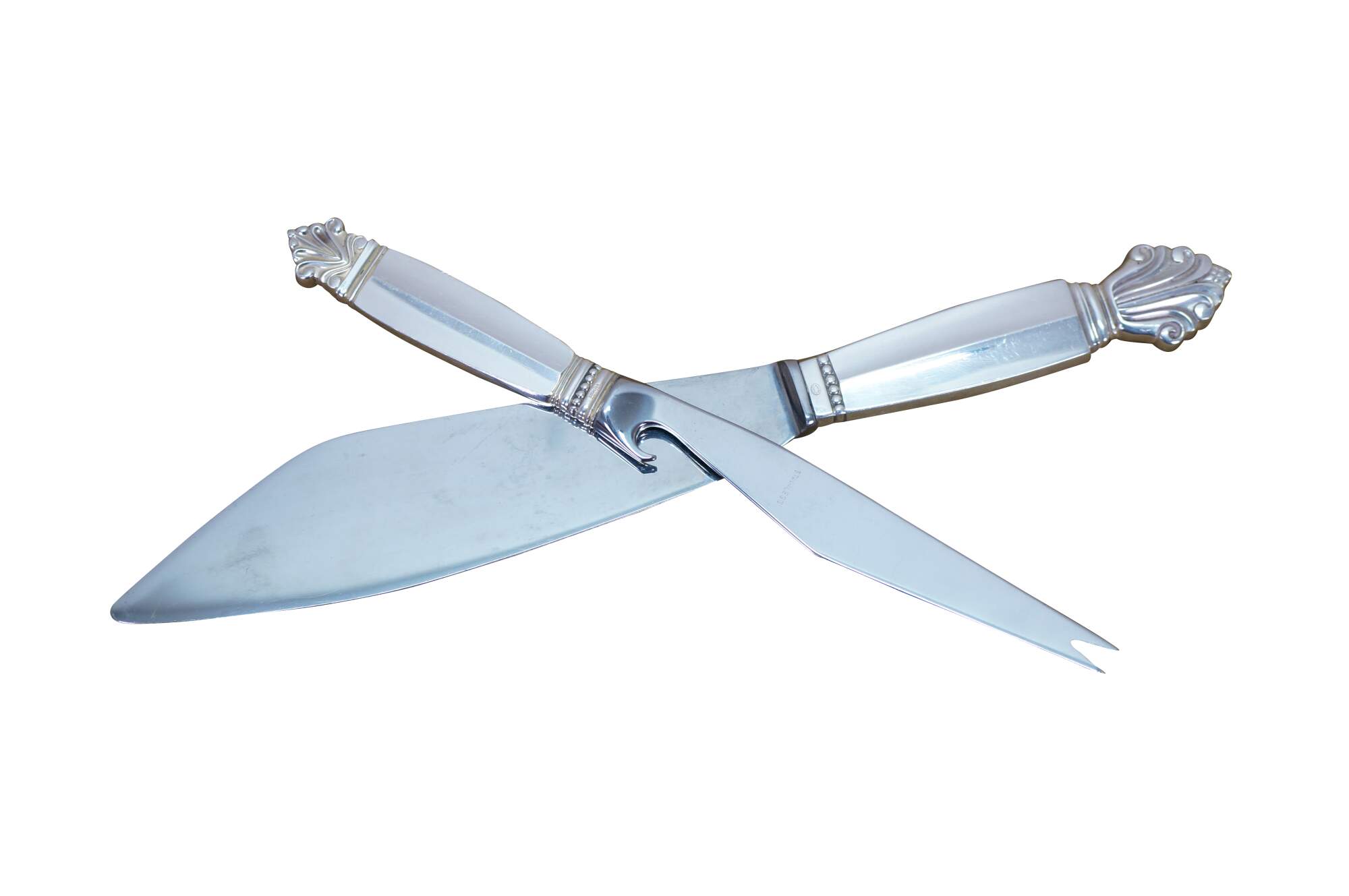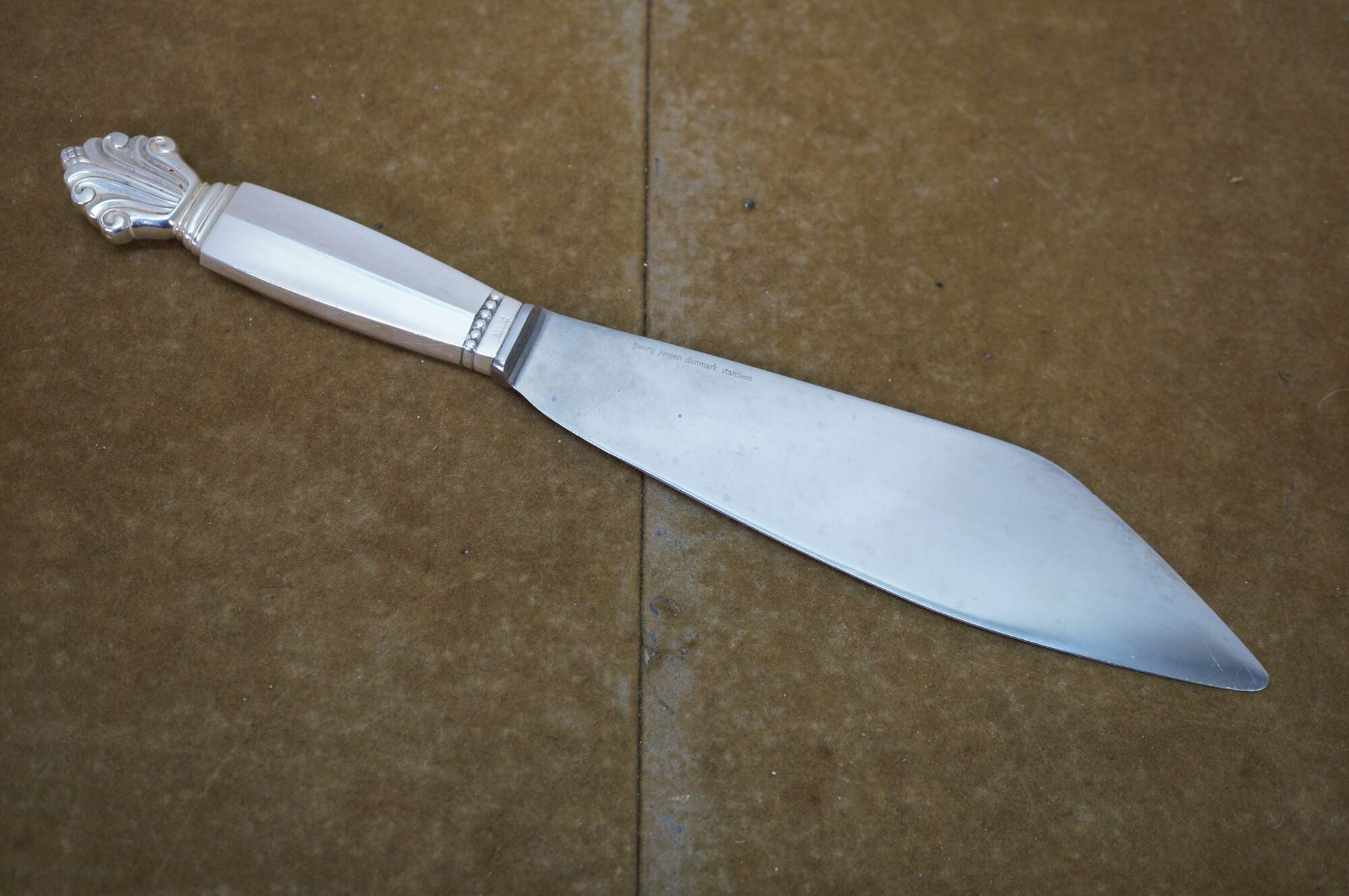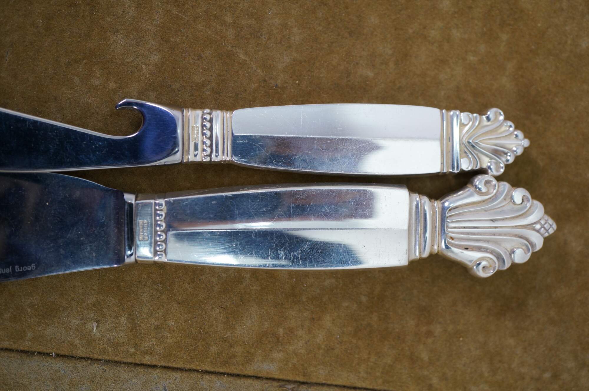 Two antique Georg Jensen Denmark Sterling Silver 925 steel blade knives in the Acanthus (Dronning) pattern. One cheese or bar knife, and one cake serving knife. The Acanthus pattern was designed by Johan Rohde and introduced in 1917 - a romantic swirl design tops each handle.