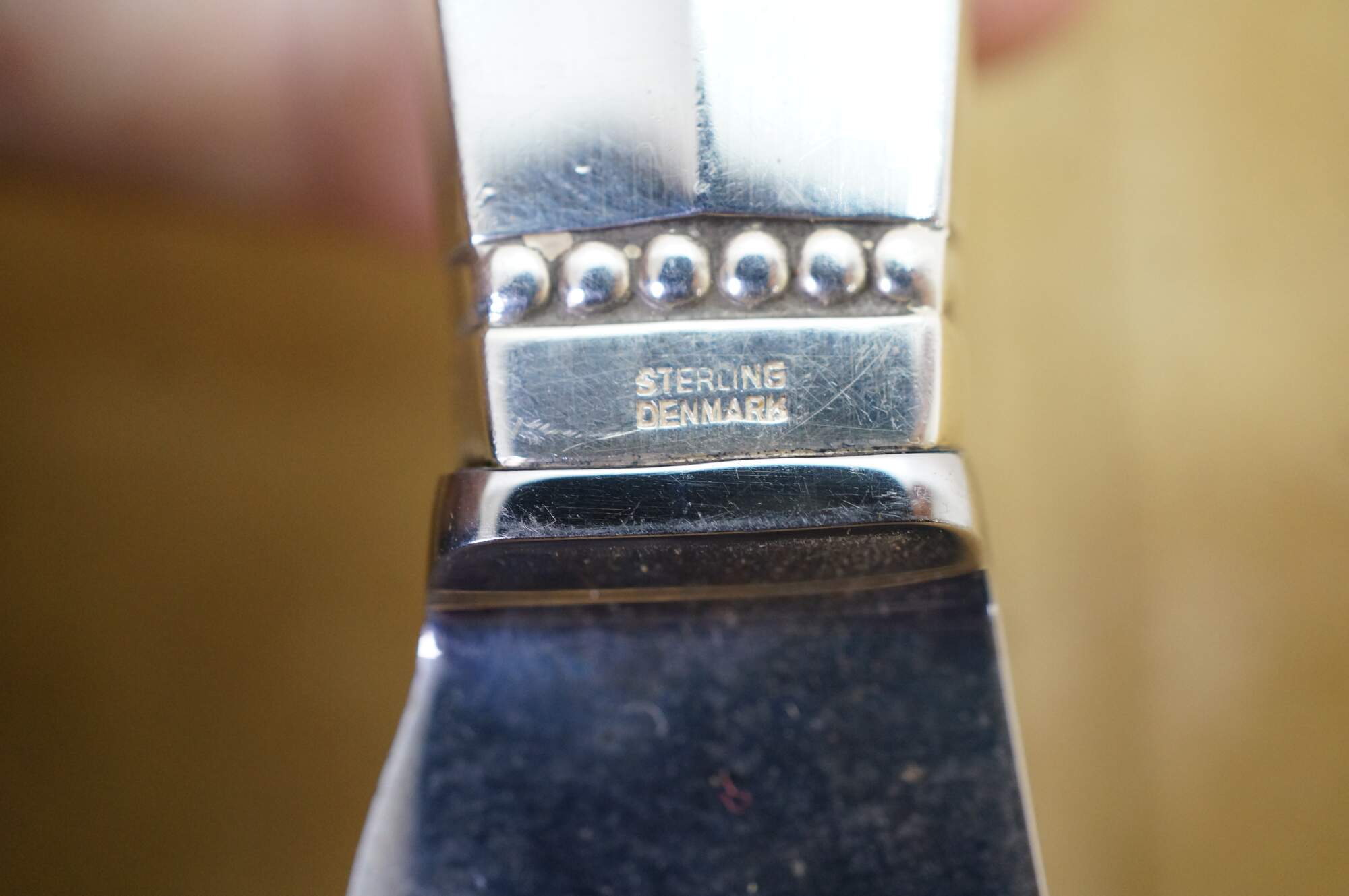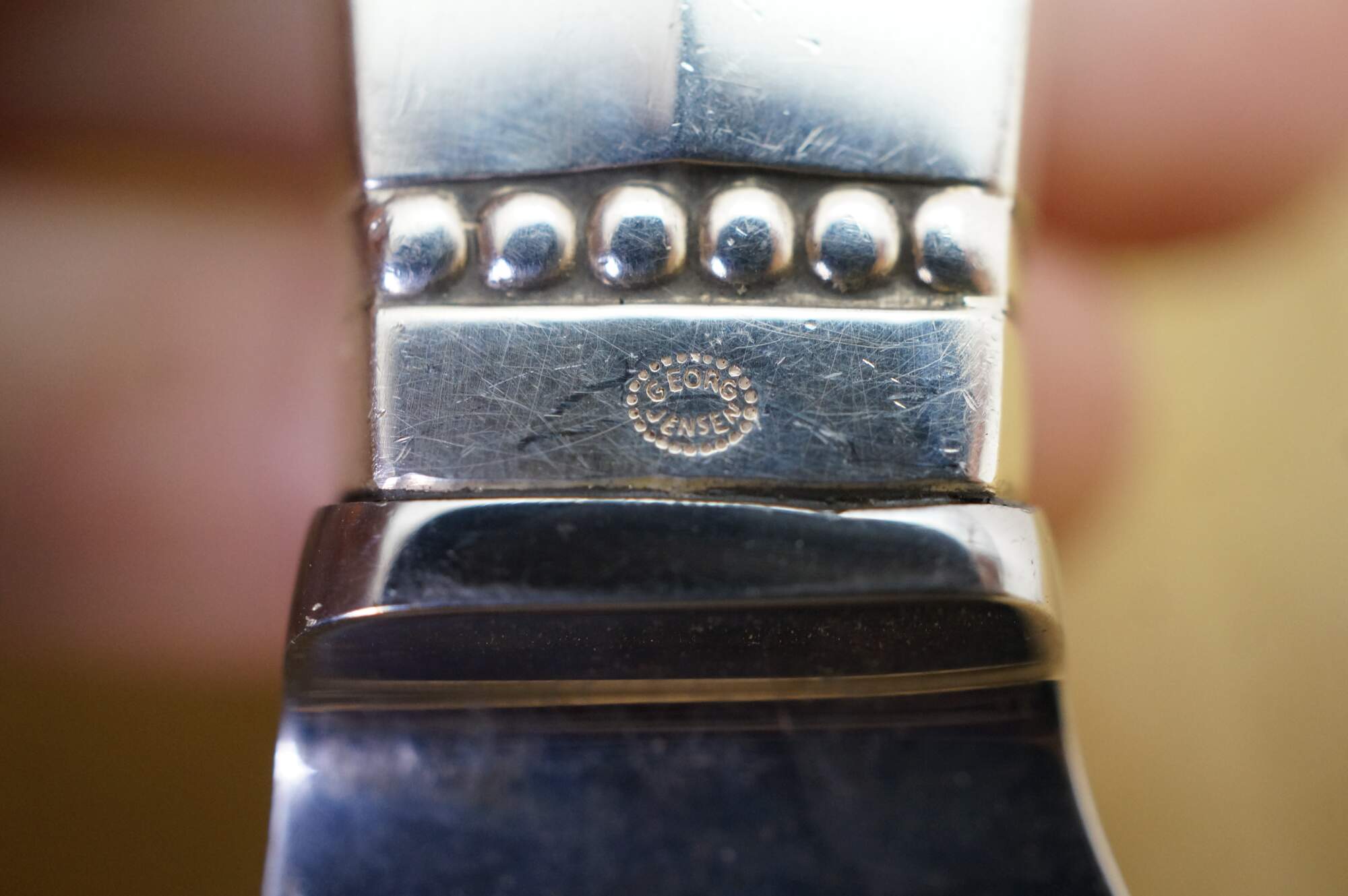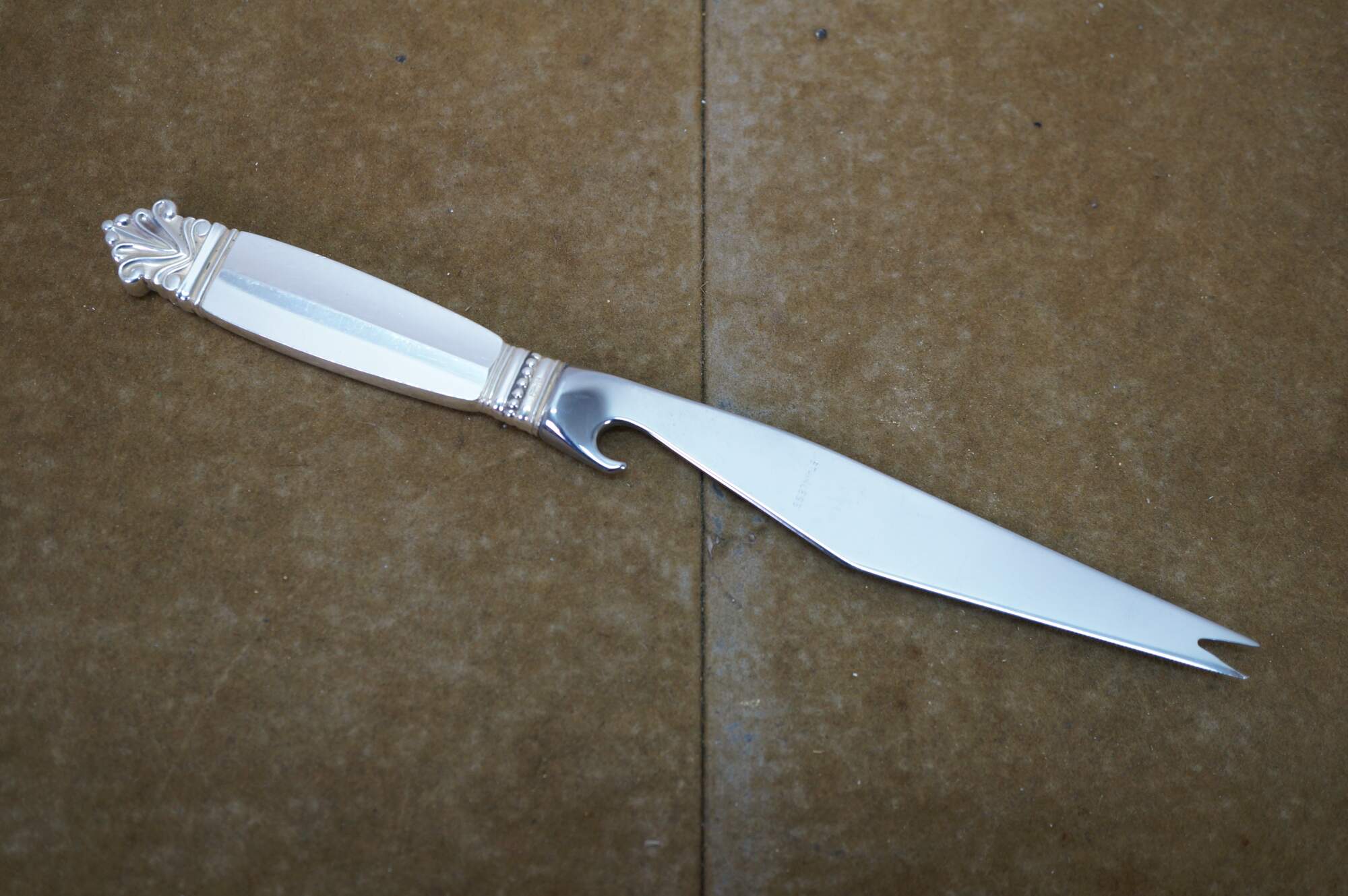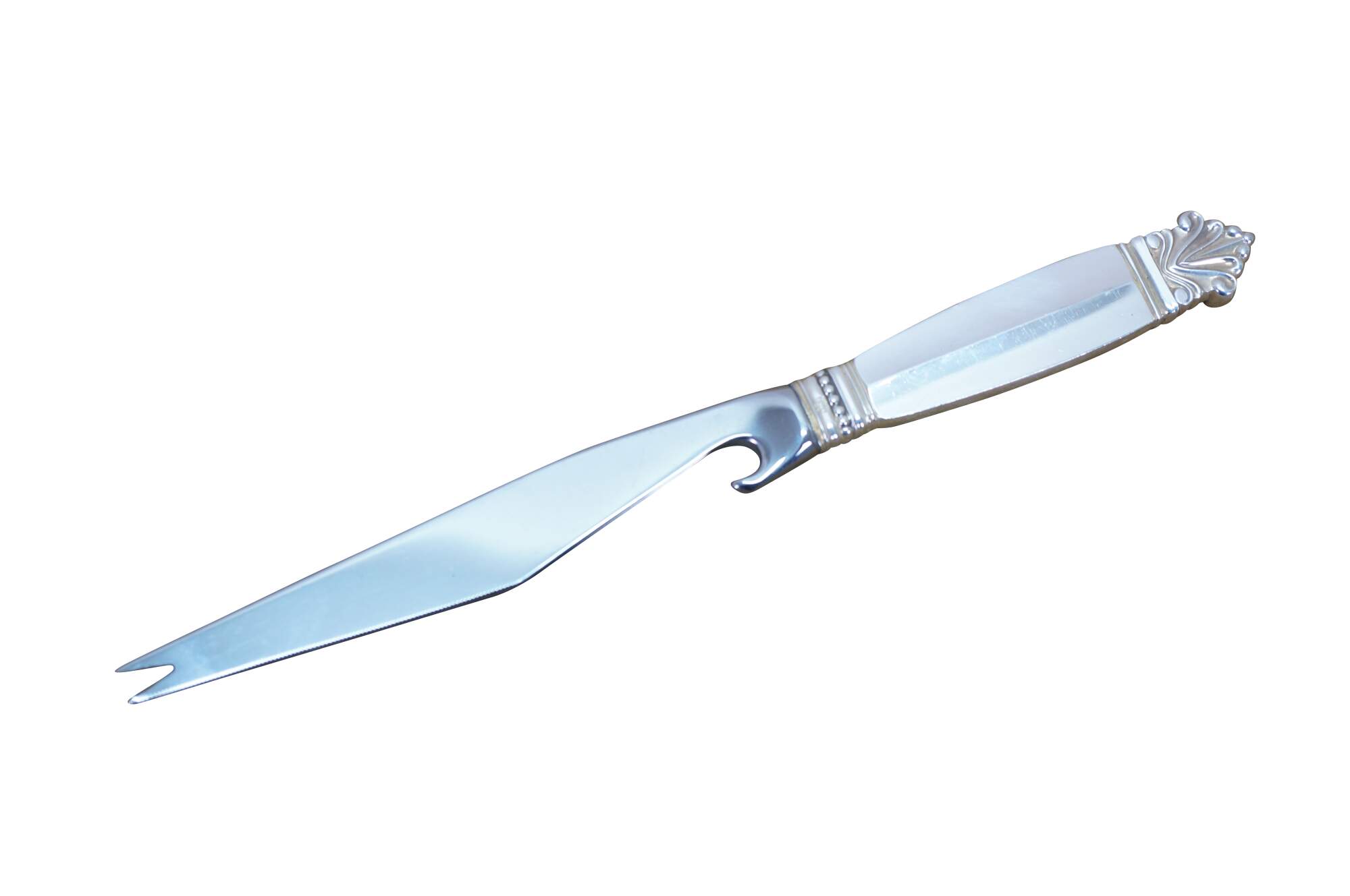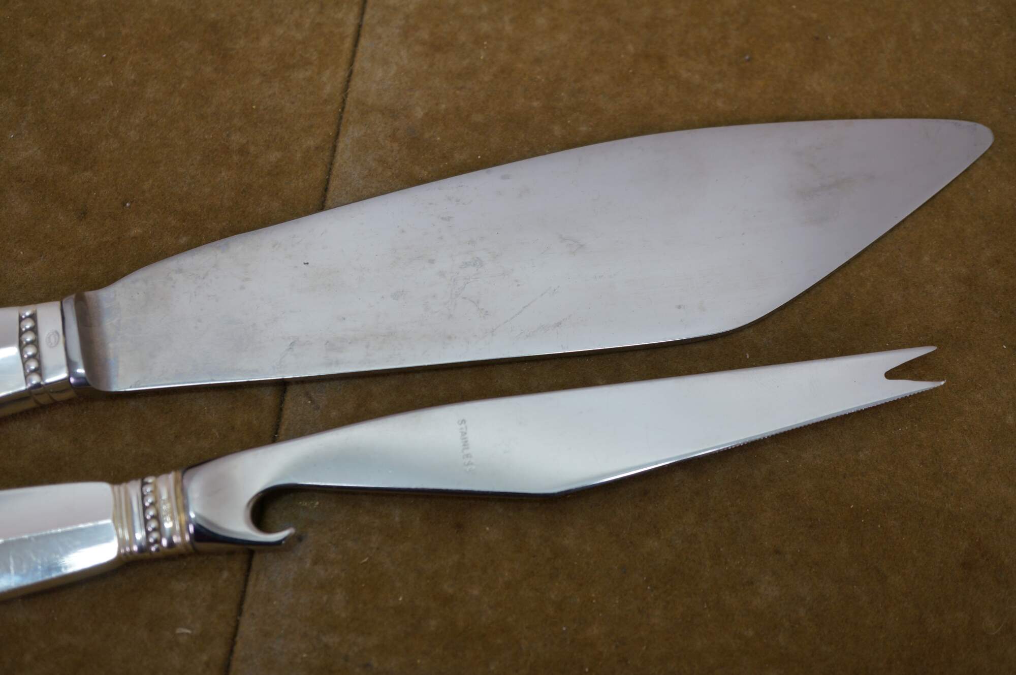 Two antique Georg Jensen Denmark Sterling Silver 925 steel blade knives in the Acanthus (Dronning) pattern. One cheese or bar knife, and one cake serving knife. The Acanthus pattern was designed by Johan Rohde and introduced in 1917 - a romantic swirl design tops each handle.